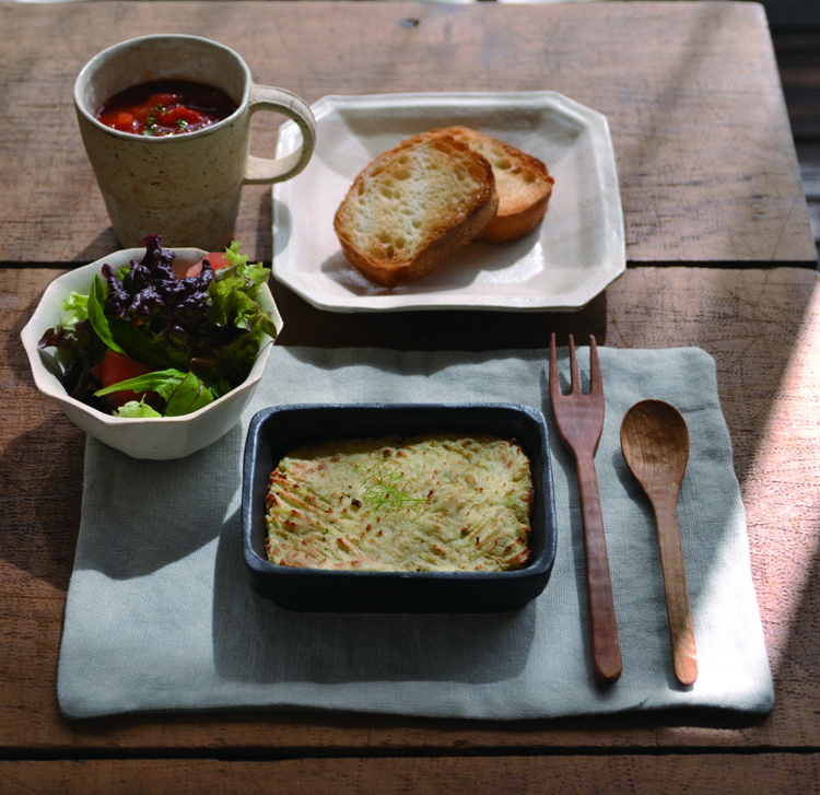 カフェ限定メニュー : 井山さんのシェパーズパイ,京子さんのミネストローネをお二人のうつわで。