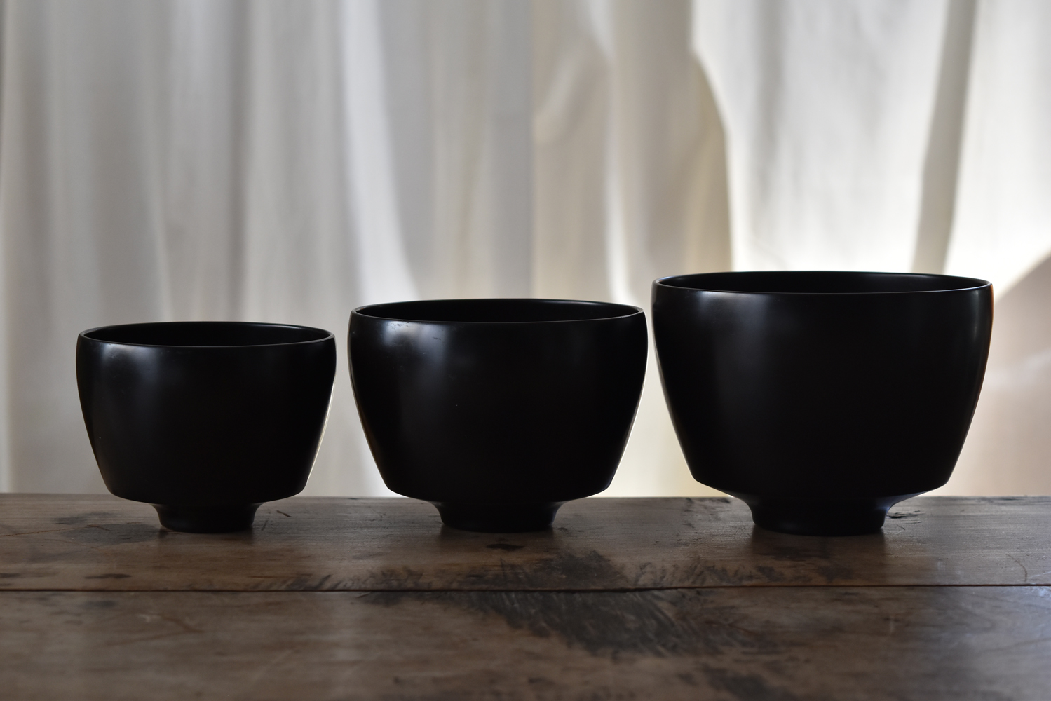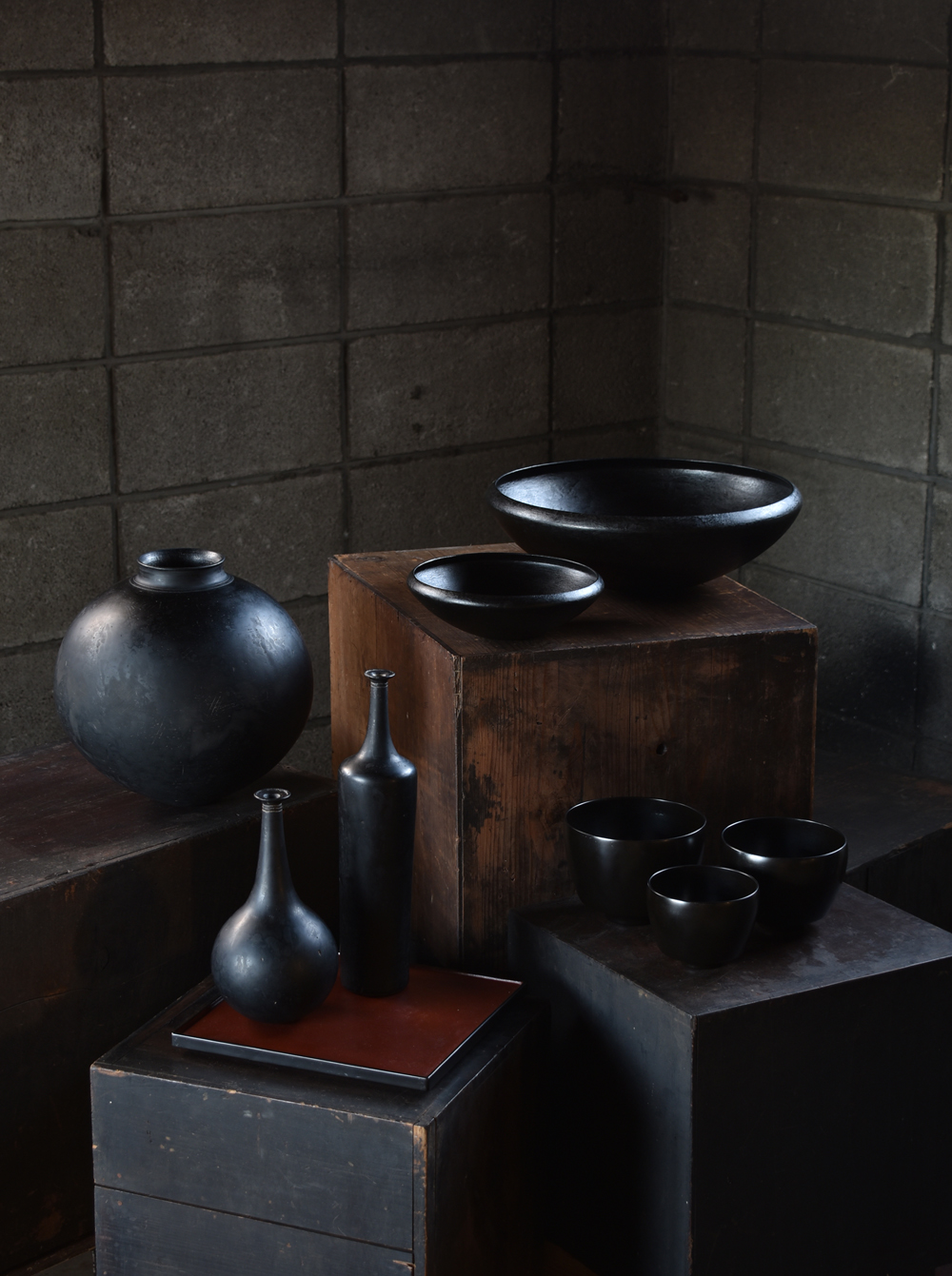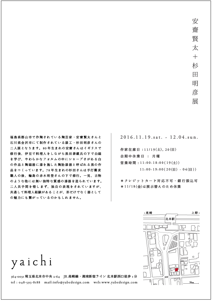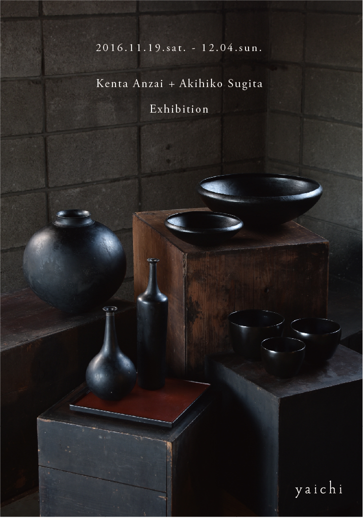 福島県郡山市で作陶されている陶芸家・安齊賢太さんと石川県金沢市にて制作されている漆工・杉田明彦さんの二人展となります。80年生まれの安齊さんはイギリスで修行後、伊豆の調理場で働きながら黒田泰蔵氏のもとで白磁を学び、やわらかなフォルムの中にシャープさがある白の作品と陶磁器に漆を施した陶胎漆器と呼ばれる黒の作品をつくっています。78年生まれの杉田さんは手打蕎麦職人の後、輪島の赤木明登さんのもとで修行。一見、古物の様な、他には無い独特な質感の漆器をつくります。二人共手間を惜しまず、独自の表現をされていますが、共通して料理人経験があることが、形だけでなく器としての魅力にも繋がっているのかもしれません。日々のうつわとしてだけでなく迎春のハレのうつわや演出にも相応しい作品をご覧頂ければと思います。