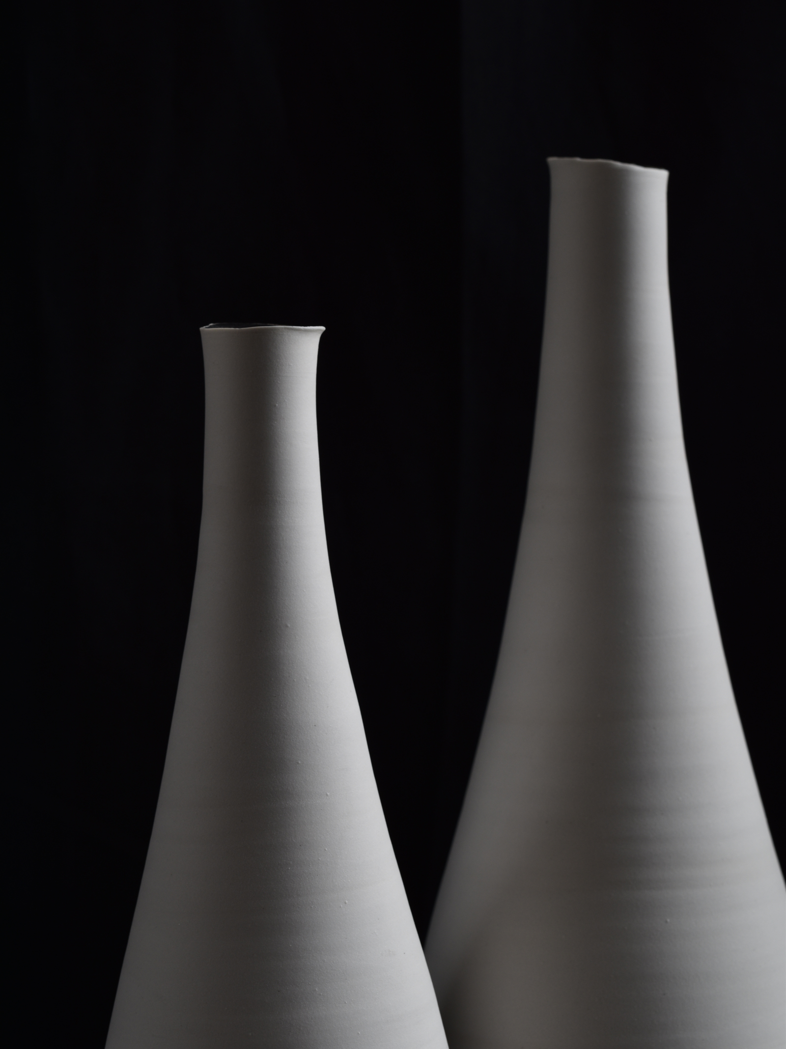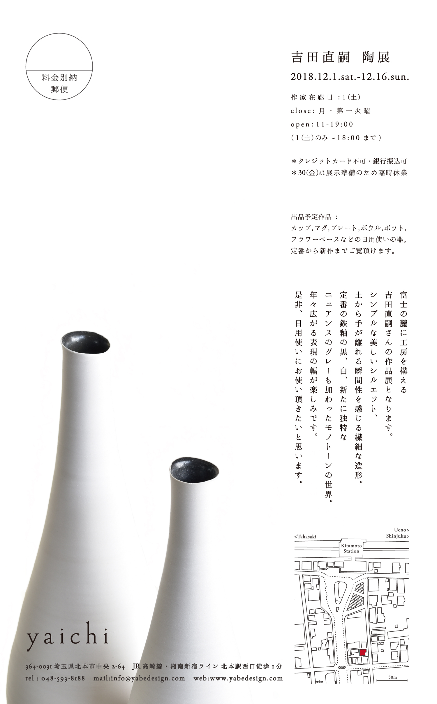富士の麓に工房を構える吉田直嗣さんの作品展となります。シンプルな美しいシルエット、土から手が離れる瞬間性を感じる繊細な造形。定番の鉄釉の黒、白、新たに独特なニュアンスのグレーも加わったモノトーンの世界。年々広がる表現の幅が楽しみです。是非、日用使いにお使い頂きたいと思います。