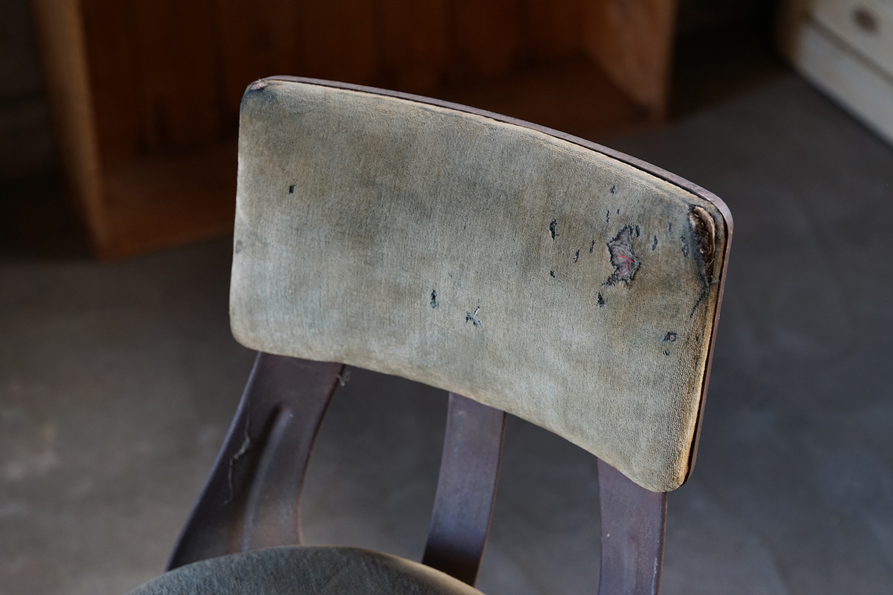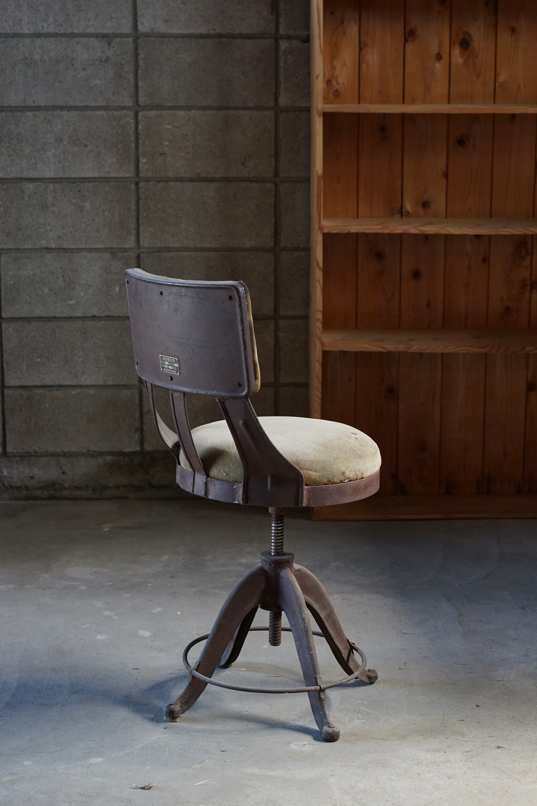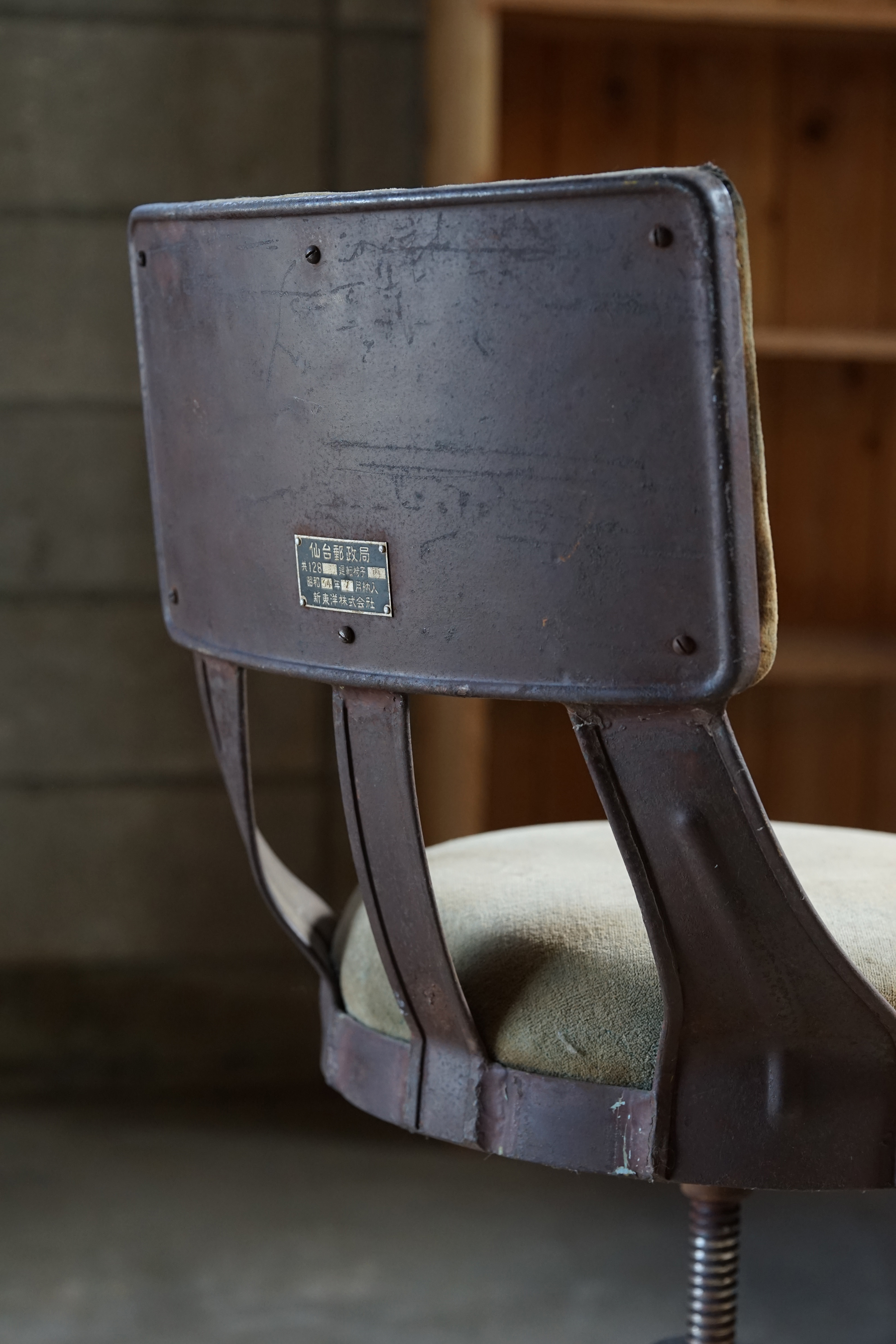 日本の古家具の中でも探すのに苦労する珍しい椅子です。主に昭和初期に郵便局などで使われていたもののようです。どっしりと重みのある味の良い鉄と独特な造形と背のバランスが綺麗です。大変希少な現存数の少ないアイテムです。高さ調節も可能です。