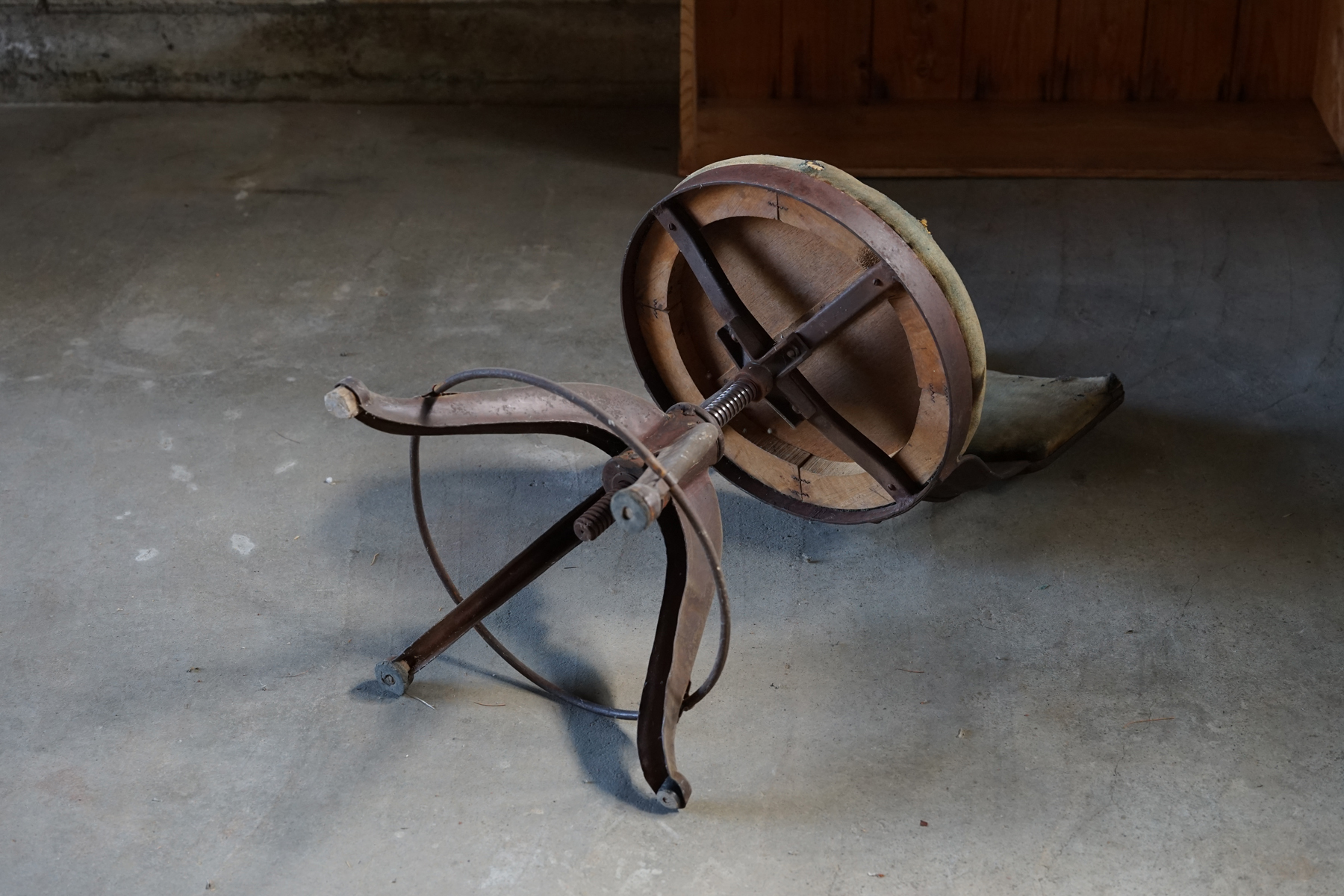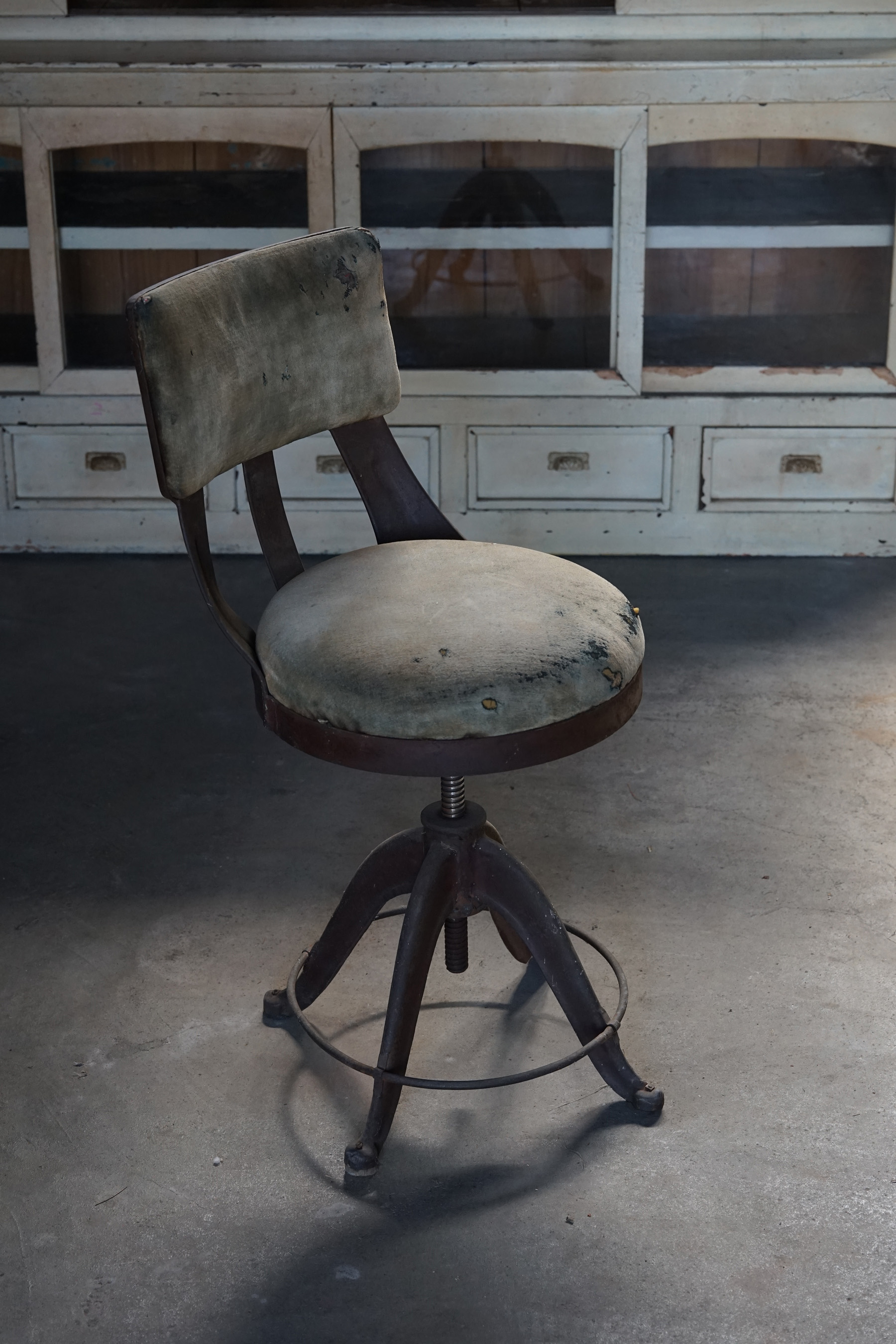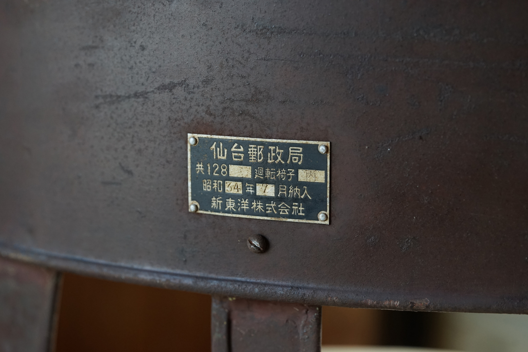 日本の古家具の中でも探すのに苦労する珍しい椅子です。主に昭和初期に郵便局などで使われていたもののようです。どっしりと重みのある味の良い鉄と独特な造形と背のバランスが綺麗です。大変希少な現存数の少ないアイテムです。高さ調節も可能です。