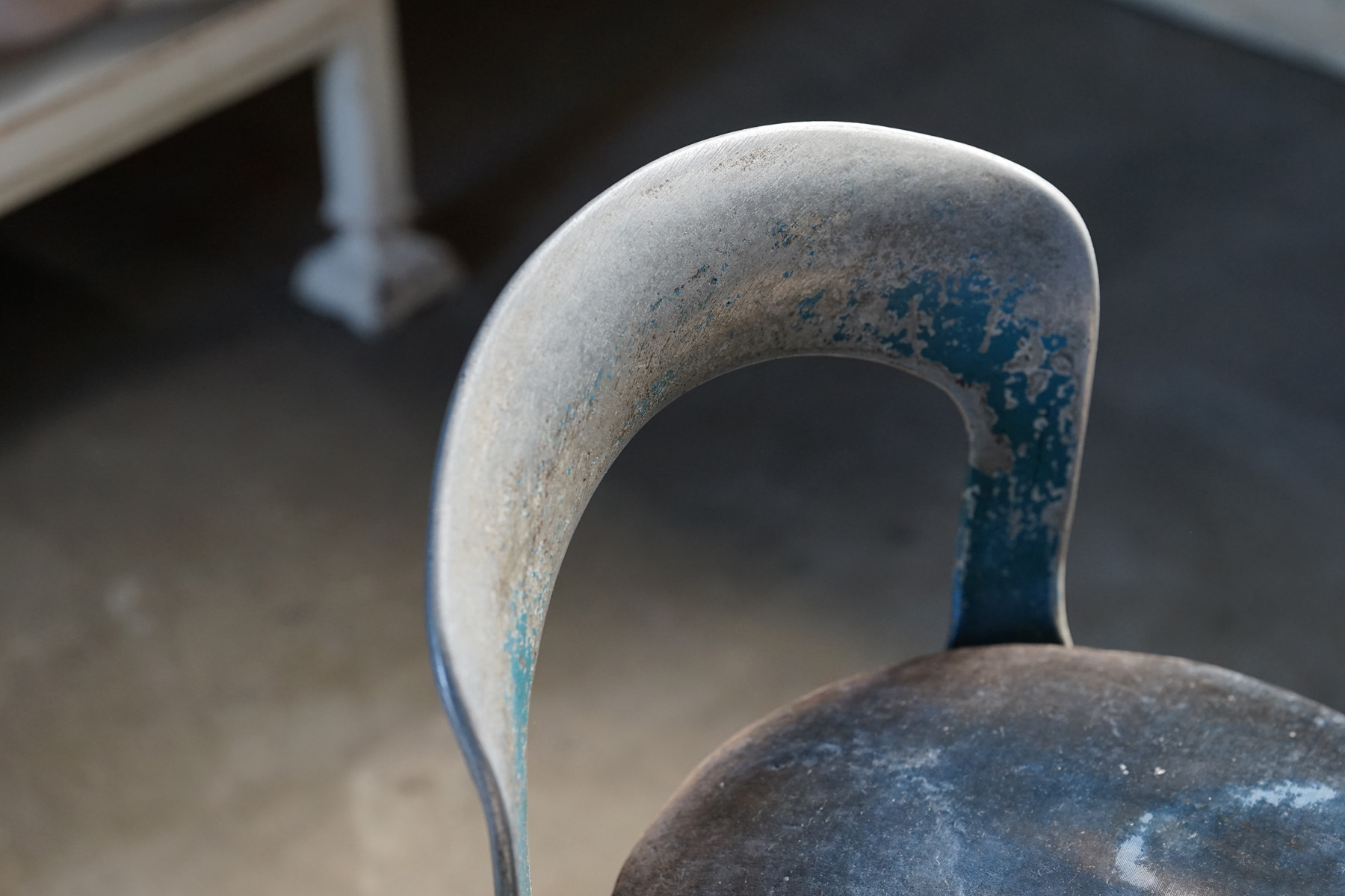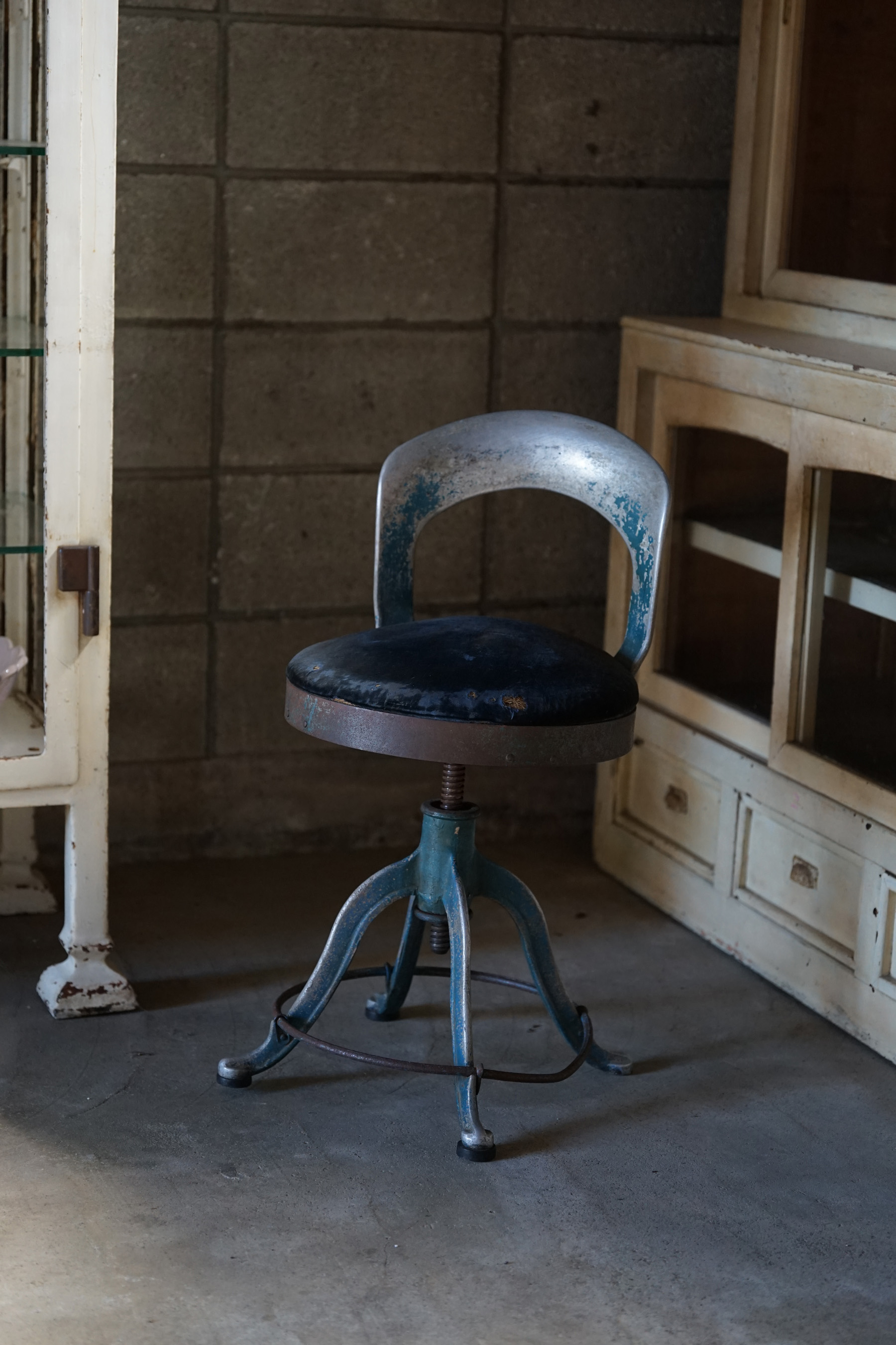 日本の古家具の中でもなかなか出会うことのできない椅子です。主に昭和初期に郵便局などで使われていたもののようです。どっしりと重みのある味の良い鉄と独特な造形と背のバランスが綺麗です。オリジナルの状態となりますので座面生地の傷み等はご了承下さい。張り替えても素敵かと思います。大変希少な現存数の少ないアイテムです。高さ調節も可能です。