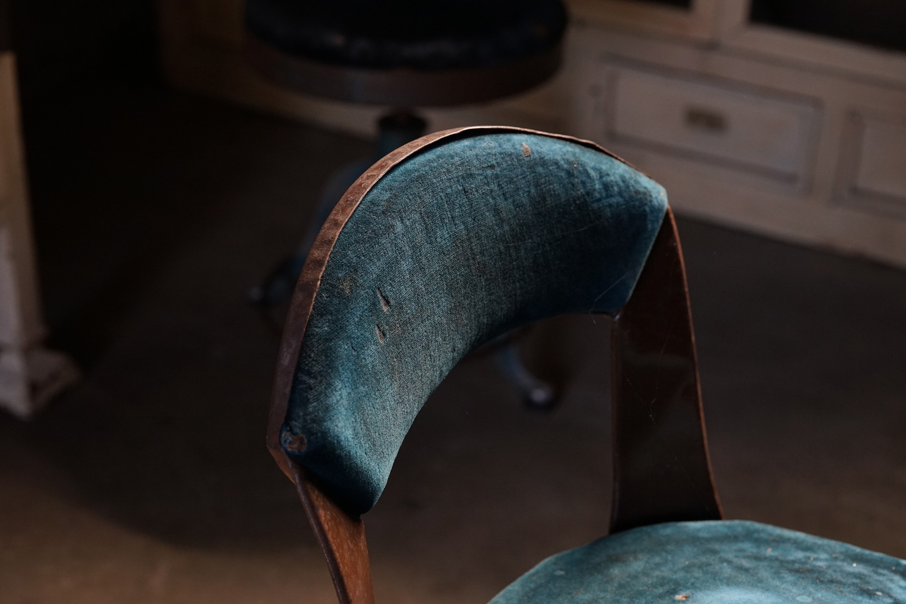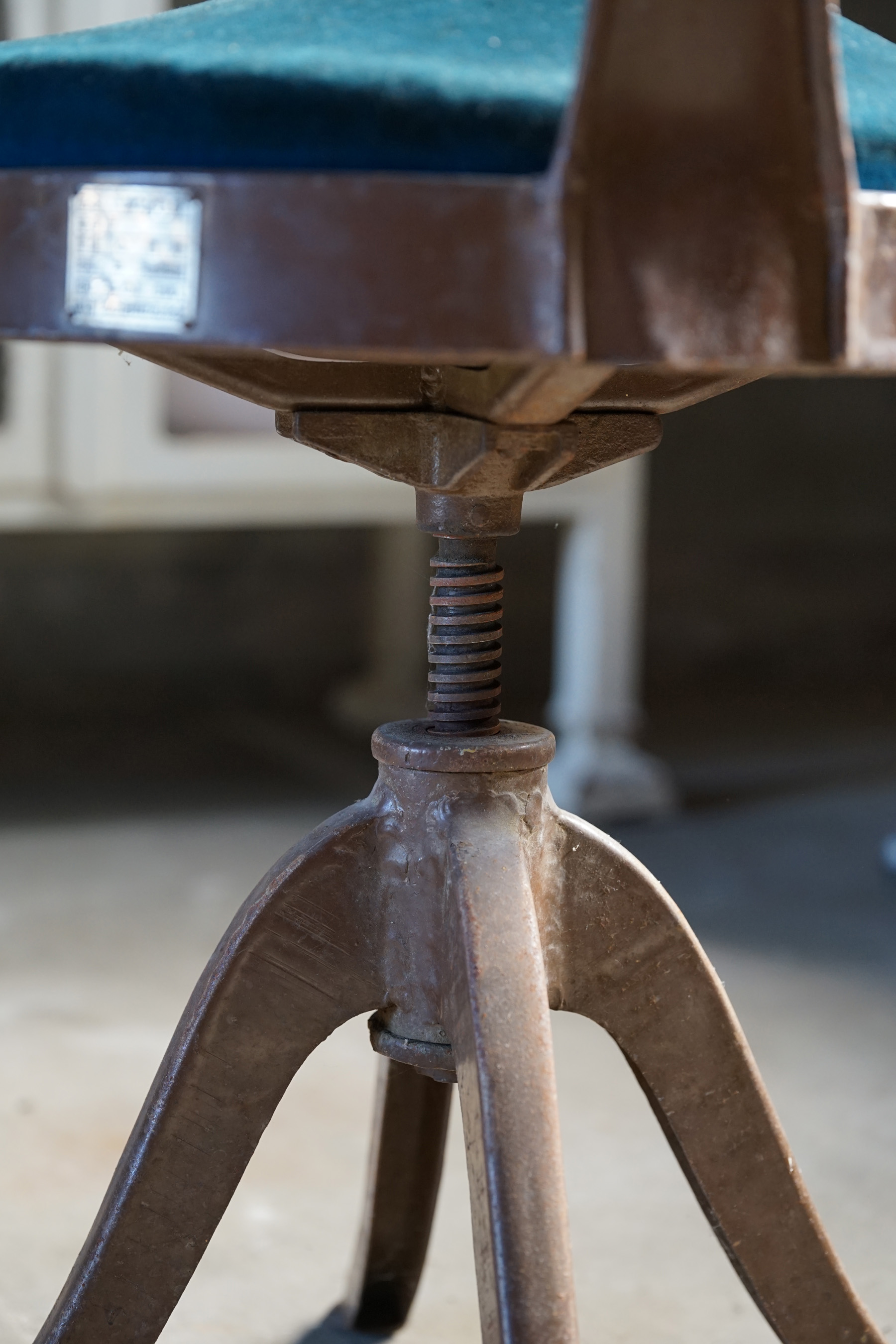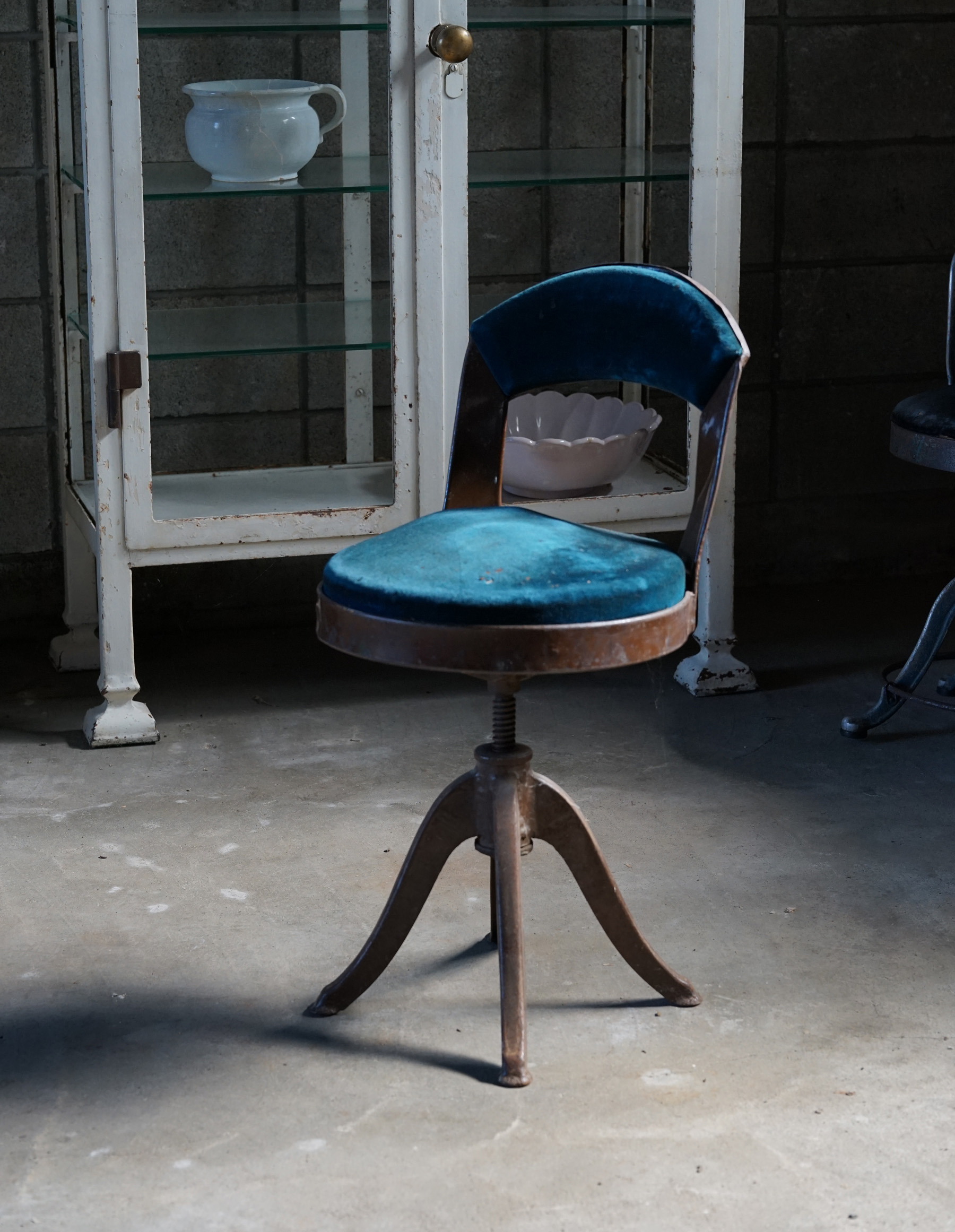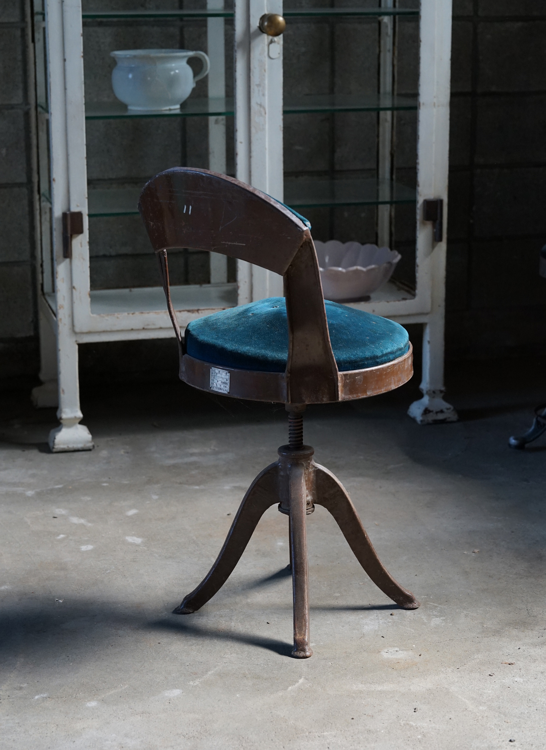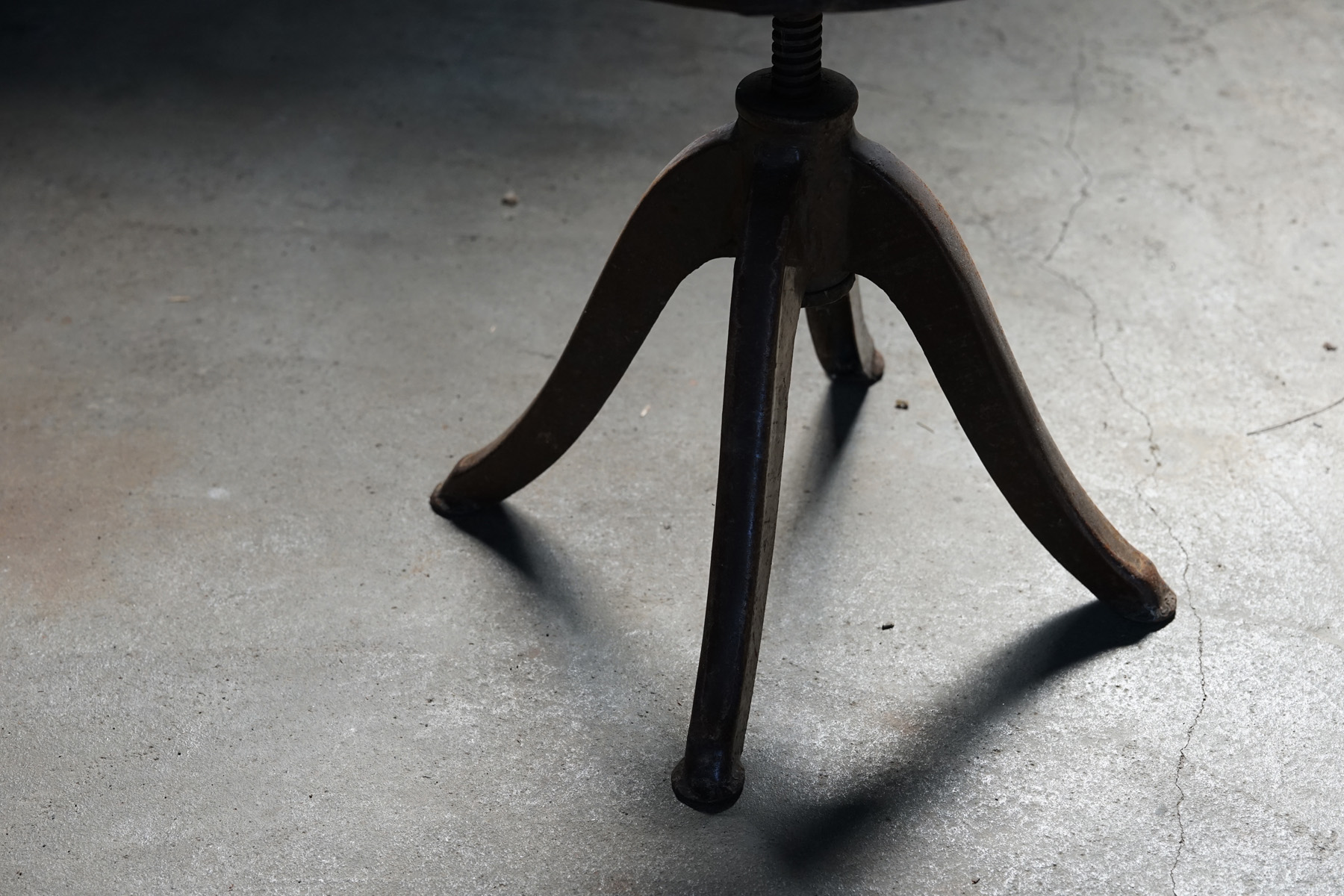 日本の古家具の中でもなかなか出会うことのできない椅子です。主に昭和初期に郵便局などで使われていたもののようです。どっしりと重みのある味の良い鉄と独特な造形と背のバランスが綺麗です。オリジナルの状態となりますので座面生地の傷み等はご了承下さい。張り替えても素敵かと思います。大変希少な現存数の少ないアイテムです。高さ調節も可能です。