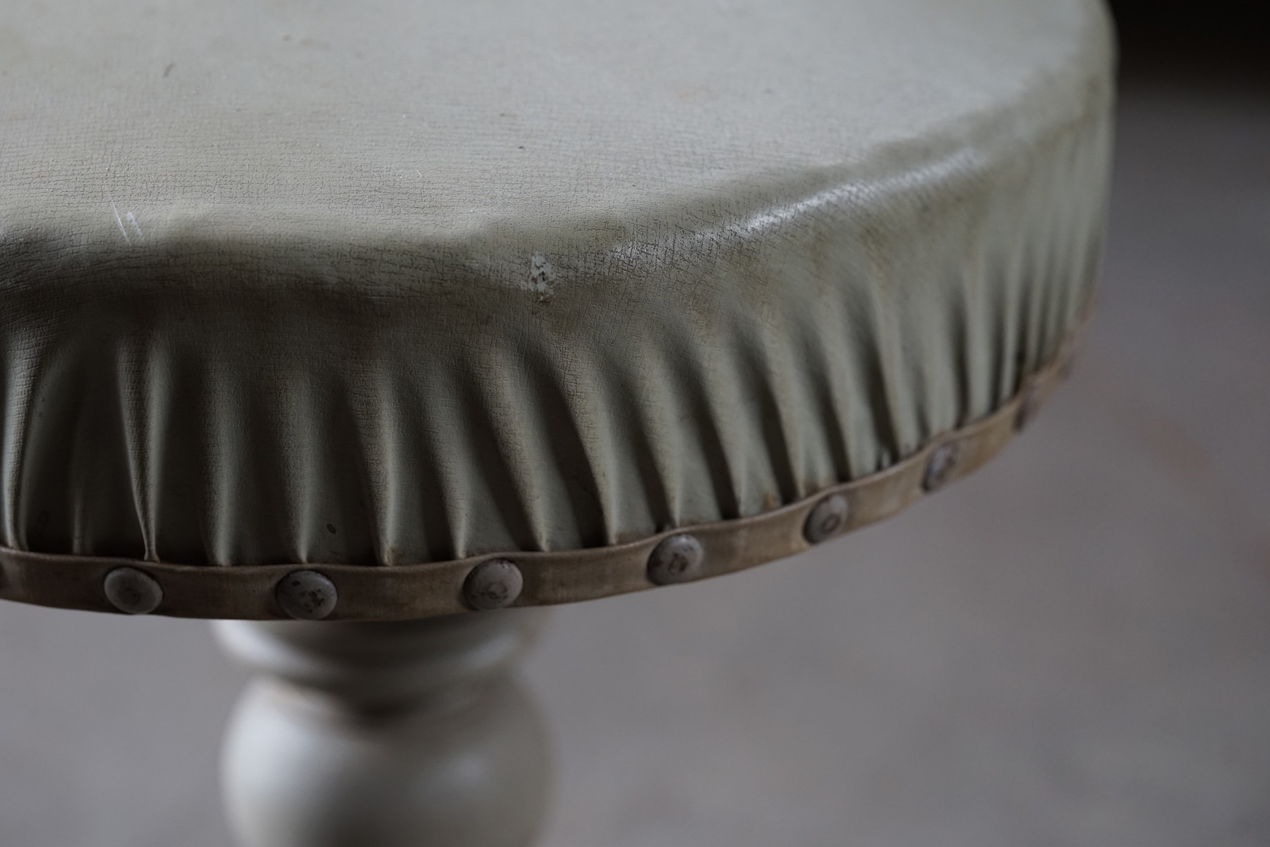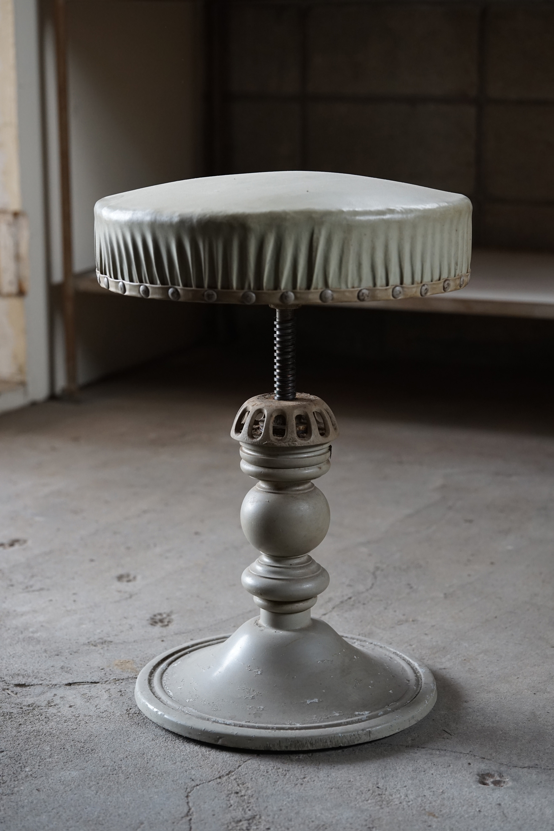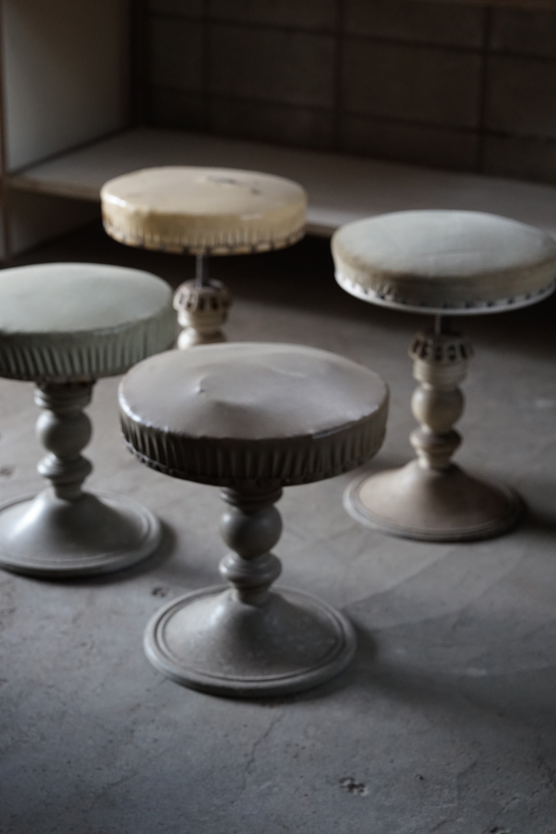 戦後の和洋折衷期のものです。手の込んだ、大変珍しい回転椅子です。脚の中央の装飾部分は木製で上部の飾りは金属製です。金属部分を固定して座面を回すと高さ調整できます。そのままだと高さが変わらず、通常の回転椅子となります。