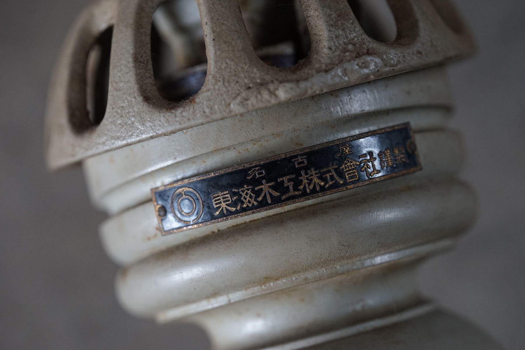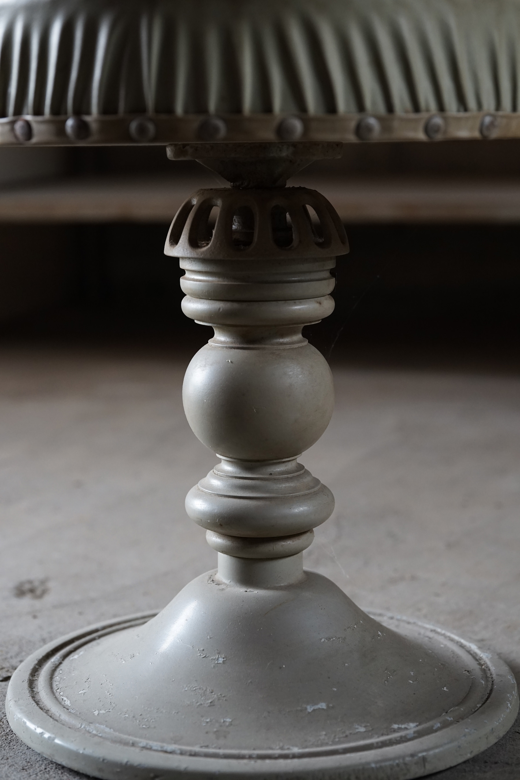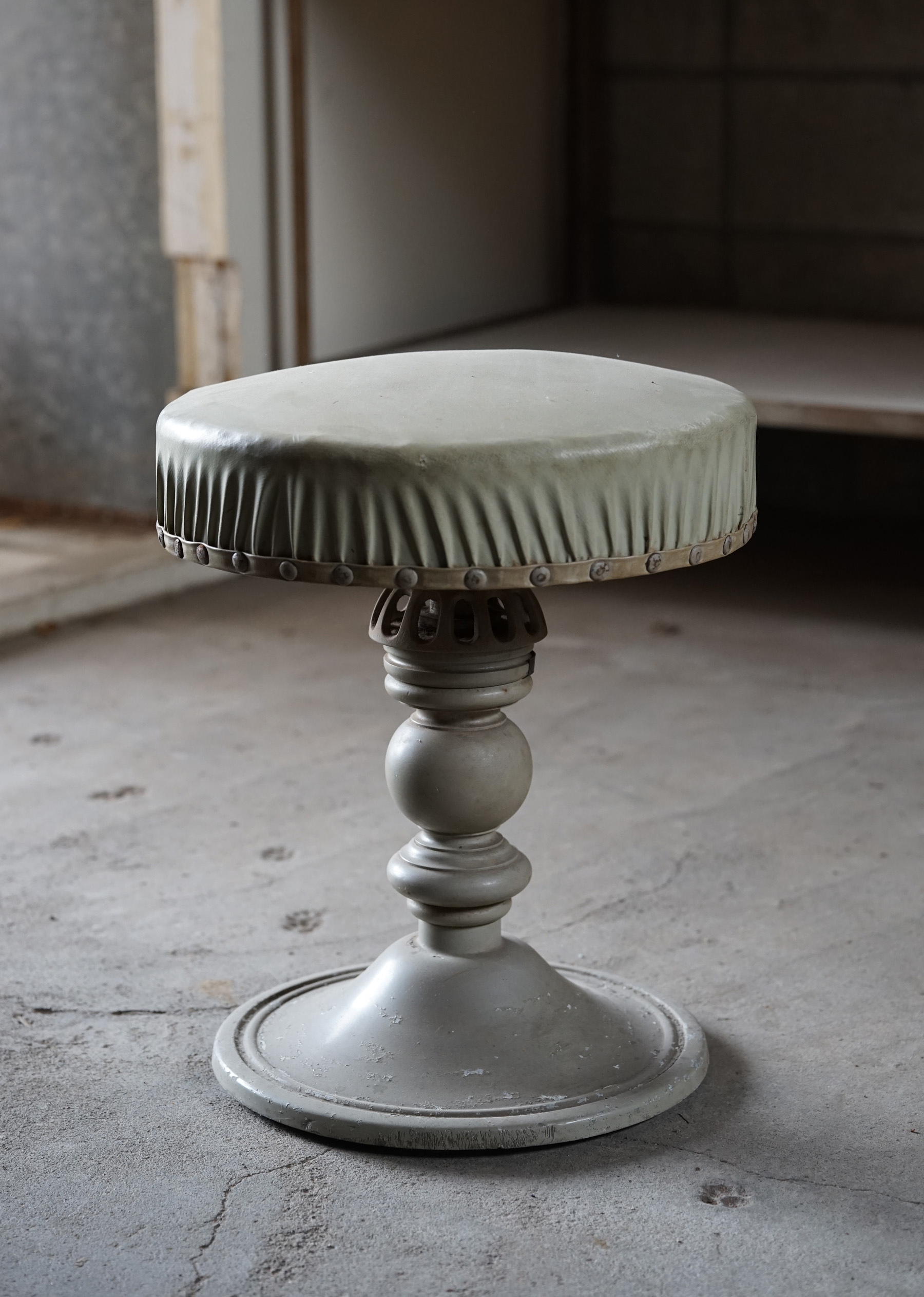 戦後の和洋折衷期のものです。手の込んだ、大変珍しい回転椅子です。脚の中央の装飾部分は木製で上部の飾りは金属製です。金属部分を固定して座面を回すと高さ調整できます。そのままだと高さが変わらず、通常の回転椅子となります。