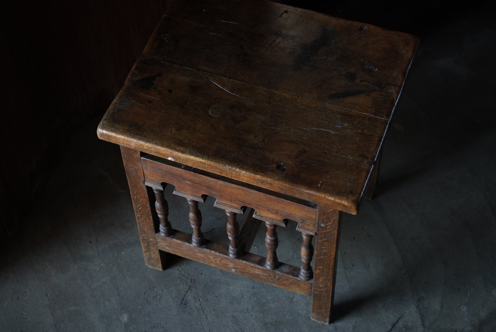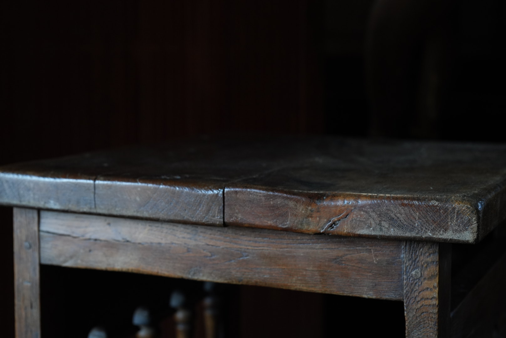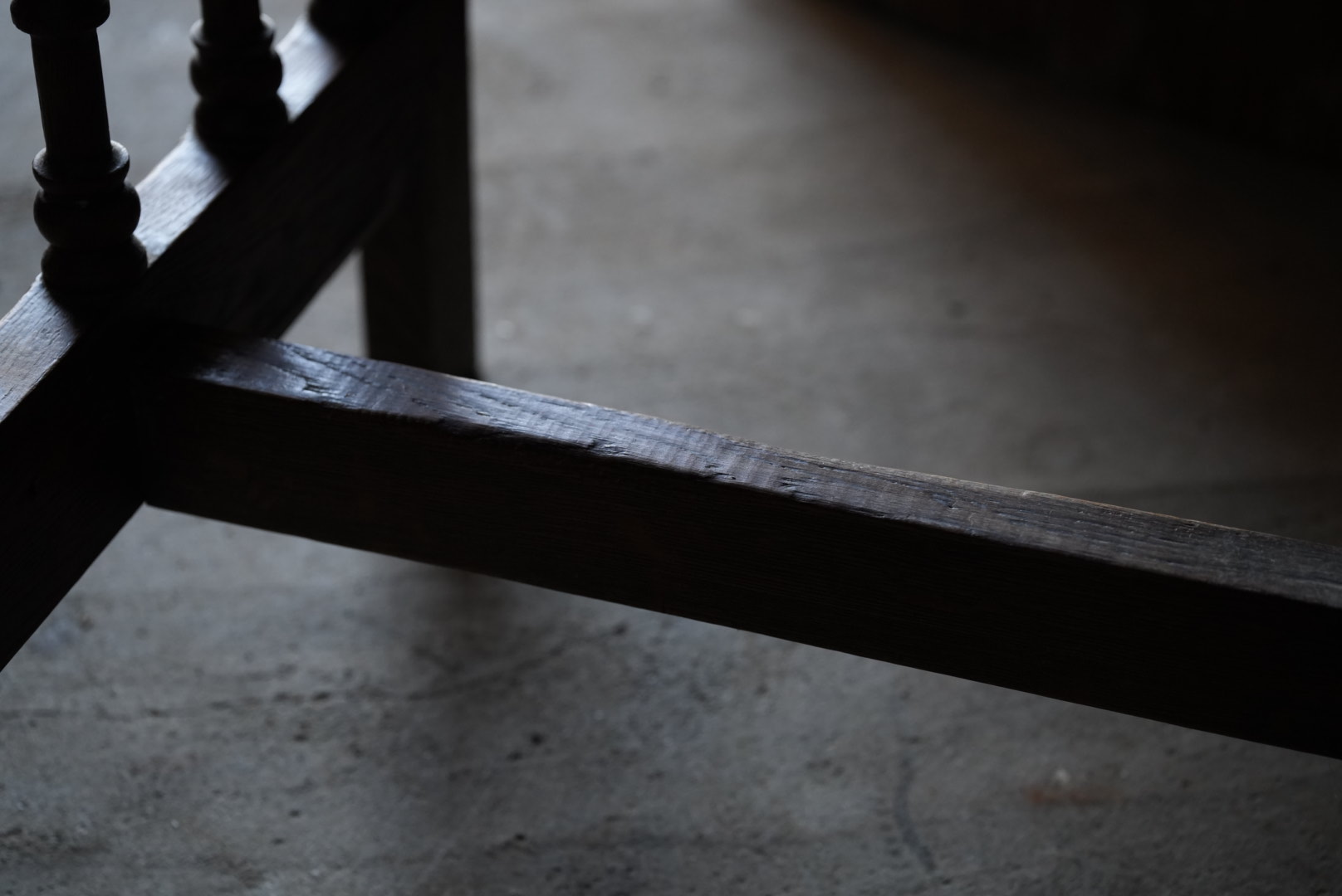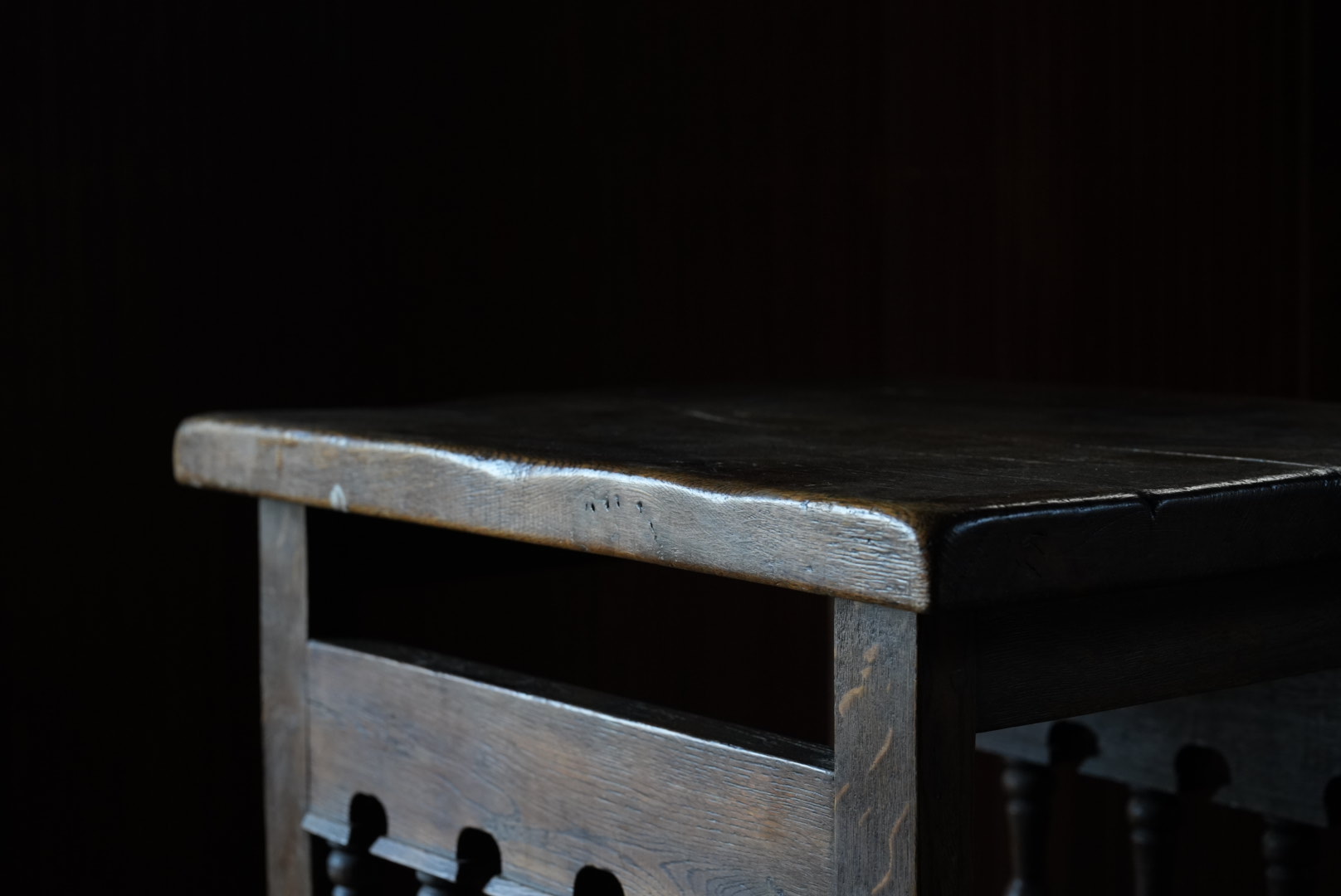 天板には経年変化から凹凸があり、持ち主は肉屋のまな板テーブルだったのではとの事ですが作り的に異なるように思います。