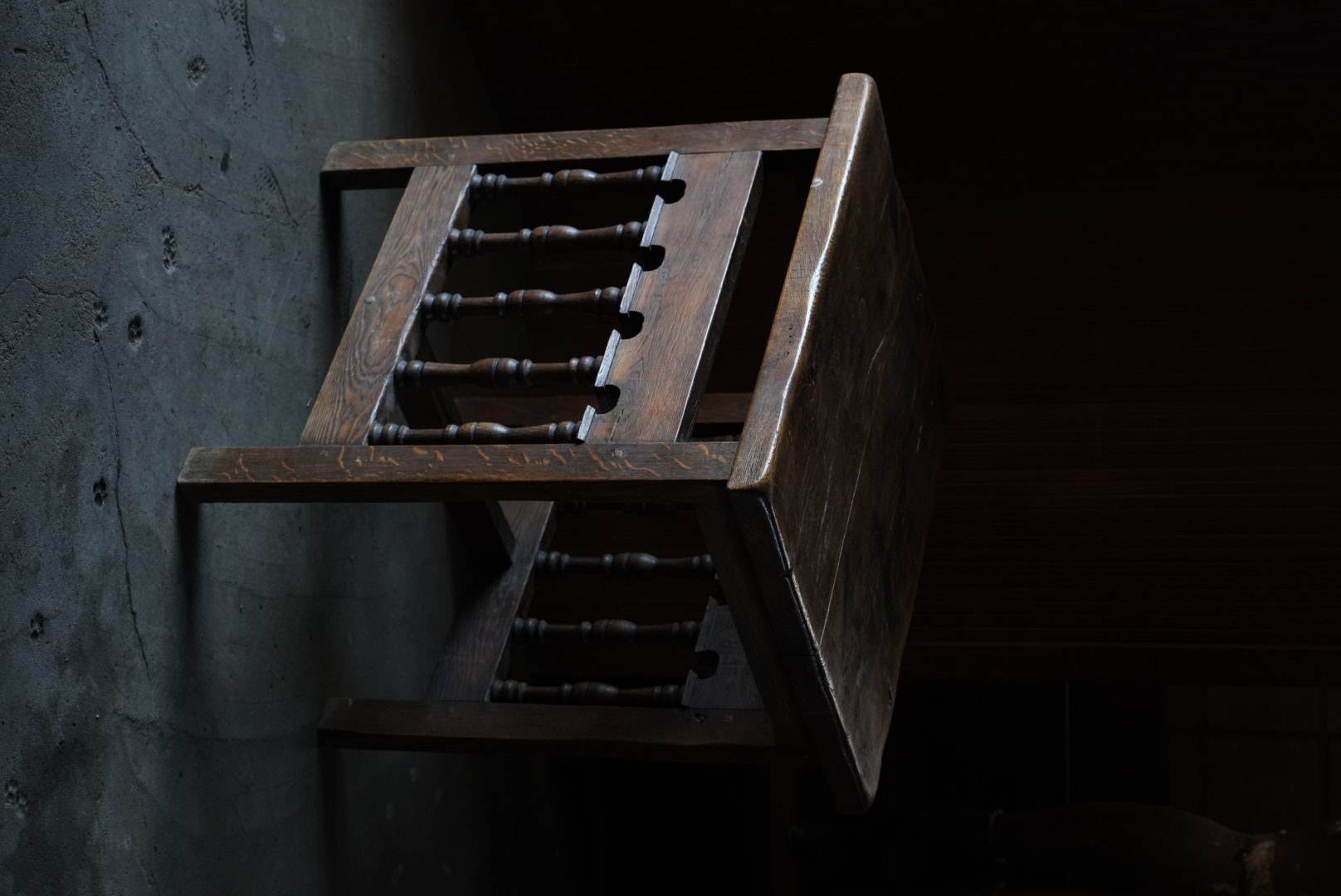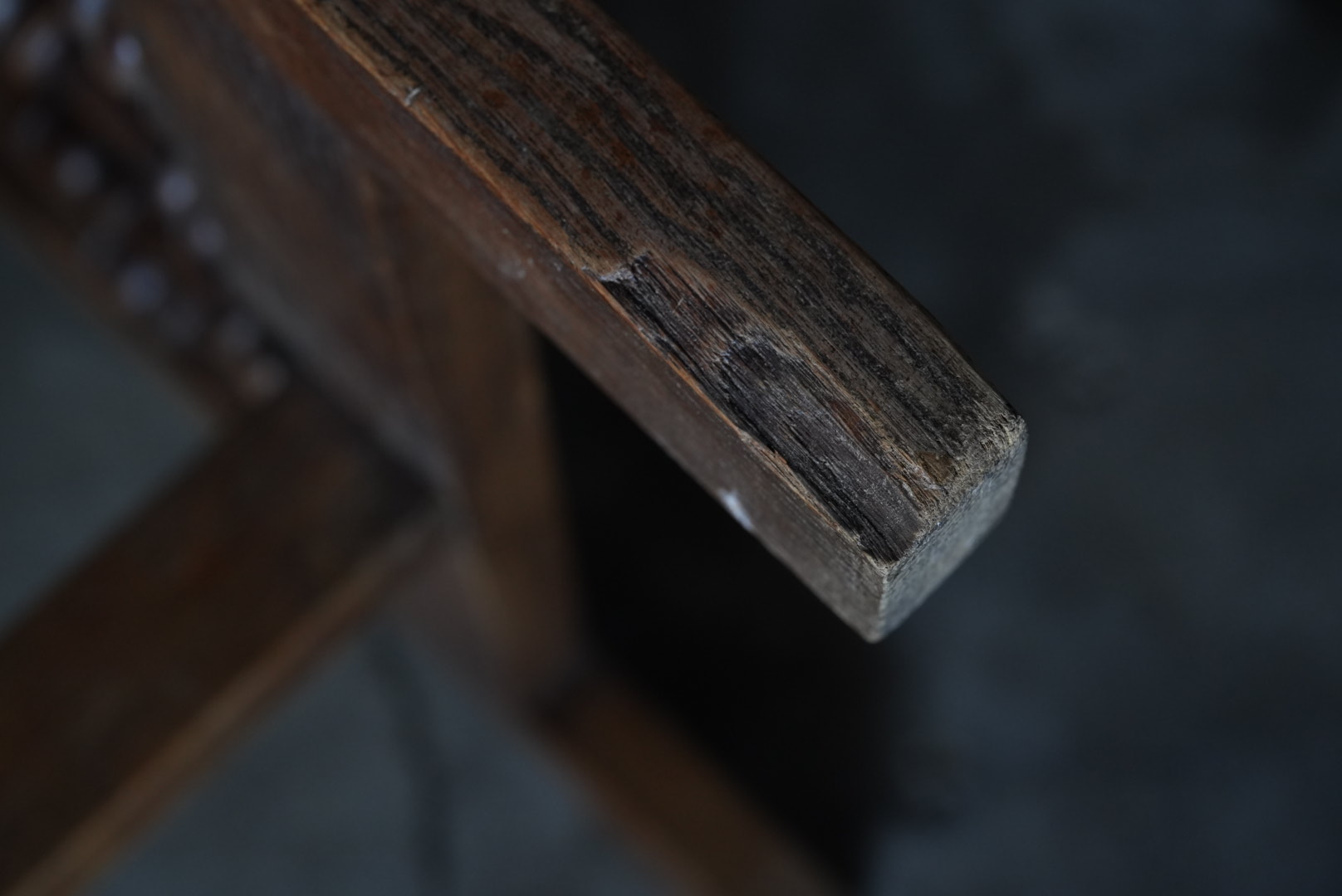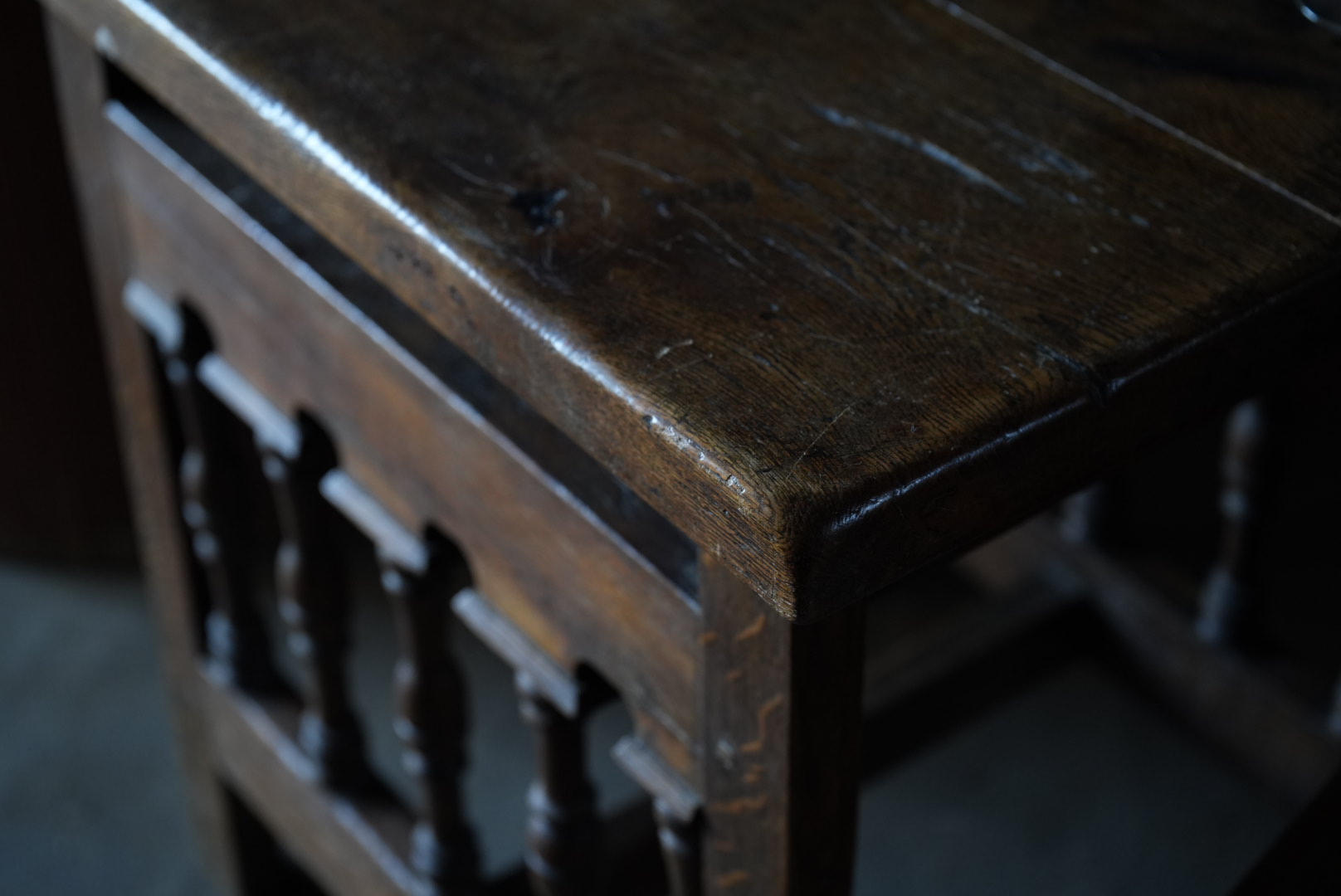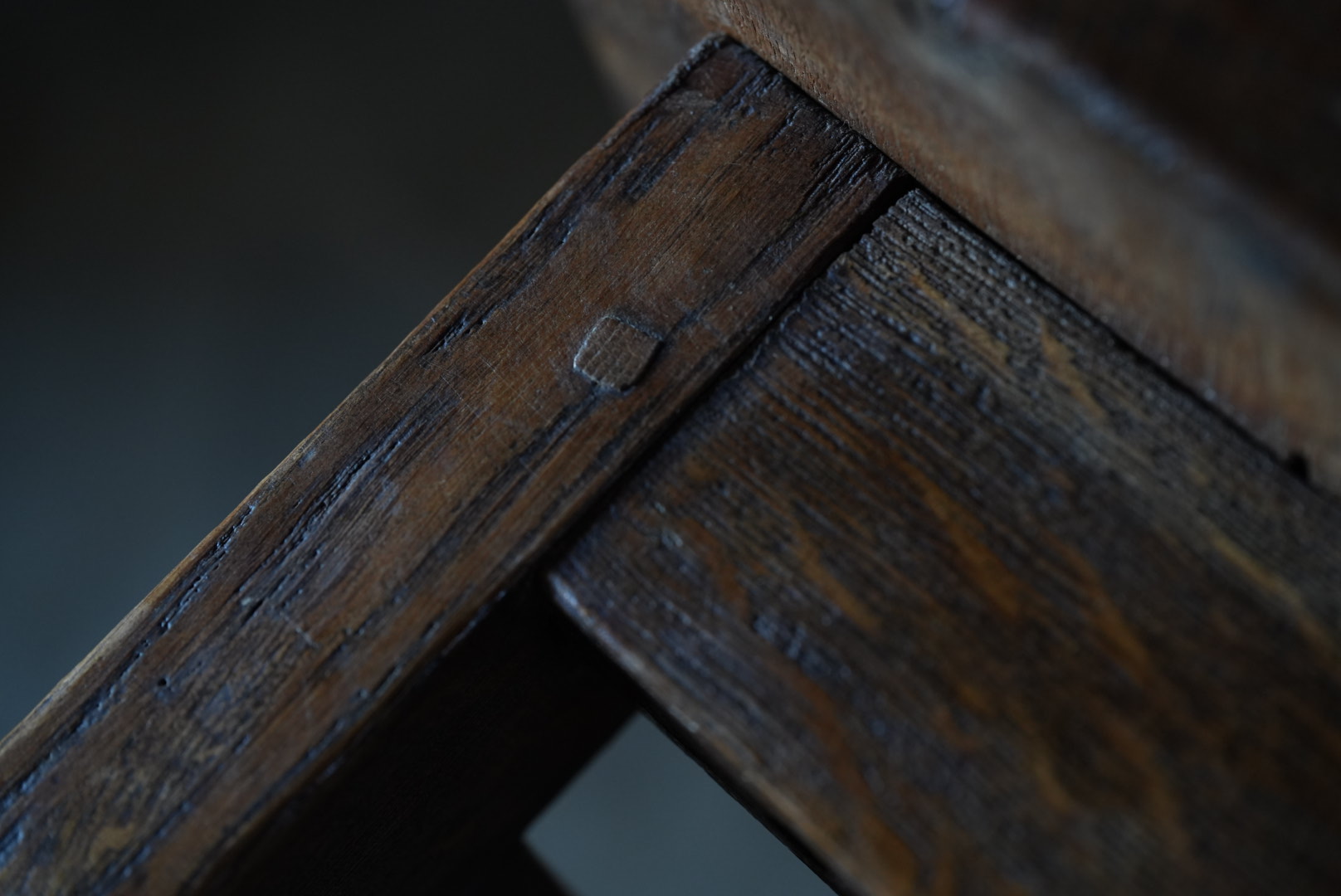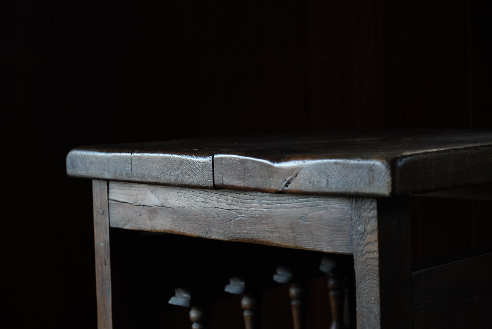 天板には経年変化から凹凸があり、持ち主は肉屋のまな板テーブルだったのではとの事ですが作り的に異なるように思います。