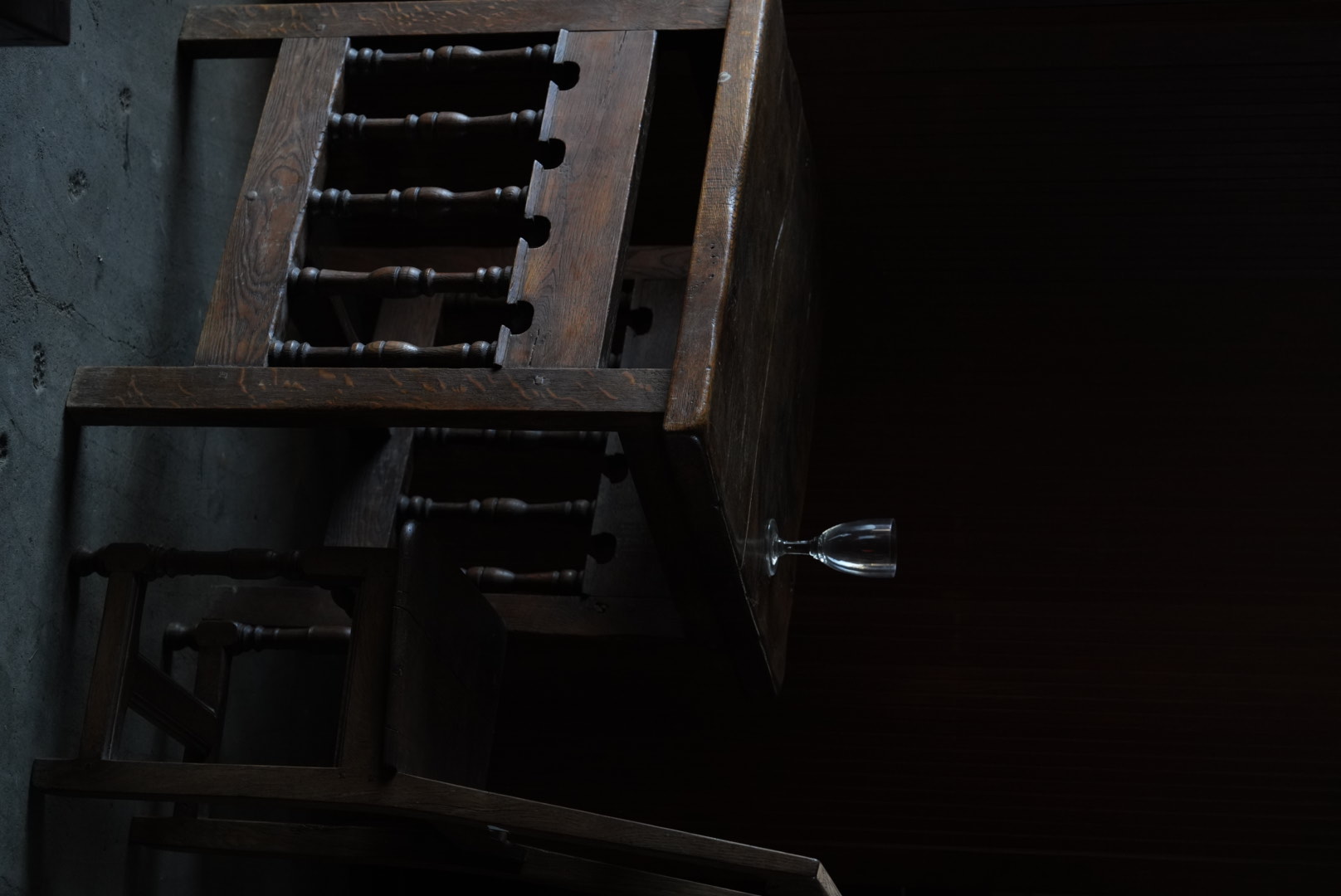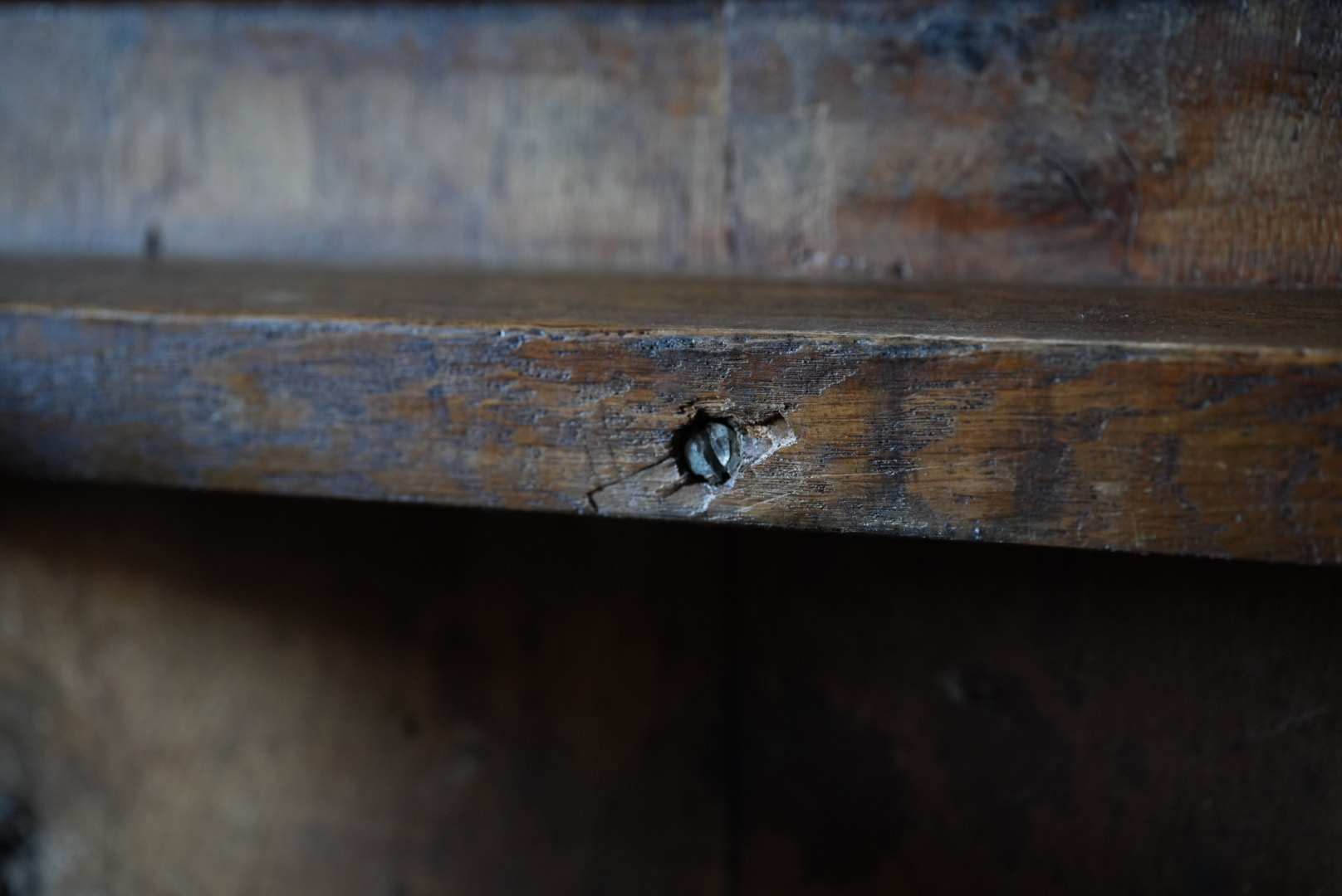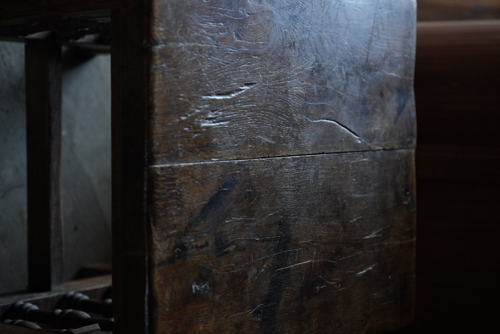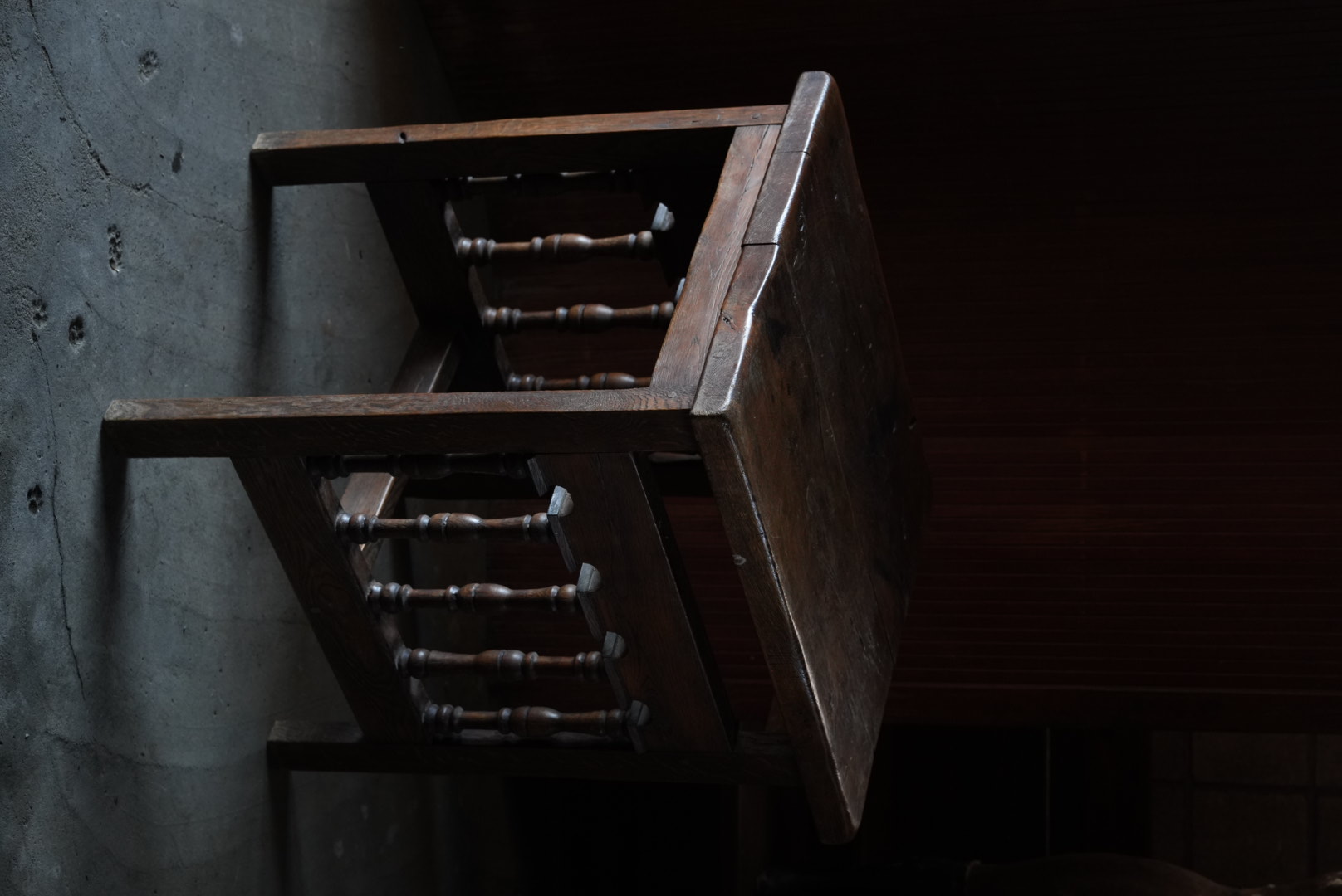 天板には経年変化から凹凸があり、持ち主は肉屋のまな板テーブルだったのではとの事ですが作り的に異なるように思います。