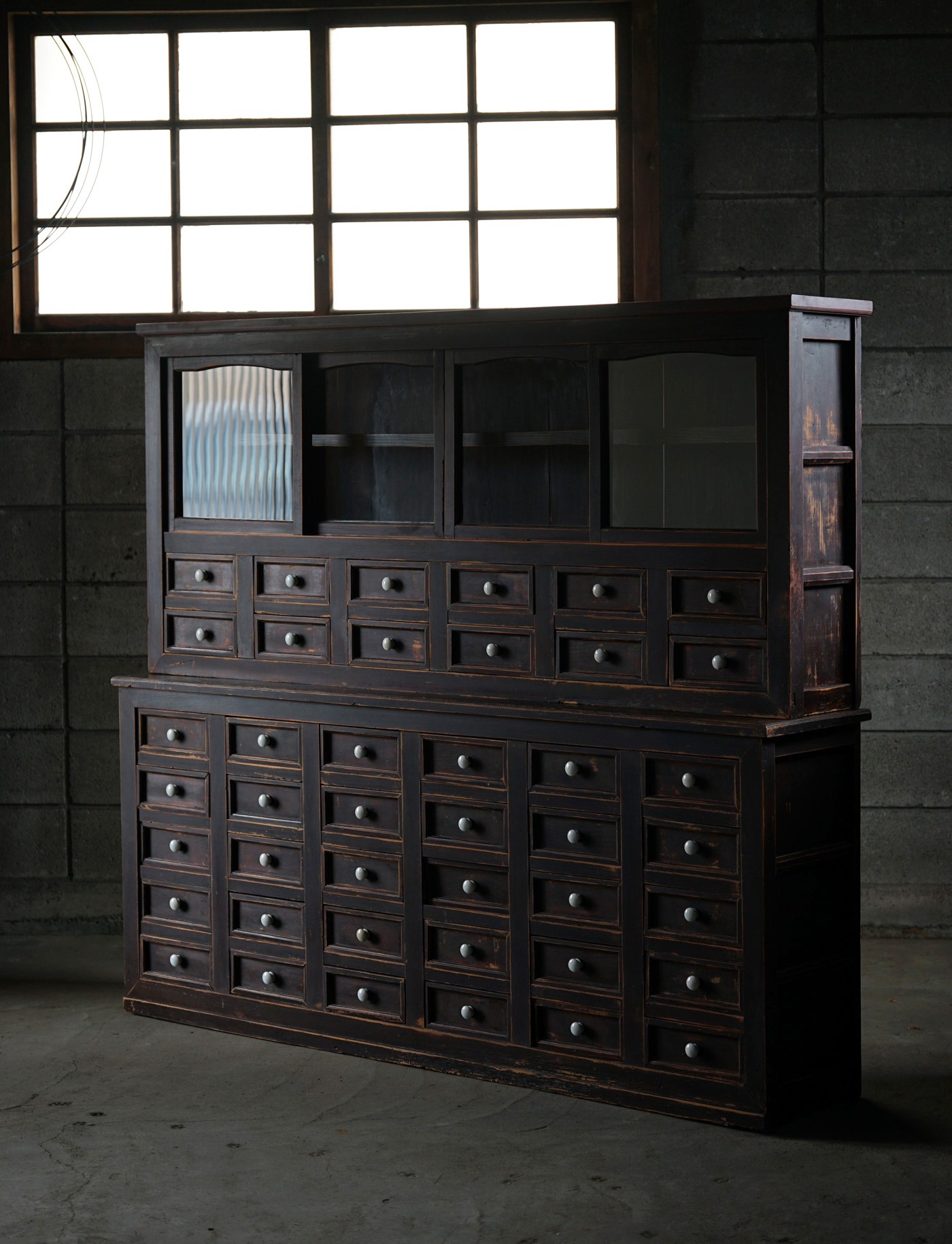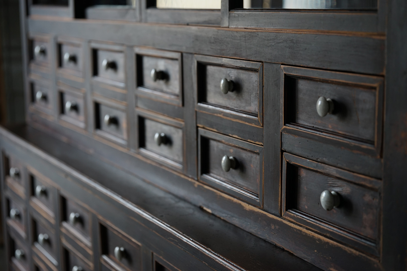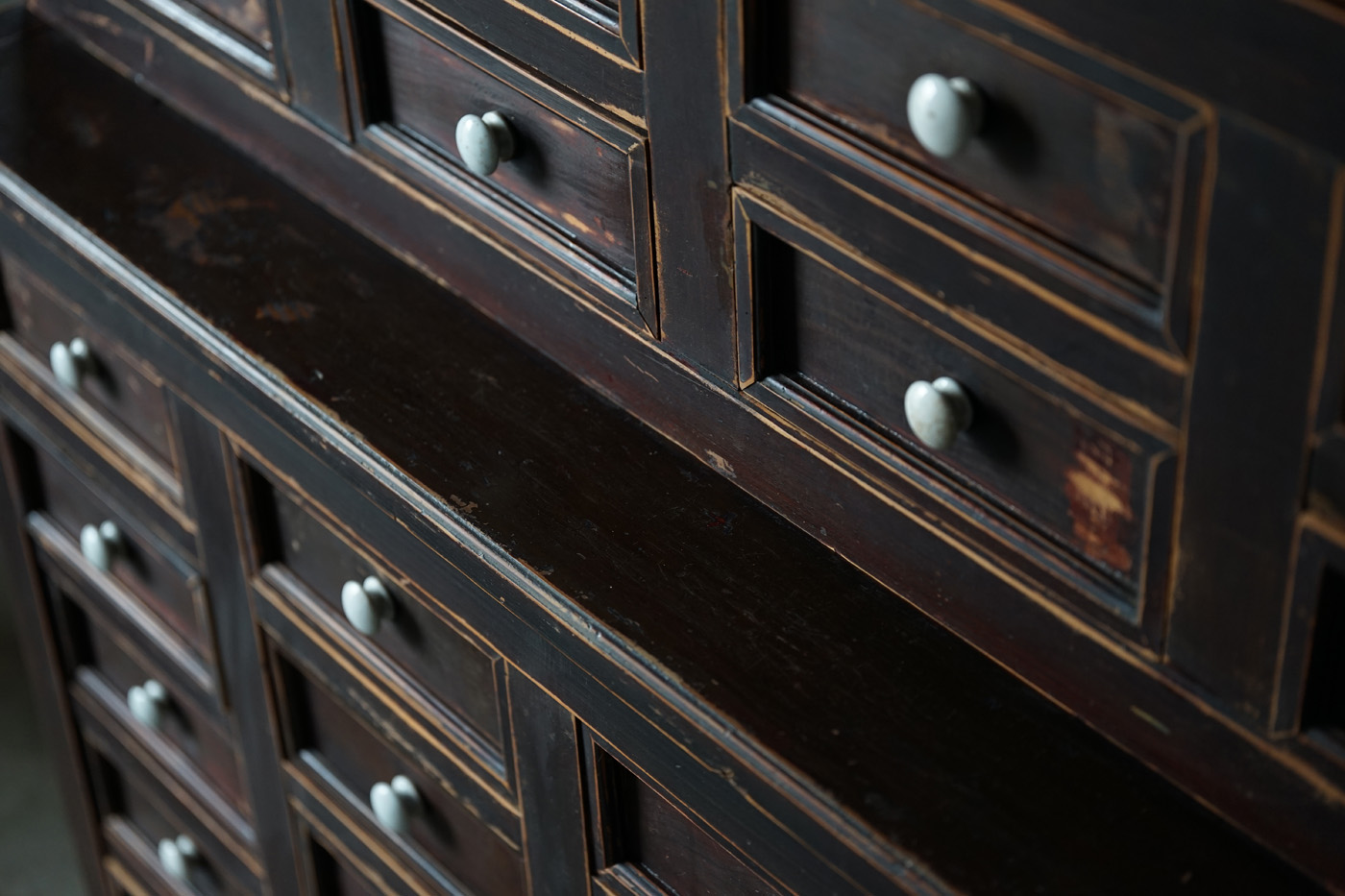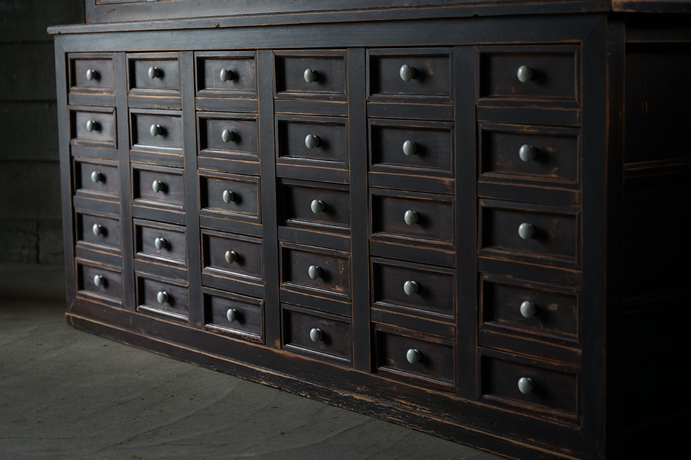 沢山の引き出しが連続的な美しさと存在感があります。シンプルな装飾のある和箪笥です。