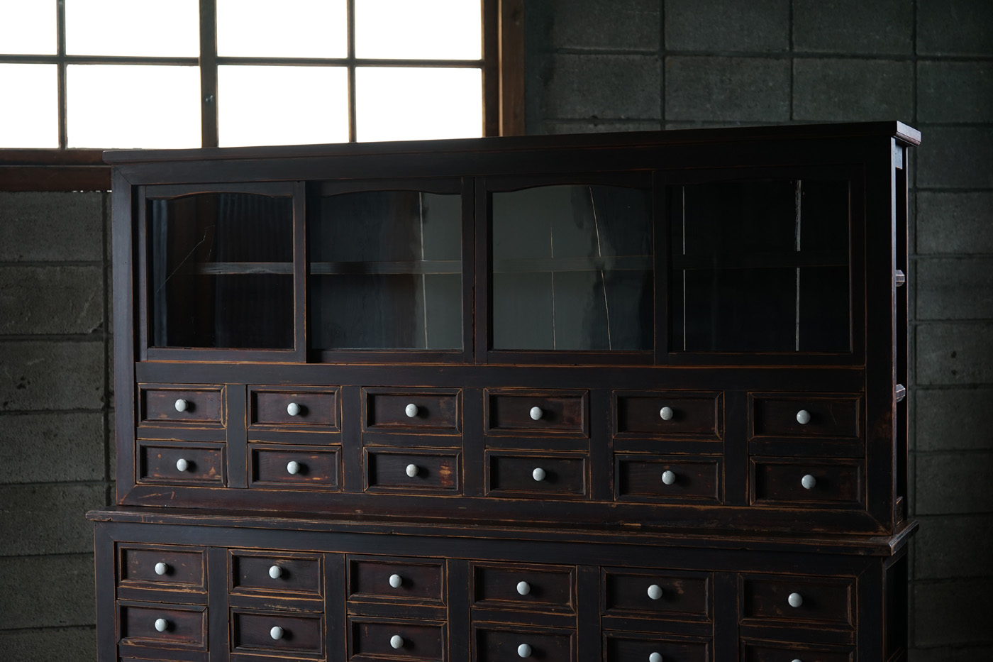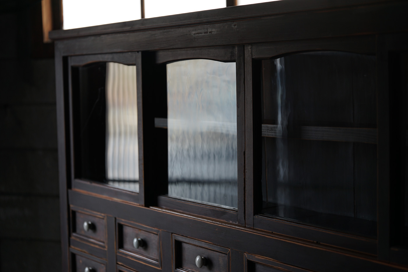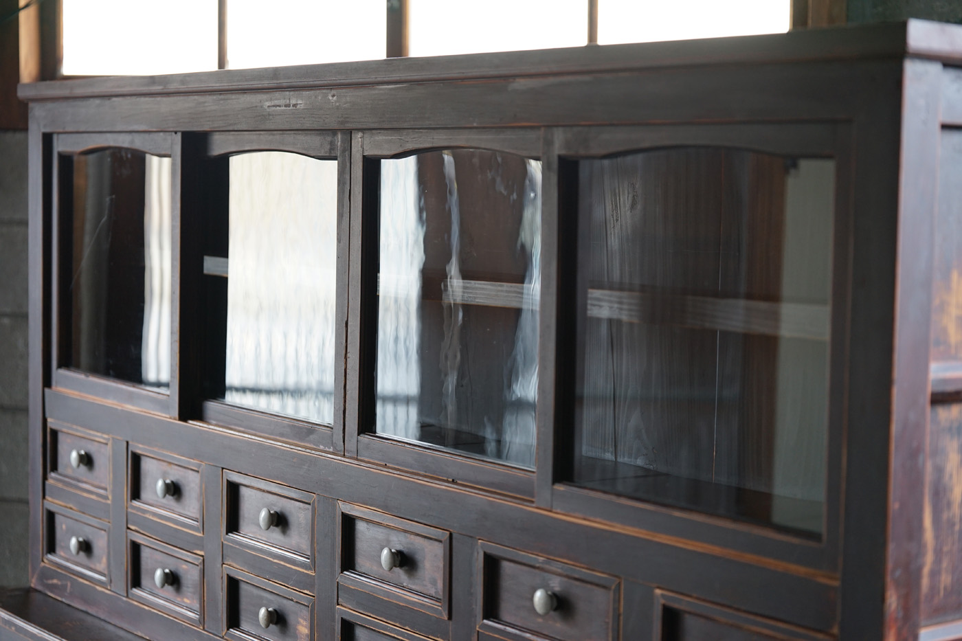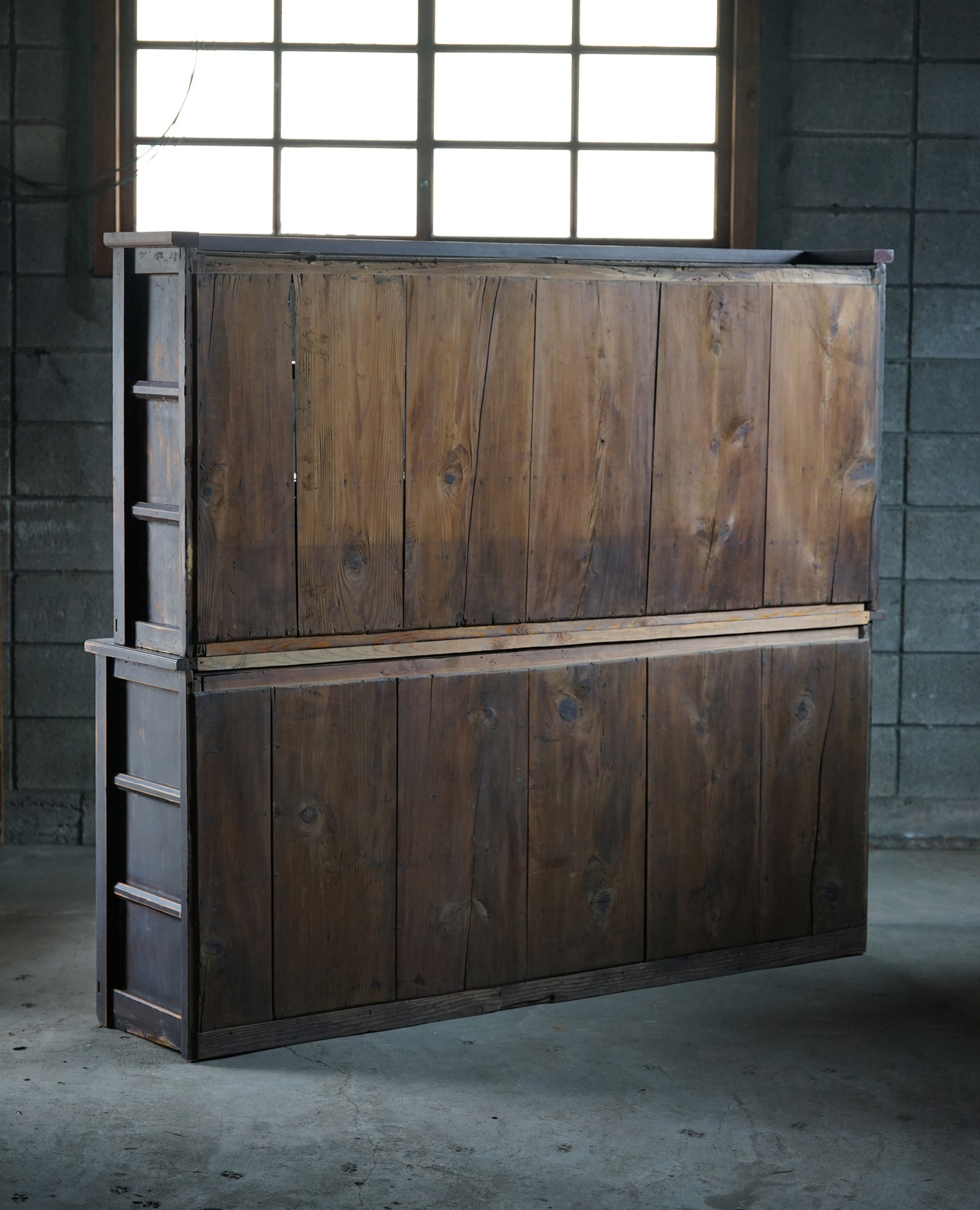沢山の引き出しが連続的な美しさと存在感があります。シンプルな装飾のある和箪笥です。