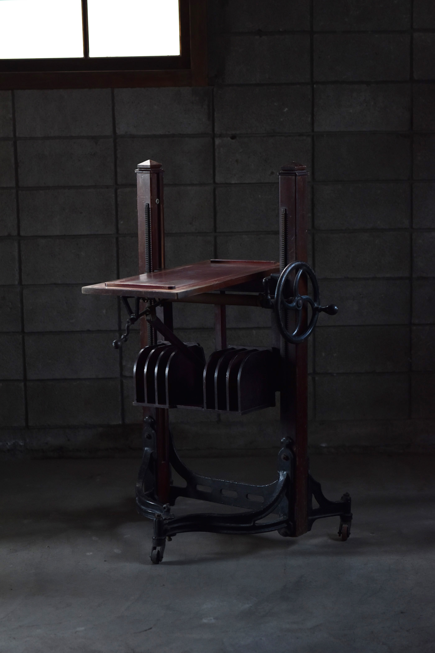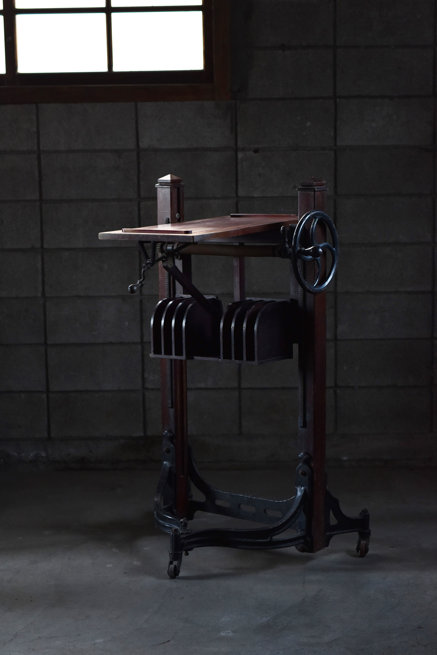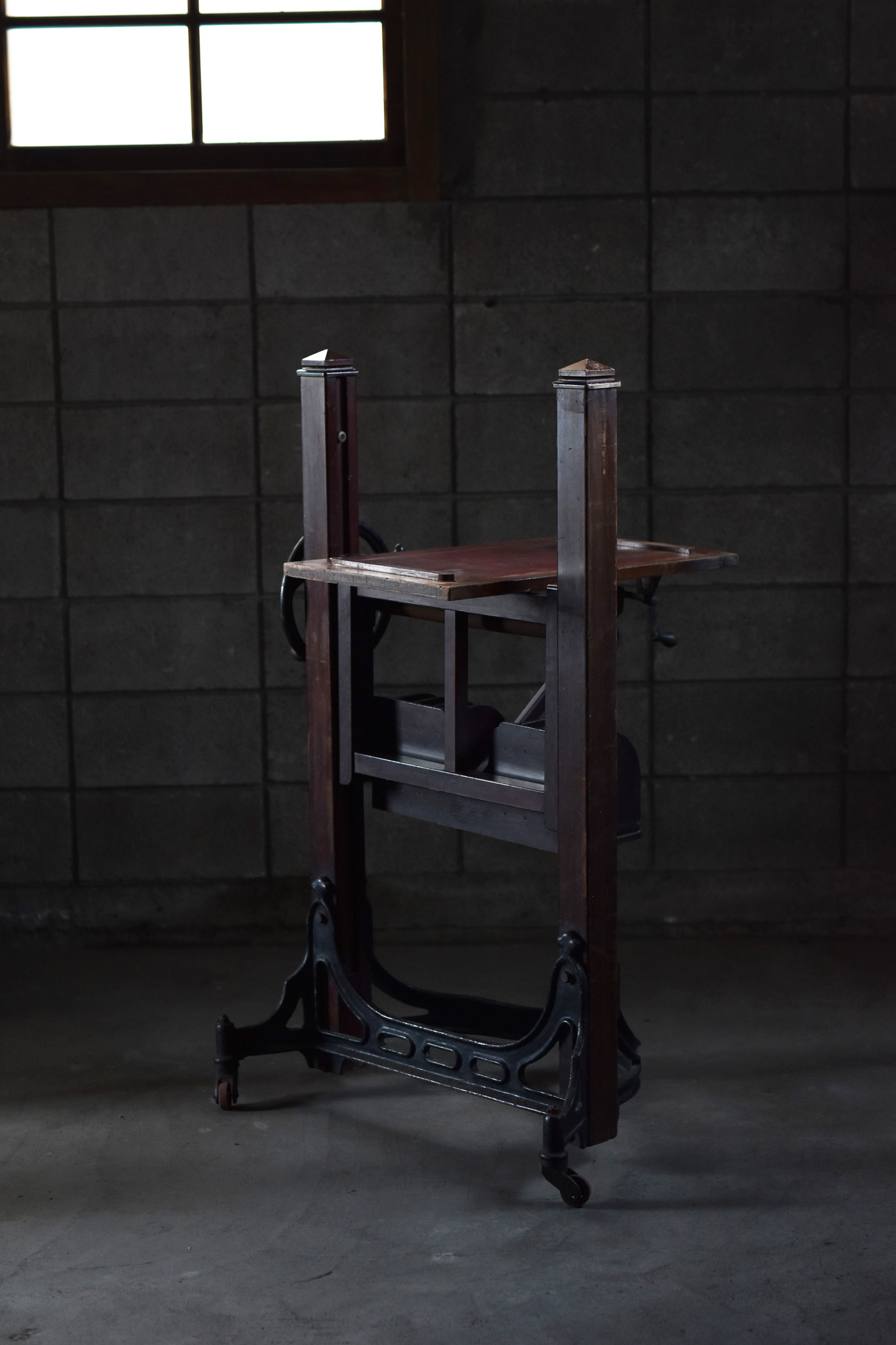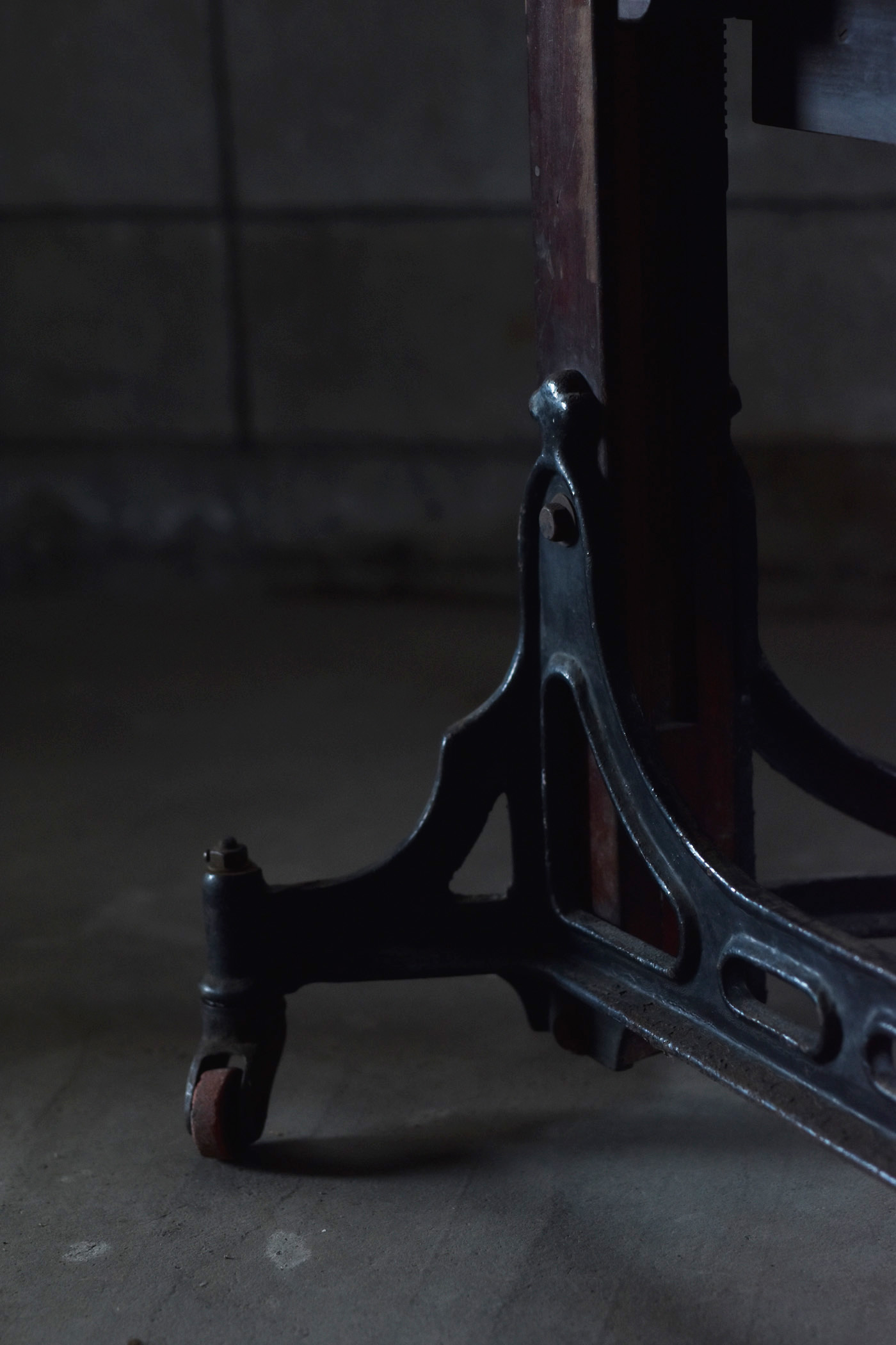 大変珍しい、鋳物のパーツと木の組み合わせの写真館で使われていた大型写真機の作業台です。写真機の乗っていた台は高さ・角度調整ができます。とても重厚な造りです。キャスター可動します。特別な展示台として。