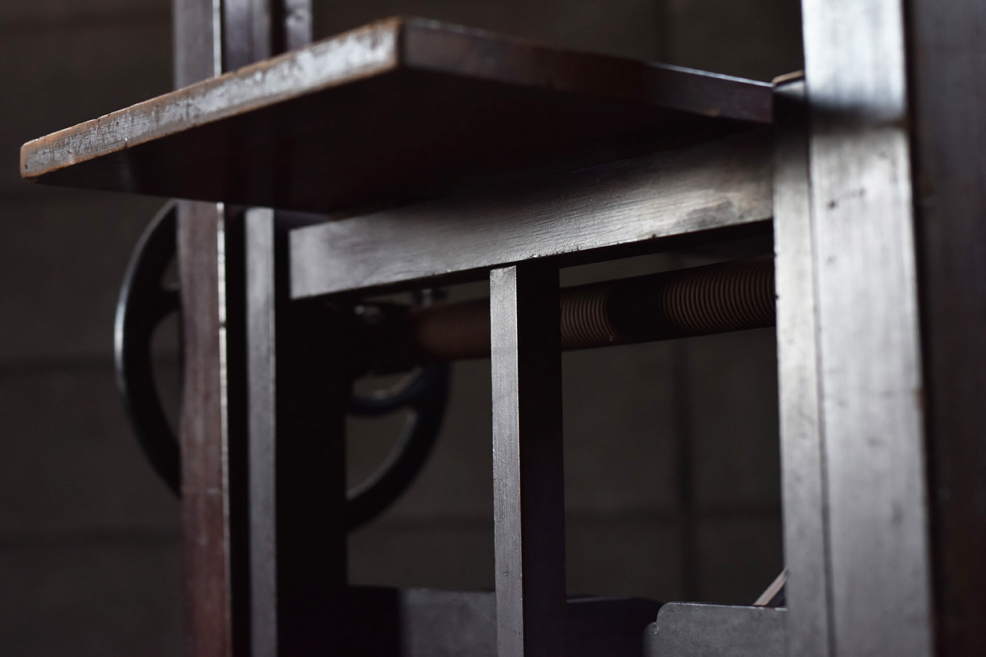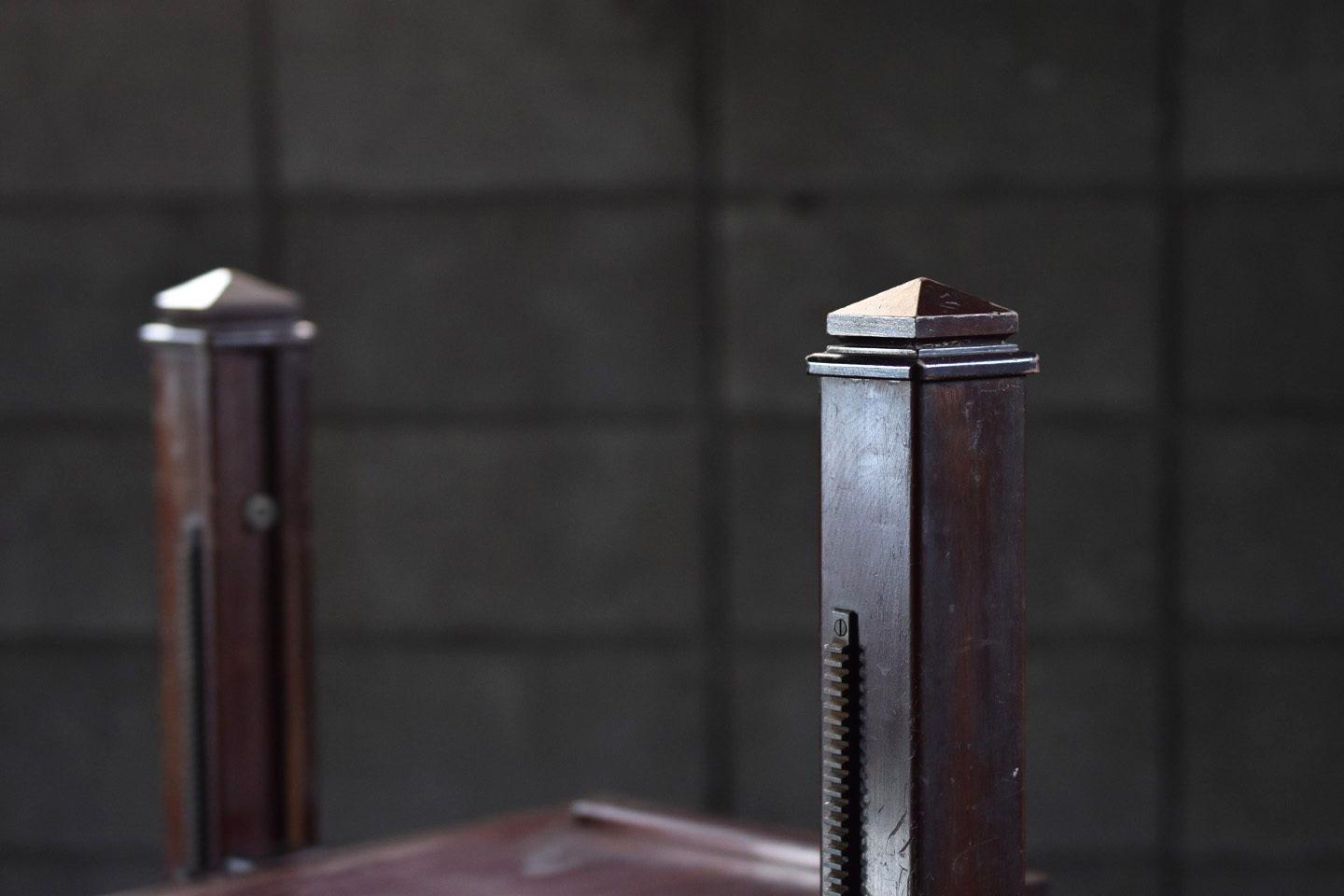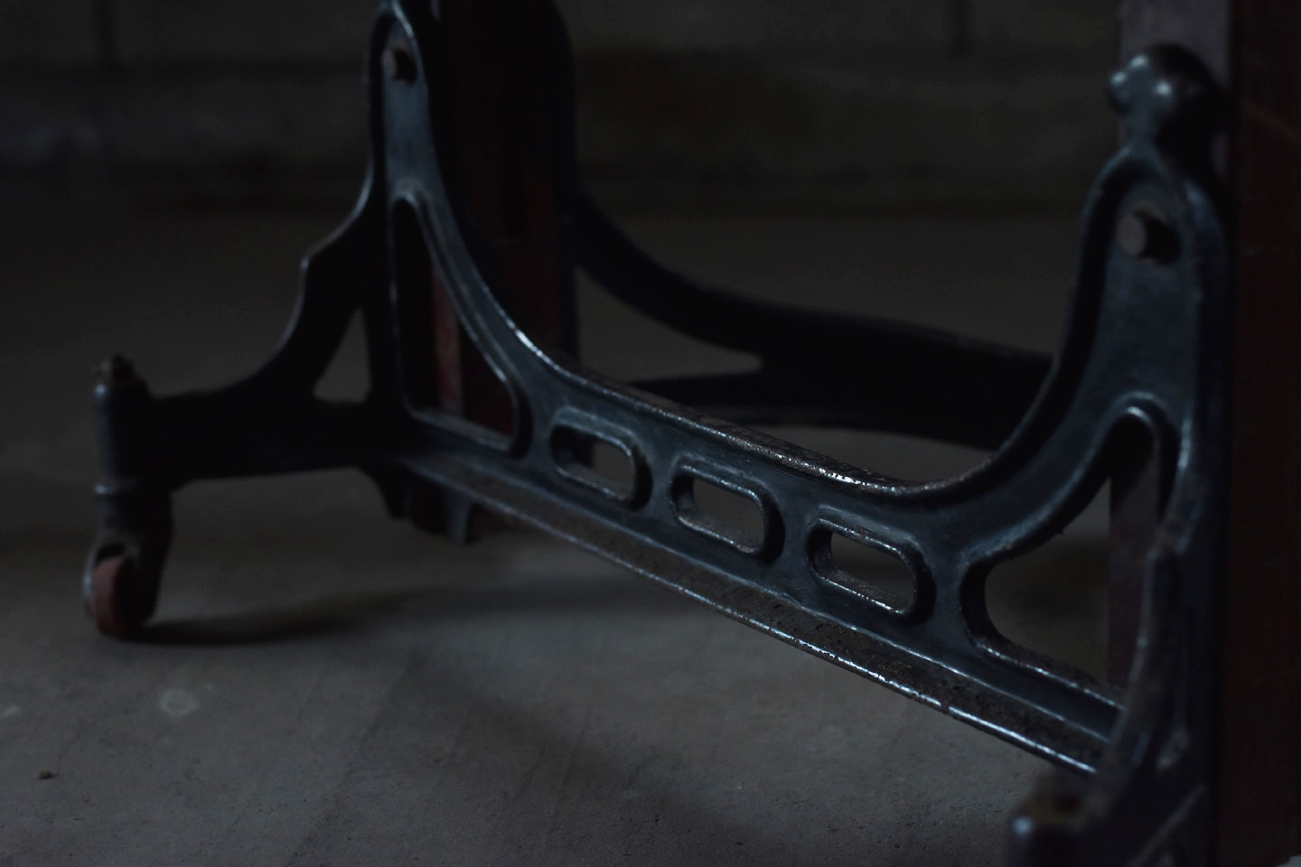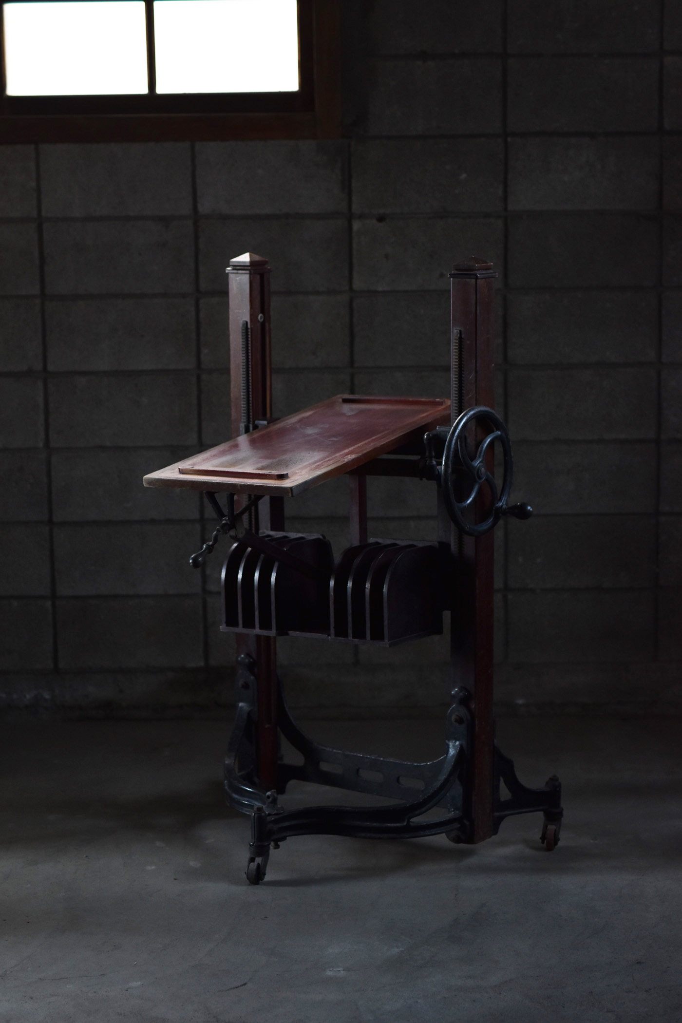 大変珍しい、鋳物のパーツと木の組み合わせの写真館で使われていた大型写真機の作業台です。写真機の乗っていた台は高さ・角度調整ができます。とても重厚な造りです。キャスター可動します。特別な展示台として。