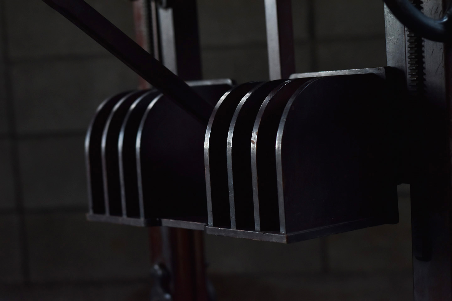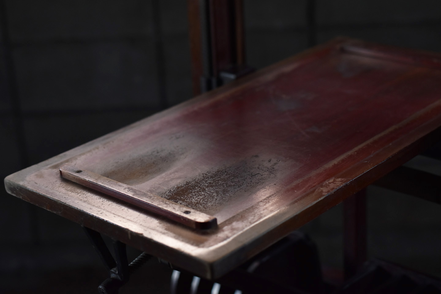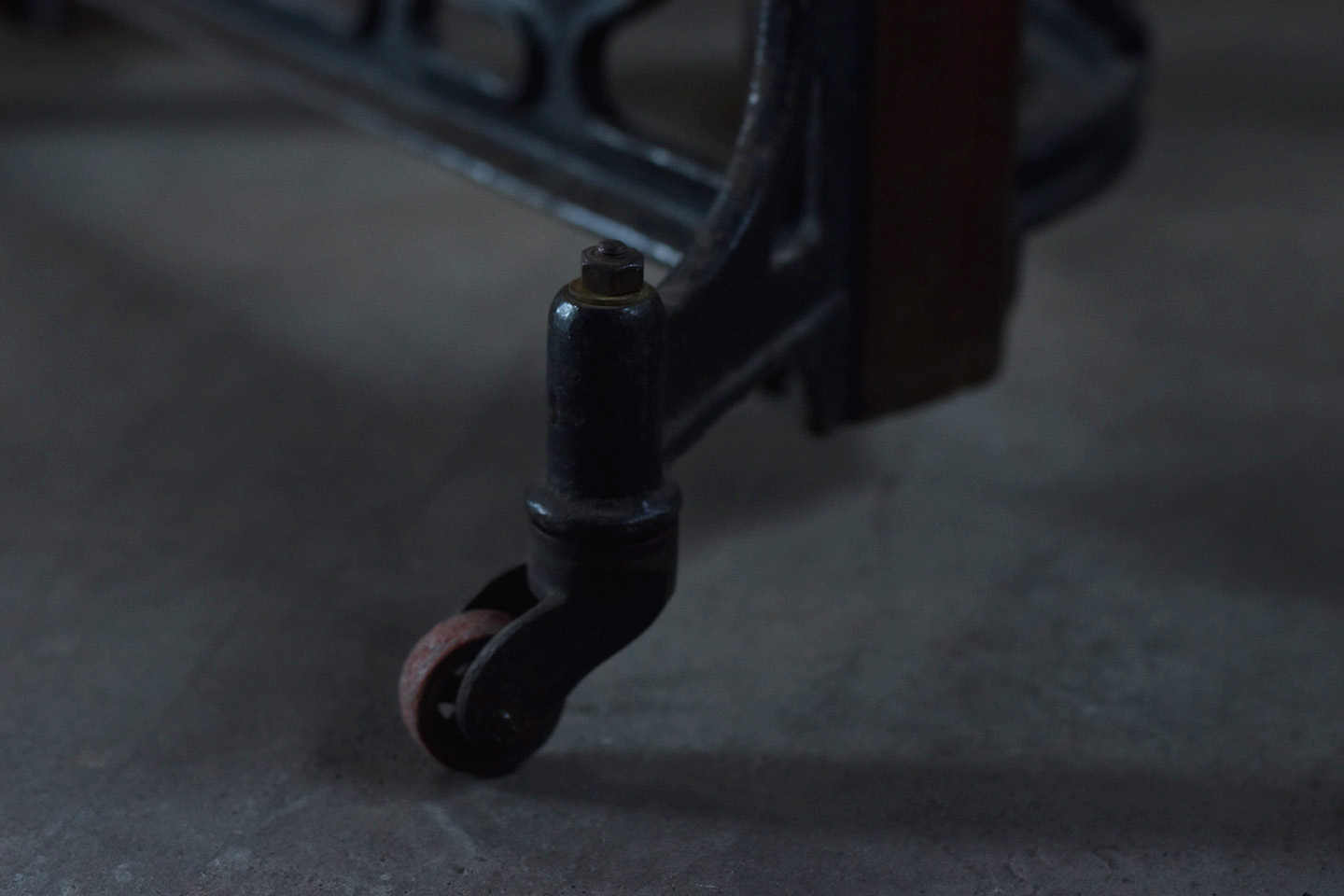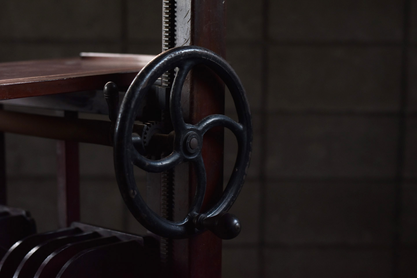 大変珍しい、鋳物のパーツと木の組み合わせの写真館で使われていた大型写真機の作業台です。写真機の乗っていた台は高さ・角度調整ができます。とても重厚な造りです。キャスター可動します。特別な展示台として。