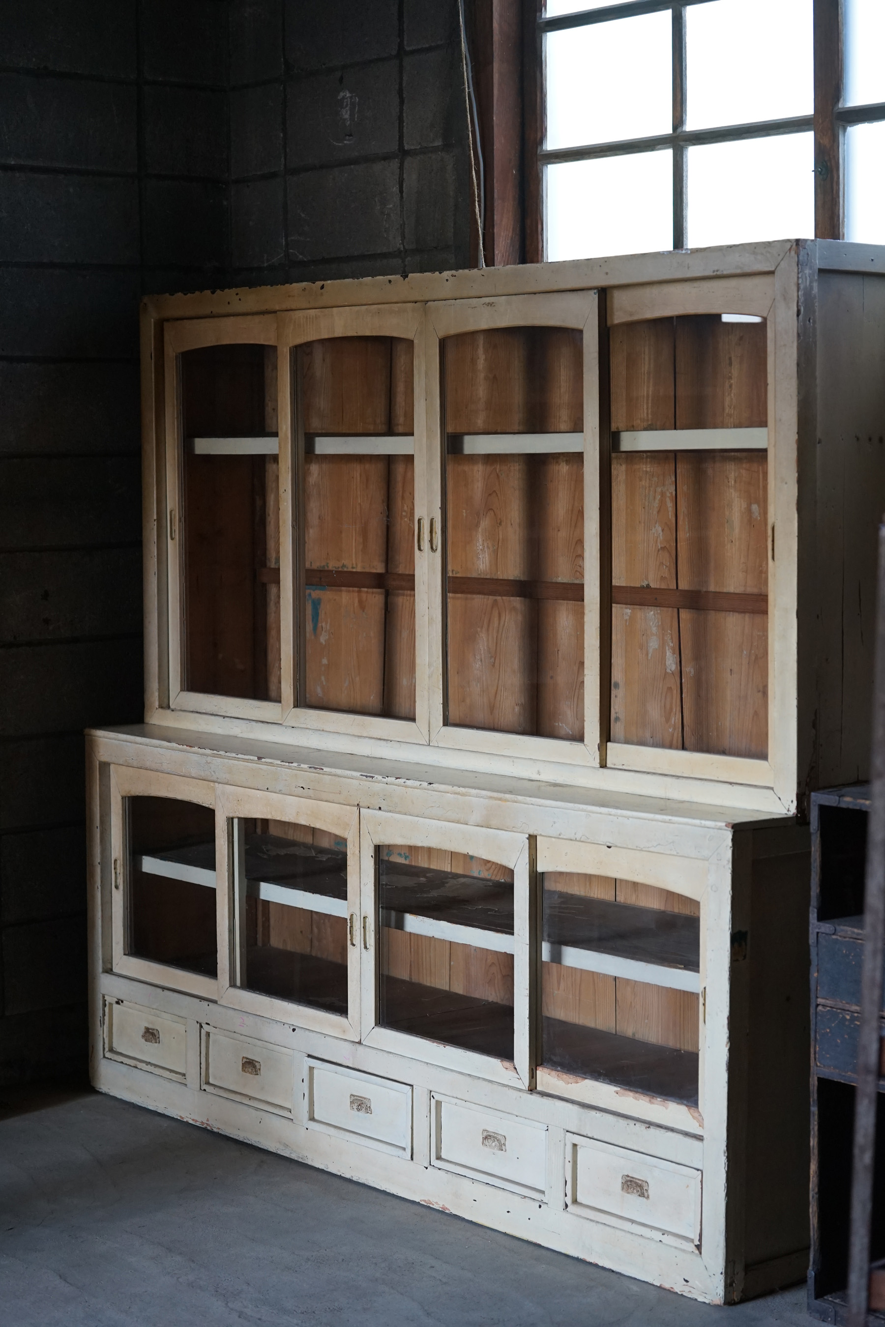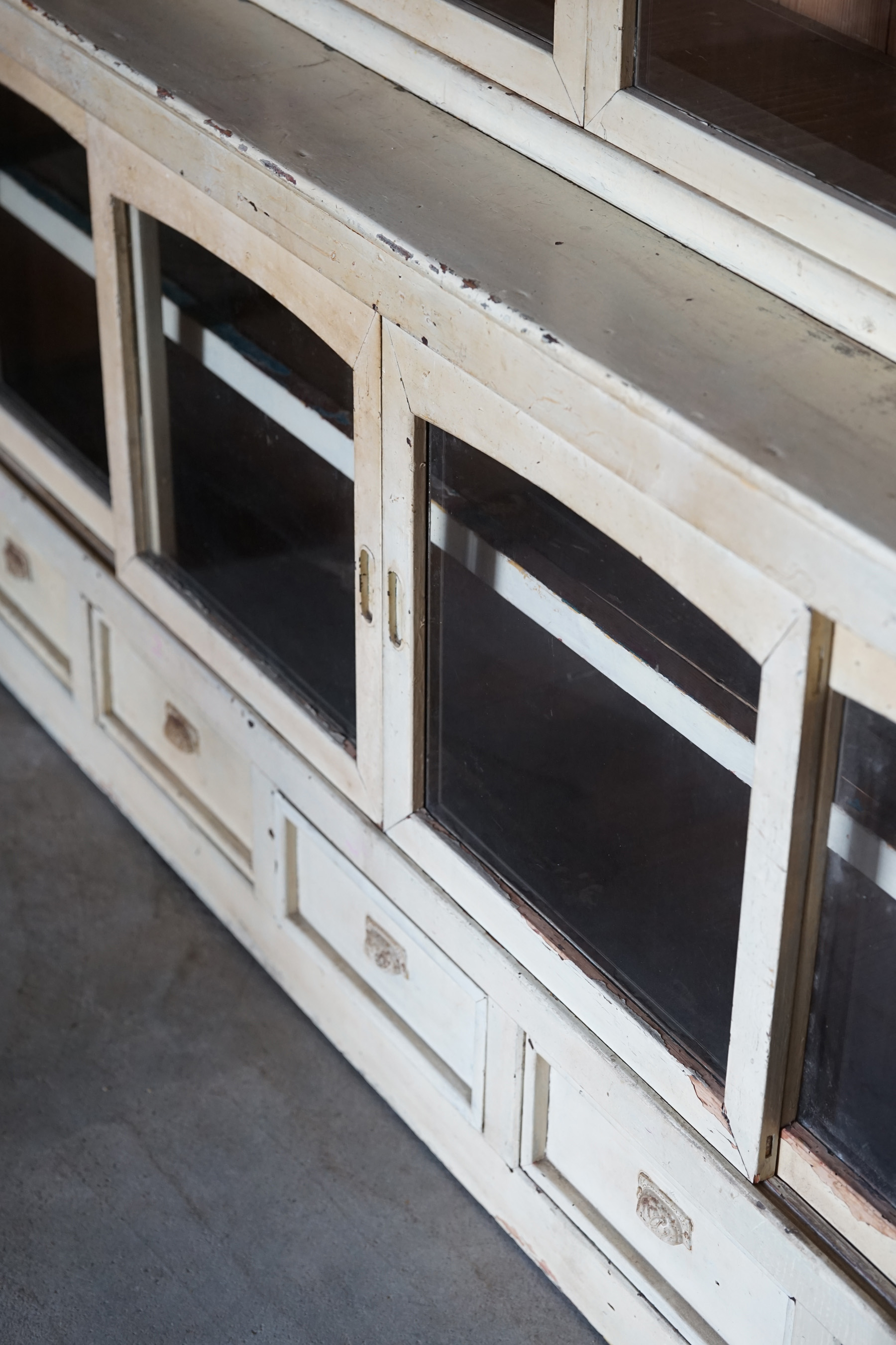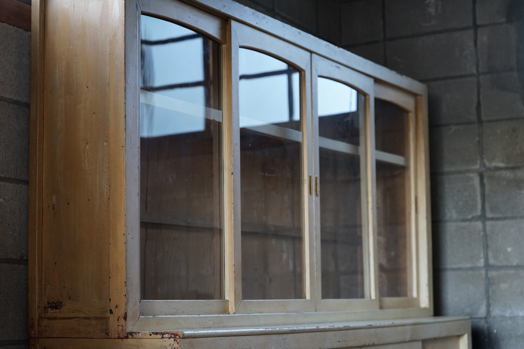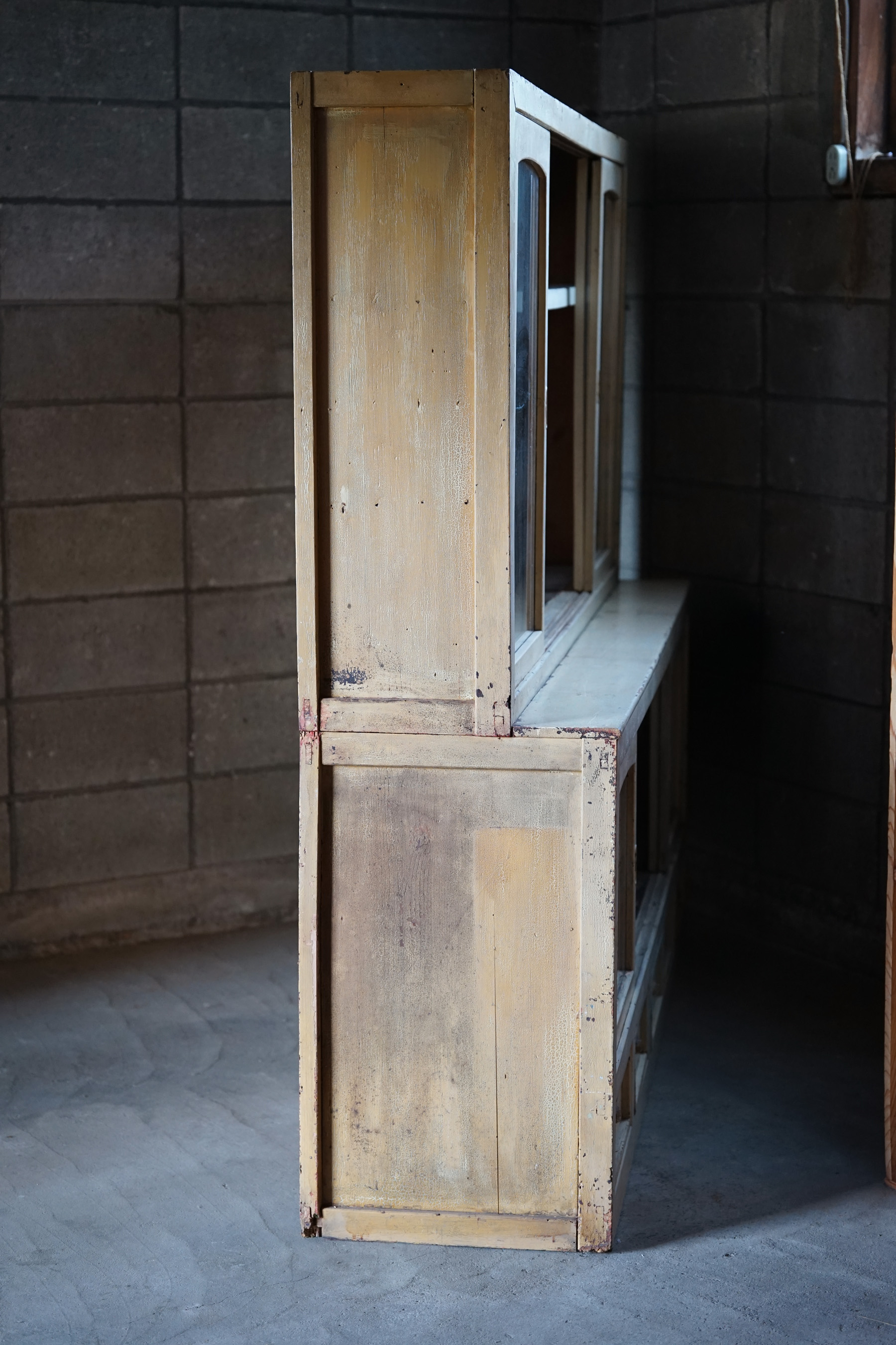 description : 経年変化で柔らかな表情となった白ペンキが綺麗です。当時のガラスで、シンプルながら綺麗な形の食器棚です。2段に分かれます。使用傷などございますが。良い雰囲気です。