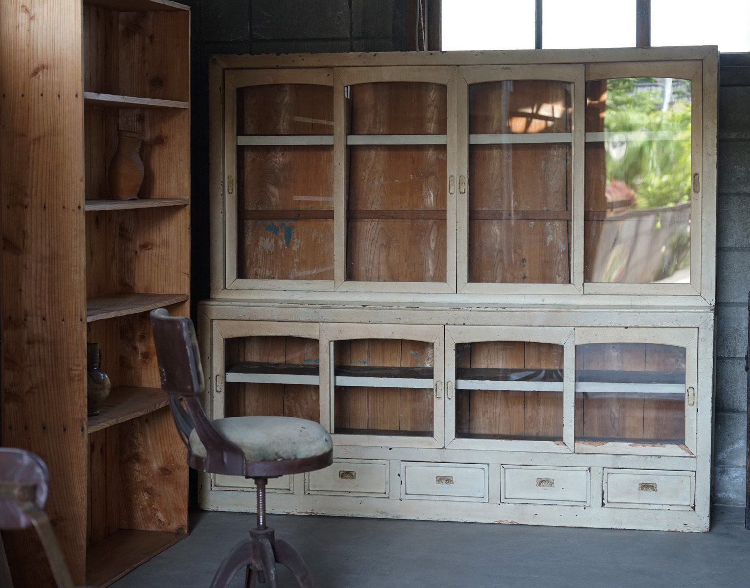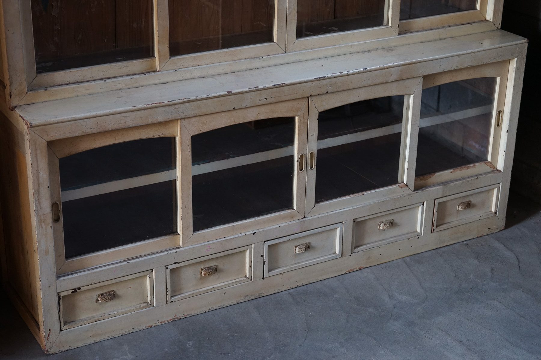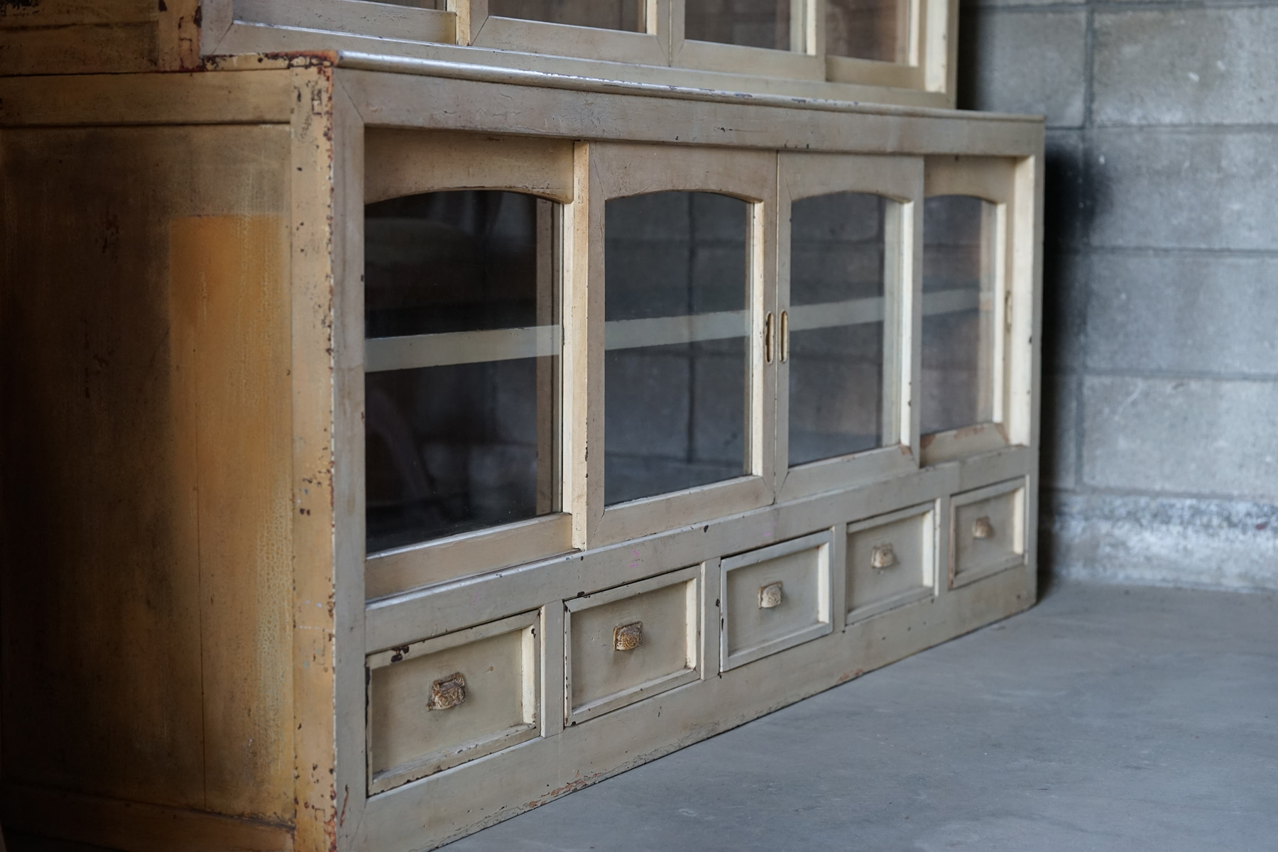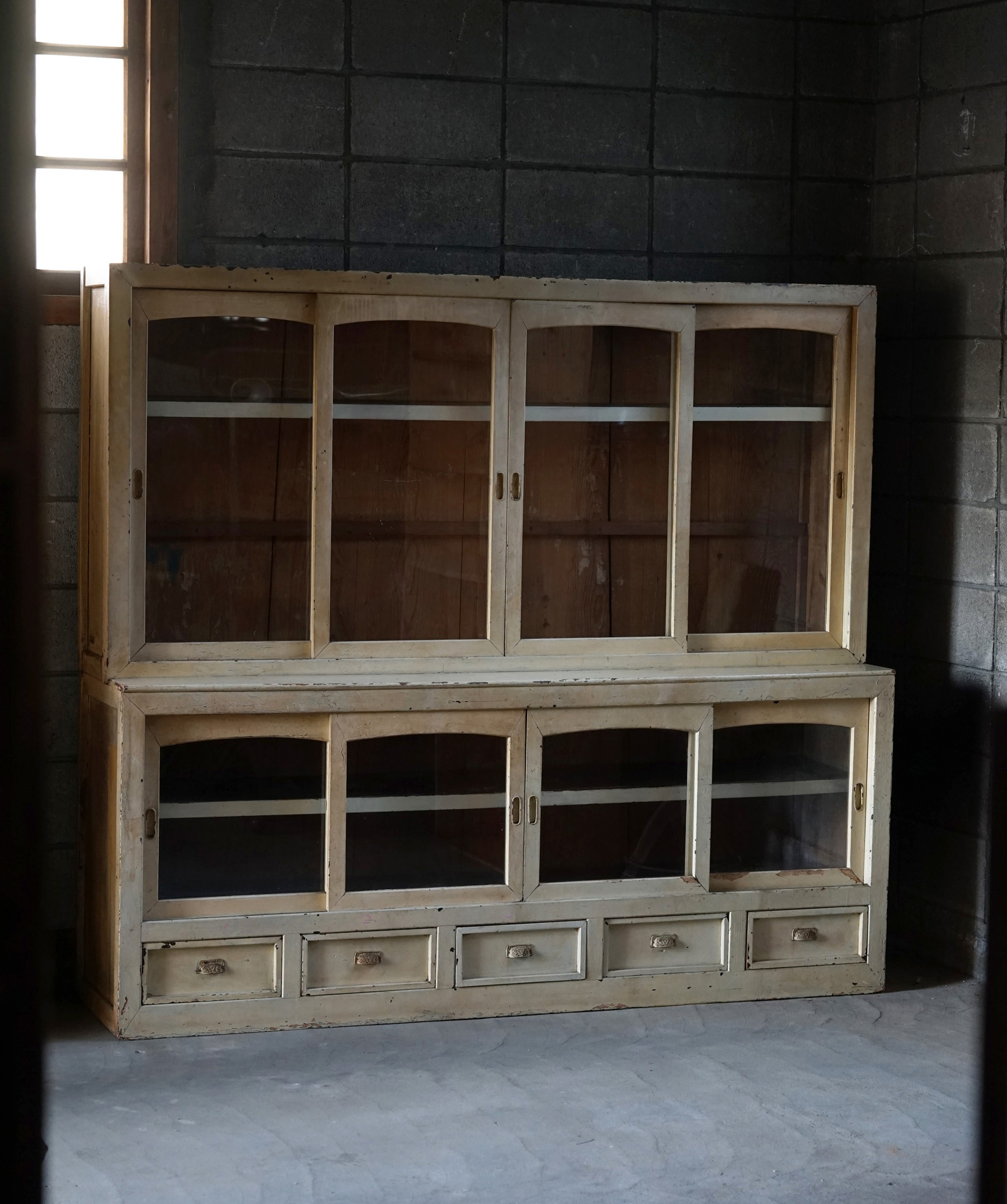 description : 経年変化で柔らかな表情となった白ペンキが綺麗です。当時のガラスで、シンプルながら綺麗な形の食器棚です。2段に分かれます。使用傷などございますが。良い雰囲気です。