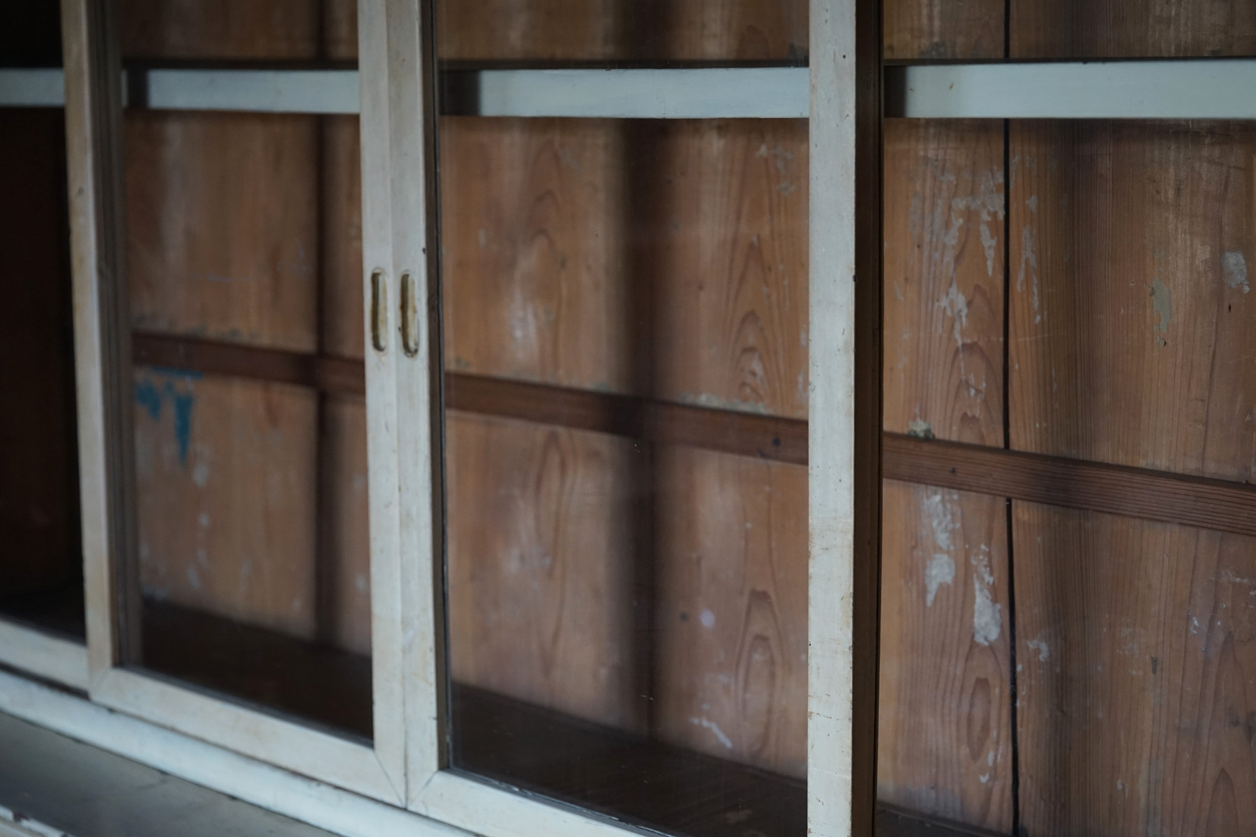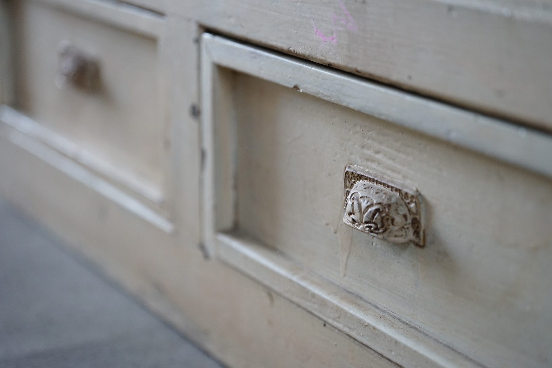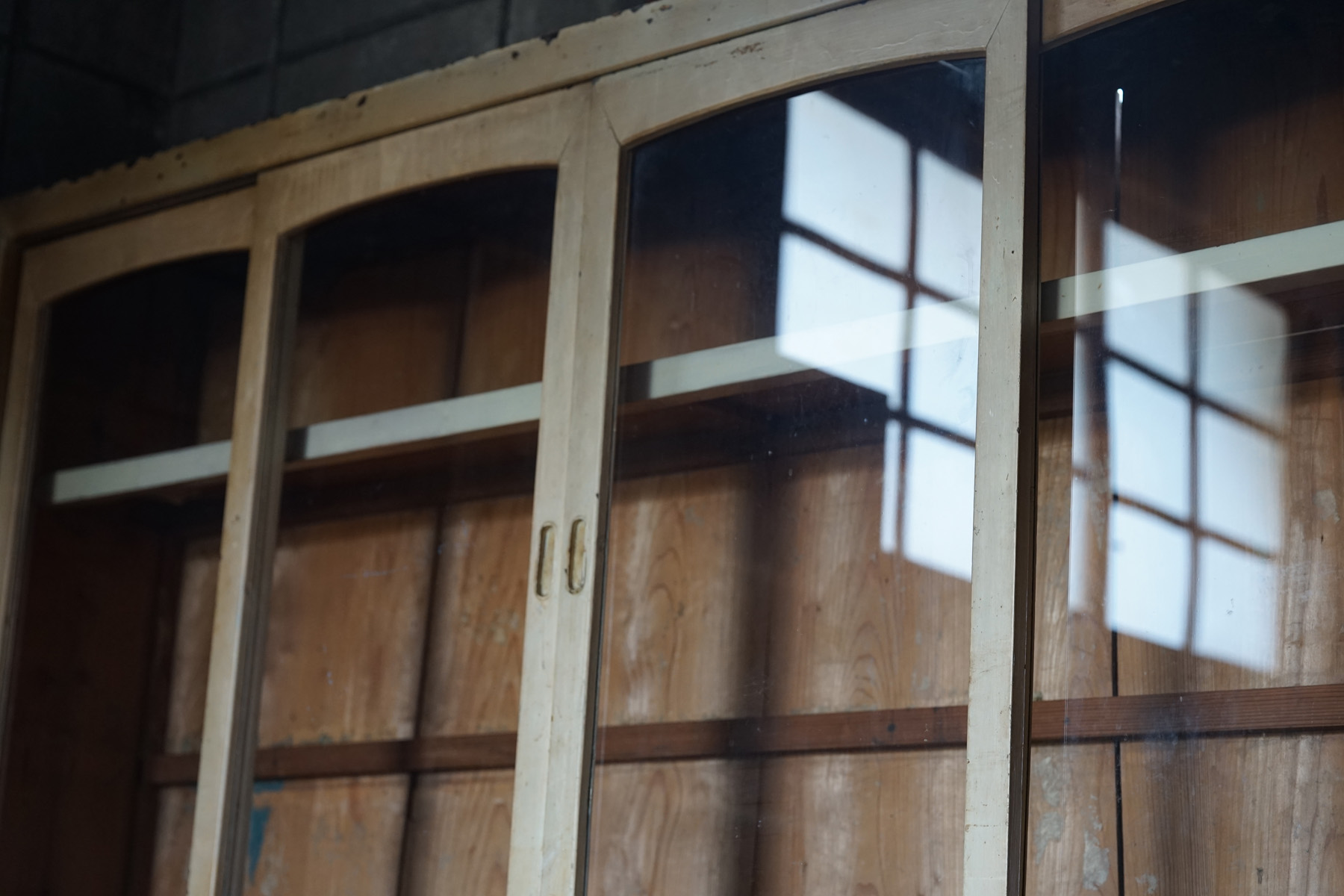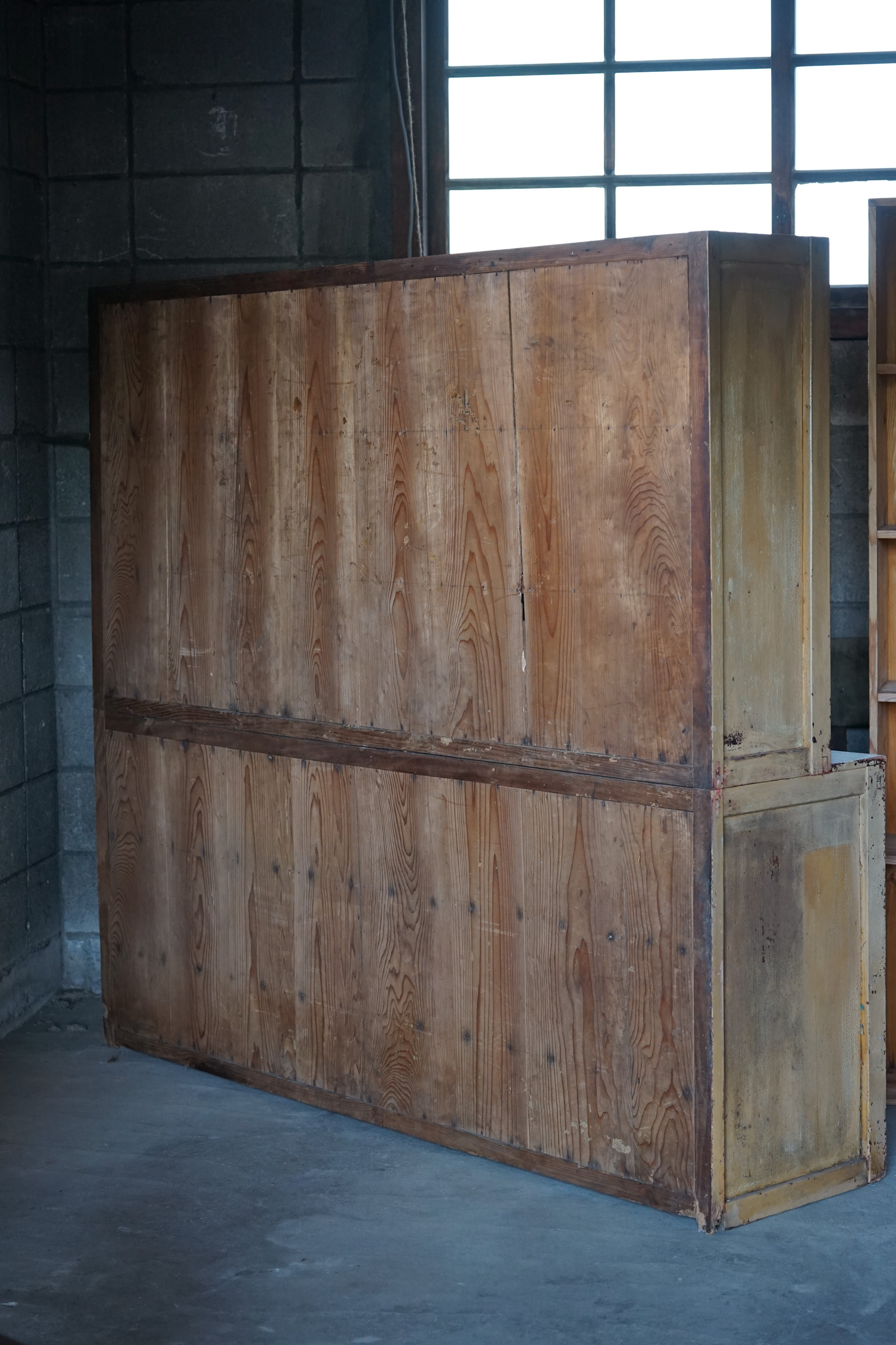 description : 経年変化で柔らかな表情となった白ペンキが綺麗です。当時のガラスで、シンプルながら綺麗な形の食器棚です。2段に分かれます。使用傷などございますが。良い雰囲気です。
