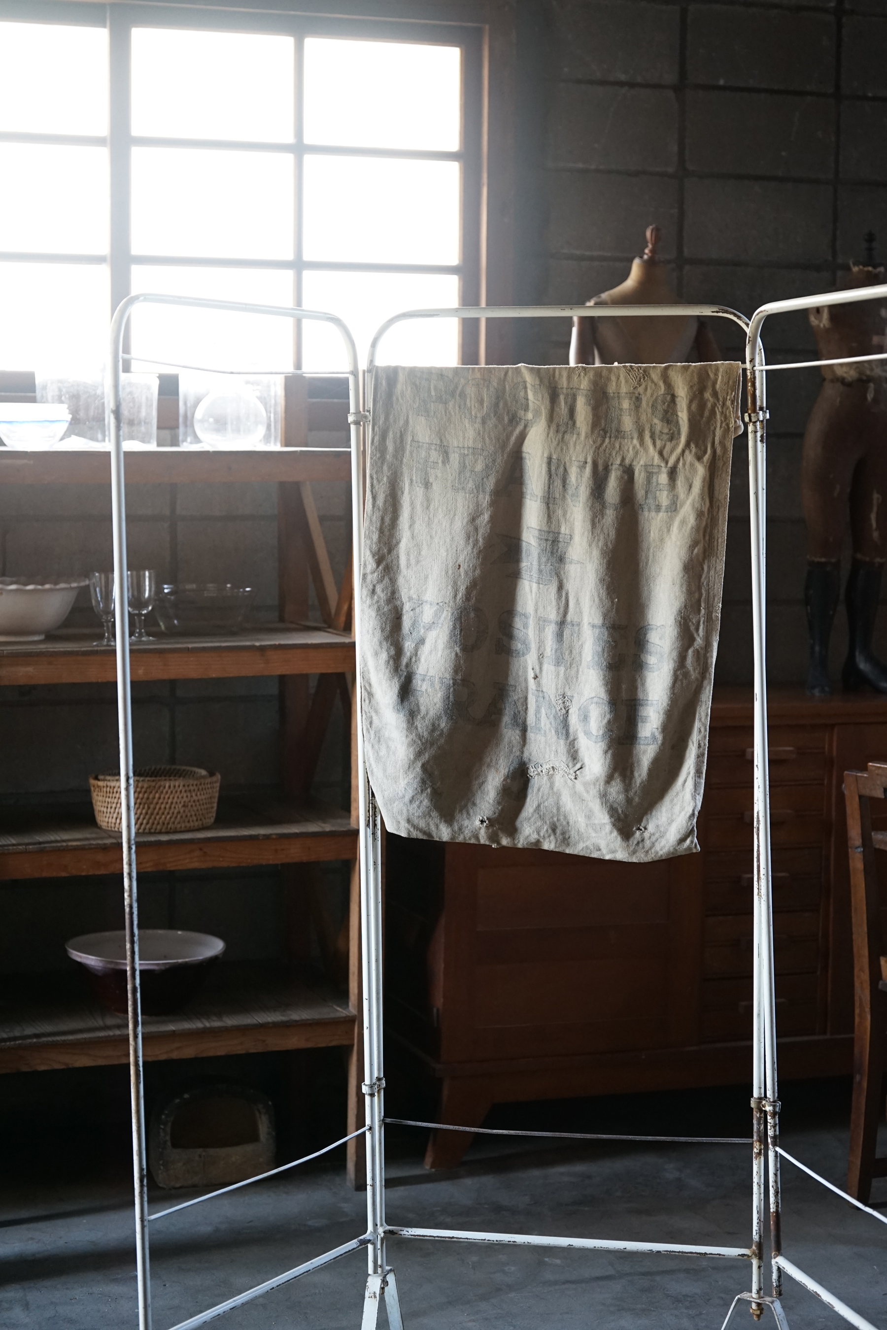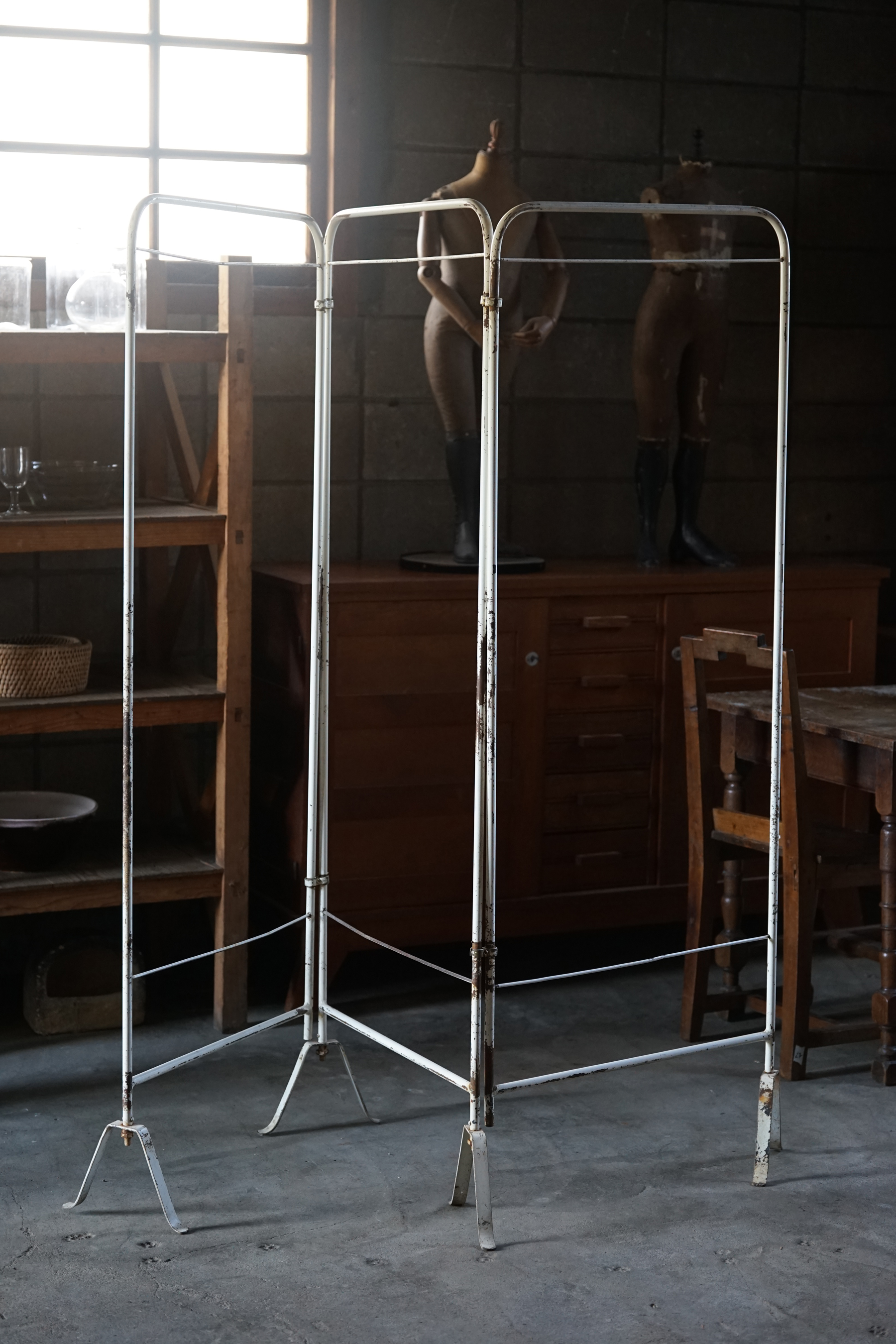 珍しい日本のシンプルなハンガーラック。広げると2m近く広がりますので店舗什器にも良いと思います。塗装の具合も良い経年変化です。古いものですのでジョイント金具等に曲がりなどありますが、使用には問題ないかと思います。