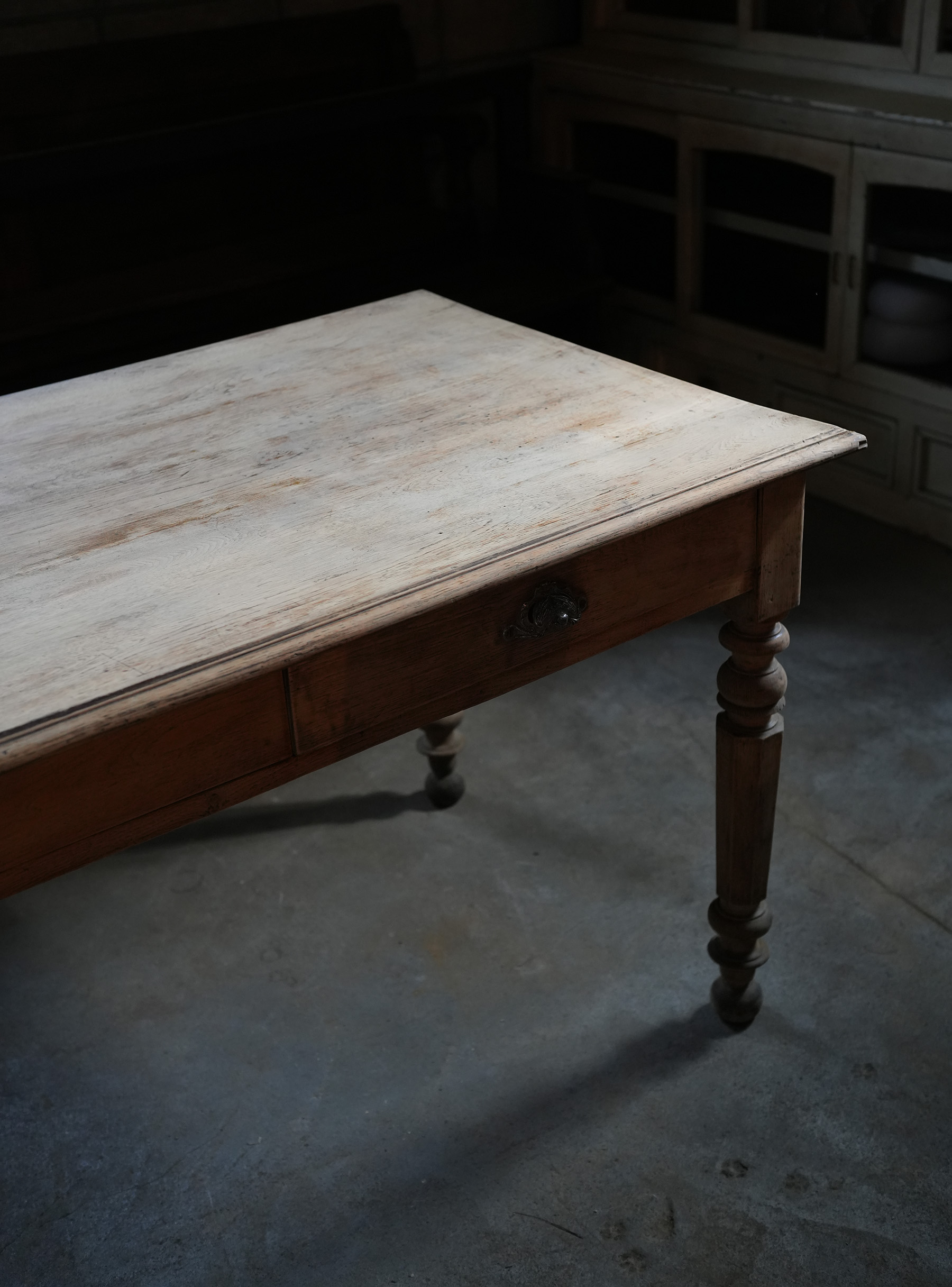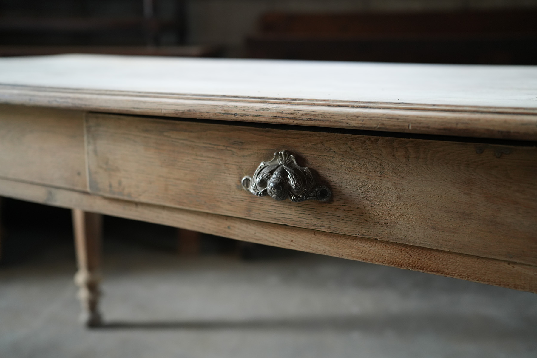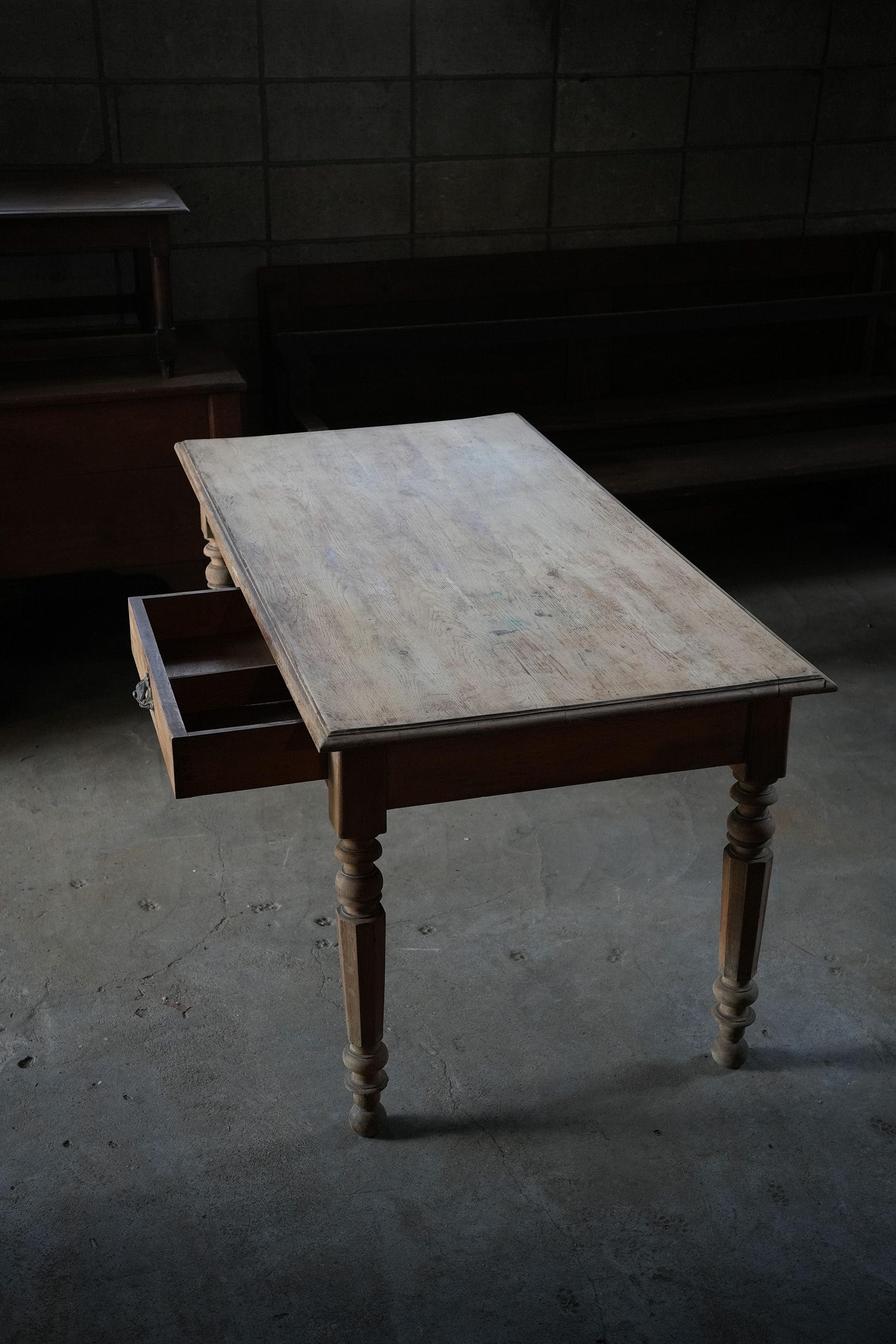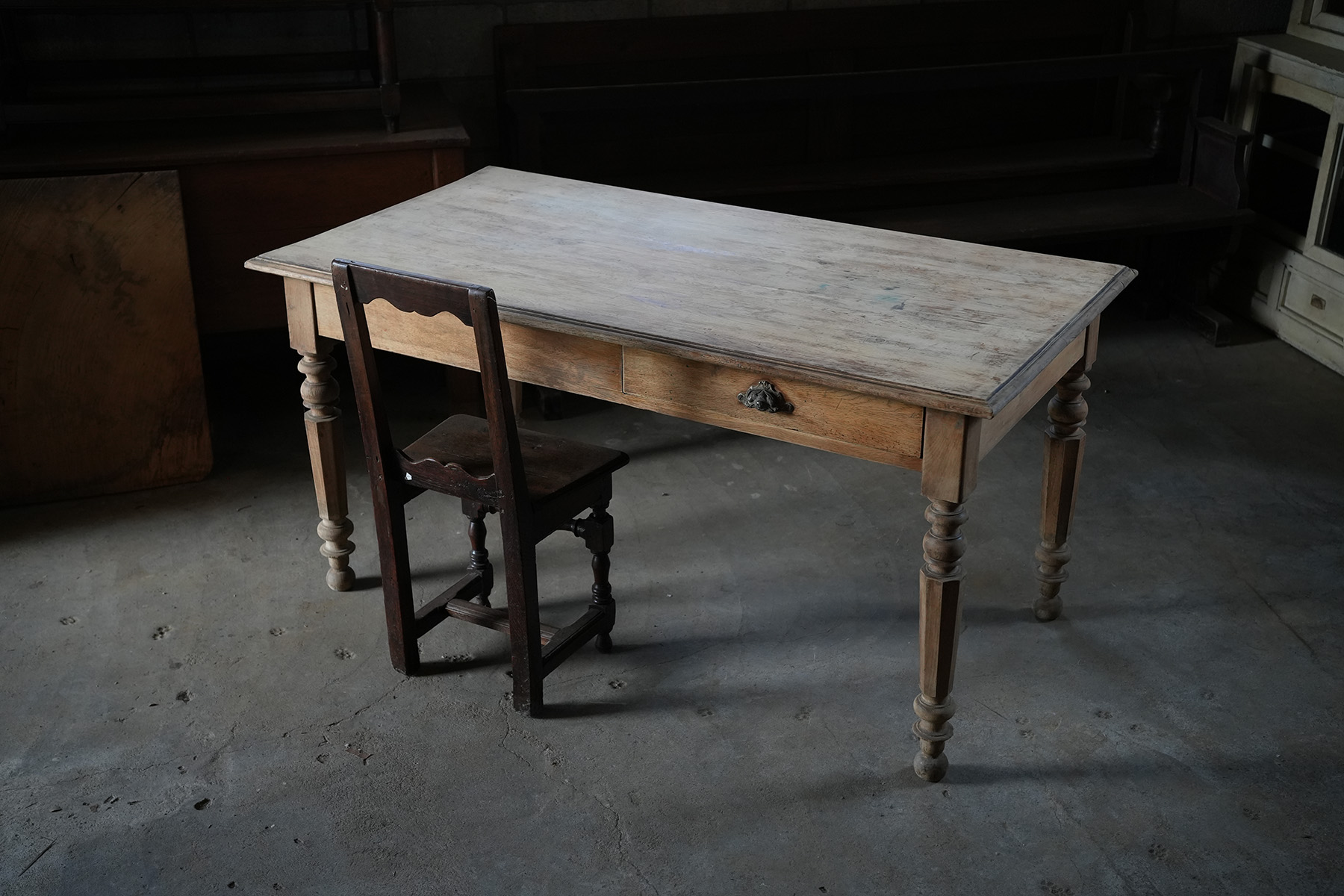 フランスの国有鉄道、SNCFで使われていたワークデスク。重厚な無垢材は、引き出しだけでもどっしり重いのですが、特徴的な面取が組み合わさった脚が軽やかに感じさせてくれます。