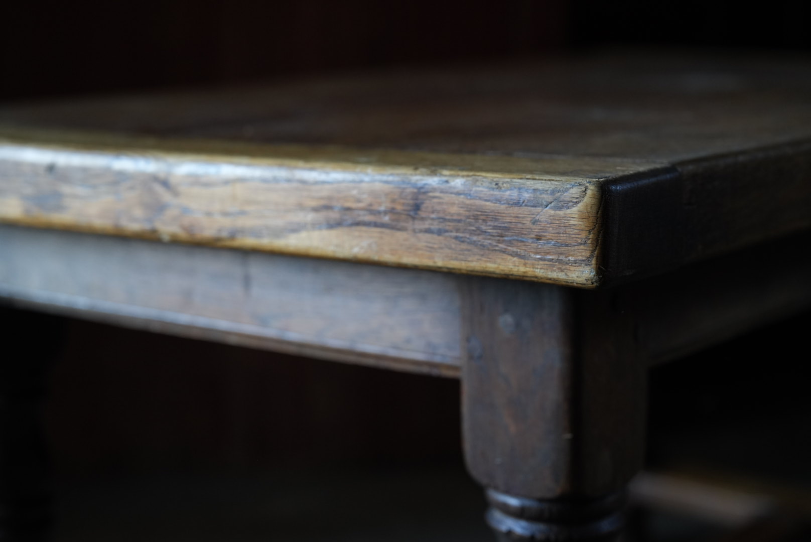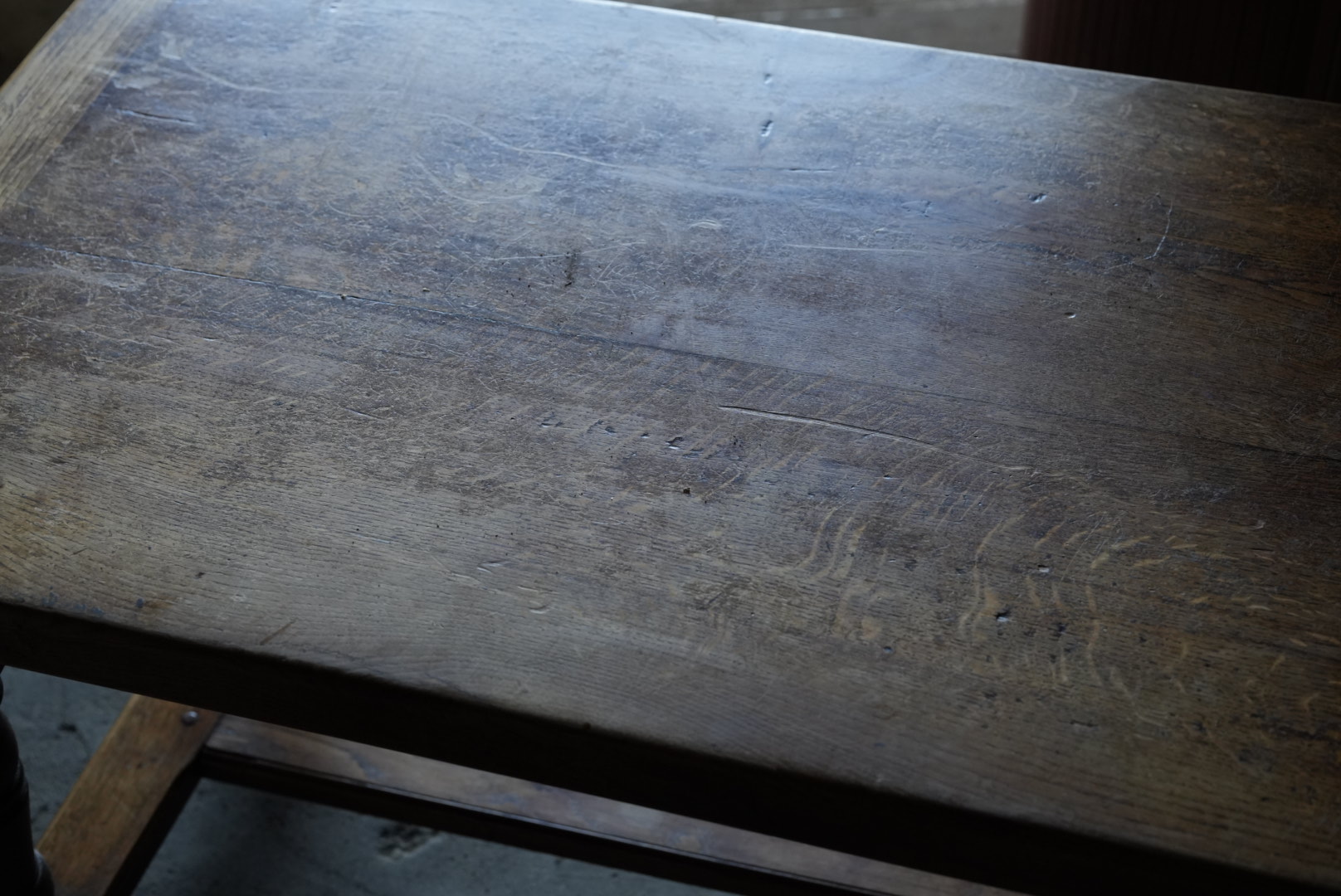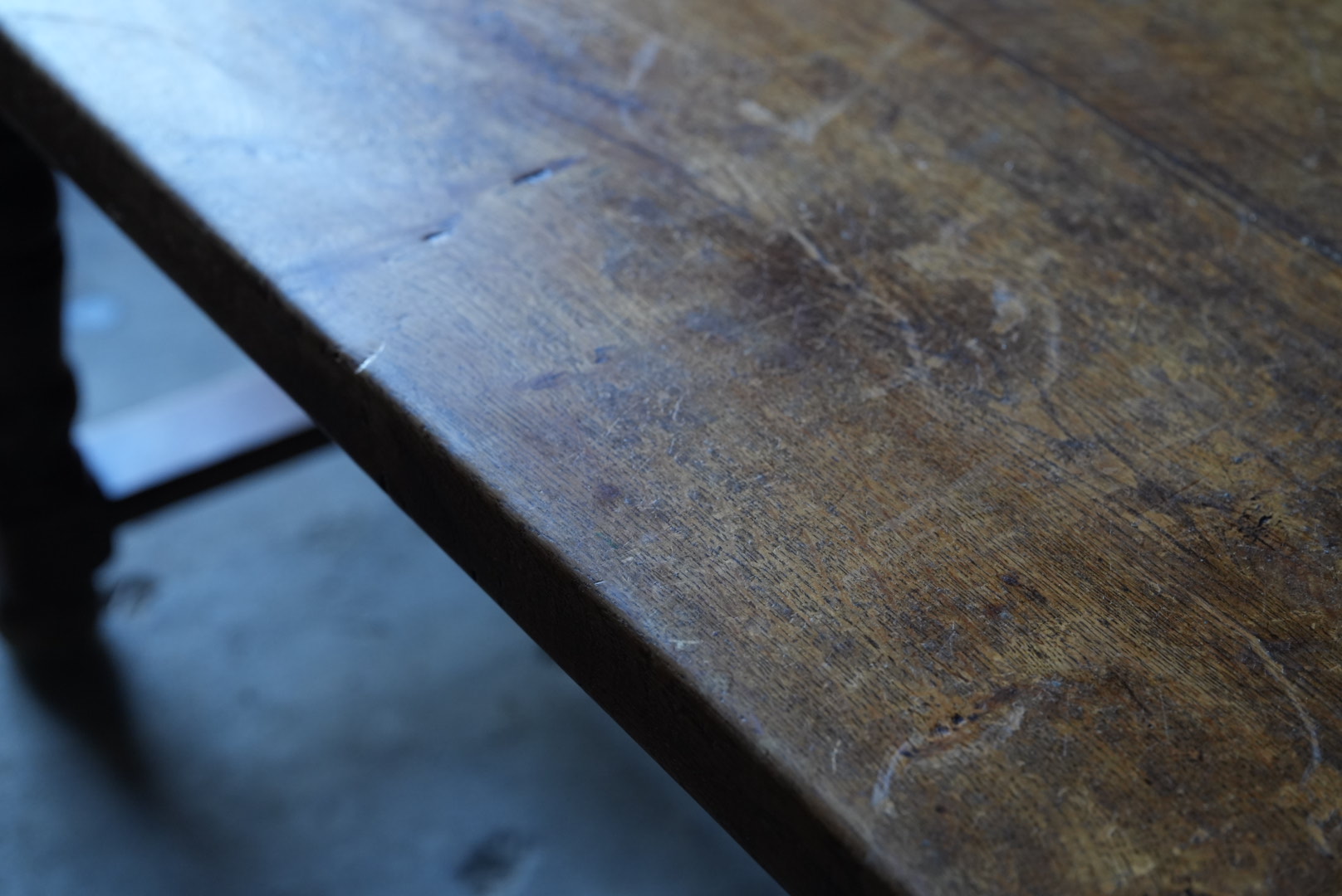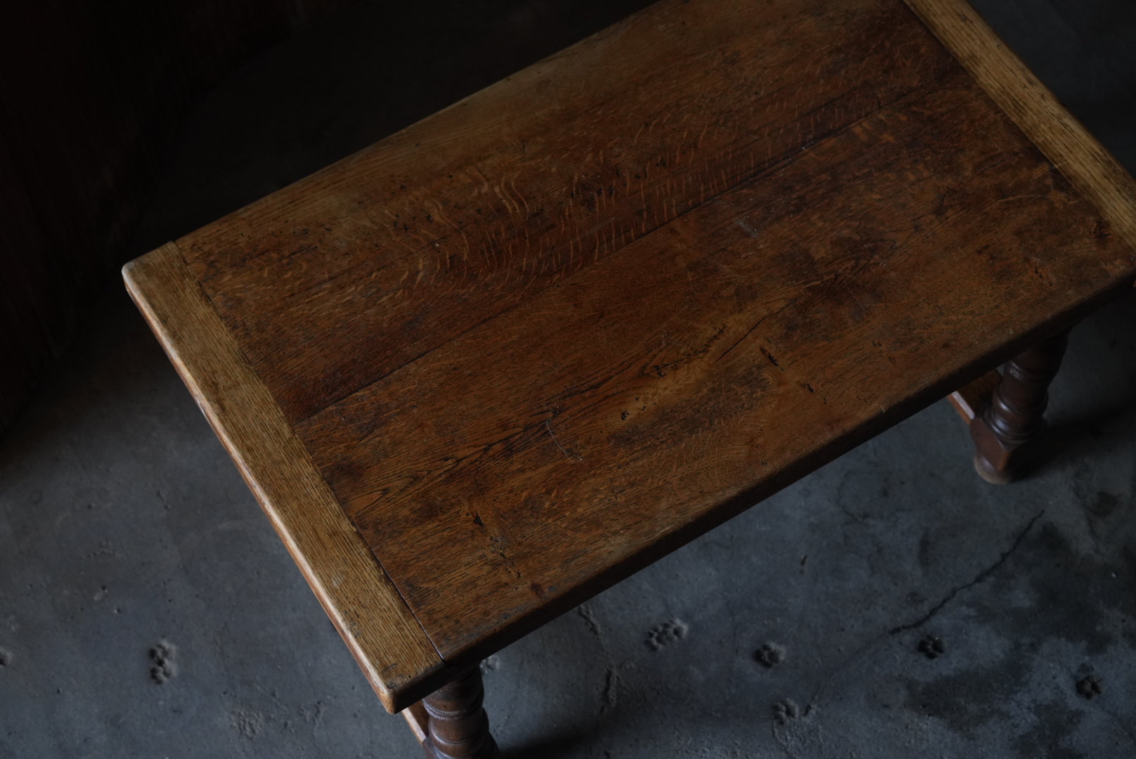厚みのある45mmの天板の贅沢なローテーブル。太めの脚や全体のバランスからも、 おおらかな存在感となっています。天板は経年変化から縮んでおりますが、横木が反り止めとなっており、歪んでおりません。