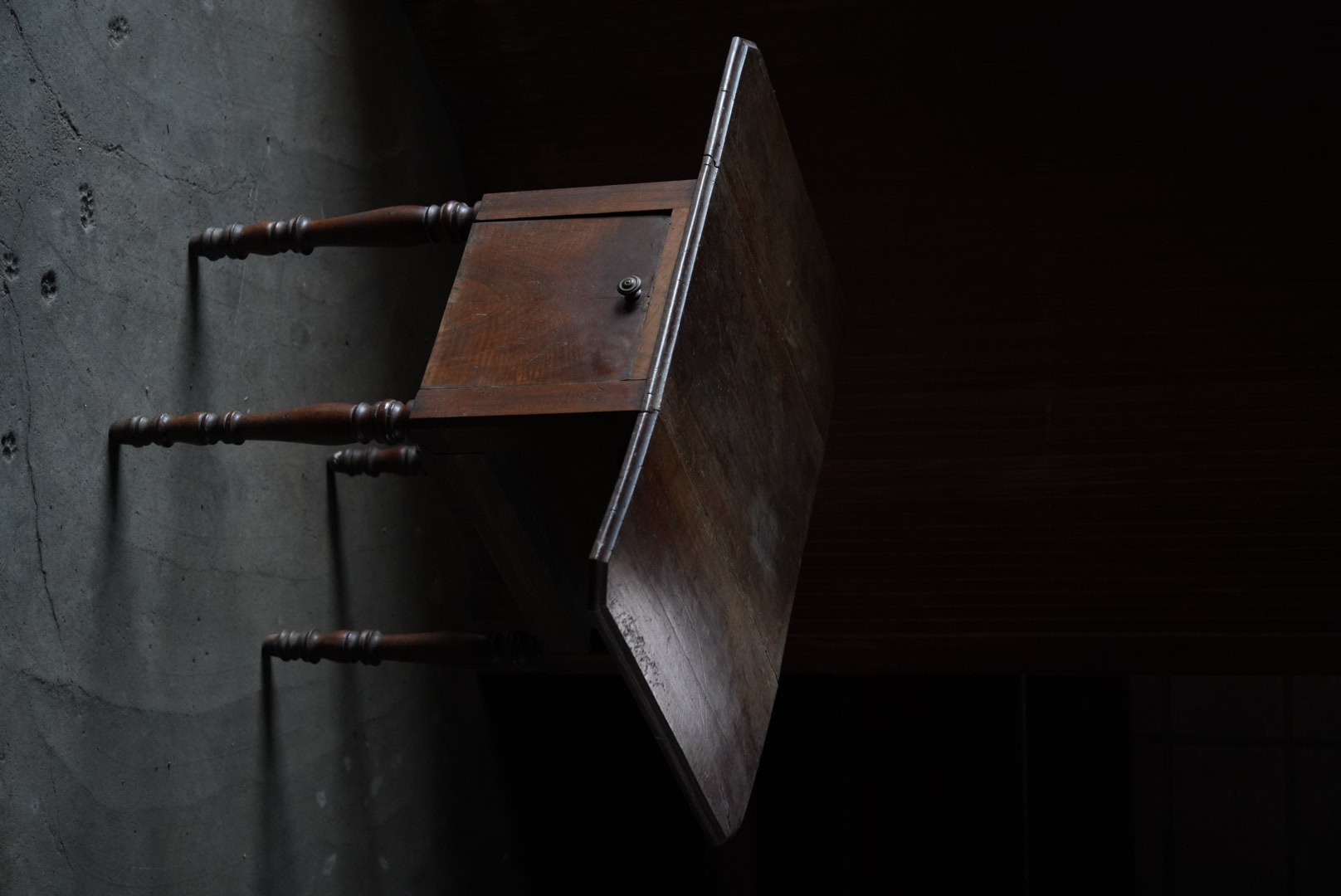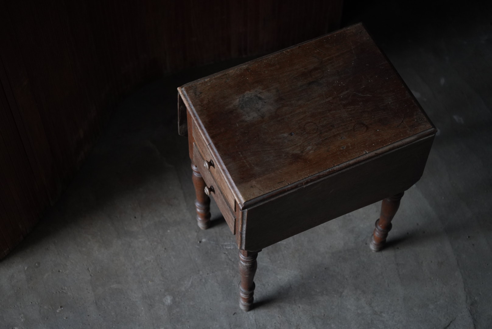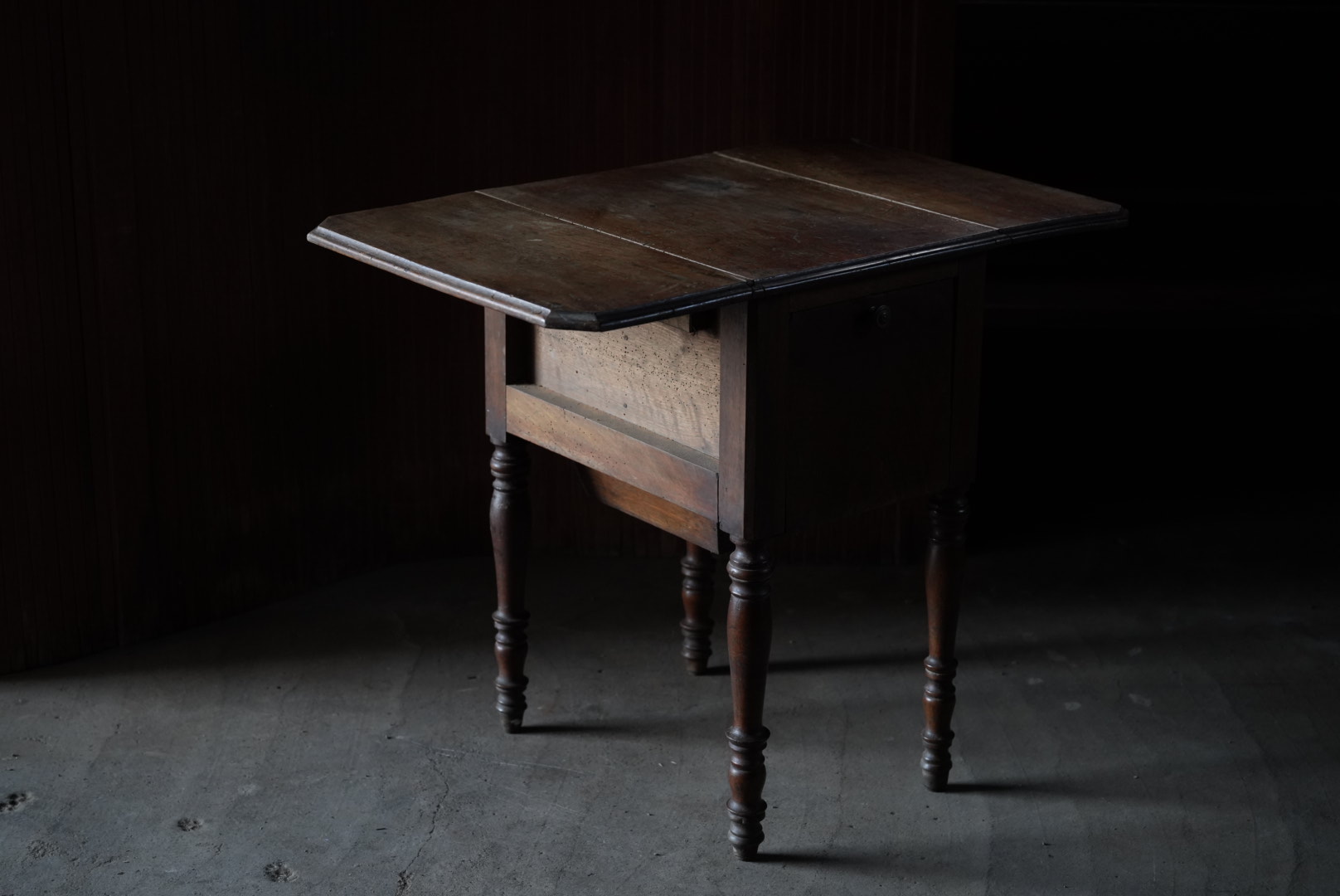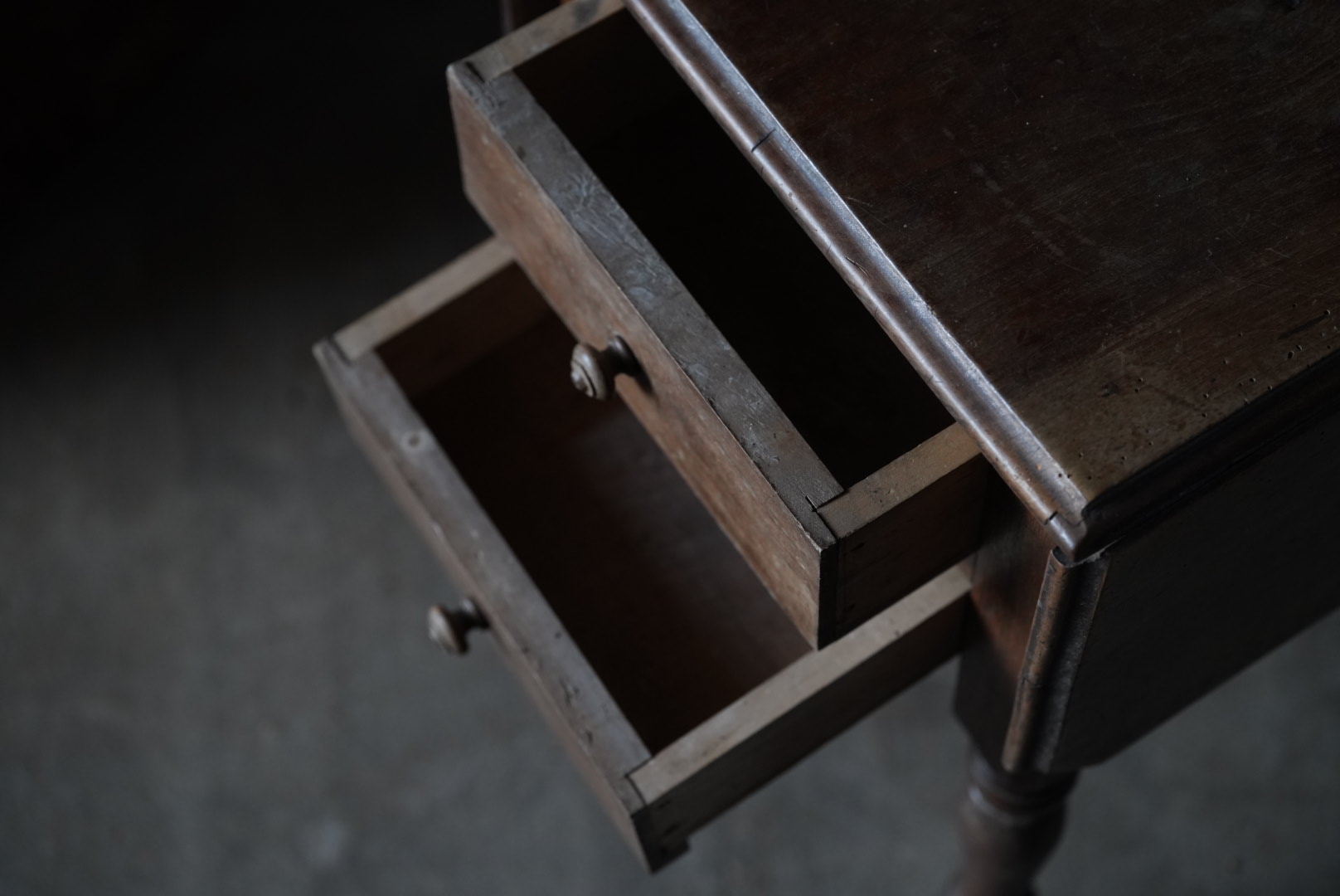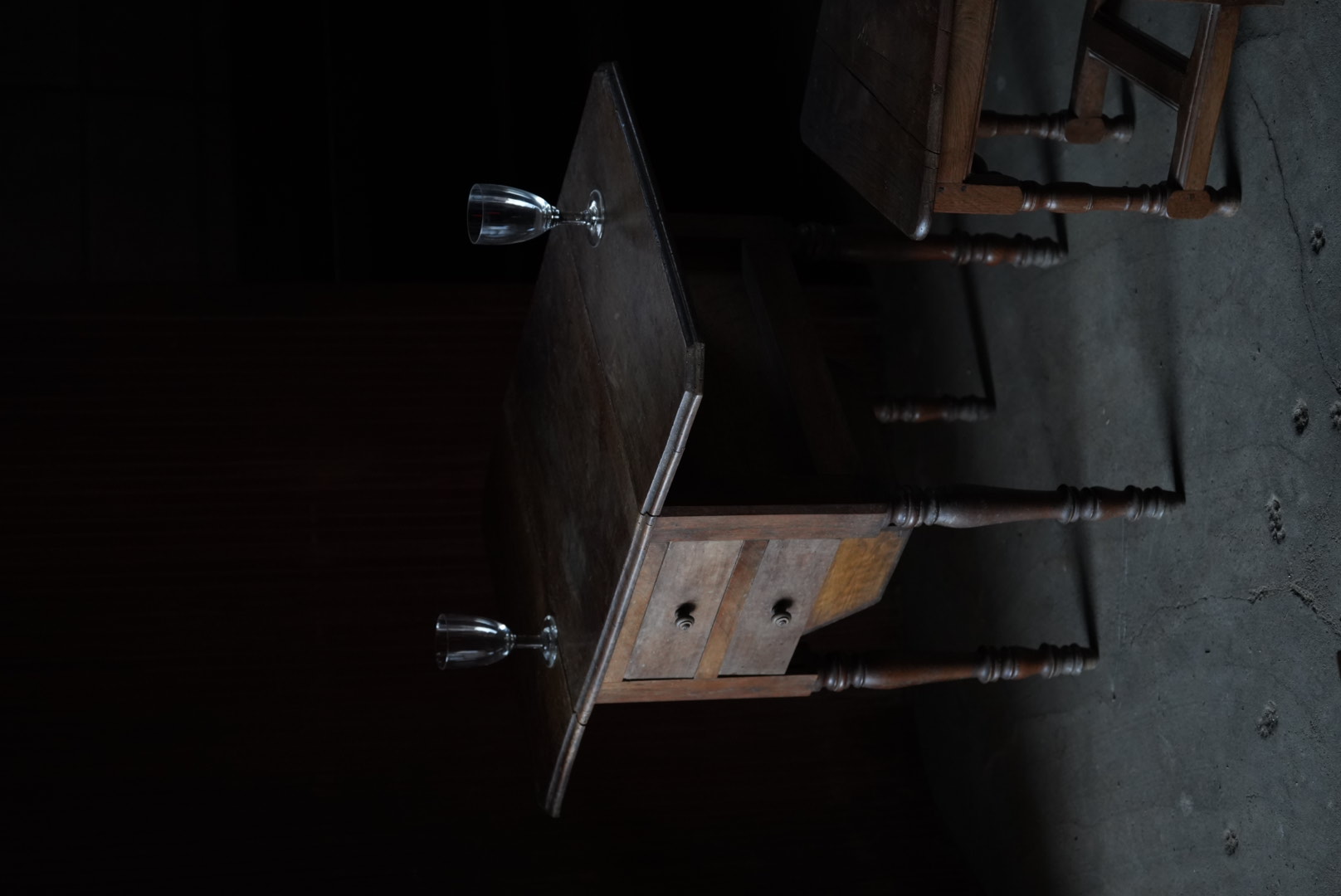 小振りな折り畳みテーブル。広げると隅切りの意匠。 両側面に収納があり、片側はブリキ張りで、もう片方は2杯の引き出しの下に、隠し?収納があります。 バレバレな気もしますが。どのような用途で使われていたのか、 パーソナルなオーダーだったのか想像させられます。 ロレーヌ地方より。
