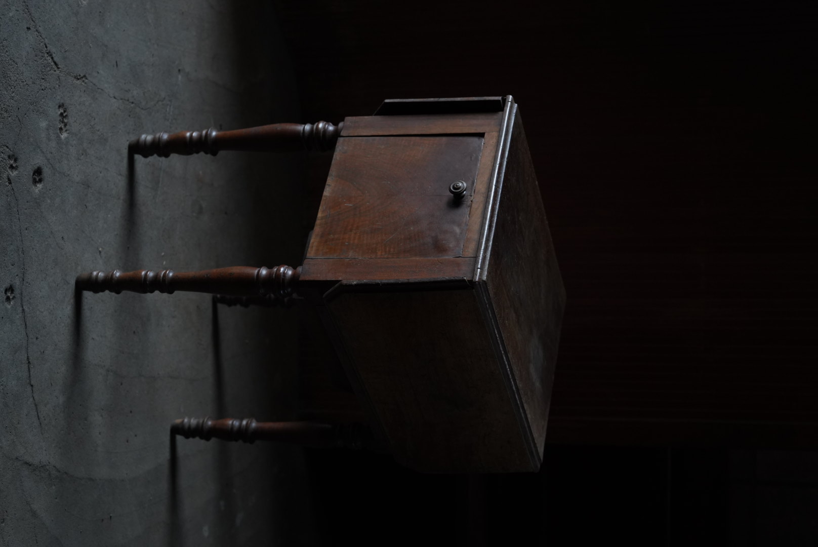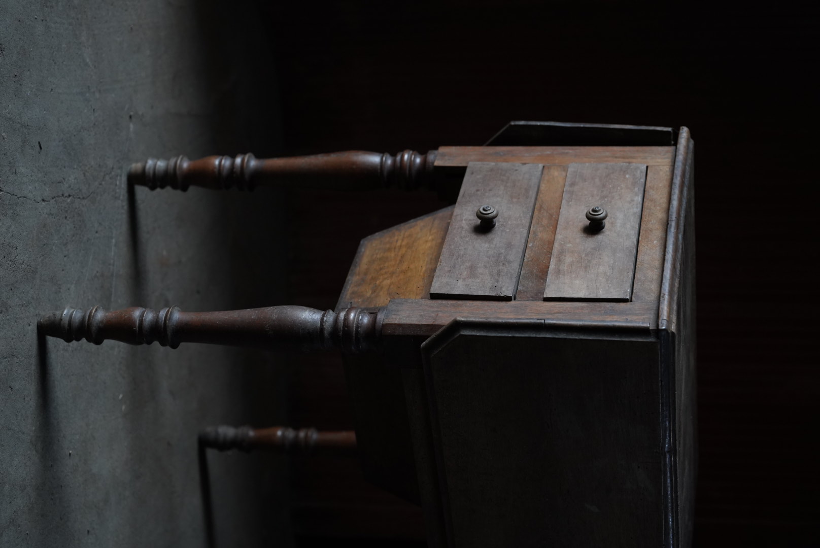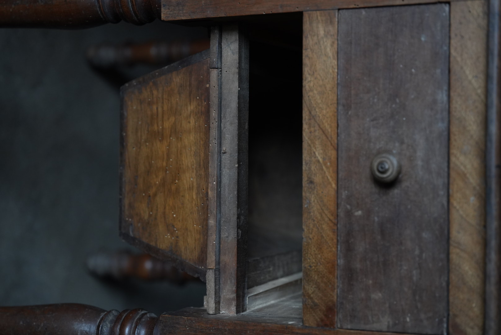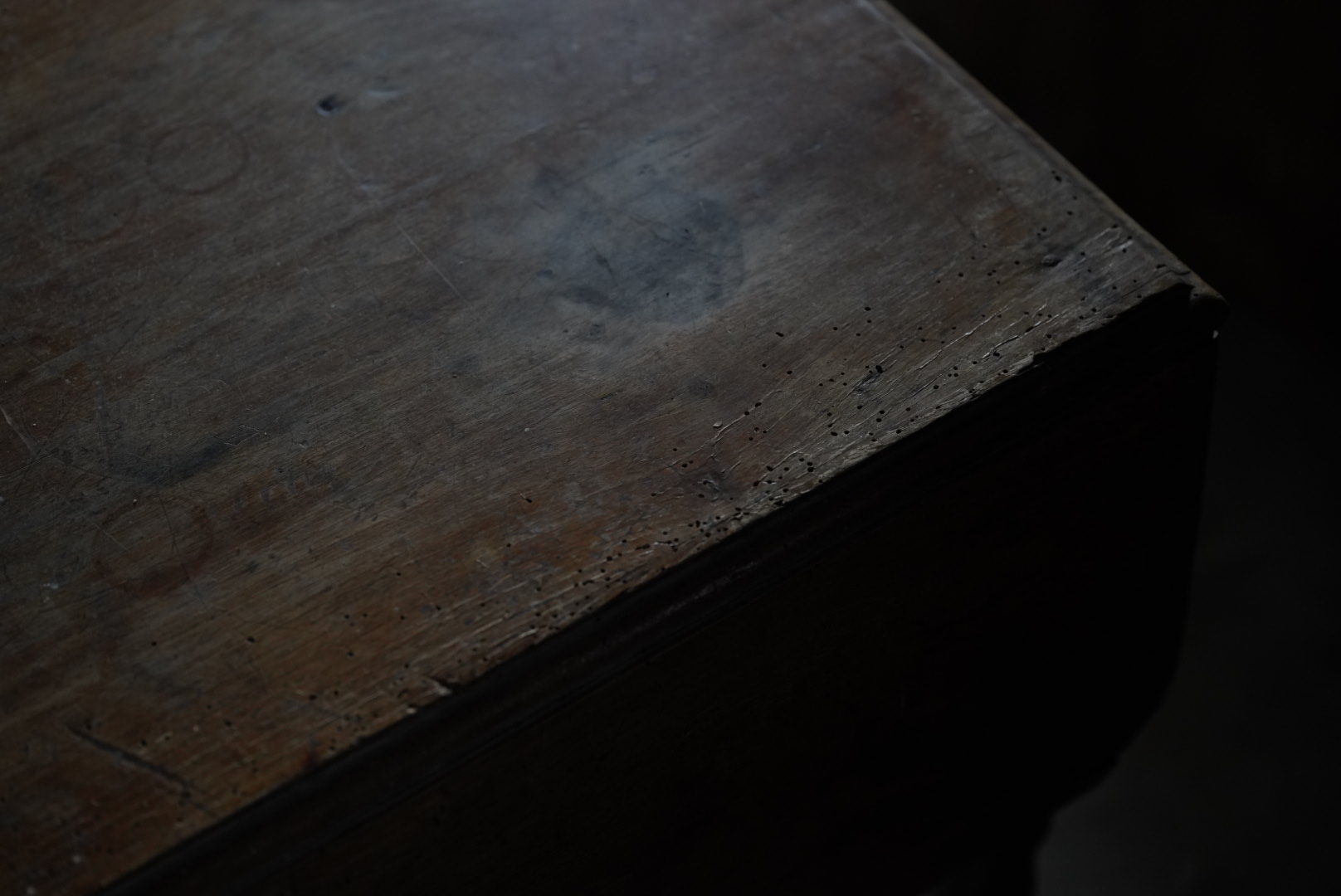 小振りな折り畳みテーブル。広げると隅切りの意匠。 両側面に収納があり、片側はブリキ張りで、もう片方は2杯の引き出しの下に、隠し?収納があります。 バレバレな気もしますが。どのような用途で使われていたのか、 パーソナルなオーダーだったのか想像させられます。 ロレーヌ地方より。