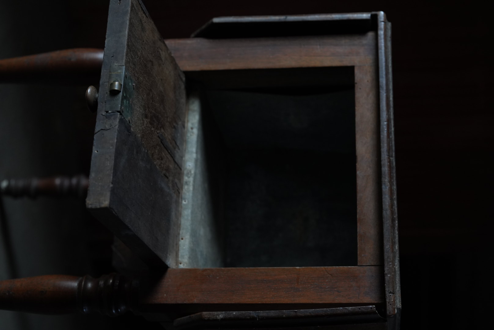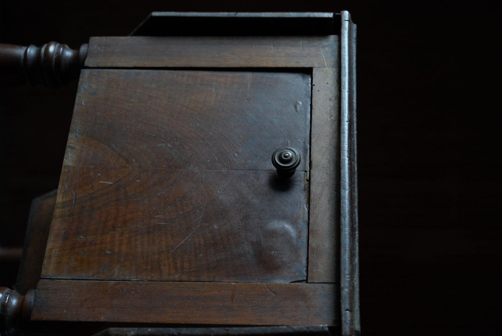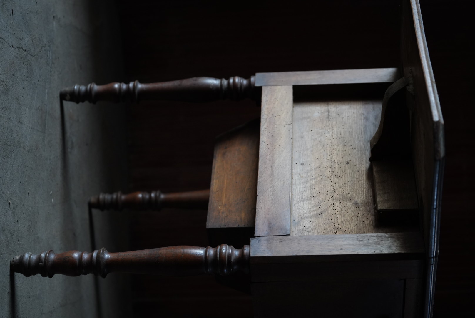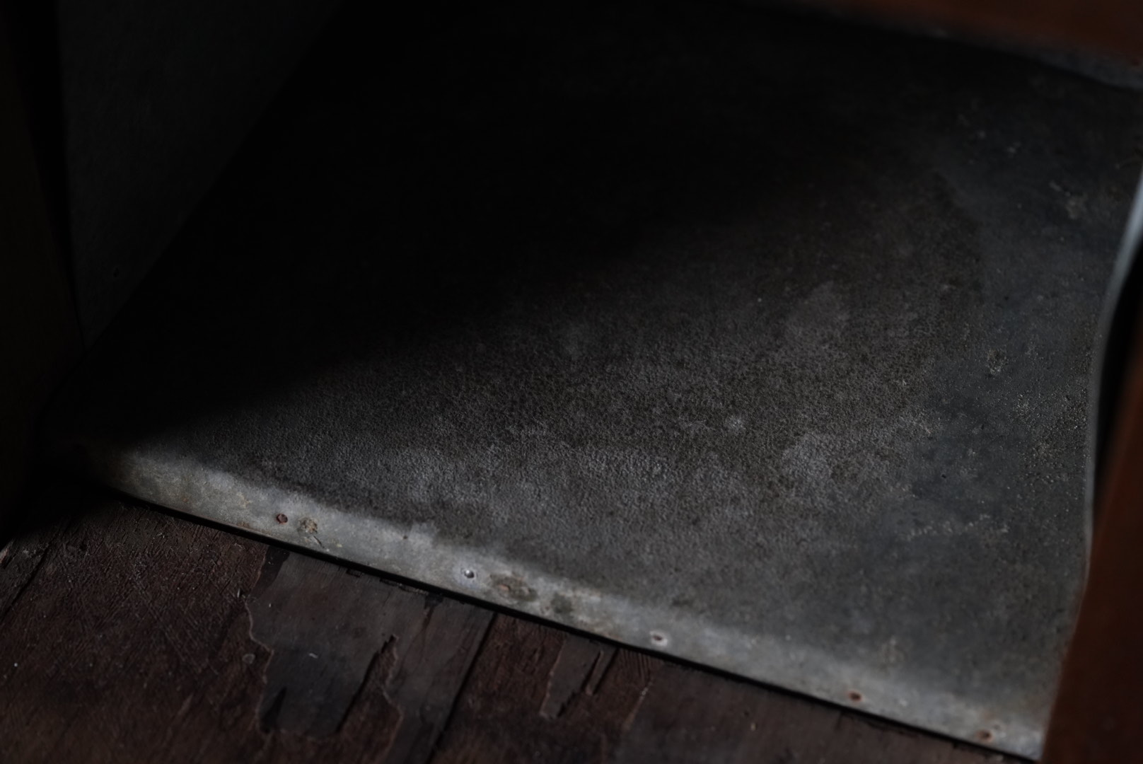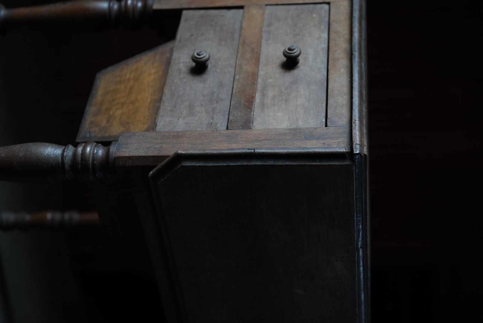 小振りな折り畳みテーブル。広げると隅切りの意匠。 両側面に収納があり、片側はブリキ張りで、もう片方は2杯の引き出しの下に、隠し?収納があります。 バレバレな気もしますが。どのような用途で使われていたのか、 パーソナルなオーダーだったのか想像させられます。 ロレーヌ地方より。