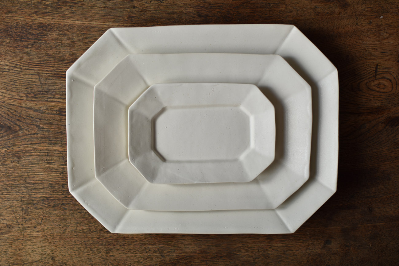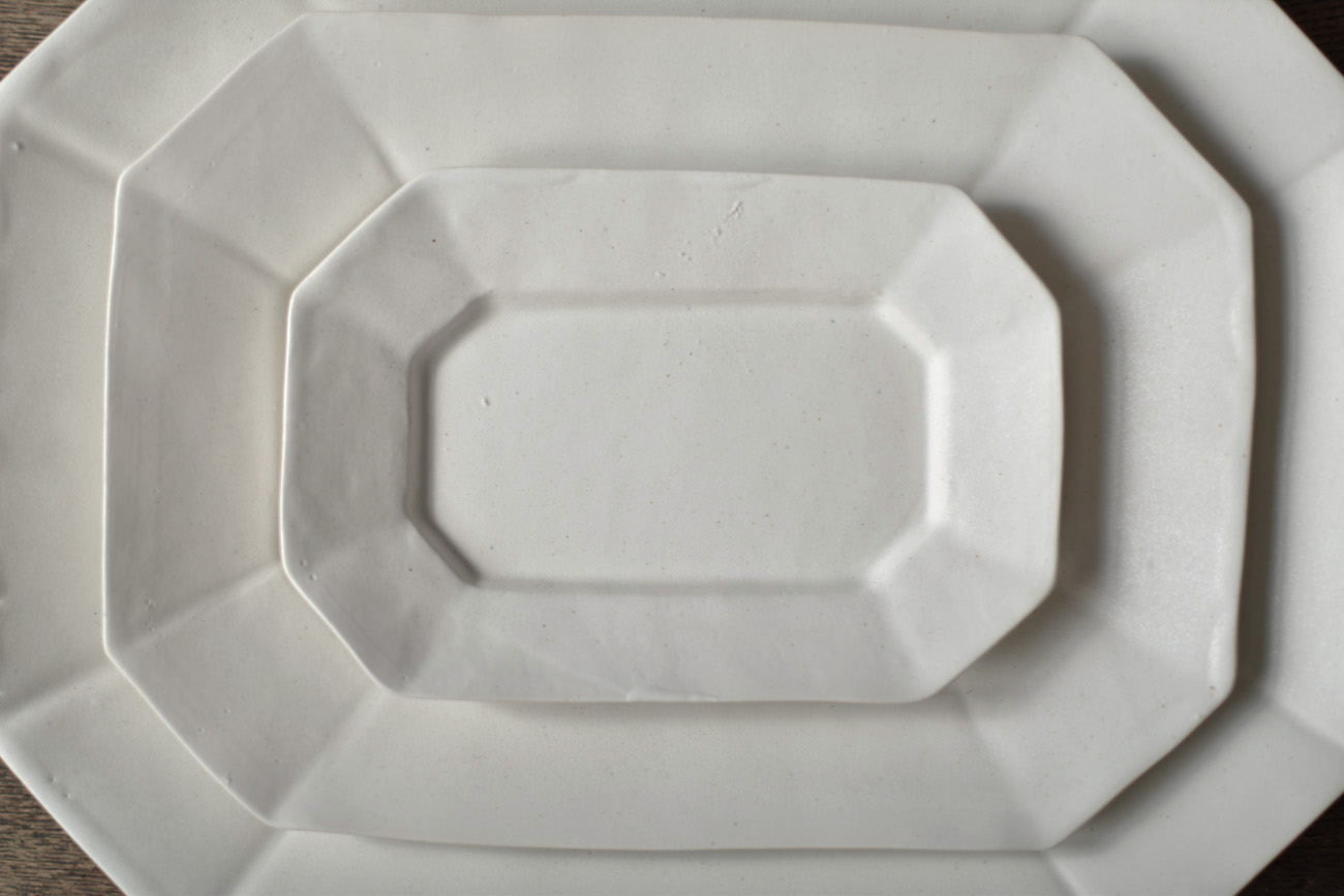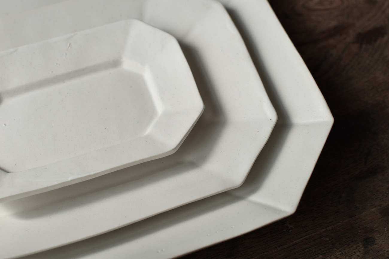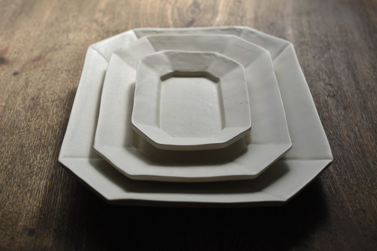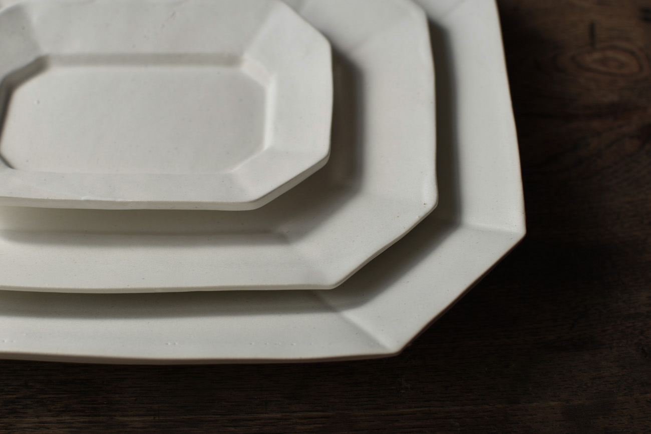タタラ作りと呼ばれる、石膏型による型打ちの技法で成形されています。キリッとしたエッジがフリーハンドの線のような緩やかな曲線を際立たせています。