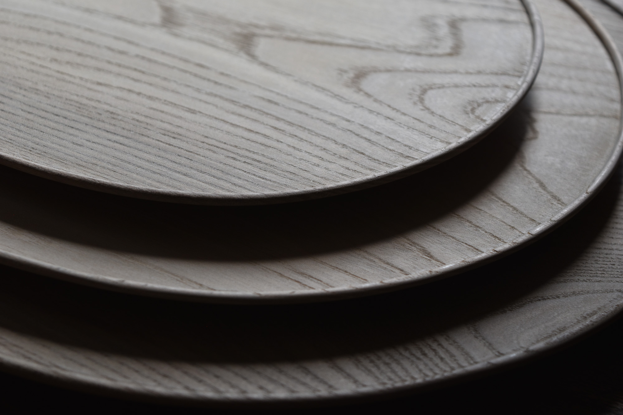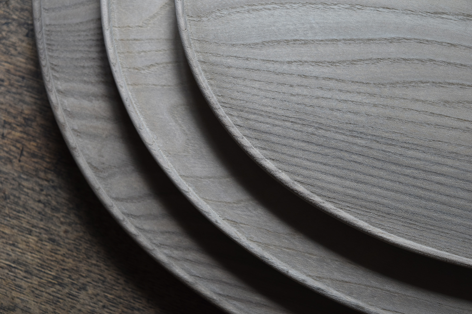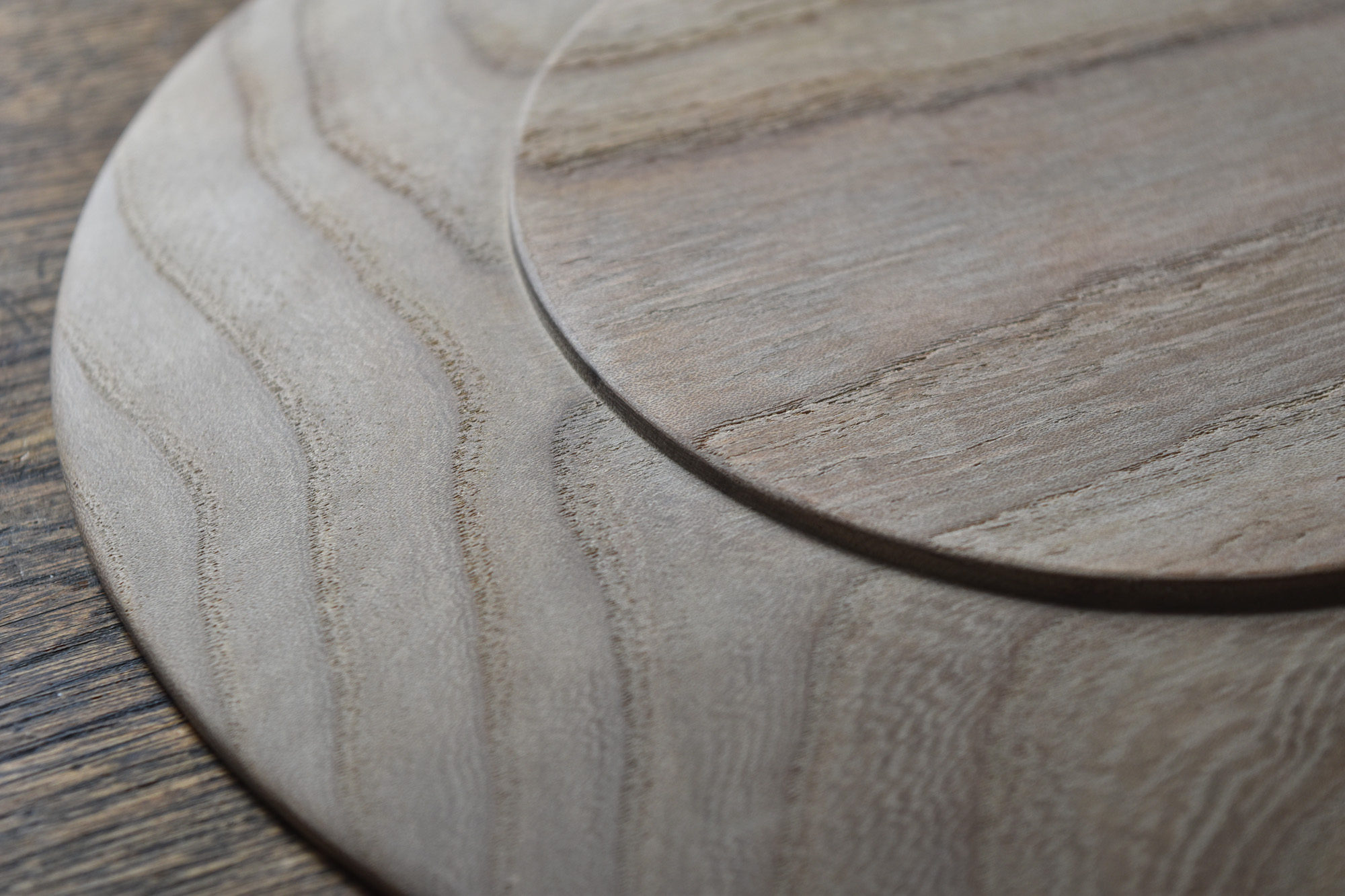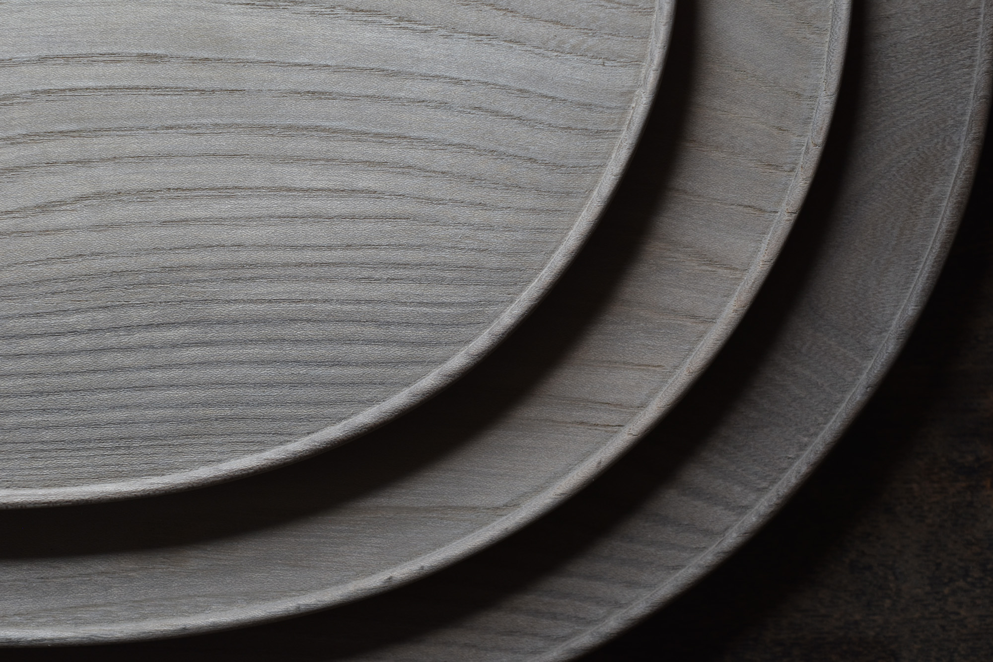 全て手彫りの刳物でありながら細部の美しさと滑らかで品のある造形は、磨き出された木の器と形容できると思います。一見シンプルでありながらも個性的な造形なのです。中央に向かって滑らかに窪む曲面は料理映えがとても良いのです。鉄媒染とは木に含まれるタンニンと鉄を反応させ黒く染め上げる方法です。オイル等よりも素地の肌触りに近いです。鉄媒染液は錆鉄+酢酸+水でつくられます。草木染めにも使われる自然な仕上げ方法です。器としては油シミなどが付着しやすいのですが、経年変化を楽しみながらお使い頂ければと思います。