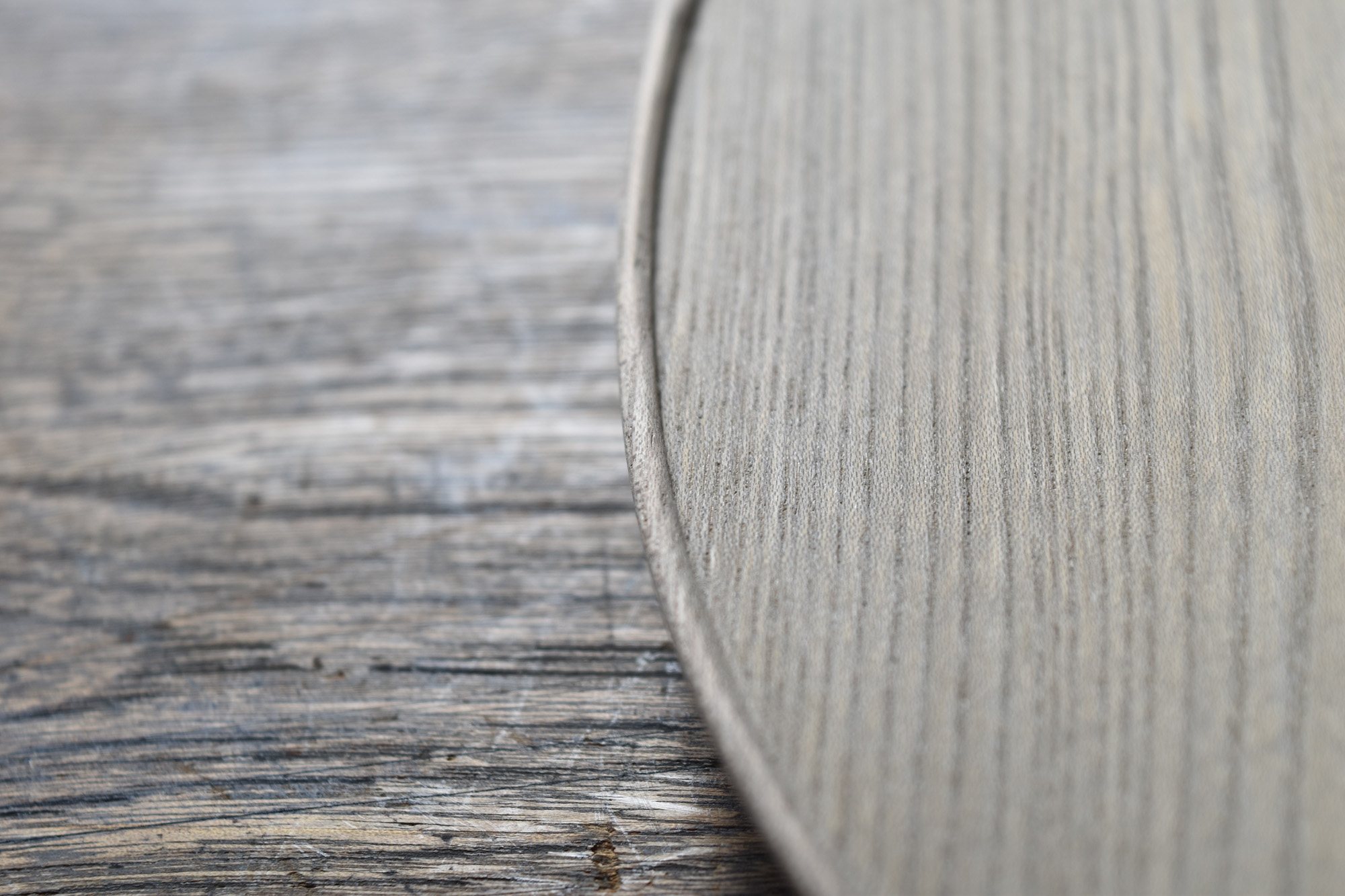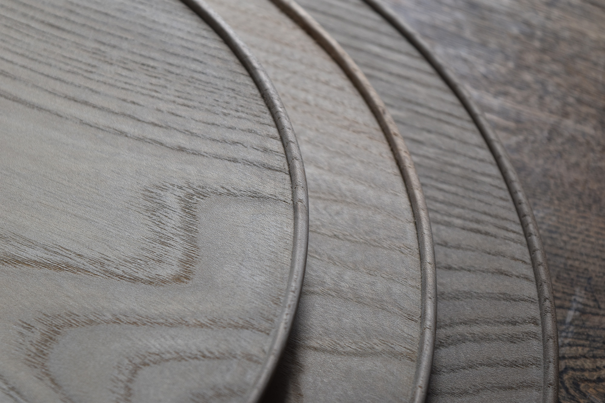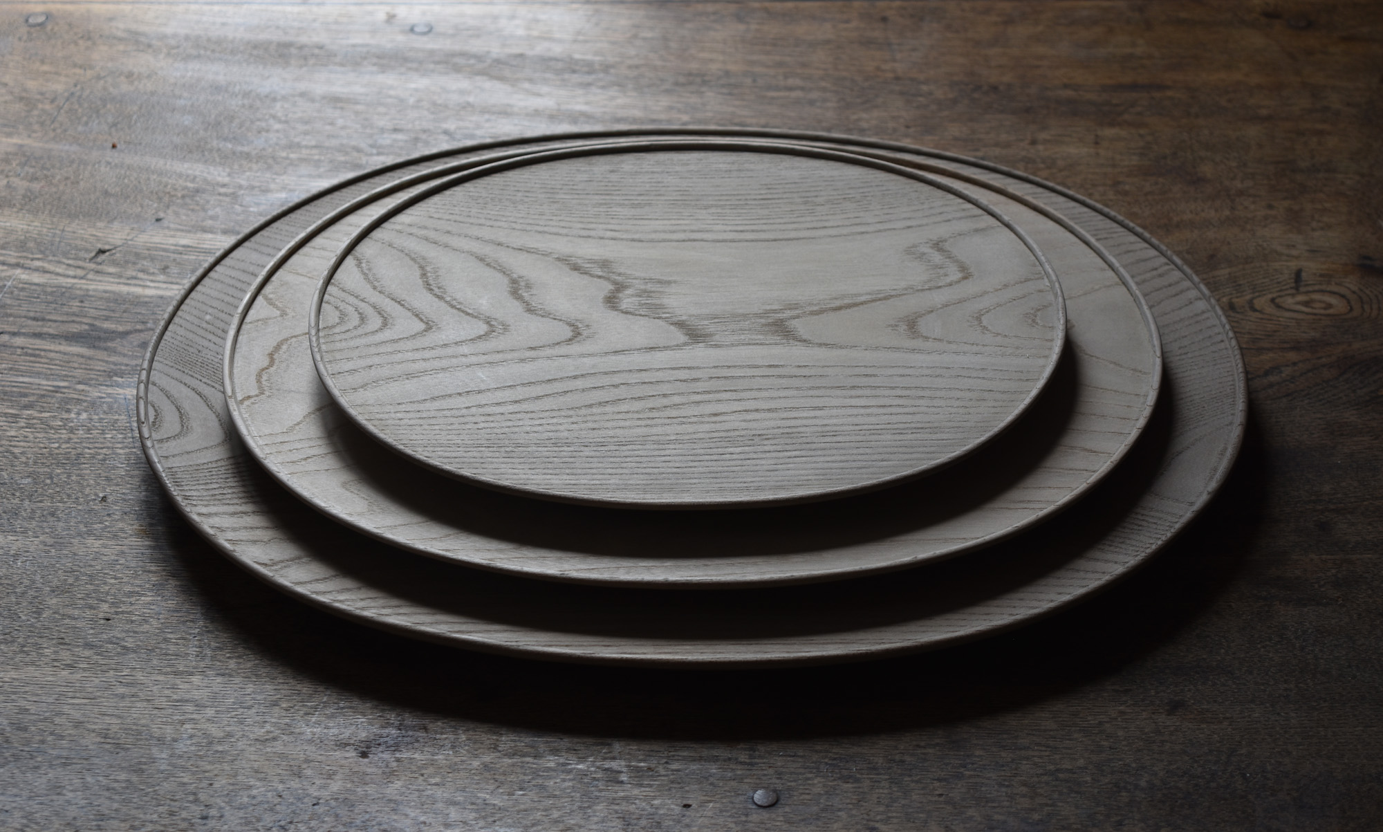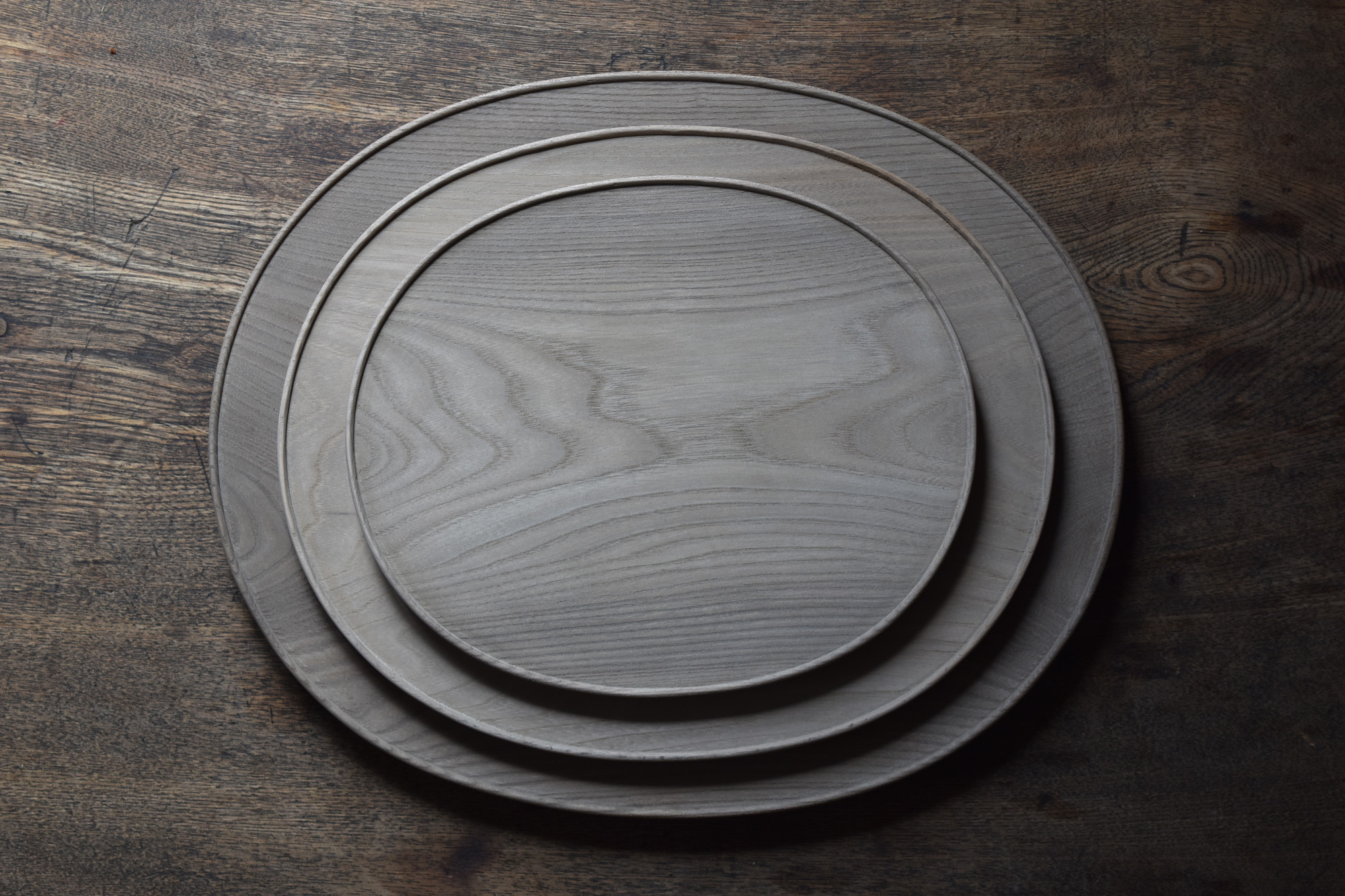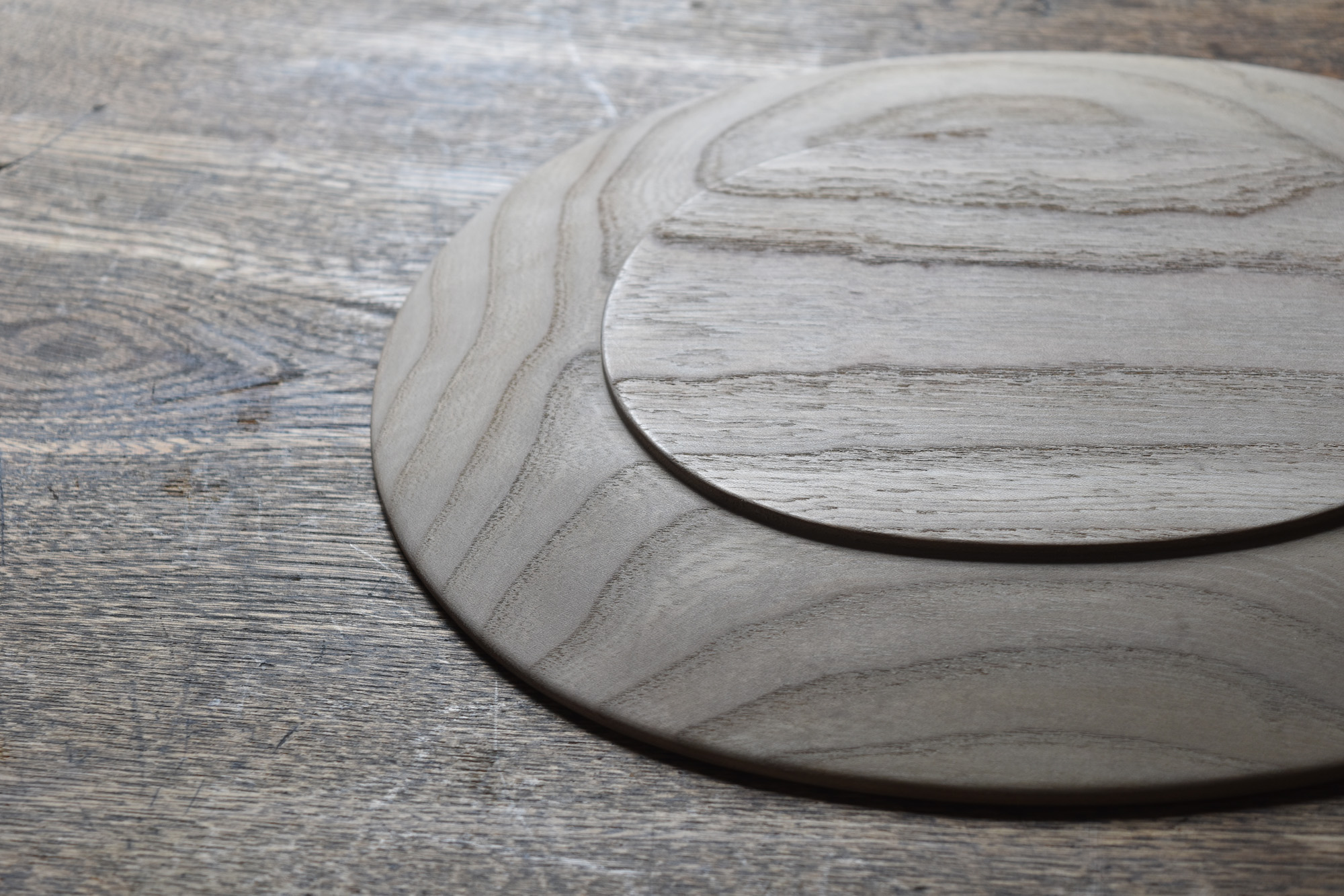 全て手彫りの刳物でありながら細部の美しさと滑らかで品のある造形は、磨き出された木の器と形容できると思います。一見シンプルでありながらも個性的な造形なのです。中央に向かって滑らかに窪む曲面は料理映えがとても良いのです。鉄媒染とは木に含まれるタンニンと鉄を反応させ黒く染め上げる方法です。オイル等よりも素地の肌触りに近いです。鉄媒染液は錆鉄+酢酸+水でつくられます。草木染めにも使われる自然な仕上げ方法です。器としては油シミなどが付着しやすいのですが、経年変化を楽しみながらお使い頂ければと思います。