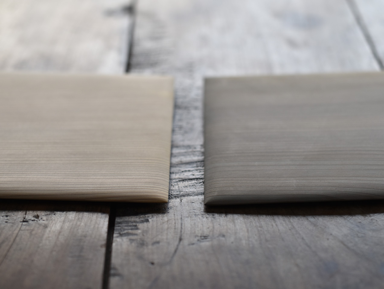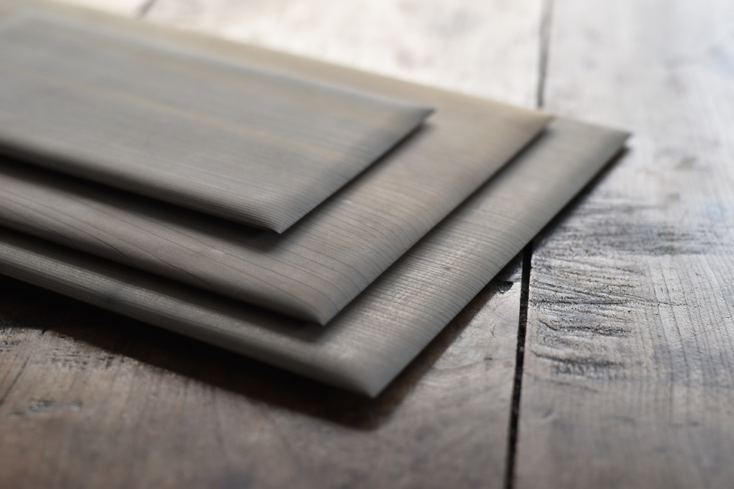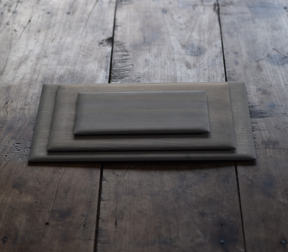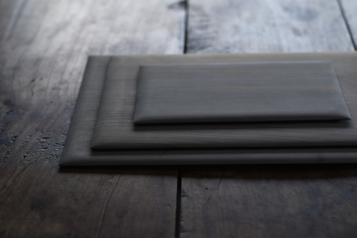 鉄媒染仕上げの作品はオイルや漆仕上げとは異なり、木に含まれるタンニンと反応させて染色する草木染めと同様の方法です。木本来の素地と同様の肌触りがあります。媒染液の濃度を変えたり、染める前に木にタンニンを多く含ませることでより黒く反応するのですが、紀平さんは薄い媒染液で品のある色合いに仕上げています。神代のグレーのような美しい空気感です。素地同様に油や水シミは付きやすいですが、より生活の跡が残り表情を変えていくことも楽しみであります。木と向き合うとそのままの表情に美しさを感じるのだと思います。