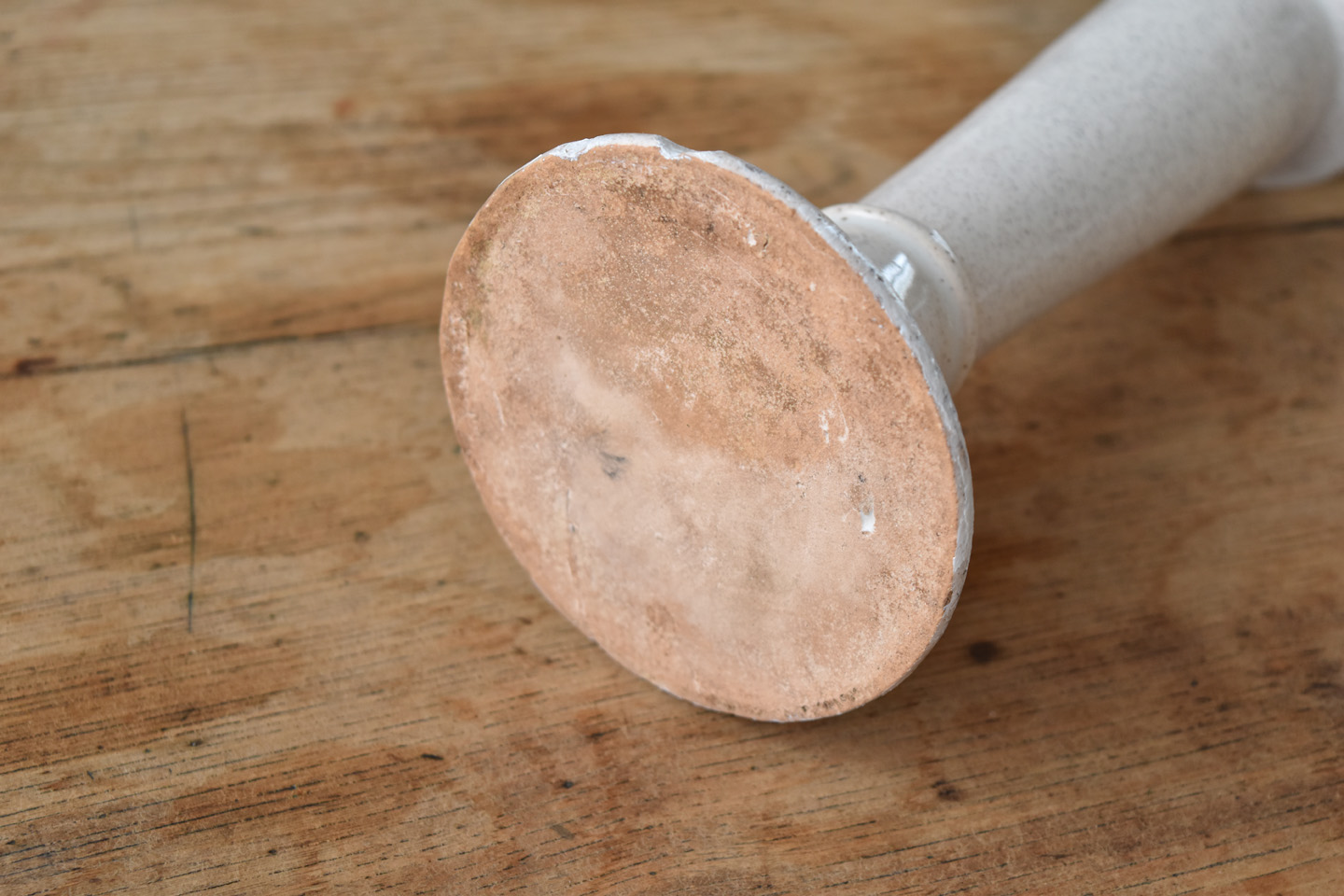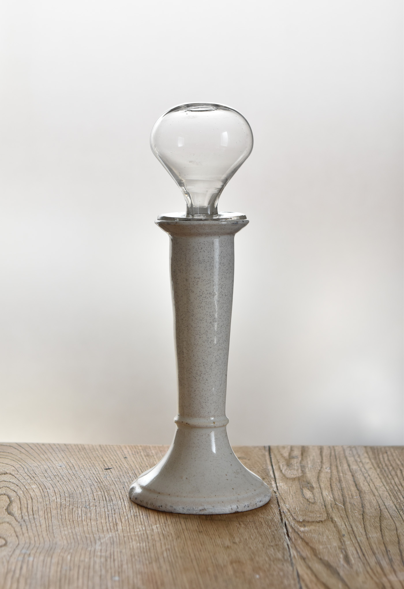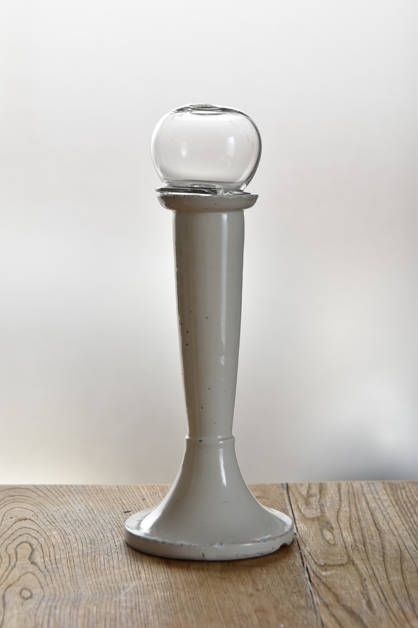 南仏プロヴァンス地方にみられる、オイルランプです。ファイアンスのベースと手吹きガラスのランプ部分に分かれています。ガラス単体のものよりも稀少です。陶器部分だけでキャンドルスタンドとして出ている場合もあります。ガラスの欠けや陶器のチップなどあります。また前所有者の簡単なリペイントなどが見られます。市販のオイルと芯を入れてお使い頂けます。食卓に灯してみてはいかがでしょうか。