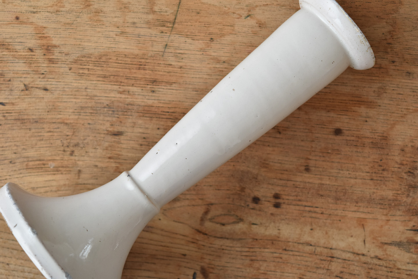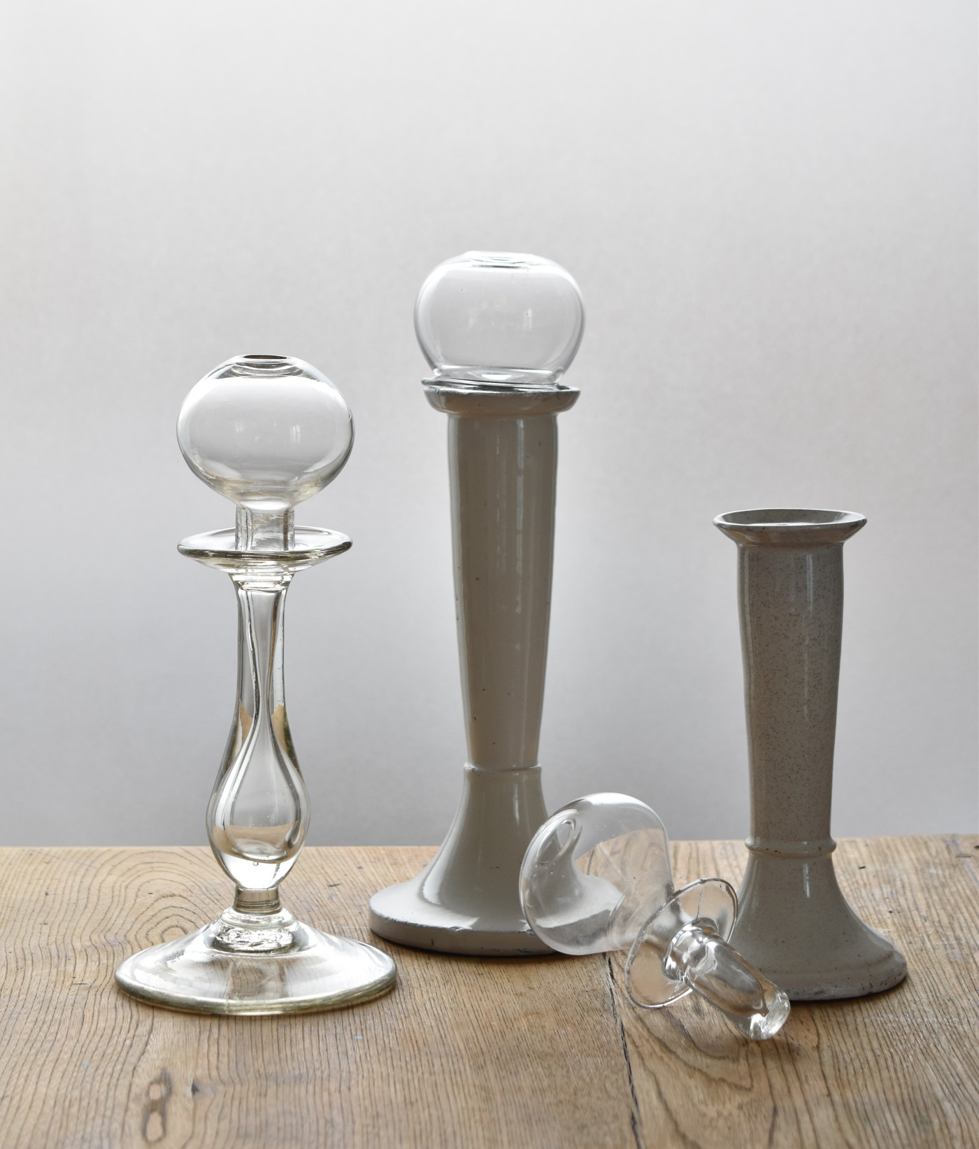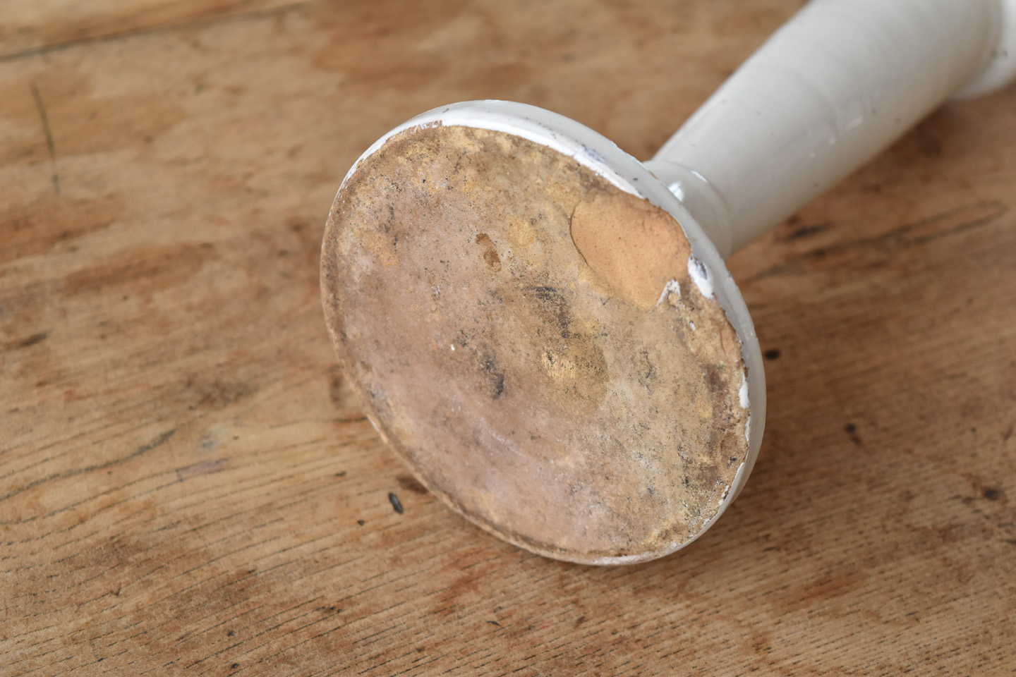 南仏プロヴァンス地方にみられる、オイルランプです。ファイアンスのベースと手吹きガラスのランプ部分に分かれています。ガラス単体のものよりも稀少です。陶器部分だけでキャンドルスタンドとして出ている場合もあります。ガラスの欠けや陶器のチップなどあります。また前所有者の簡単なリペイントなどが見られます。市販のオイルと芯を入れてお使い頂けます。食卓に灯してみてはいかがでしょうか。