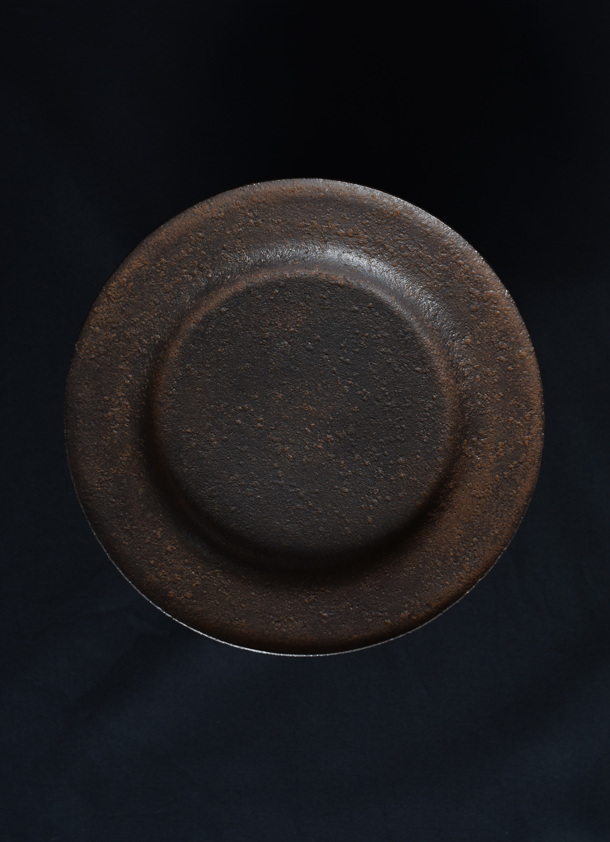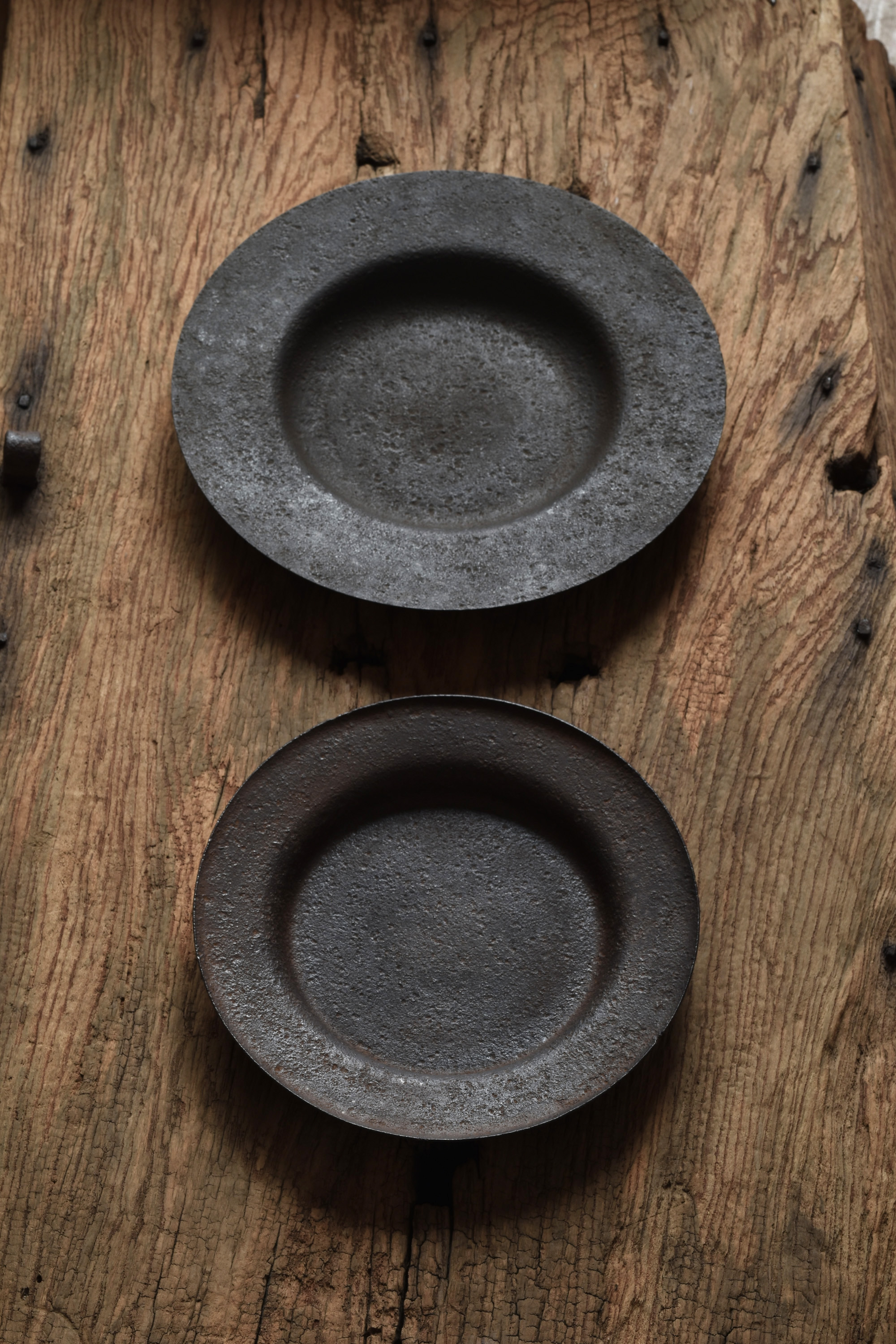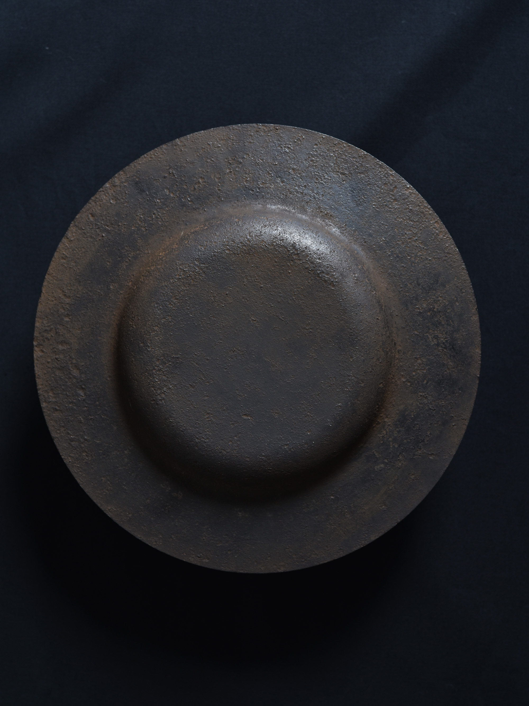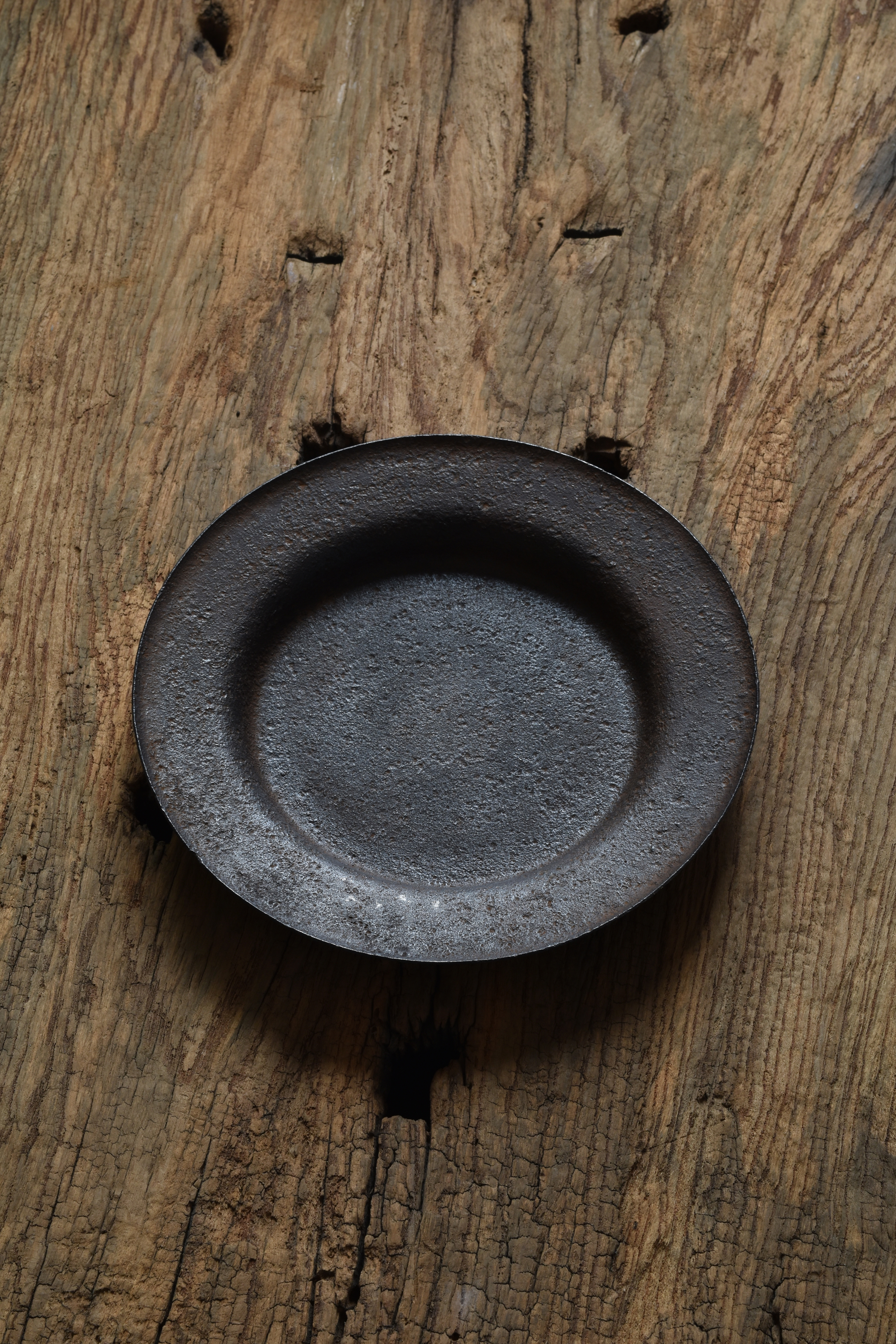 形を成形後、8年もの間を外部にて経年変化させた自然な風化仕上げ。菓子皿や乾きもの、盆としても。それぞれに表情、リムの形や幅など異なります。