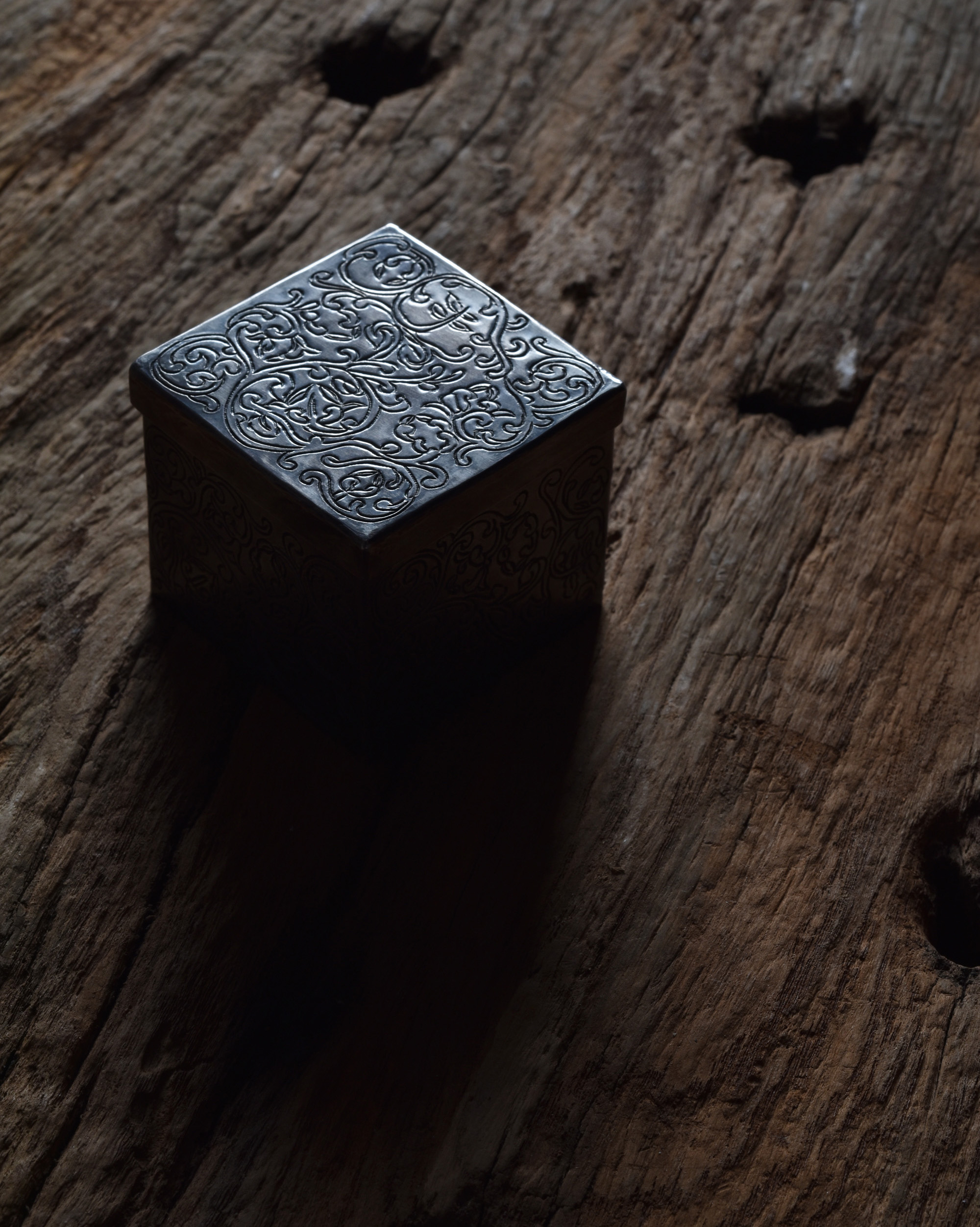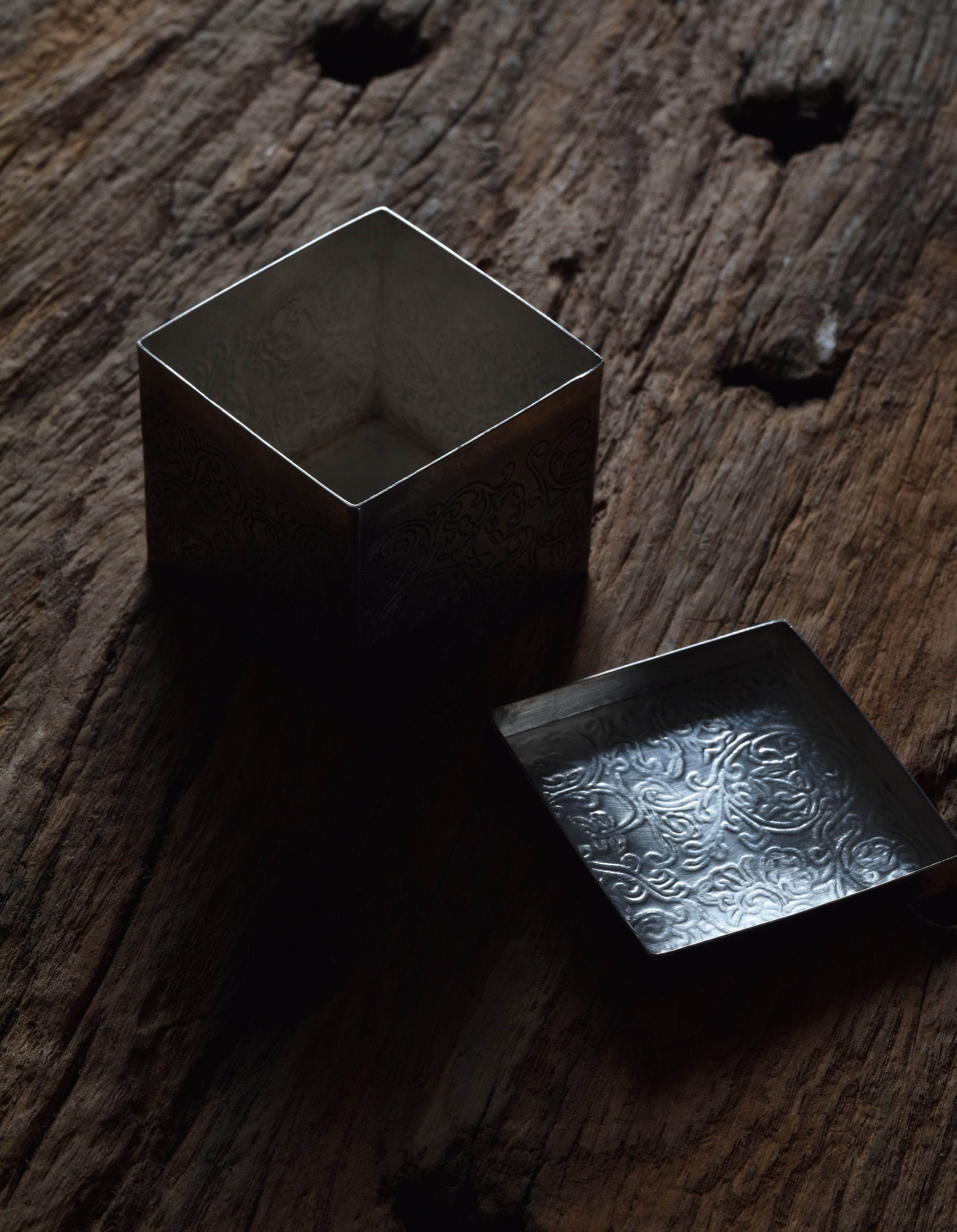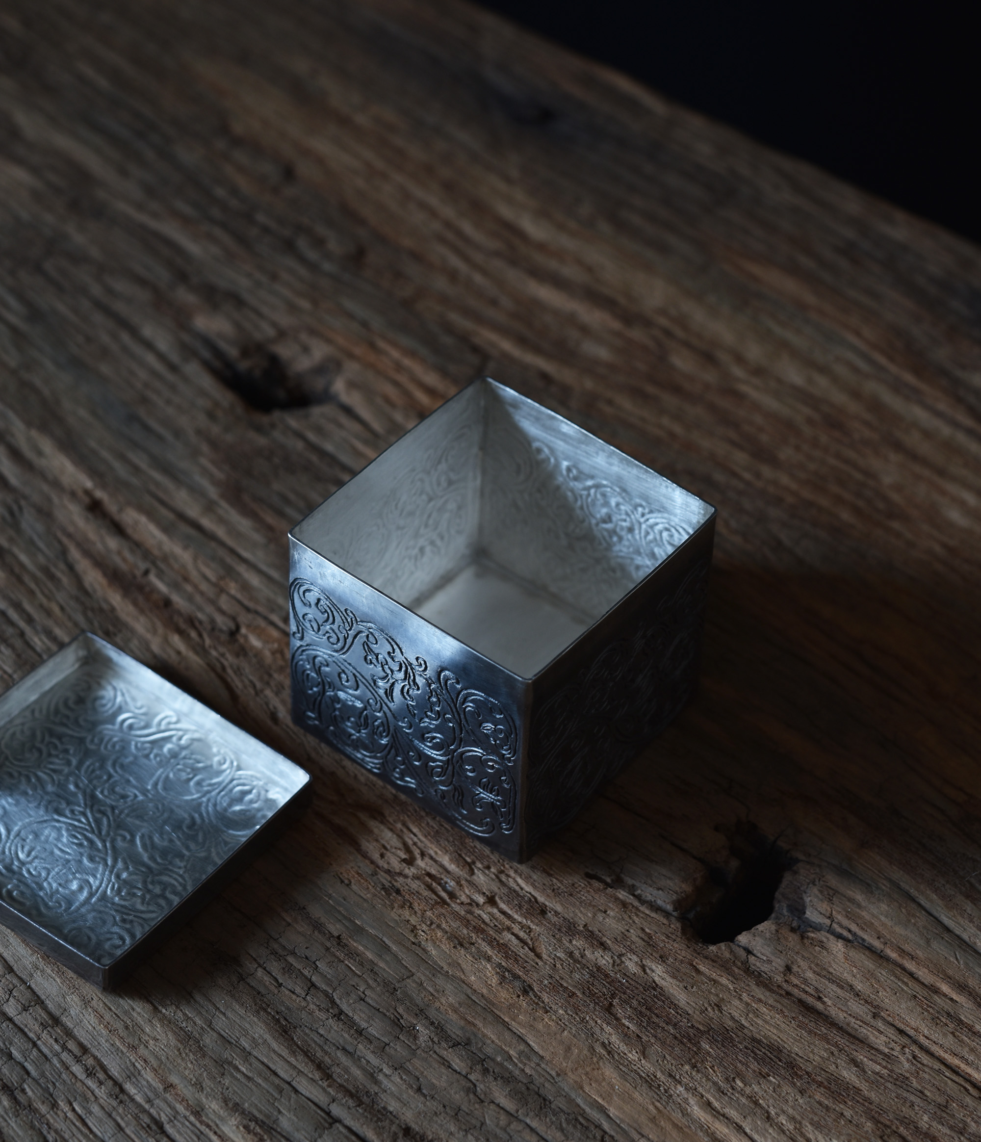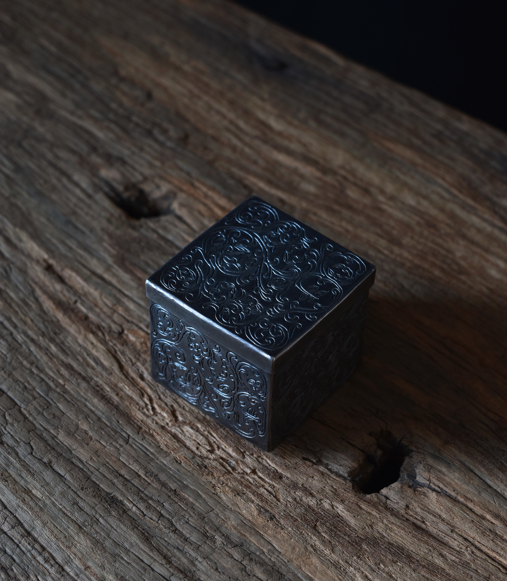 燻した銀黒。菓子入れにも。