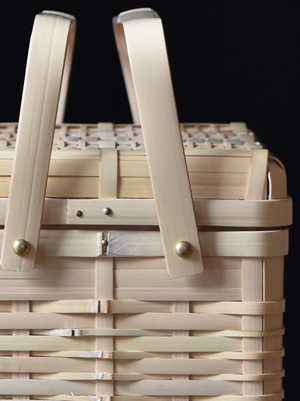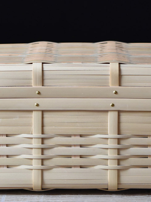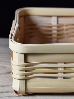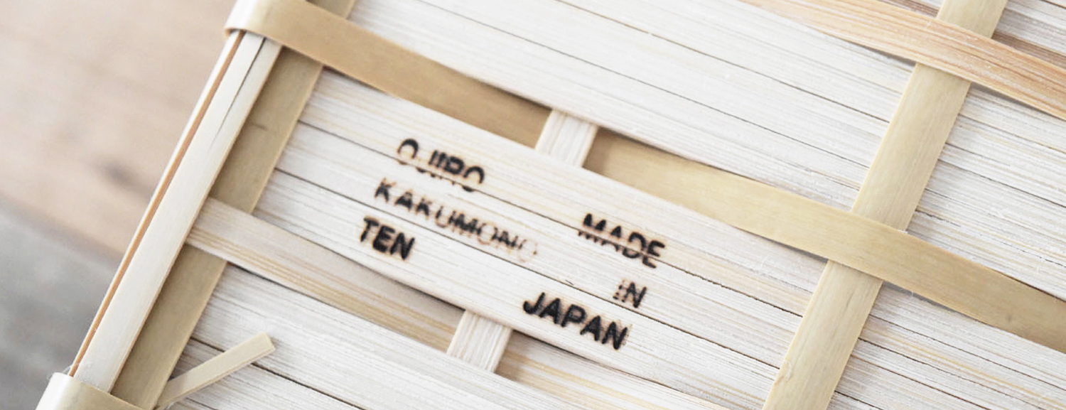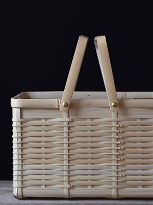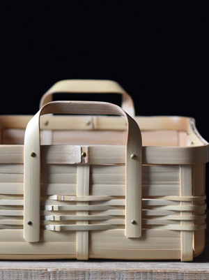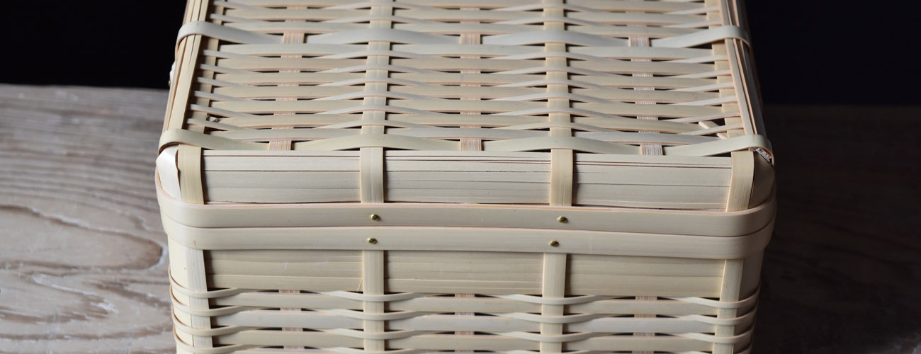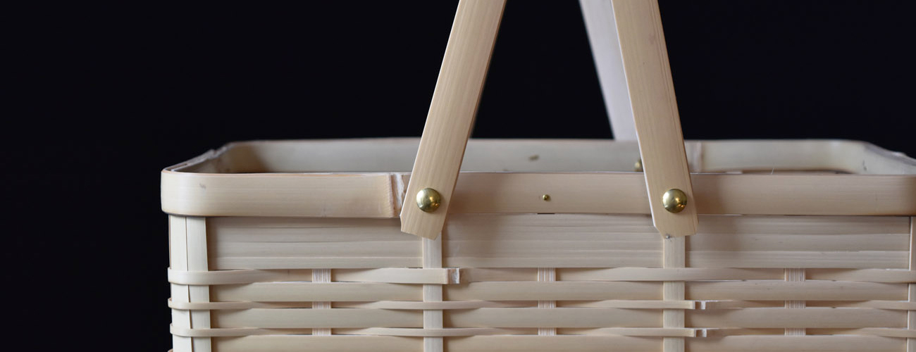 角物とは四角形で、胴、蓋、手と別々に組む方法で、火曲げという特殊技法を用いて作られたものです。角物は明治以前に兵庫県有馬地方から大分県別府に技術が移り、別府籠として角物が始まりました。大分県は真竹の生産量が日本一で、また良質な竹が採れる所でもあり、竹工、竹芸の中でも丈夫な道具として作られた角物は、戦前、戦中、戦後と変わることなく生産され、また数多くの角物師(角物専門の職人)もいました。しかし高度経済成長期あたりからプラスティック製品や中国製などの安い製品が出回りかつての職人たちはいなくなり、今では角物師も日本では数人となっています。その一人、孫弟子たちを含めた角物職人を寒竹一統と呼び、最後の角物師、寒竹唯善さんのところに弟子入りし学び、2008年より「おじろ角物店」として角物を中心に暮らしの物を製作しています
