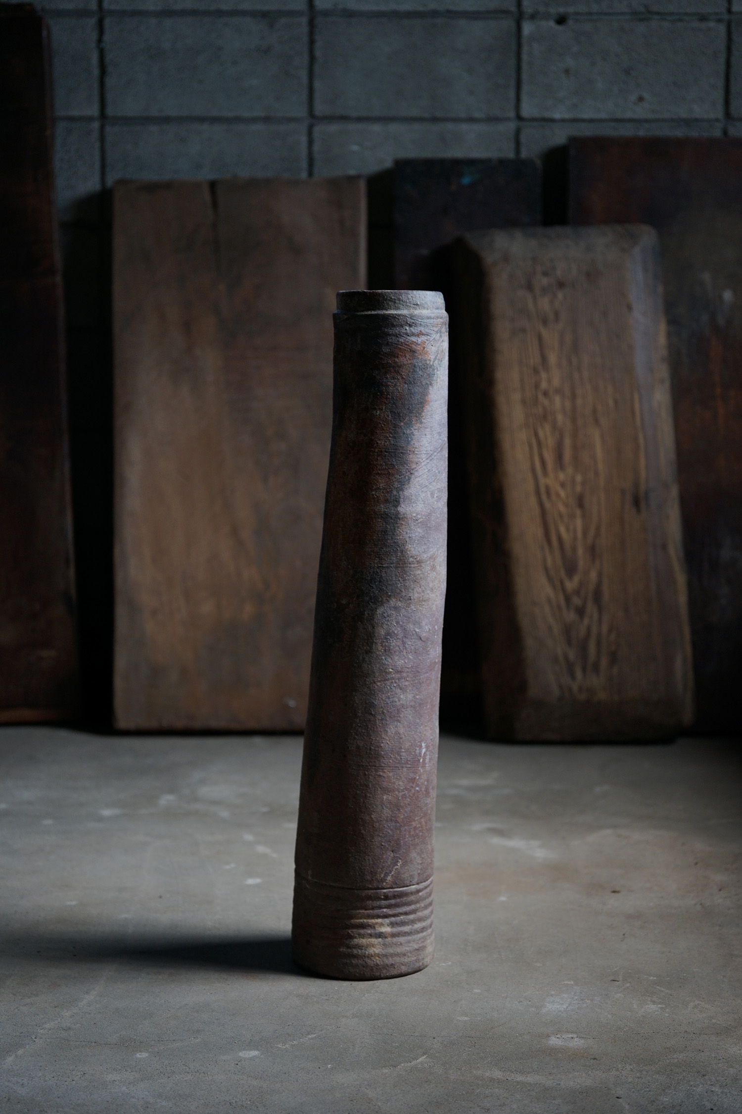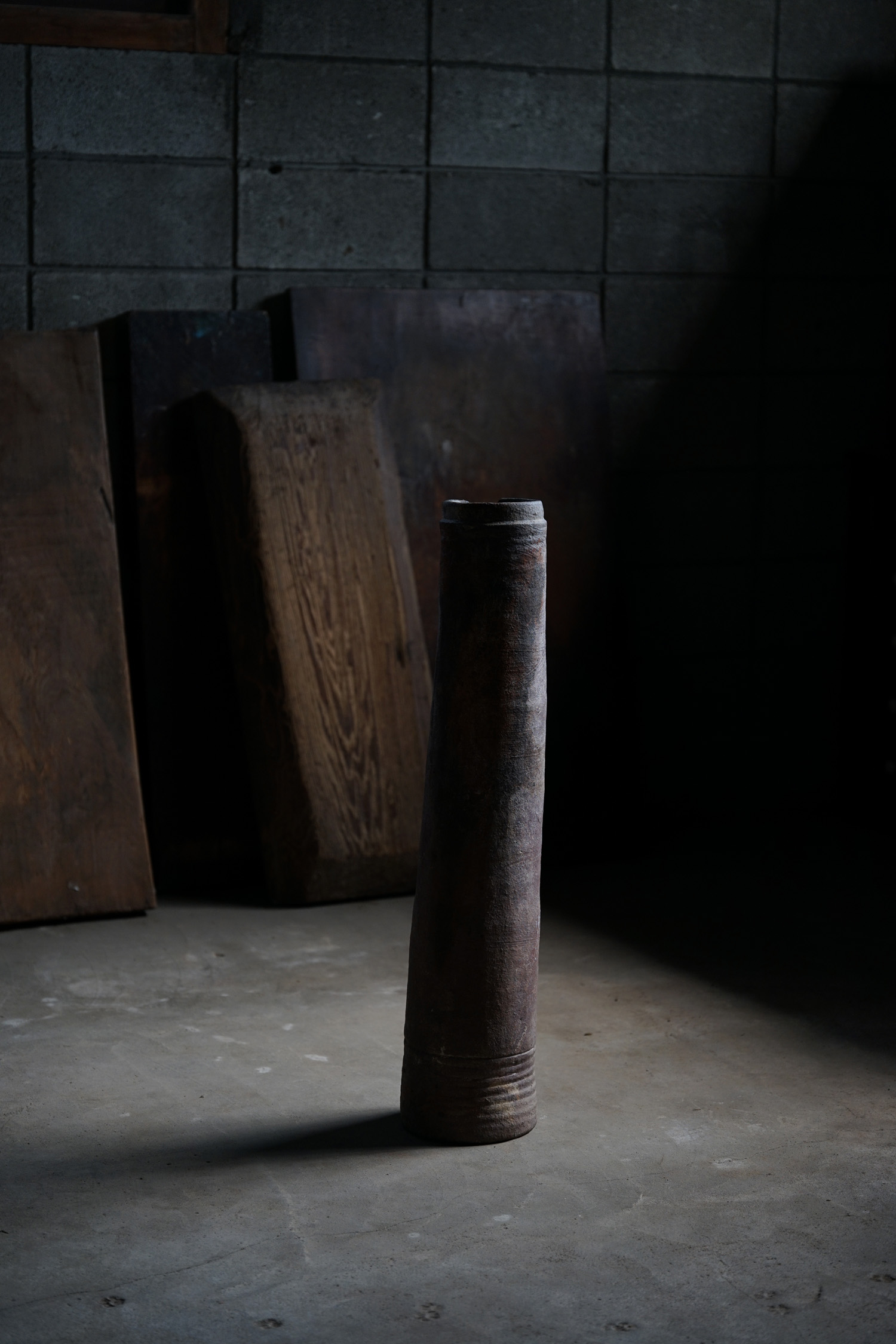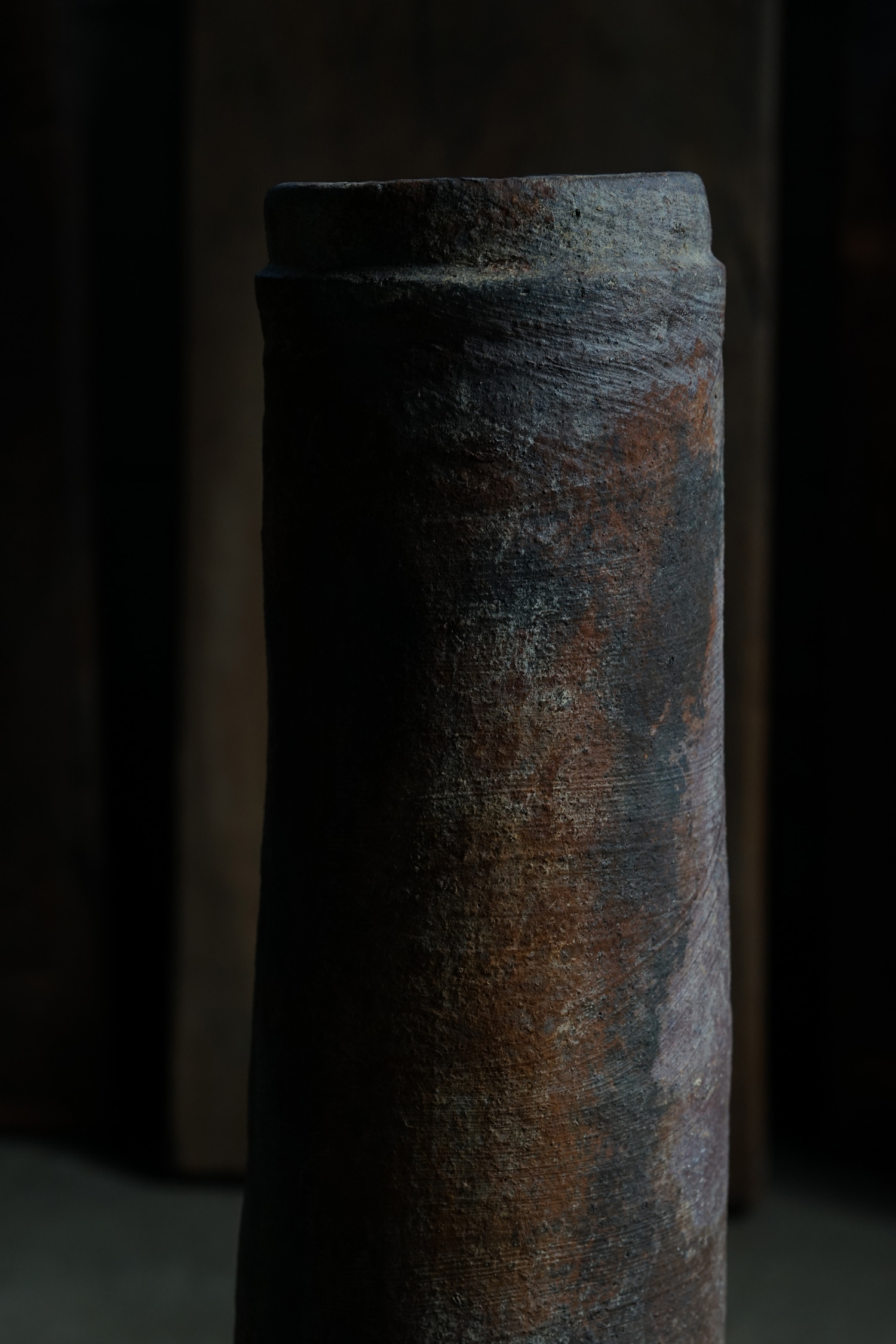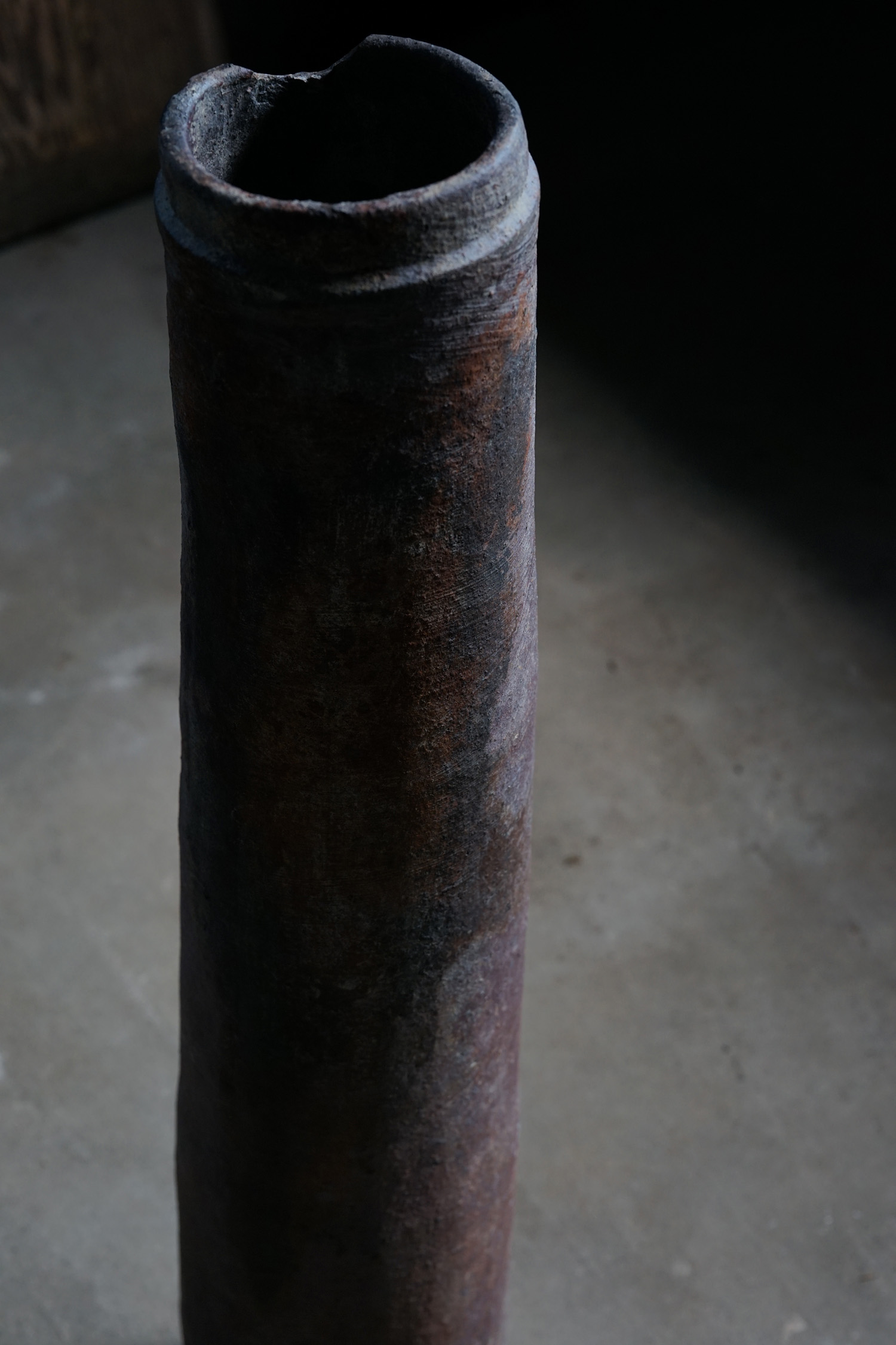 古い備前焼の土管です生命力のある轆轤の動きを感じます。火色も美しく、オブジェとして。または筒型ですので工夫して落としを入れて花入れなどにもよろしいかと思います。お部屋の角にでもそっと置いておくだけで良い佇まいかと思います。