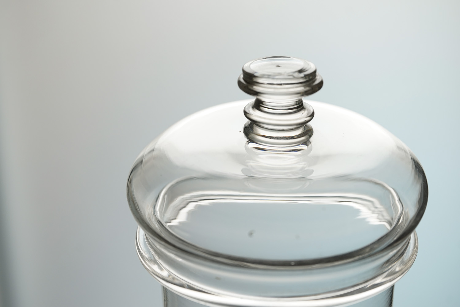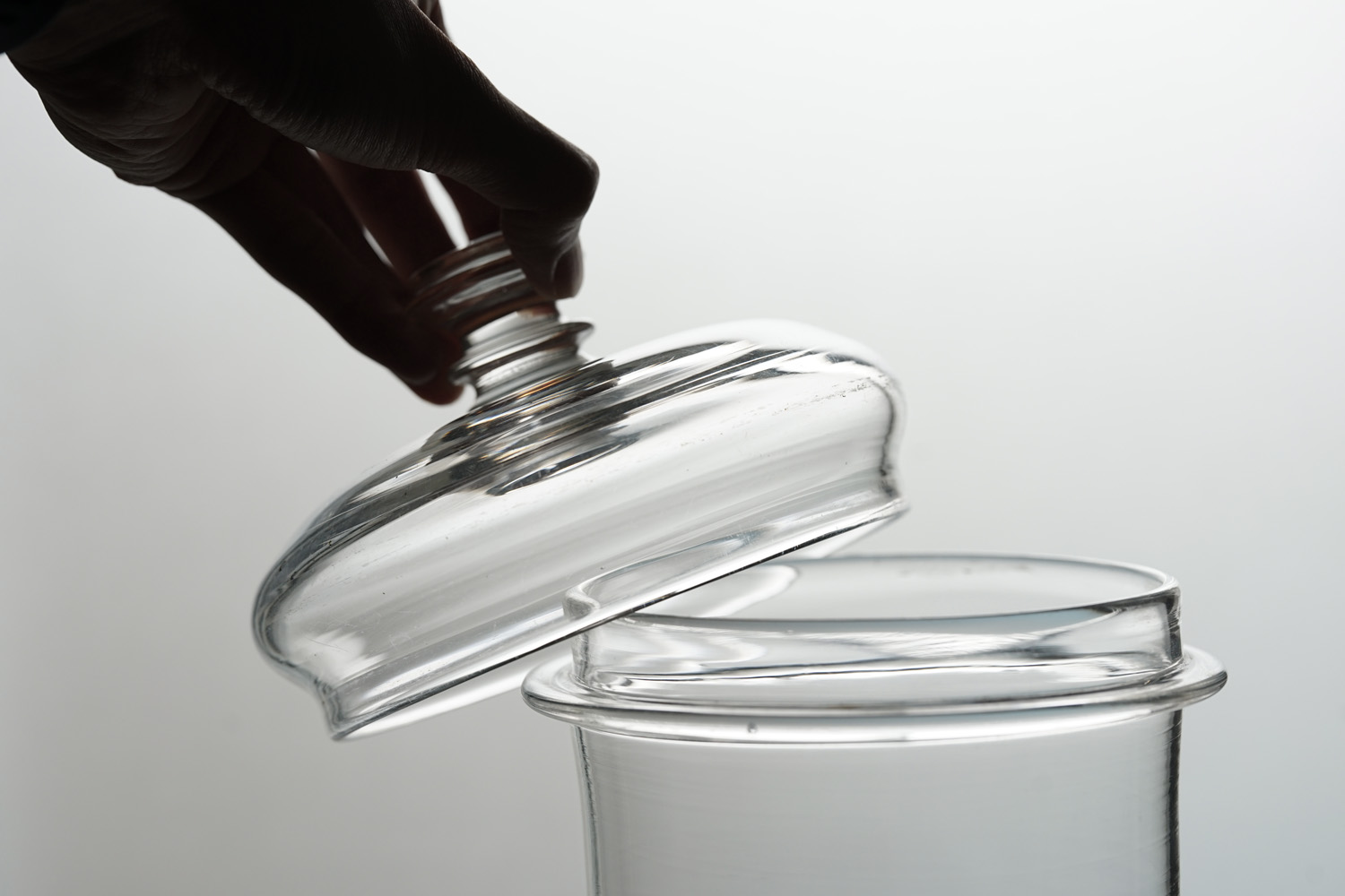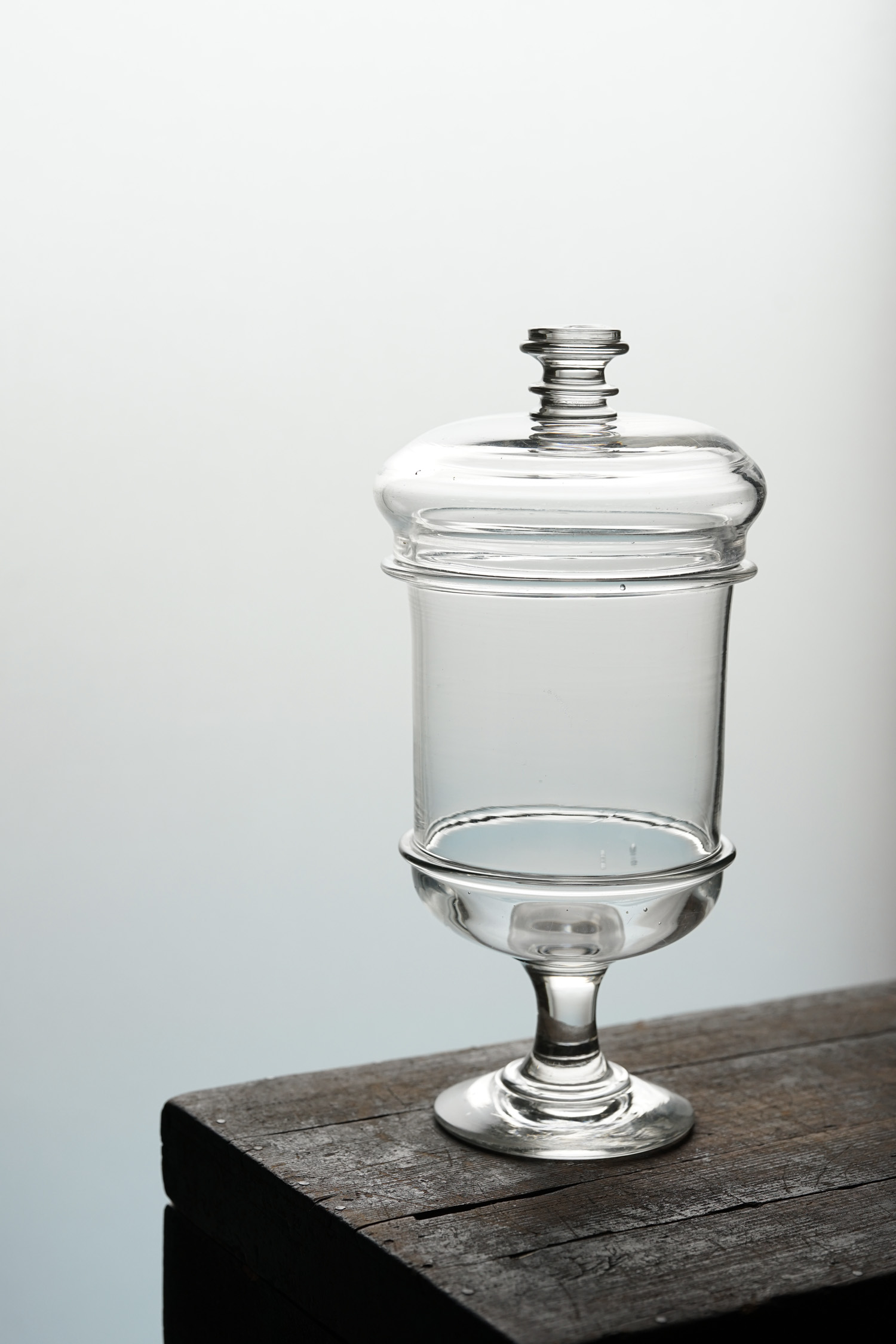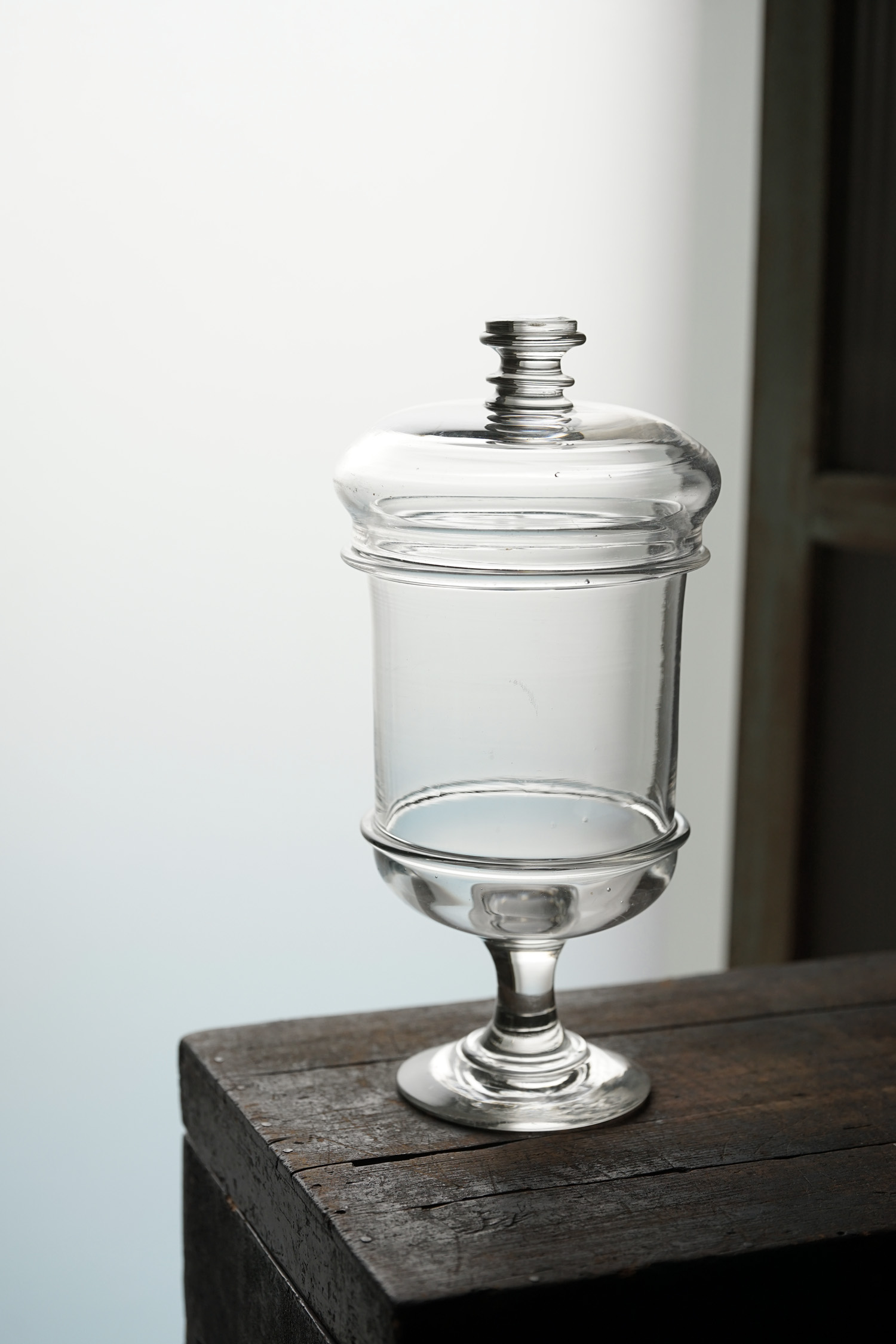 大きめのサイズの手吹きの硝子容器です。脚付きのフランスらしい形。蓋の収まりも美しいです。
