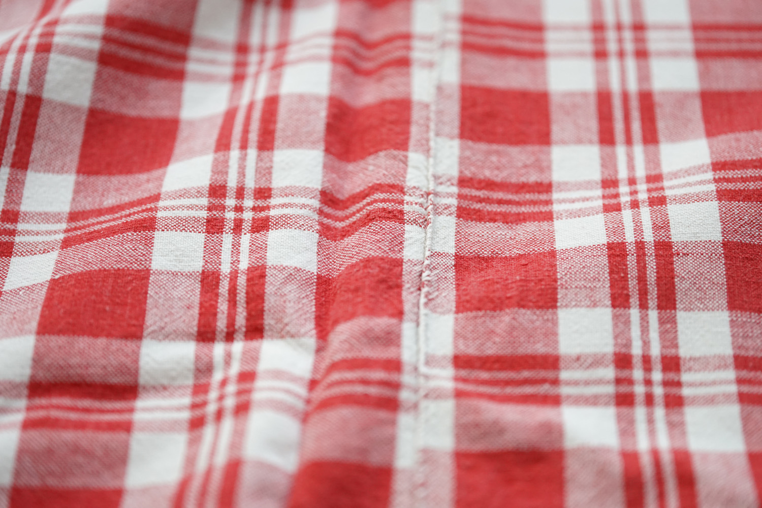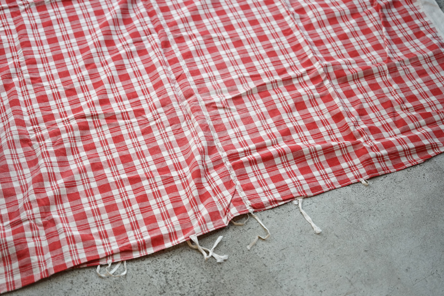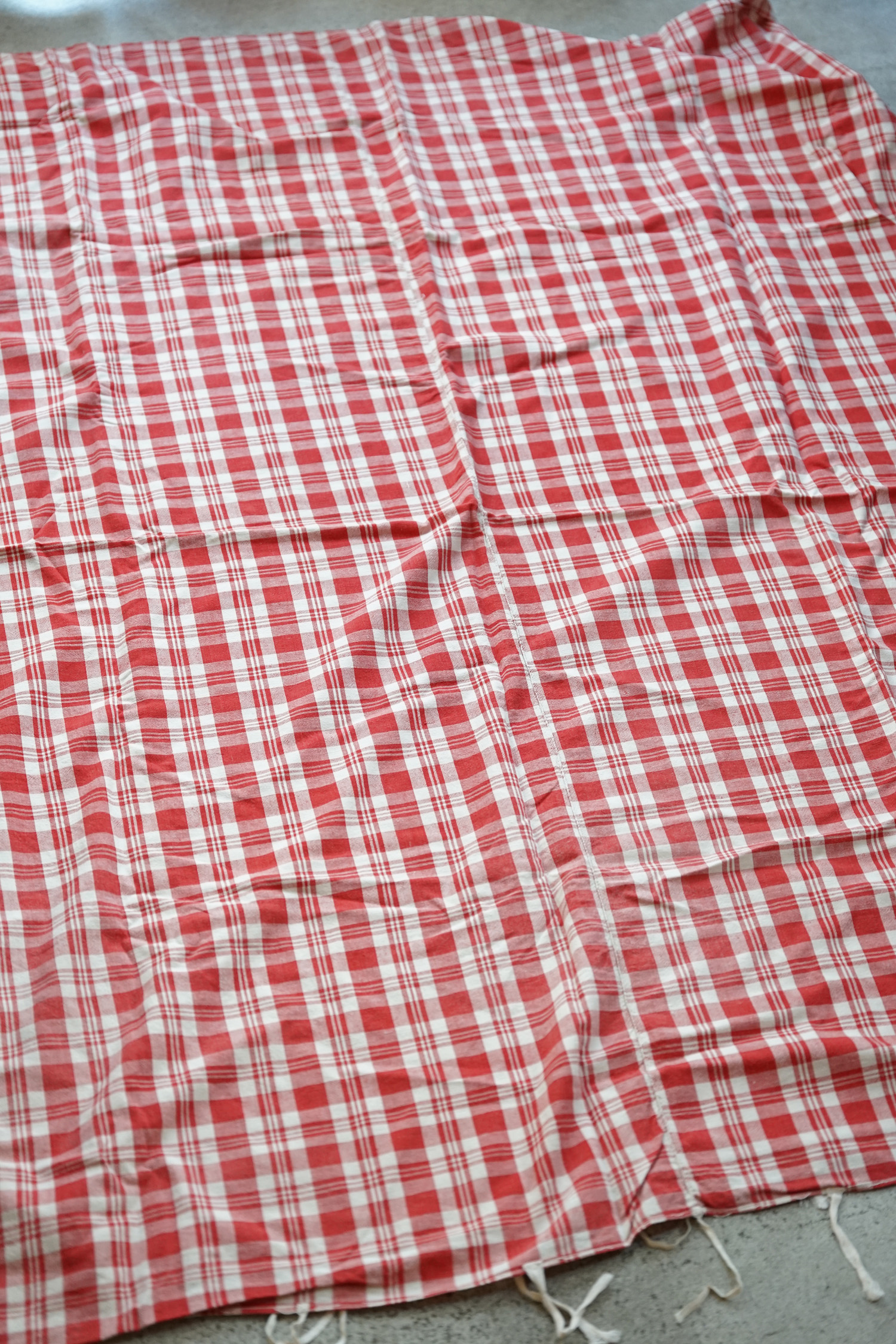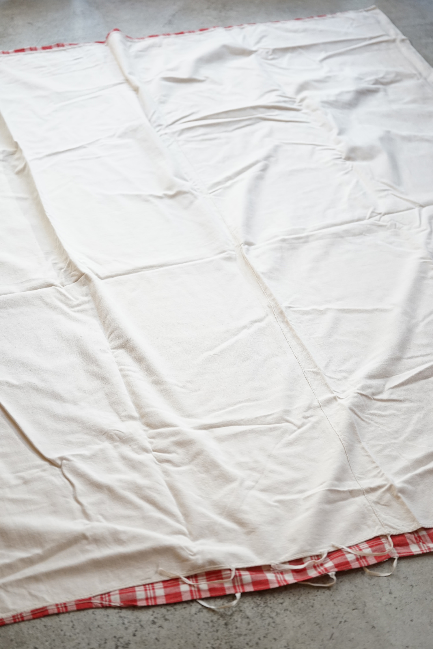 フランス東部ドイツとの国境近くのアルザス地方で19世紀に織られた伝統織物ケルシュです。大判の布団用のカバーです。手紡の糸は不均一で凹凸があり、それが織り上がった時の美しい表情となっています。袋状になっており、表地はチェック柄、裏地は無地になっています。袋口は中に詰める羽毛などを入れるため広めに開いており、紐で結んで使いました。当時の家庭の織機は小さく、一枚では幅が取れないため数枚の布を接いで一枚の布としましたが。テーブルクロスにもカーテンにも。無地とチェックと切り離してお使い頂いても良いかと思います。アルザス地方に見られる木造の可愛らしい建物が思い浮かぶ稀少なテキスタイルです。大きな破れなどはございませんが、それなりの染みや汚れはご了承下さいませ。