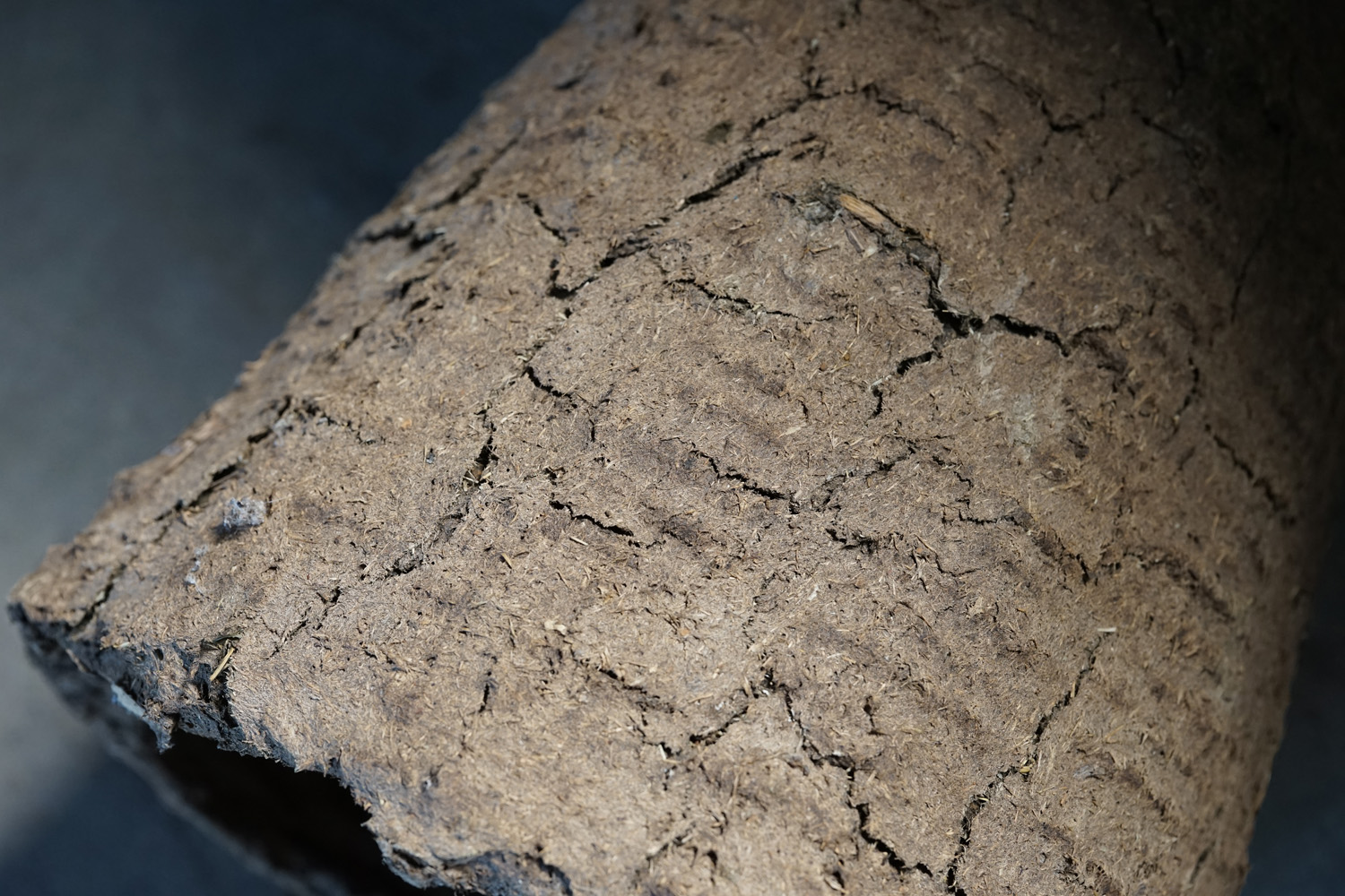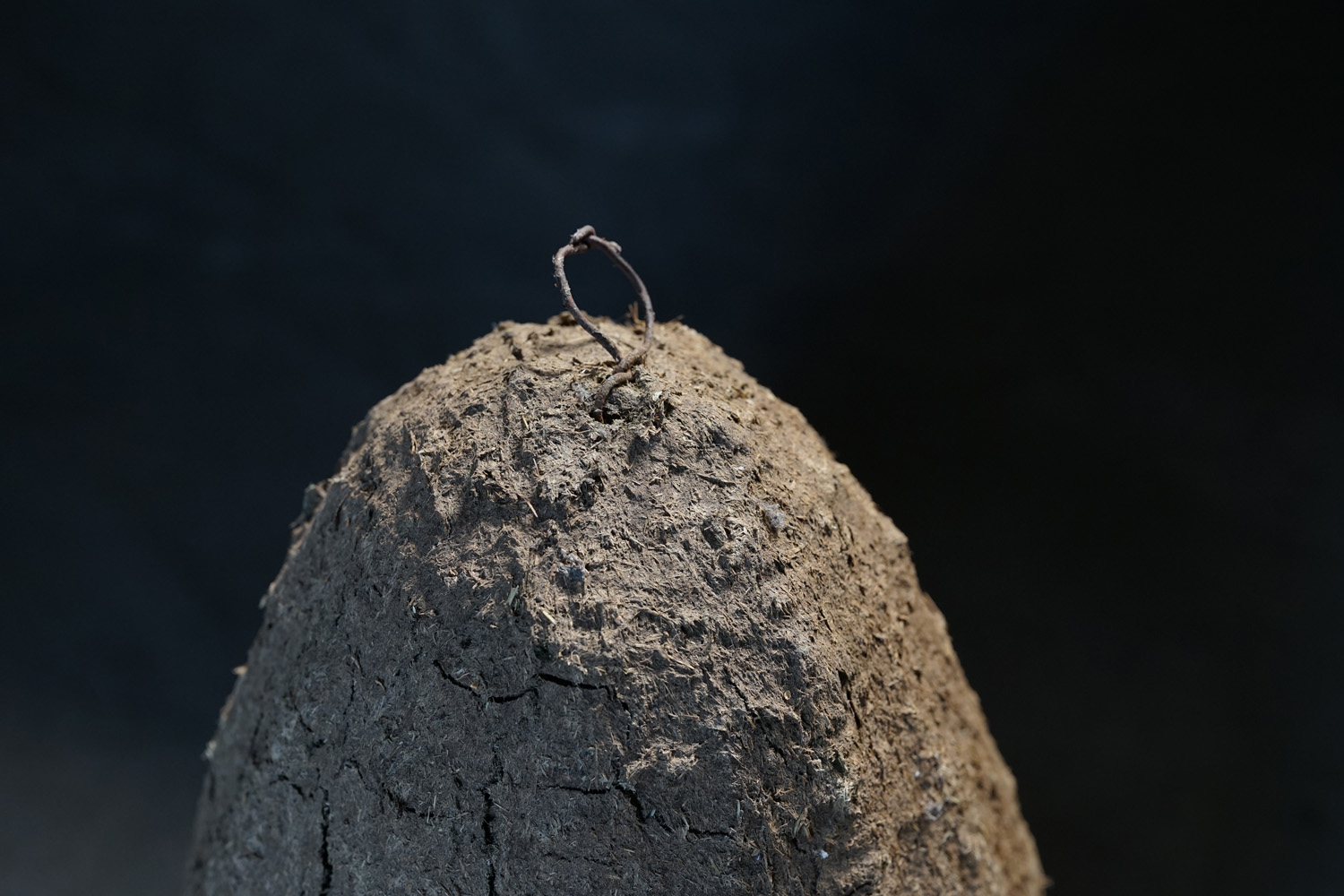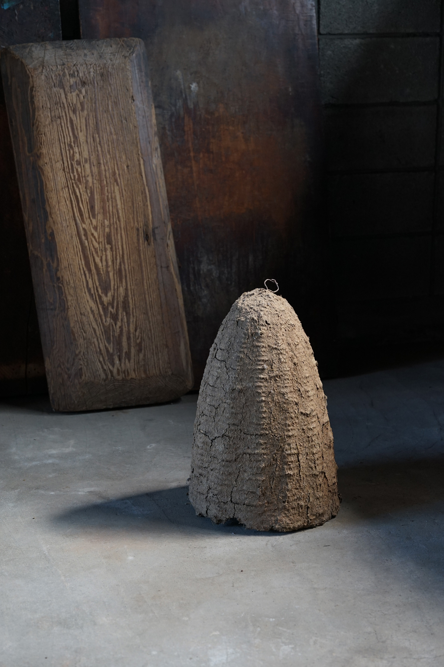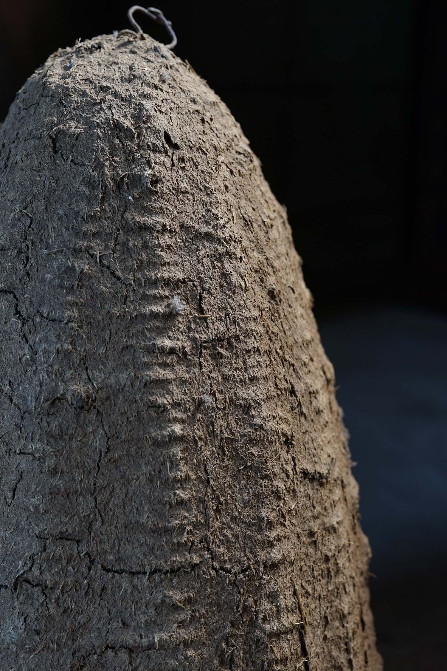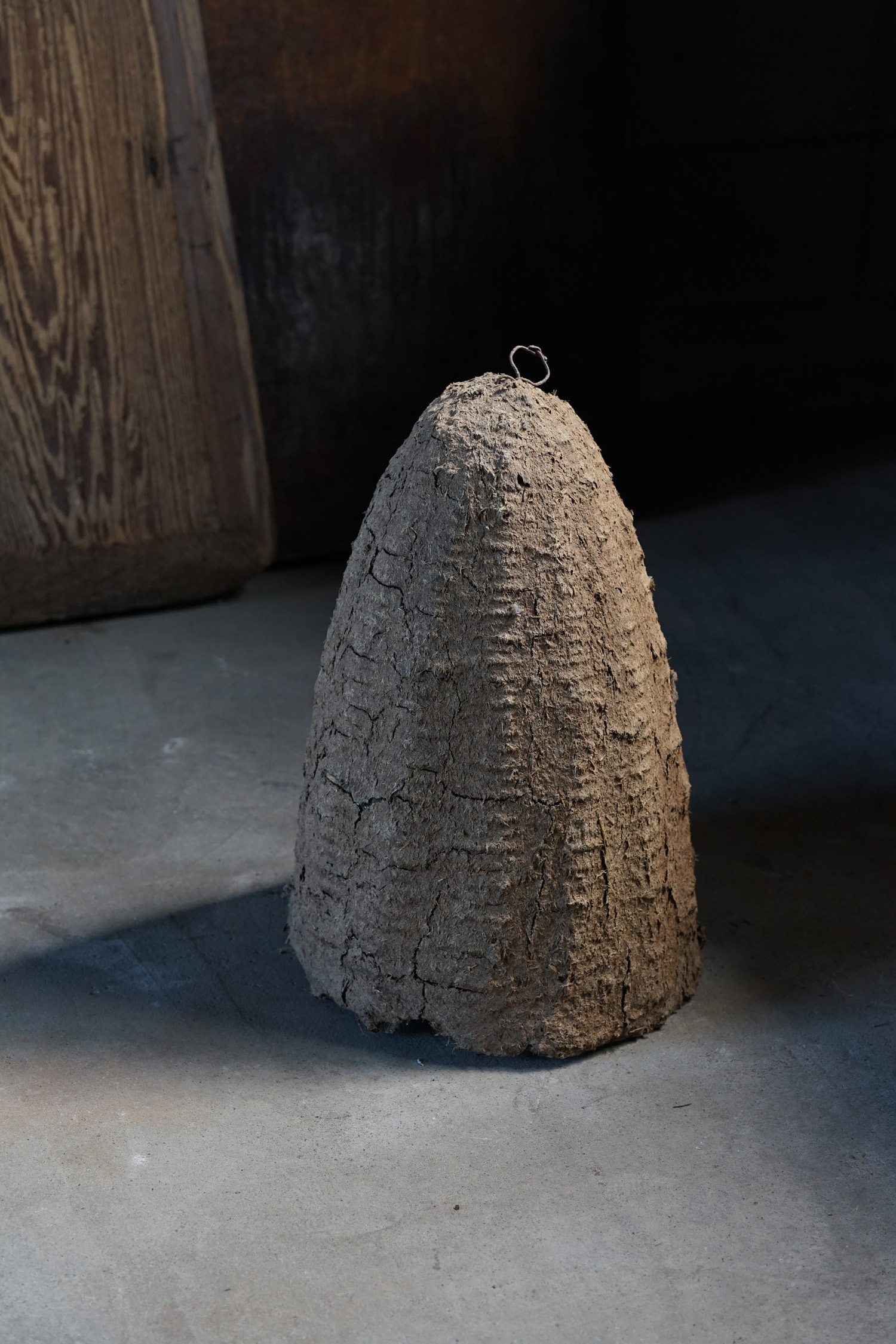 古く蜜蜂は藁編みのバスケット籠で飼われていました。更に古いものはそこに土や堆肥などで覆われています。蜜の採取に巣を壊さなければならない事や、病気や害虫について確認が出来ないため次第に無くなったそうです。人工物でありながら自然物のような造形です。四つ並びの左から二番目のモノとなります(他も在庫ございます)。