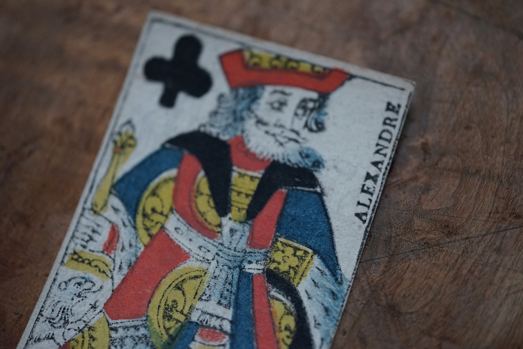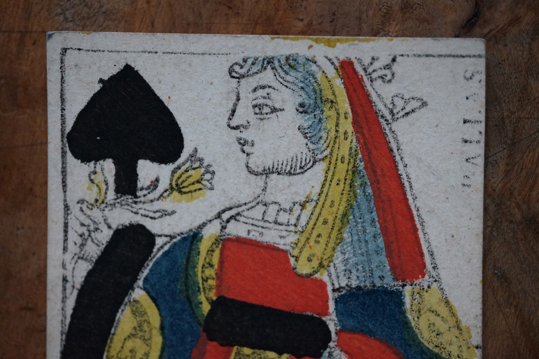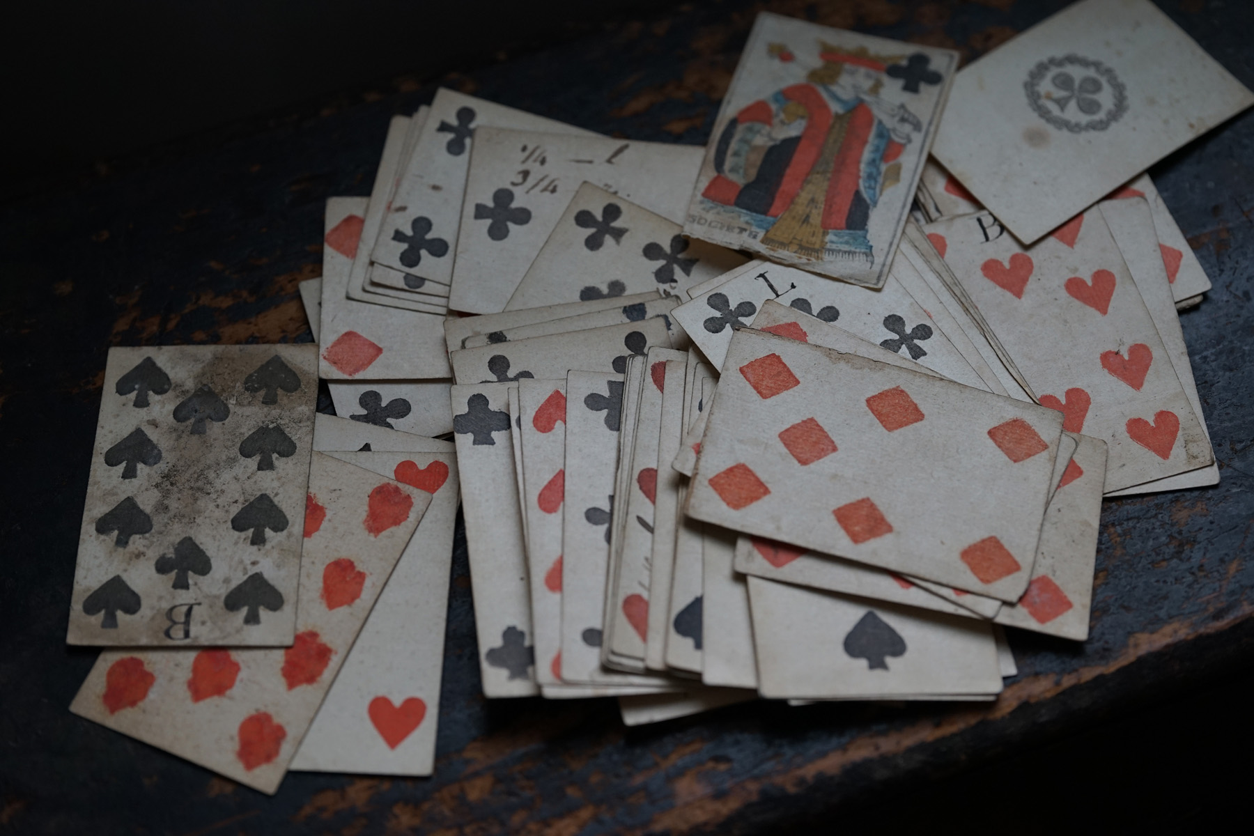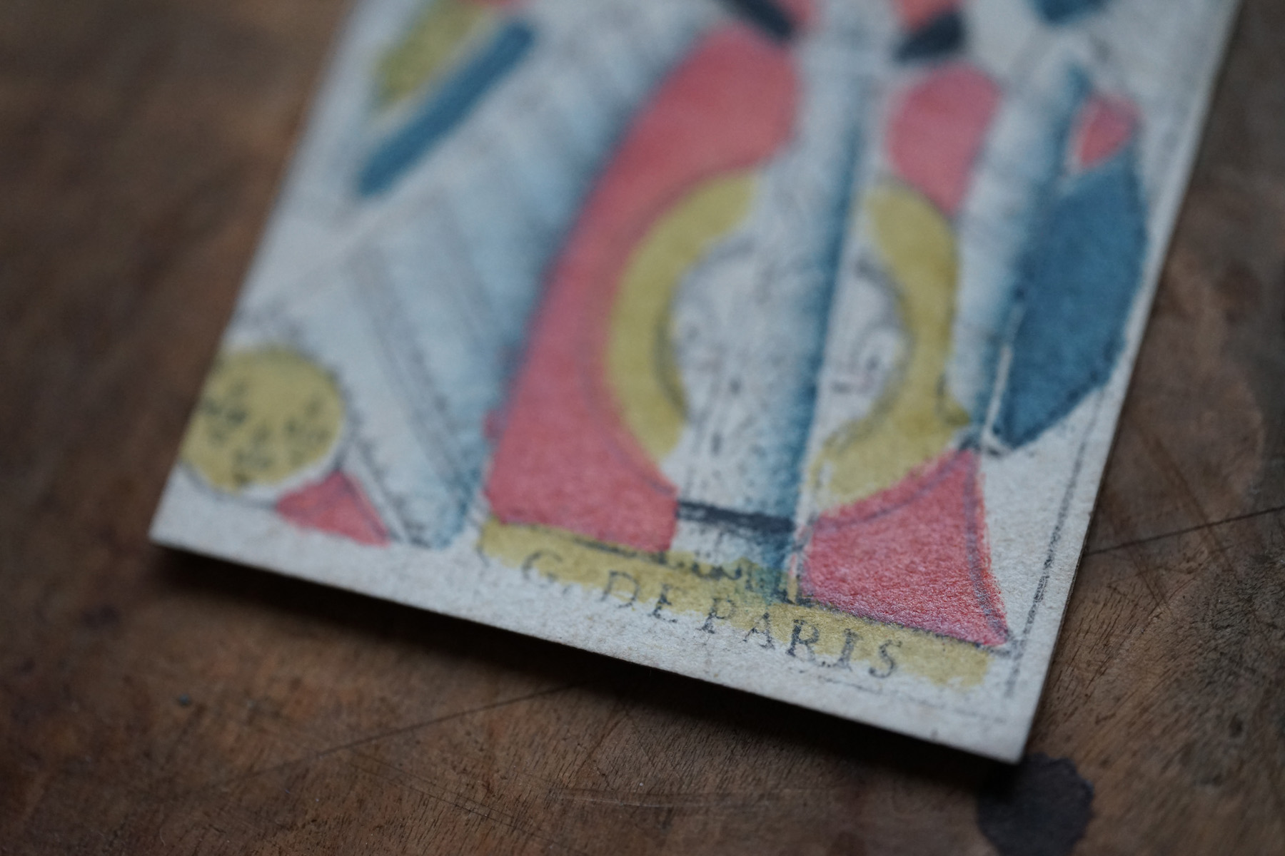 柔らかな木版刷りと紙の経年変化の表情が美しいです。絵札の色はステンシルで手彩色されているようです。古手の絵札は全身像で描かれています。薄い紙ばかりだった当時の厚紙は高級品でありました。19世紀のものになると今と同じに半身で上下に逆さまに2体描かれます。薄い紙ばかりだった当時、厚紙をつくるのに2,3枚の紙を張り合わせ印刷してから裁断しつくられたものもあるそうです。18-19世紀、当時は紙が高くトランプも高価な物でした。このような手頃なサイズの無地(裏面)の厚紙はなかなか無かったため、手紙や借用書などにも使われたそうで、その名残があるものもございます。また賭け事のメモ書きのようにも見えます。当時の空気感をまとった一枚の絵として飾って頂けると思います。コレクター放出でまとめて譲って頂きました。全ては掲載できておりませんので、ご希望ございましたらお気軽にご相談下さいませ。