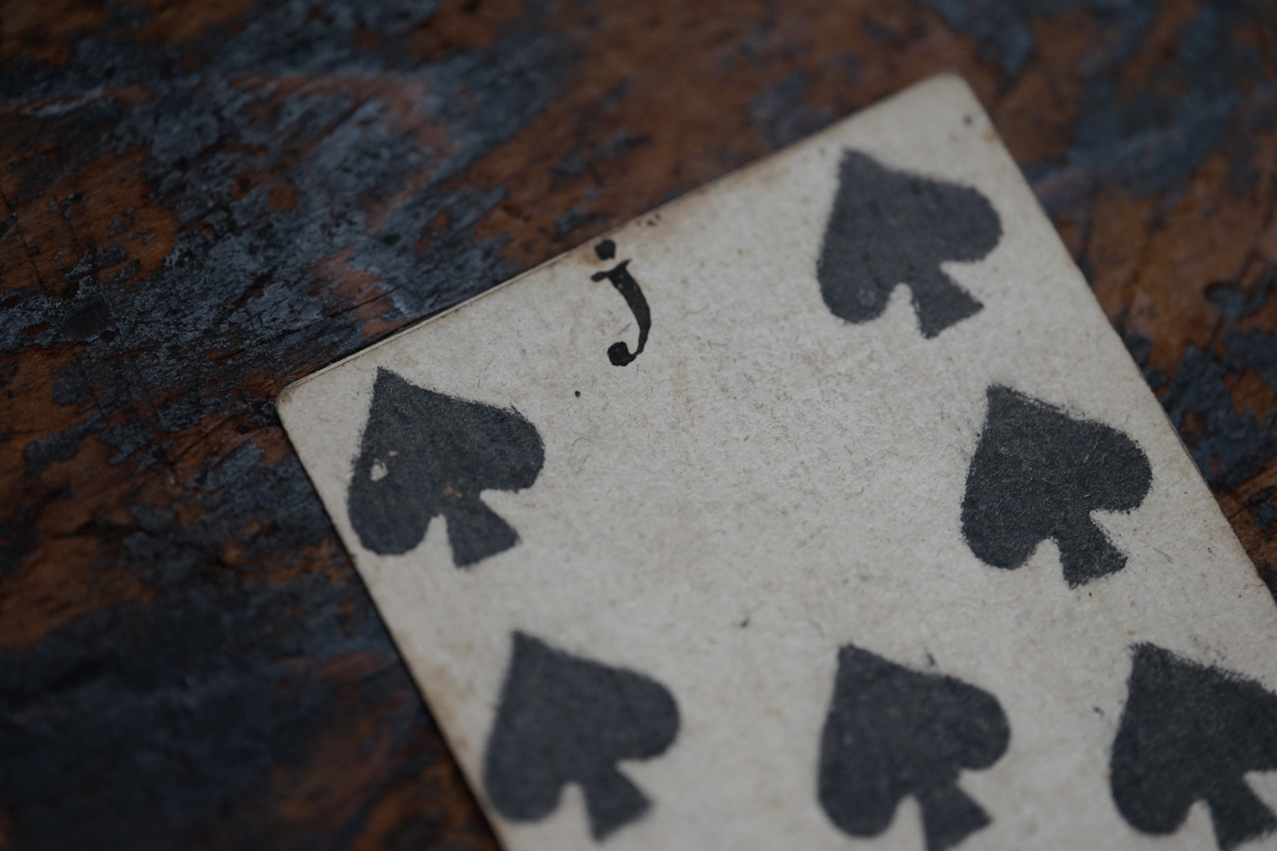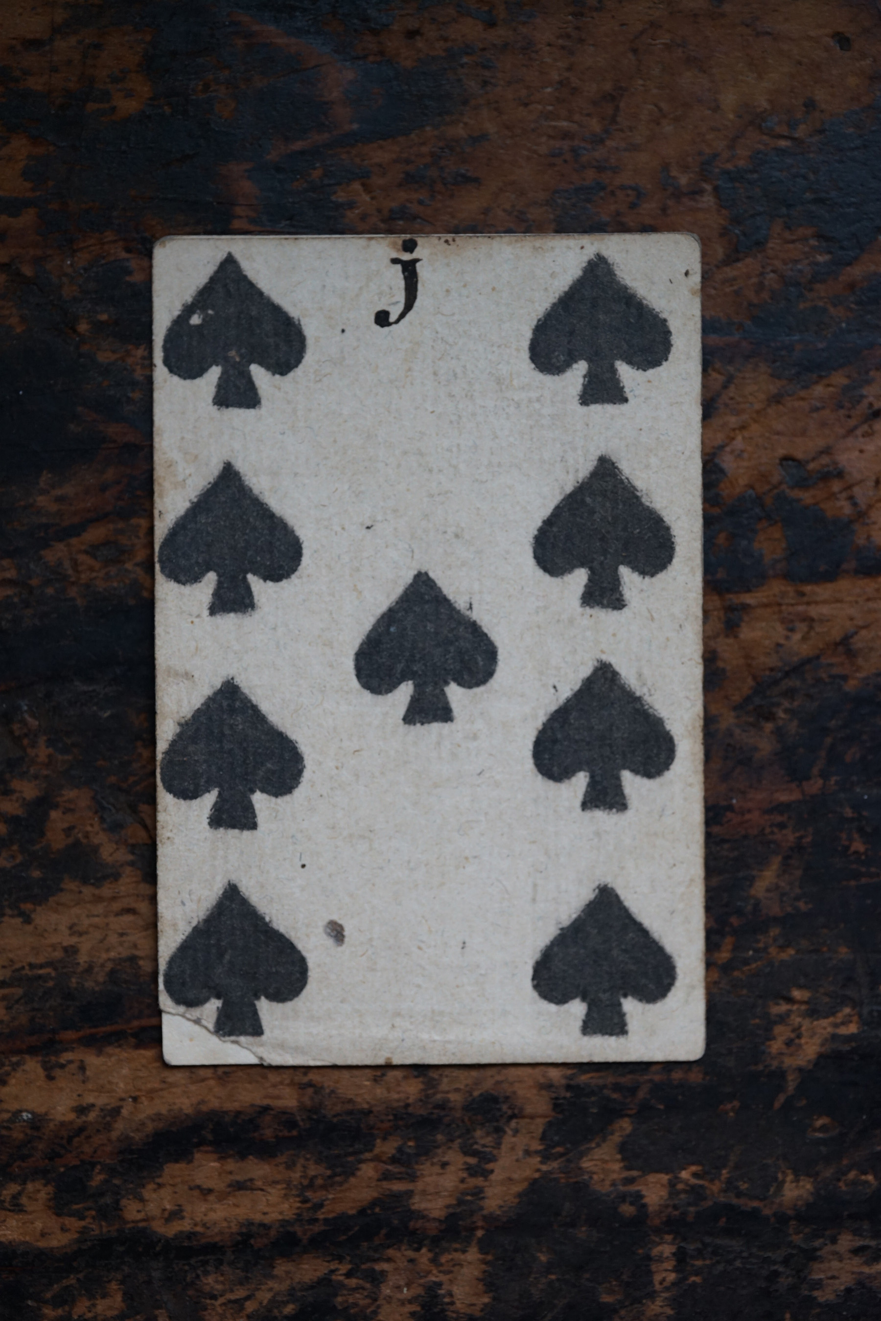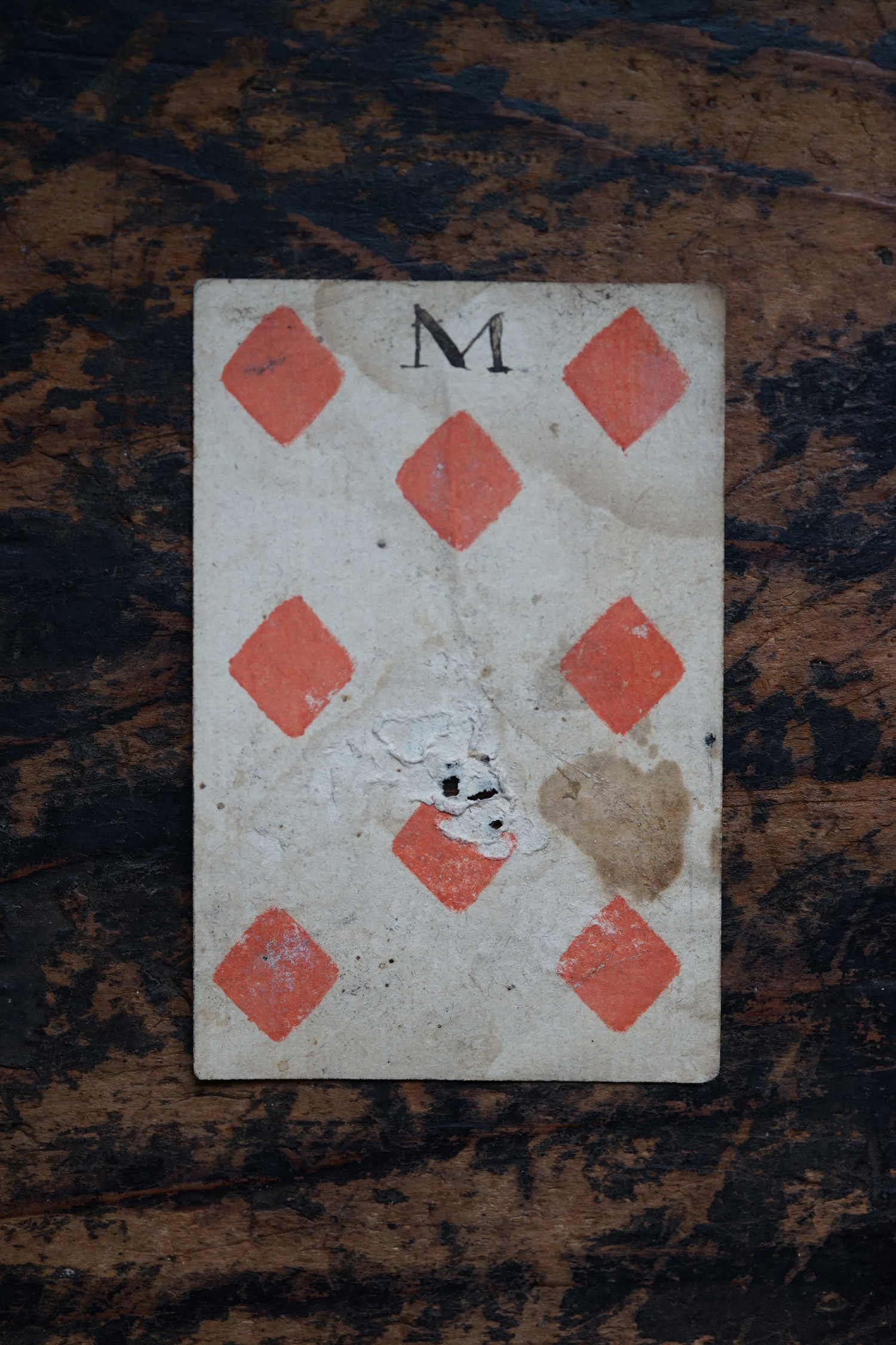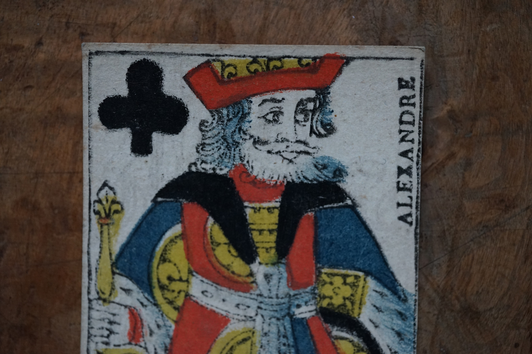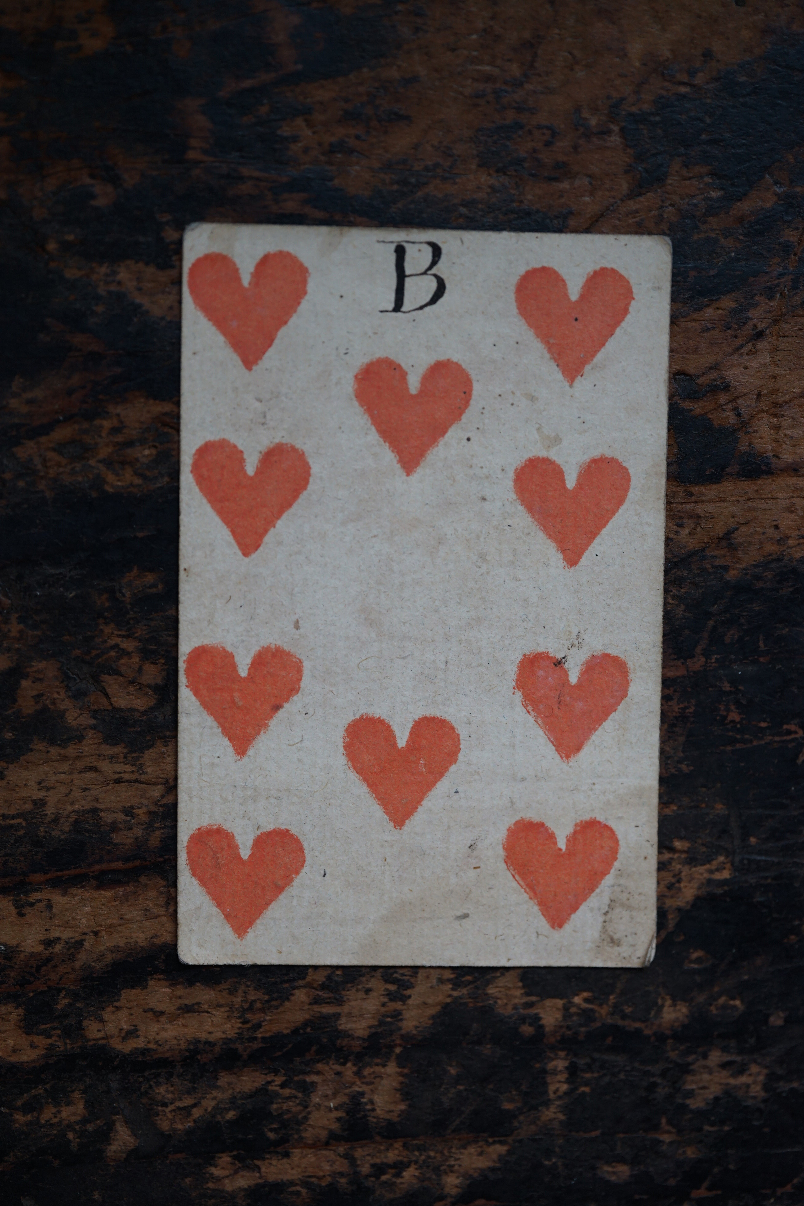 柔らかな木版刷りと紙の経年変化の表情が美しいです。絵札の色はステンシルで手彩色されているようです。古手の絵札は全身像で描かれています。薄い紙ばかりだった当時の厚紙は高級品でありました。19世紀のものになると今と同じに半身で上下に逆さまに2体描かれます。薄い紙ばかりだった当時、厚紙をつくるのに2,3枚の紙を張り合わせ印刷してから裁断しつくられたものもあるそうです。18-19世紀、当時は紙が高くトランプも高価な物でした。このような手頃なサイズの無地(裏面)の厚紙はなかなか無かったため、手紙や借用書などにも使われたそうで、その名残があるものもございます。また賭け事のメモ書きのようにも見えます。当時の空気感をまとった一枚の絵として飾って頂けると思います。コレクター放出でまとめて譲って頂きました。全ては掲載できておりませんので、ご希望ございましたらお気軽にご相談下さいませ。