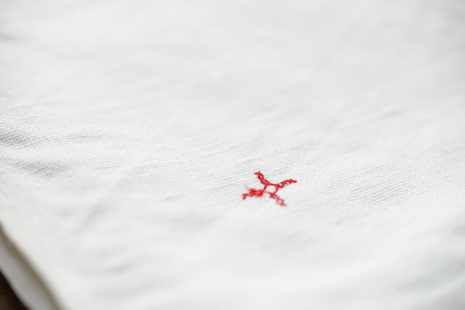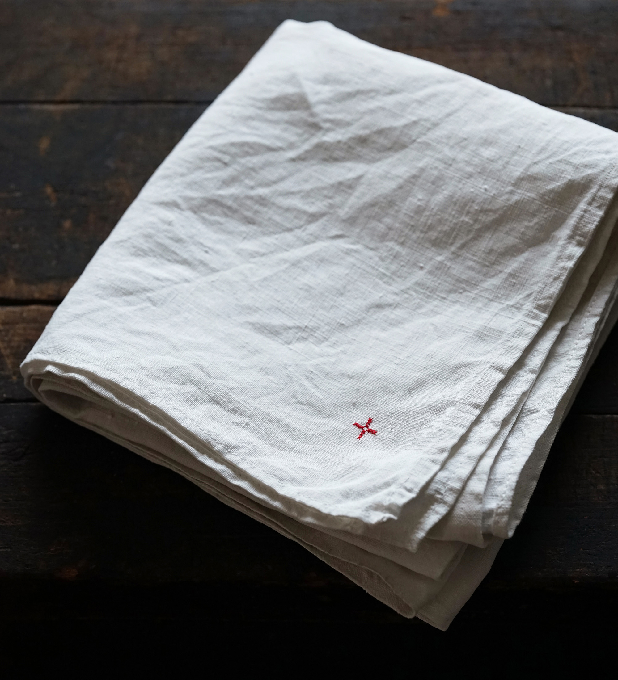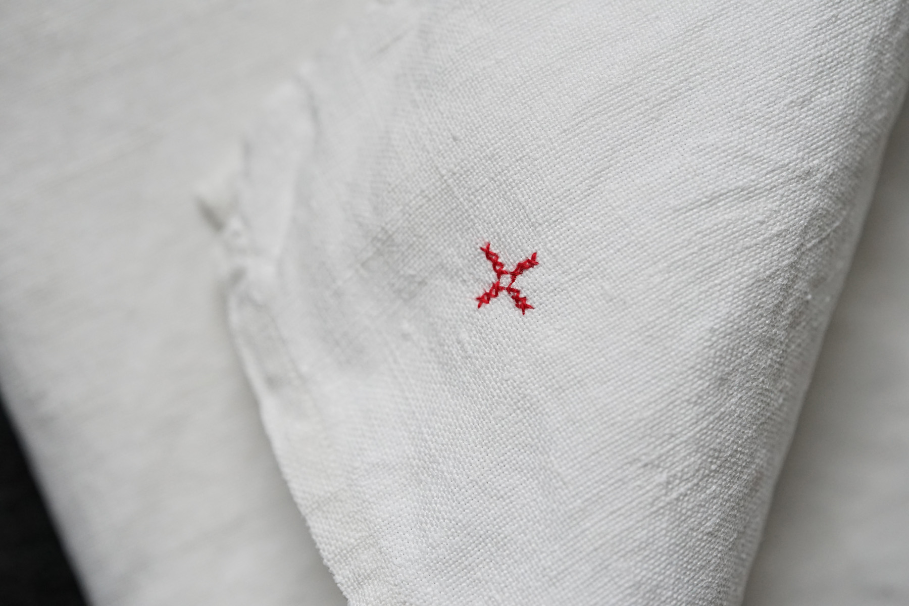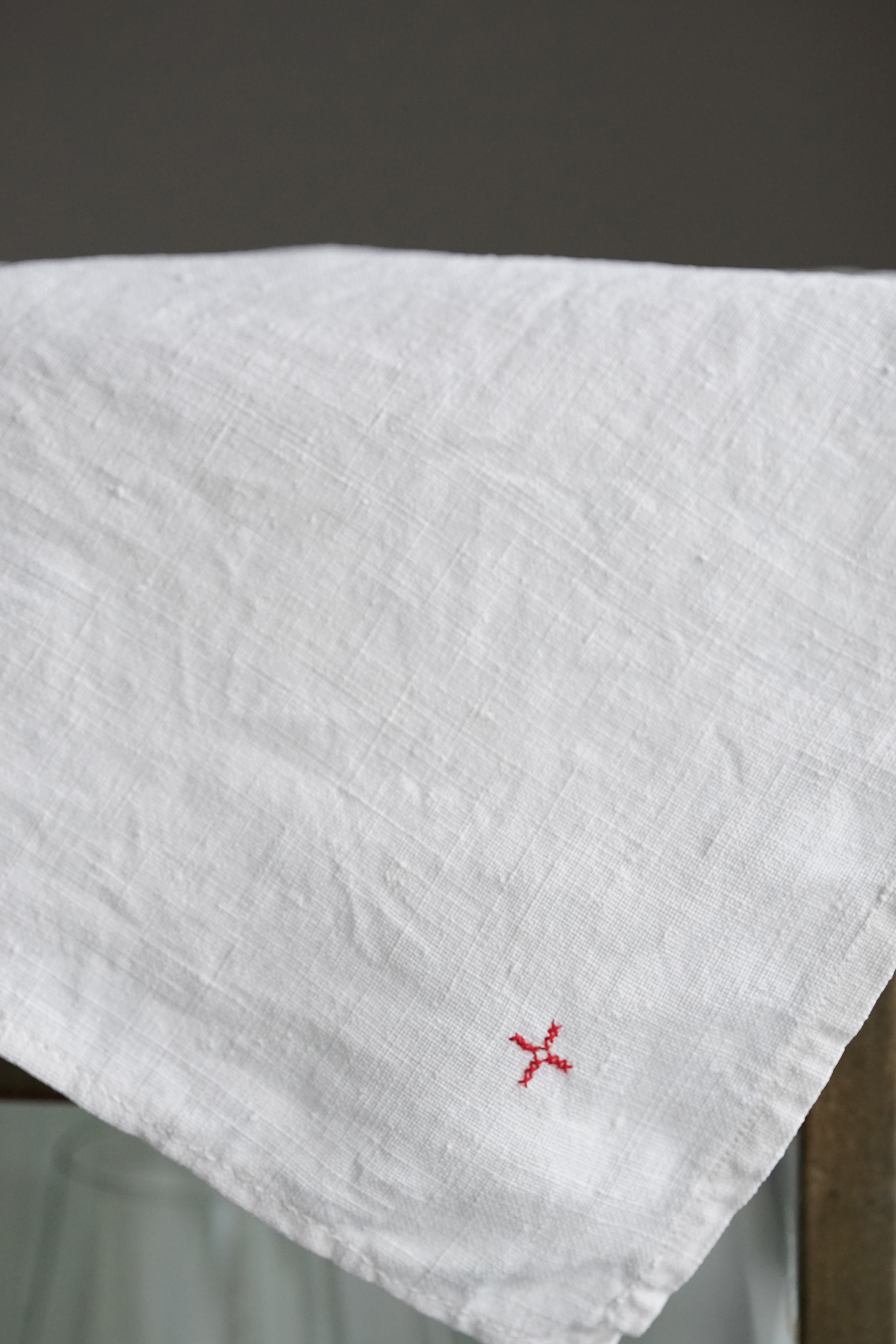フランス南東部のジュラ地方の修道院からでました300枚ほどのリネンクロスは、修道院に入院する際に一人一人何枚も持ち込んだものだそうです。無装飾で白に統一され、禁欲的な修道・労働しながらの祈りの暮らしに寄り添ったものです。ワンポイントに赤のクロスマークが全てに刺繍されています。それぞれ自身で刺繍したものでしょう。テーブルクロスや間仕切り、キッチンクロスなどにも最適かと思います。サイズや生地の質感はそれぞれ異なりますのでお気軽にお問い合わせ下さい。古いリネンの洗うと引き締まるような感触がとても良い一枚です。