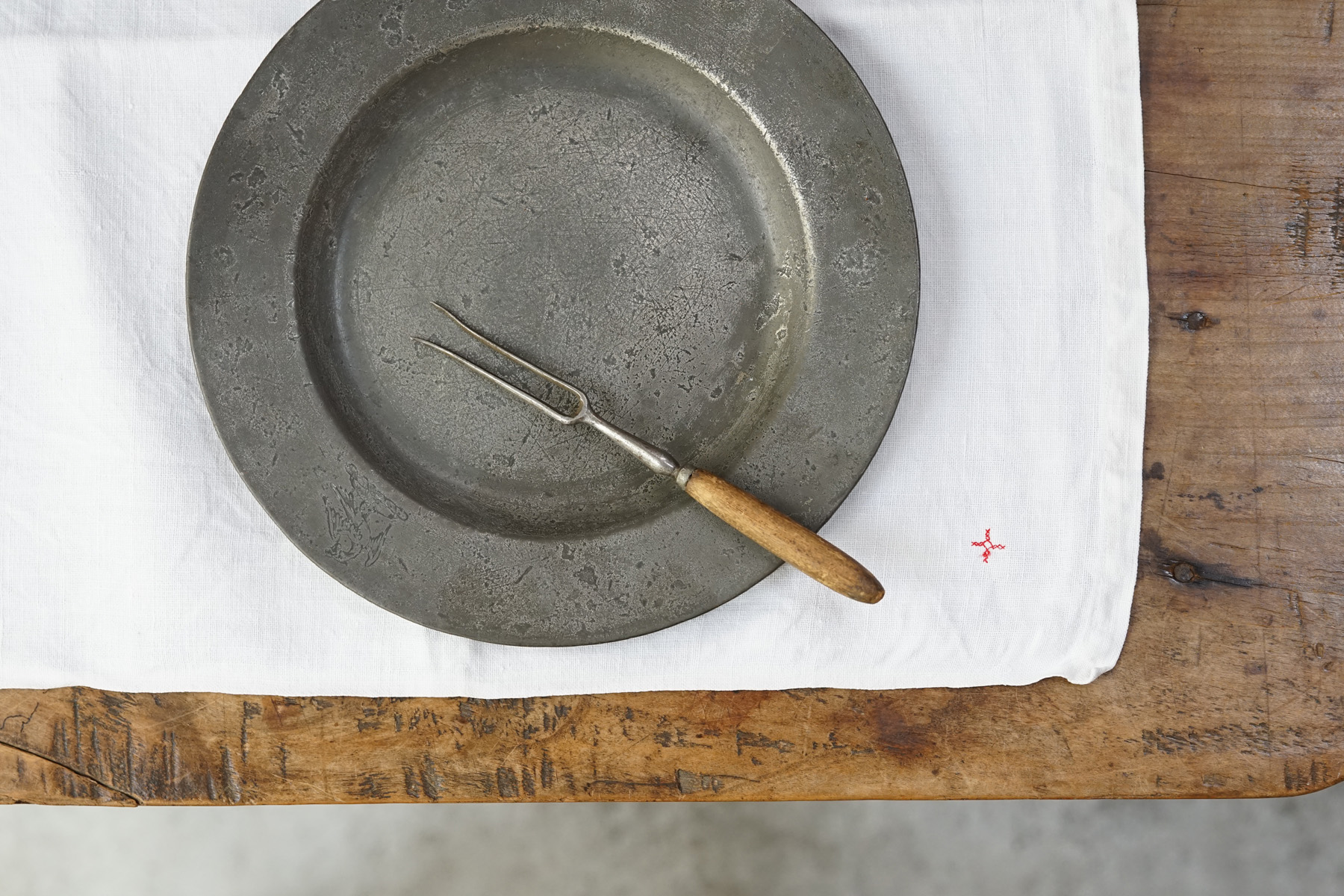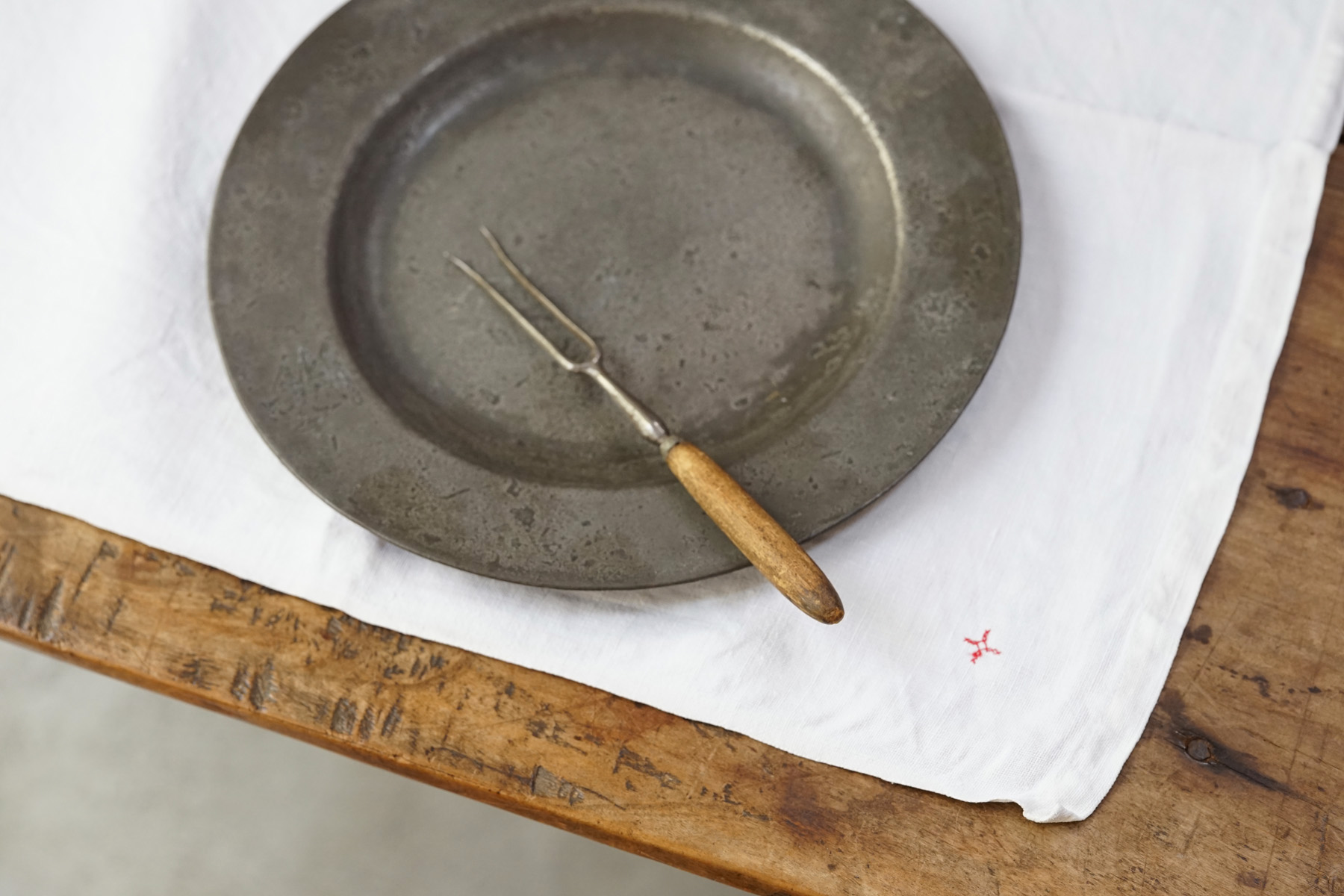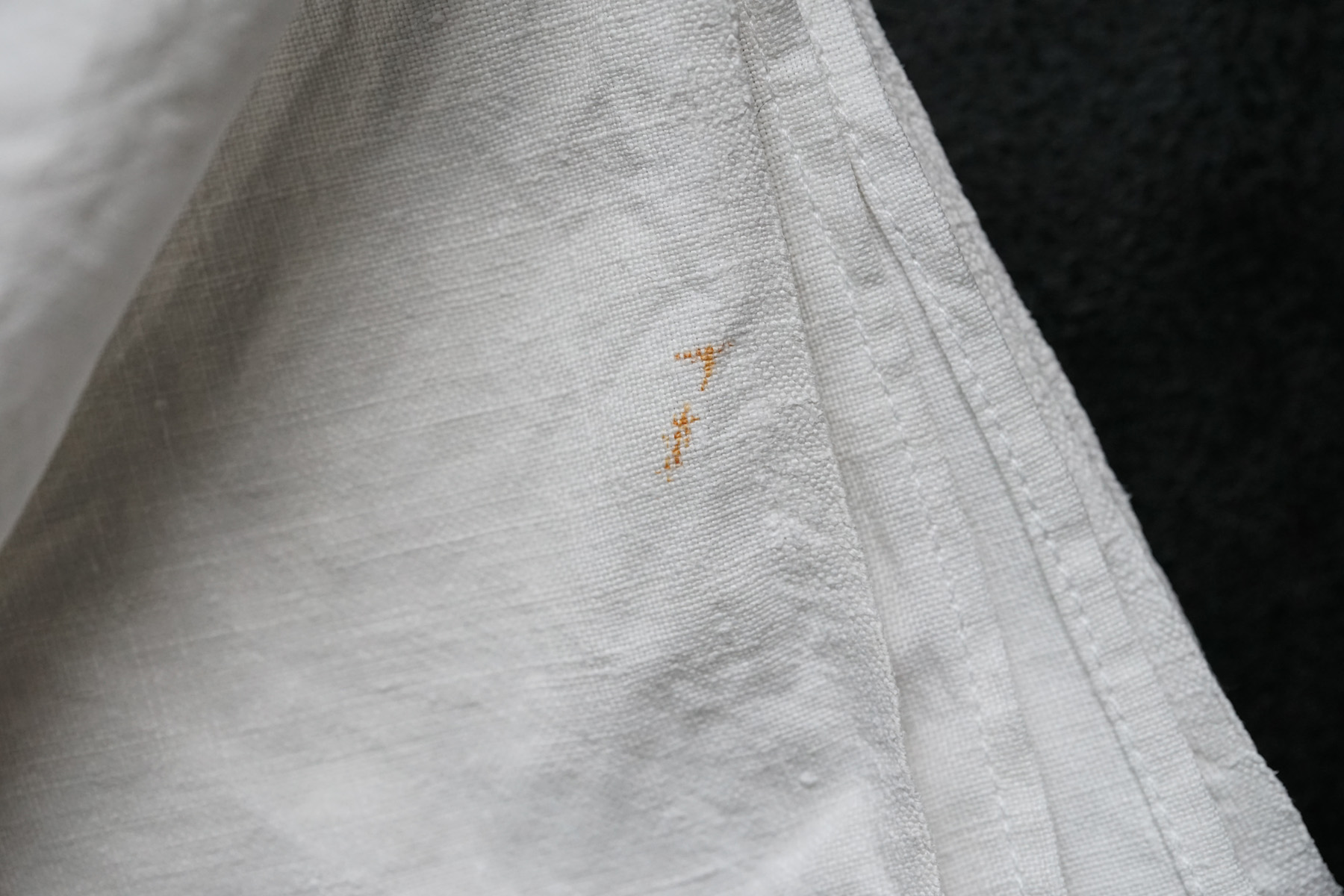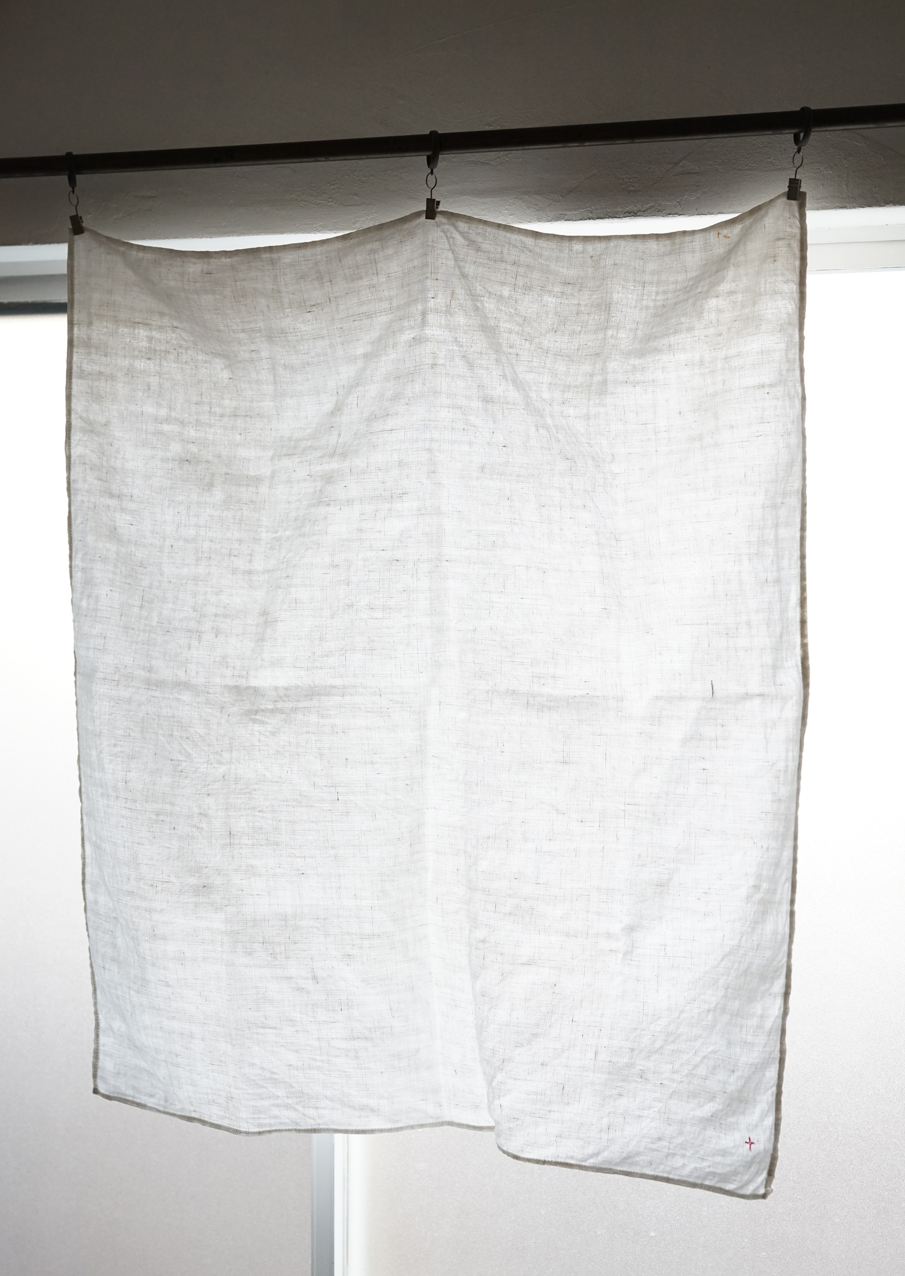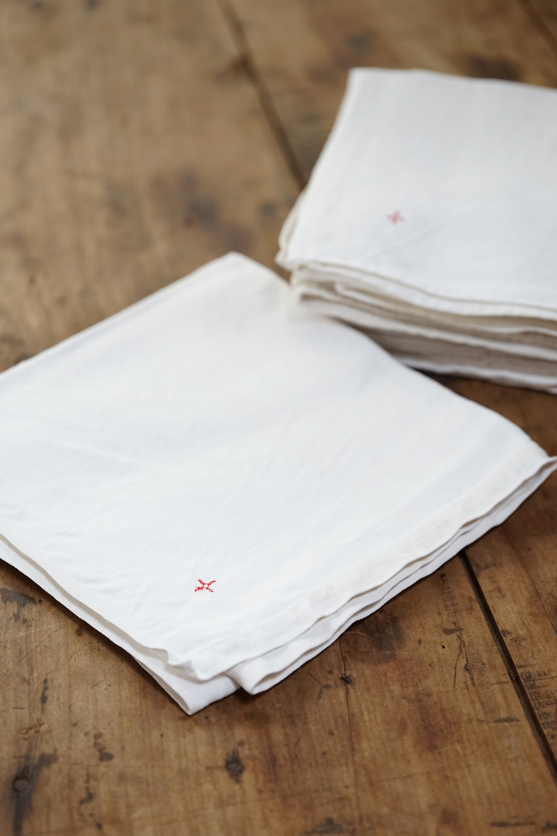 フランス南東部のジュラ地方の修道院からでました300枚ほどのリネンクロスは、修道院に入院する際に一人一人何枚も持ち込んだものだそうです。無装飾で白に統一され、禁欲的な修道・労働しながらの祈りの暮らしに寄り添ったものです。ワンポイントに赤のクロスマークが全てに刺繍されています。それぞれ自身で刺繍したものでしょう。テーブルクロスや間仕切り、キッチンクロスなどにも最適かと思います。サイズや生地の質感はそれぞれ異なりますのでお気軽にお問い合わせ下さい。古いリネンの洗うと引き締まるような感触がとても良い一枚です。