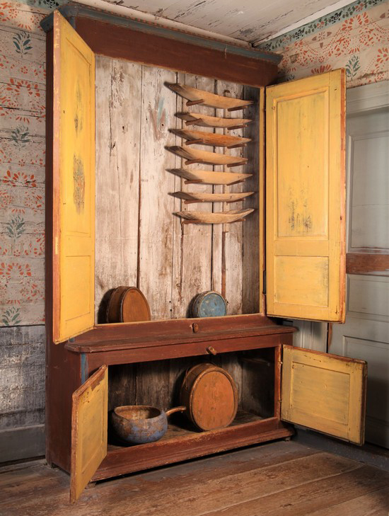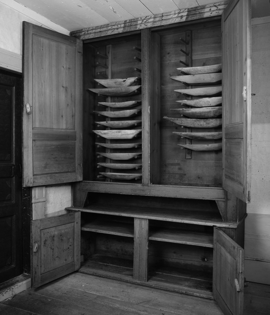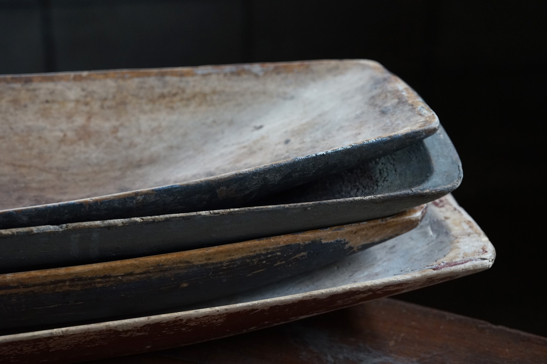 ずっとサーモンなど魚用の調理や保管などのものと思っていた、または南仏などではそう聞いていたトレイ。本来はミルクを保管するためのものということを教えて頂きました。北部の寒い地域では5〜9月はフレッシュなミルクを飲みますが、それ以外の寒期には最後の写真のようなキャビネットにミルクを入れ保管していたそうです。独特な舟形の造形とそれぞれ落ち着いた色味の着色が好ましい器です。