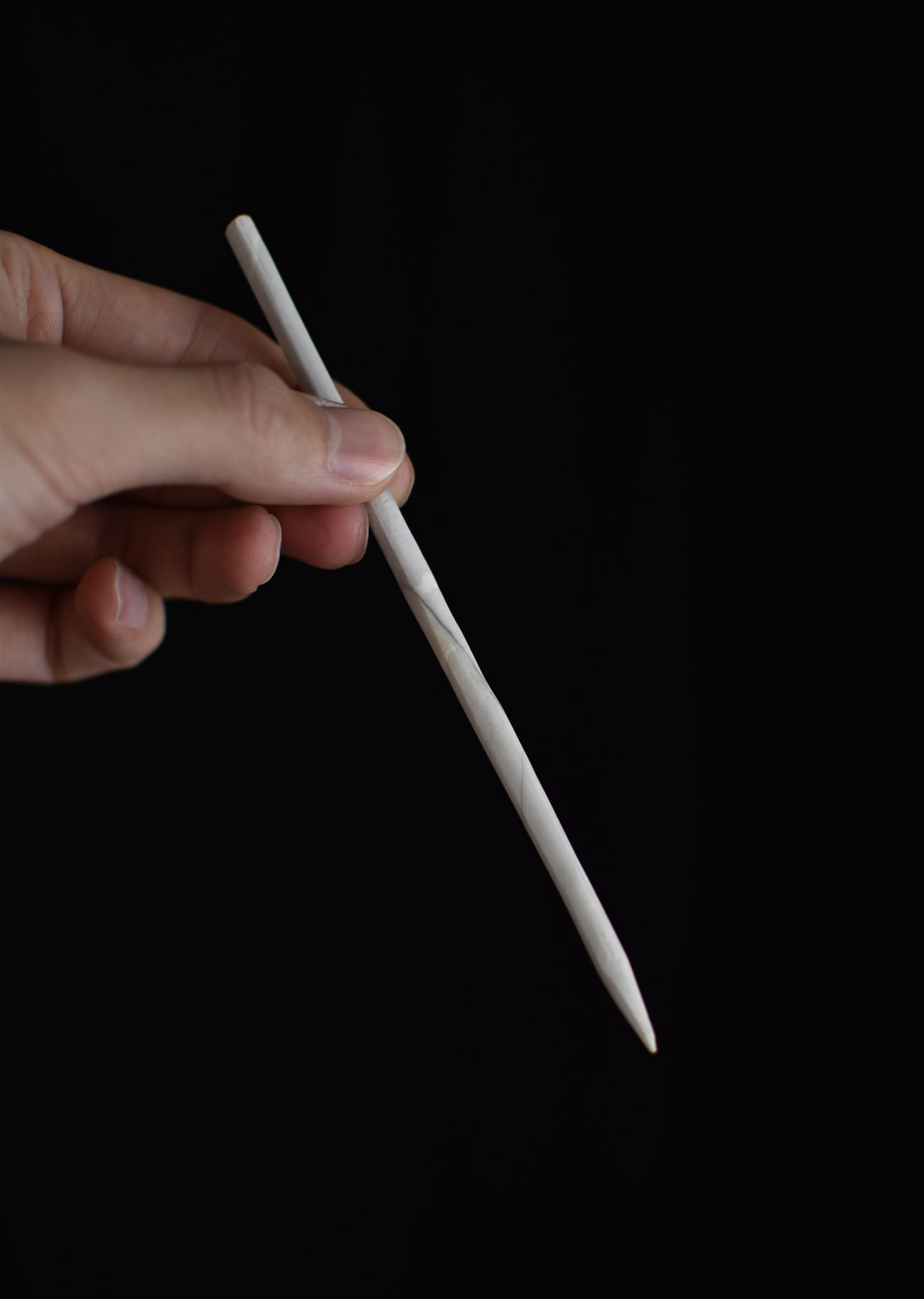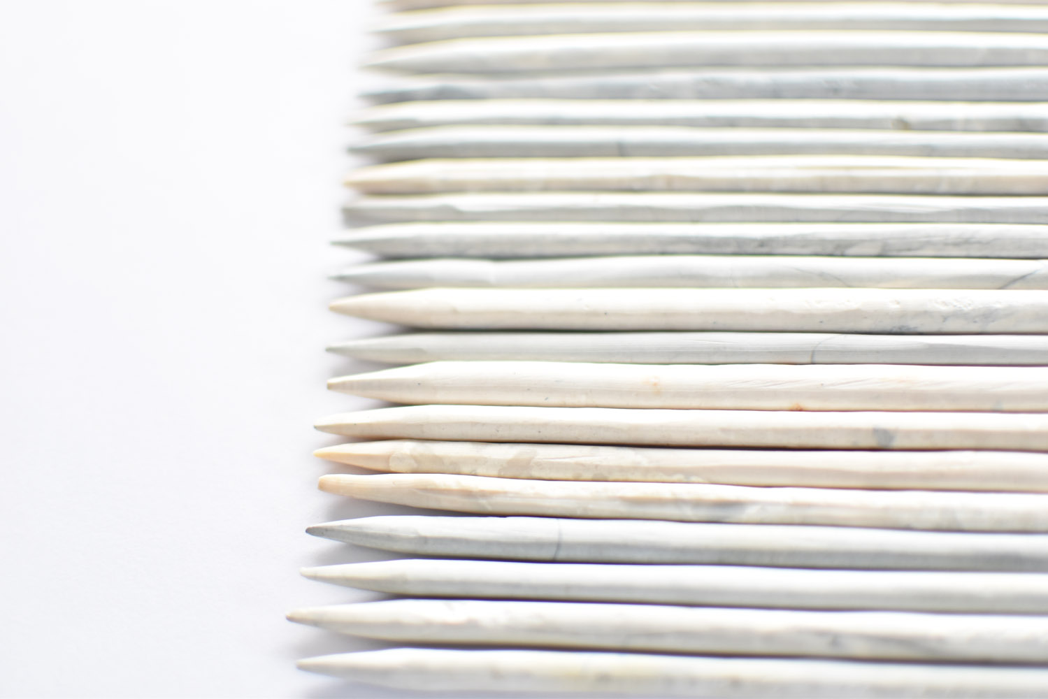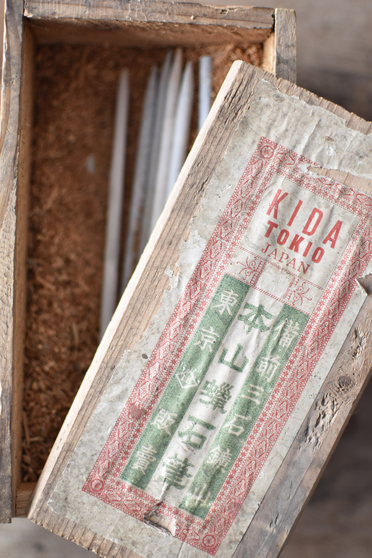 備前三石鉱山と記載の木箱に割れないよう、おが屑と一緒におさまっていました。大理石のような模様が美しいです。もちろん石板へ実用できます。石筆は、学校制度が始まった明治初期より鉛筆が普及するまで、全国の学校で使用され、三石は産地であったそうです。