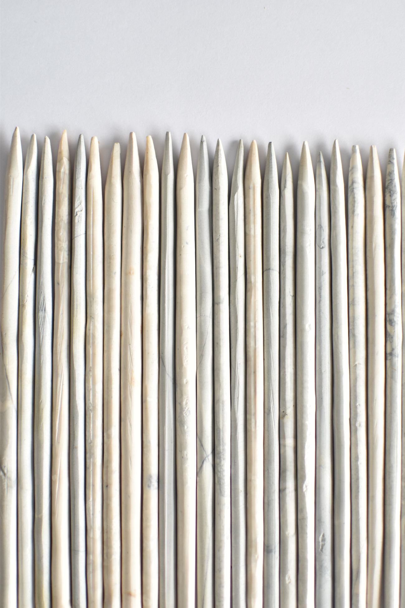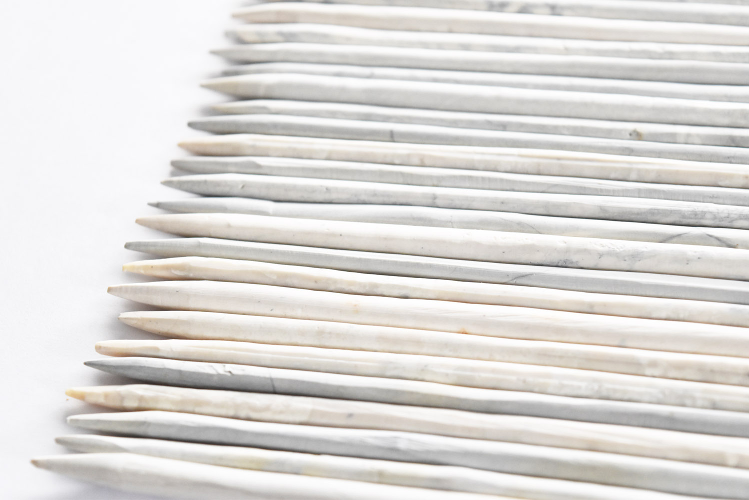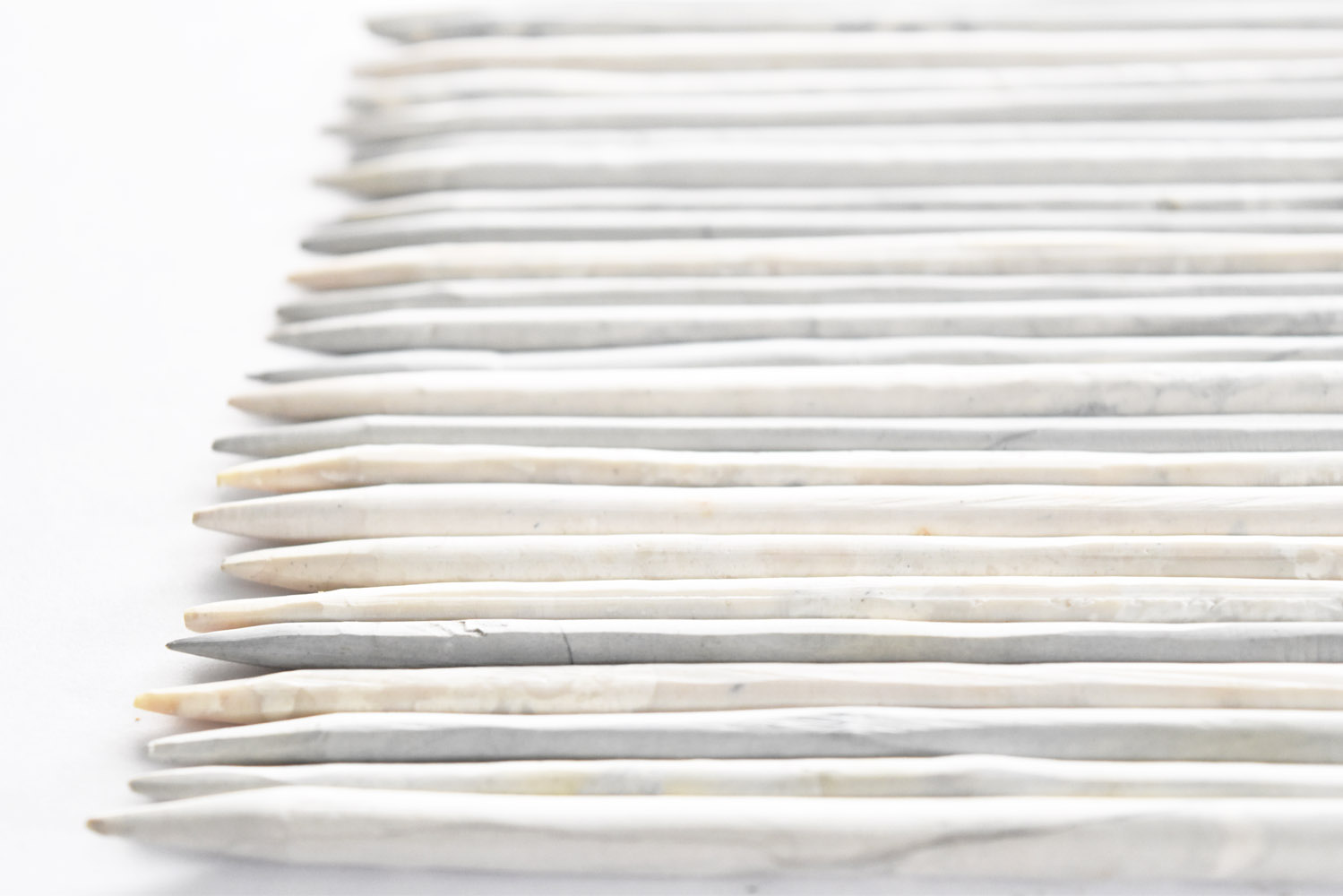 備前三石鉱山と記載の木箱に割れないよう、おが屑と一緒におさまっていました。大理石のような模様が美しいです。もちろん石板へ実用できます。石筆は、学校制度が始まった明治初期より鉛筆が普及するまで、全国の学校で使用され、三石は産地であったそうです。