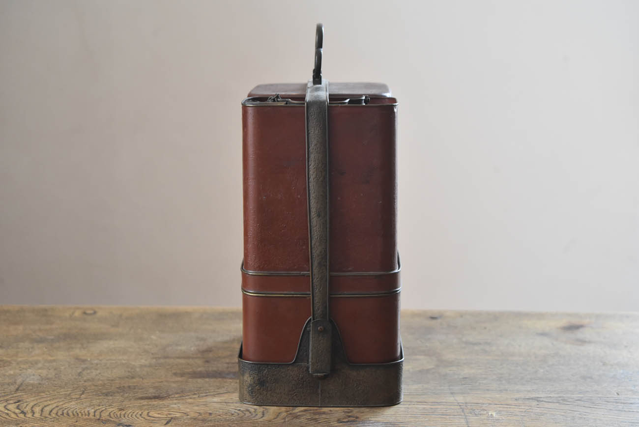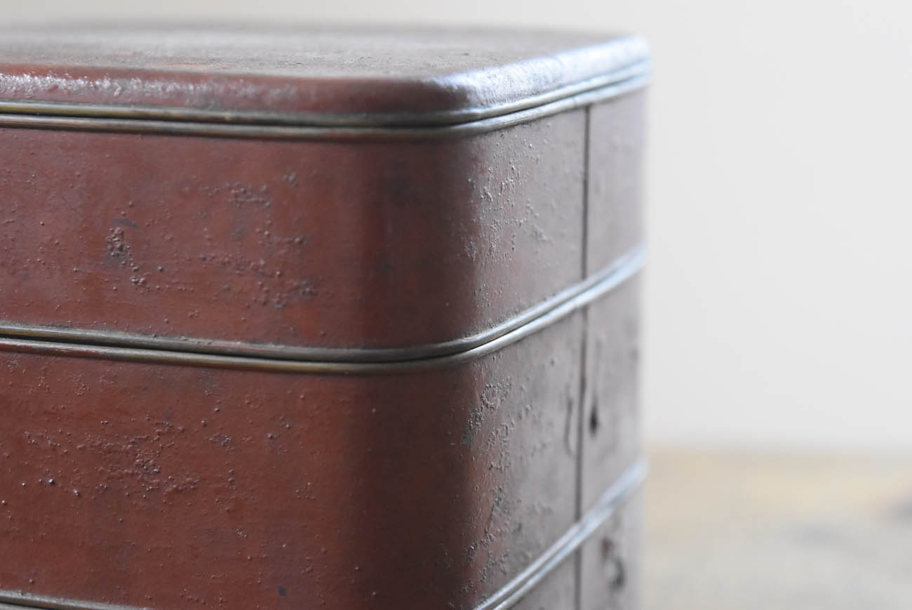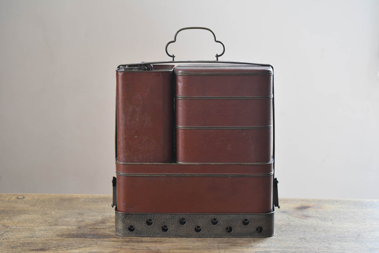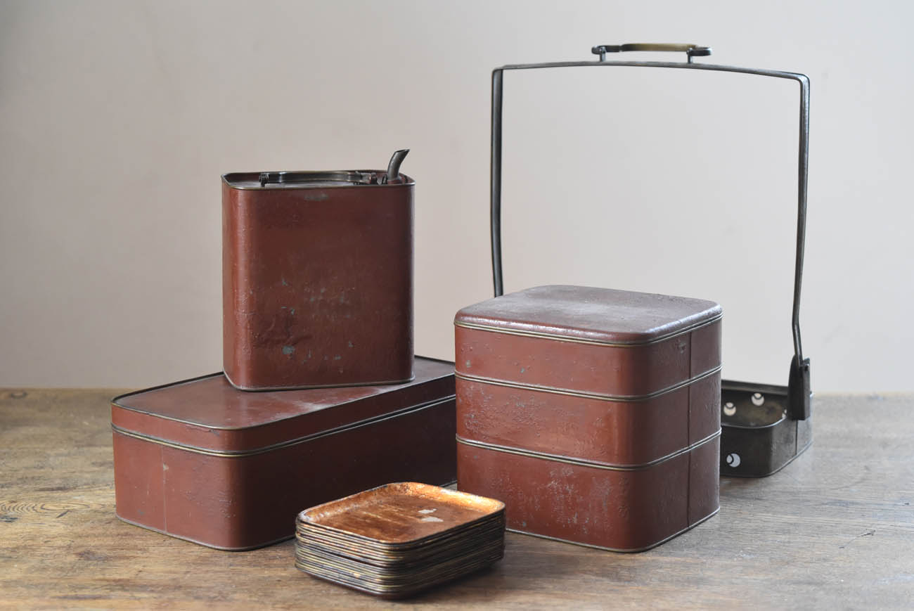 ブリキ製の野弁当一式です。三段重に水筒、箸や器を入れられる箱が全てピッタリとはまります。真鍮の枠にのみ彫りや透かし模様が施されています。縁は真鍮で表面には漆が塗られています。小皿は20枚、皿の表と箱の内側には箔が貼られていたようです。収まりも美しく、シンプルながら日本の生活文化を感じる美しい手仕事です。