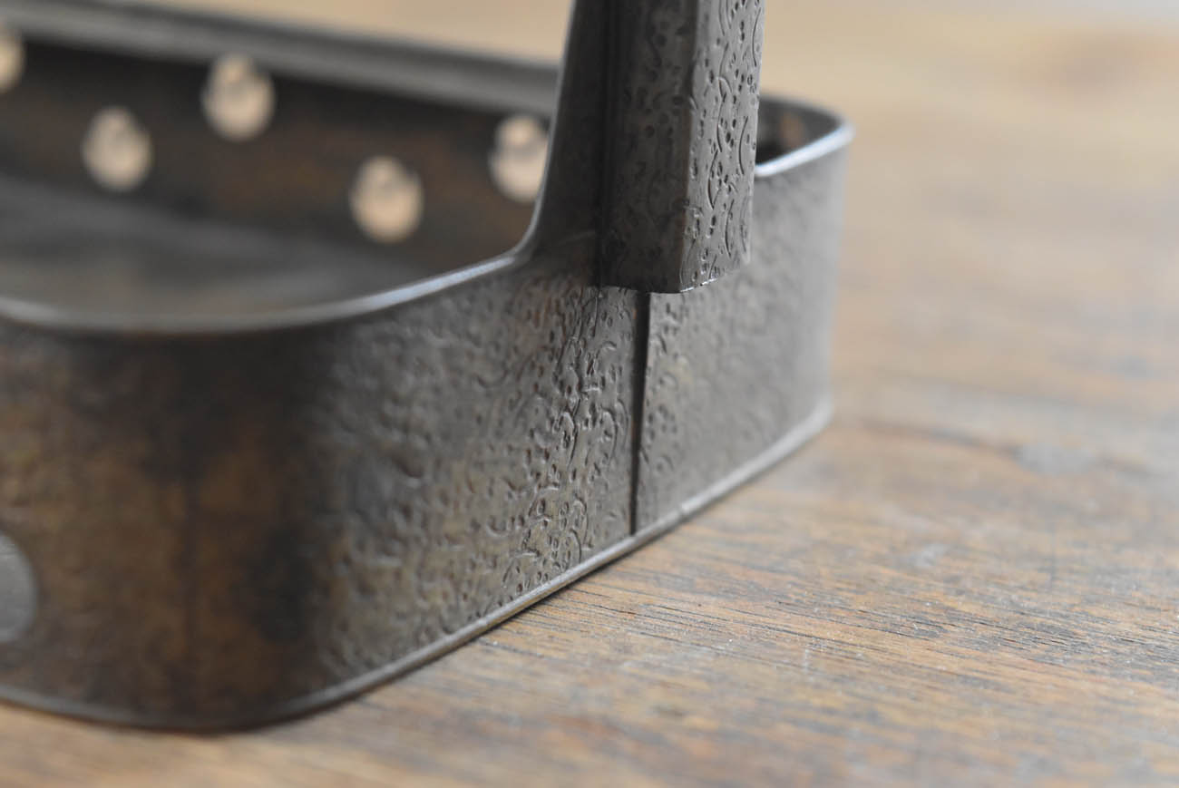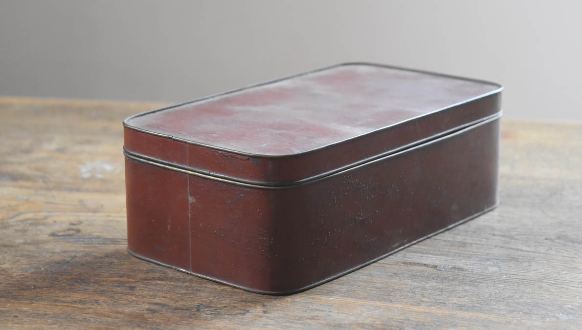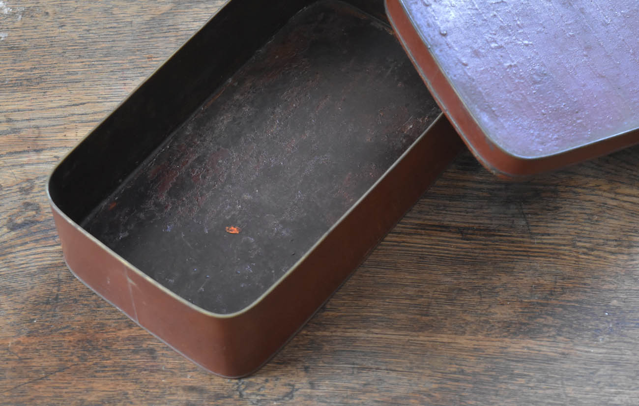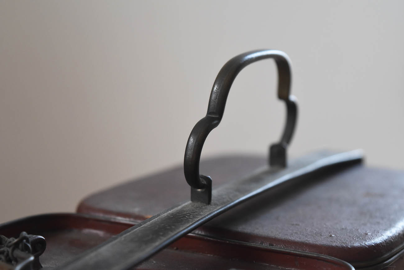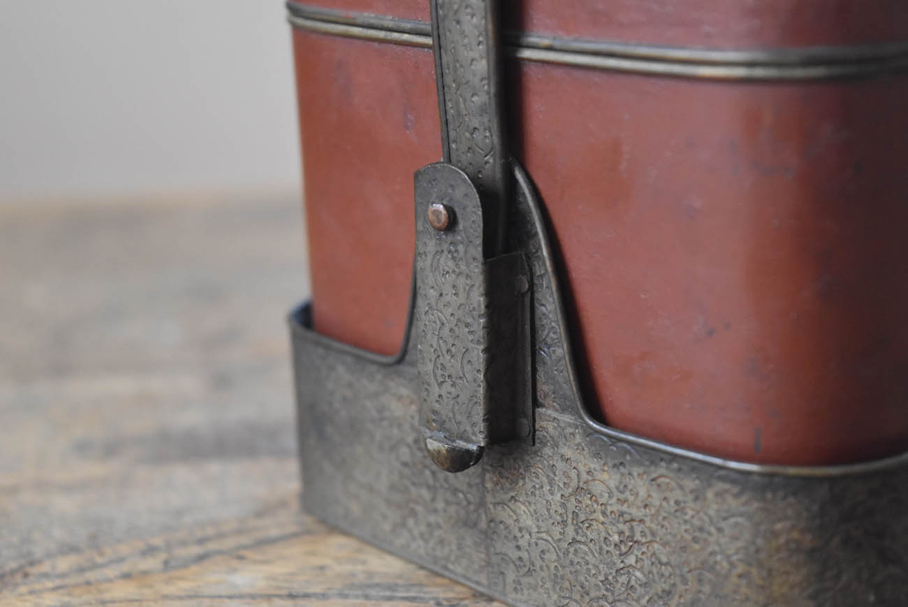 ブリキ製の野弁当一式です。三段重に水筒、箸や器を入れられる箱が全てピッタリとはまります。真鍮の枠にのみ彫りや透かし模様が施されています。縁は真鍮で表面には漆が塗られています。小皿は20枚、皿の表と箱の内側には箔が貼られていたようです。収まりも美しく、シンプルながら日本の生活文化を感じる美しい手仕事です。