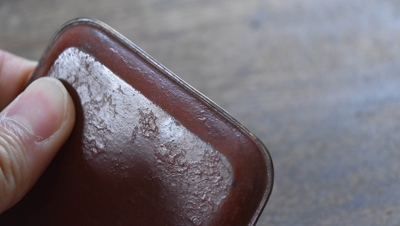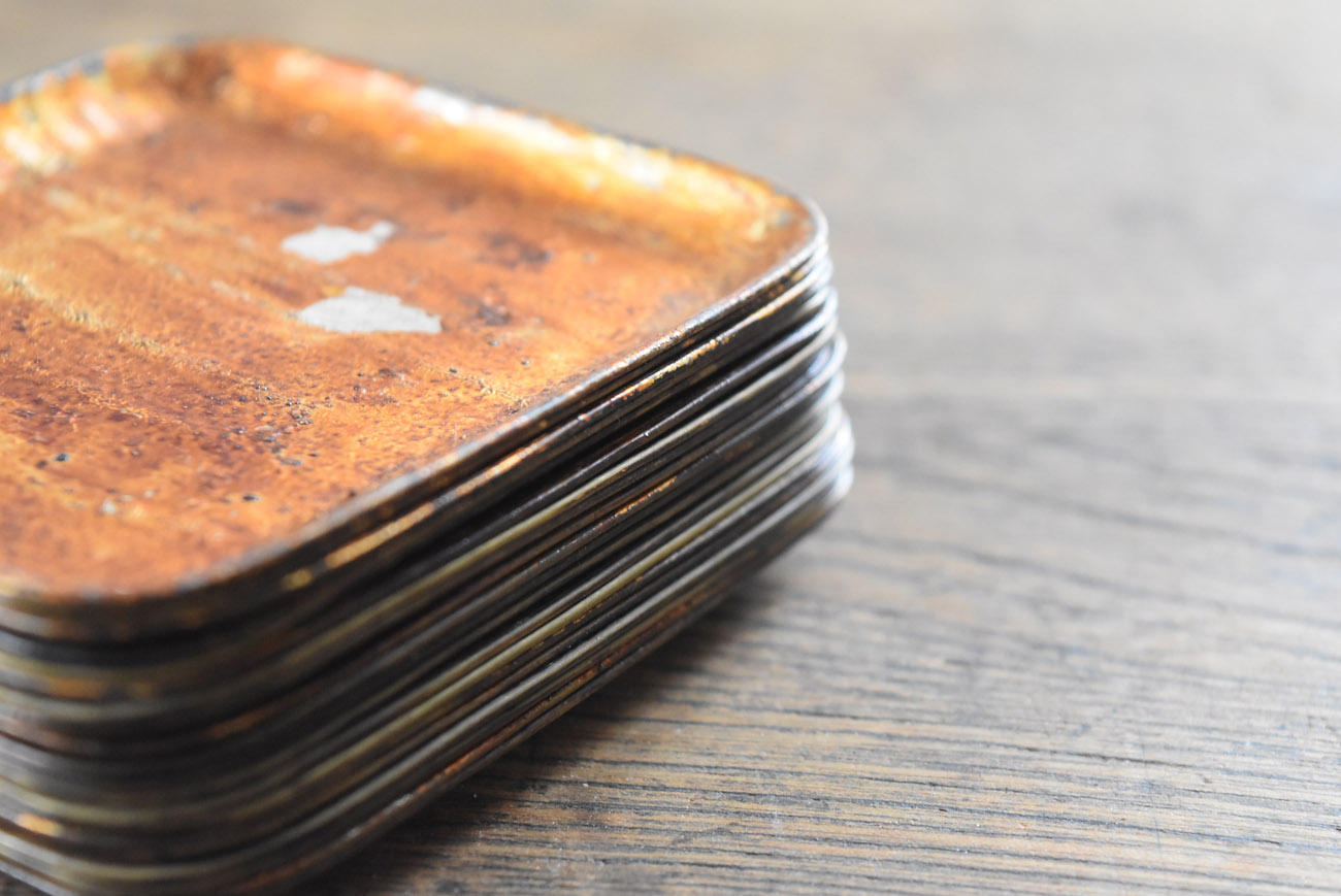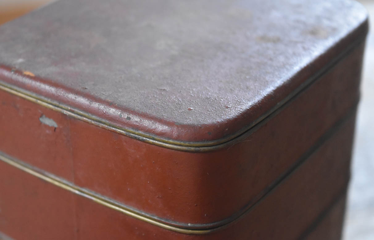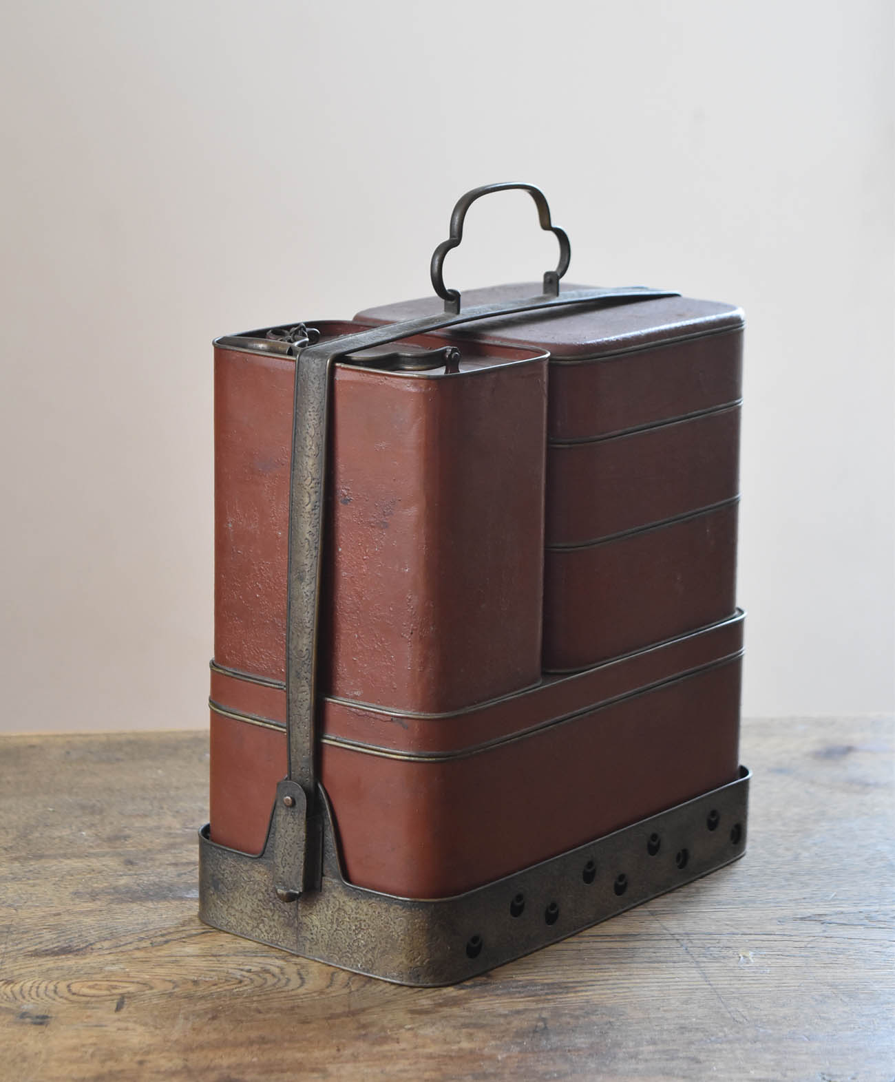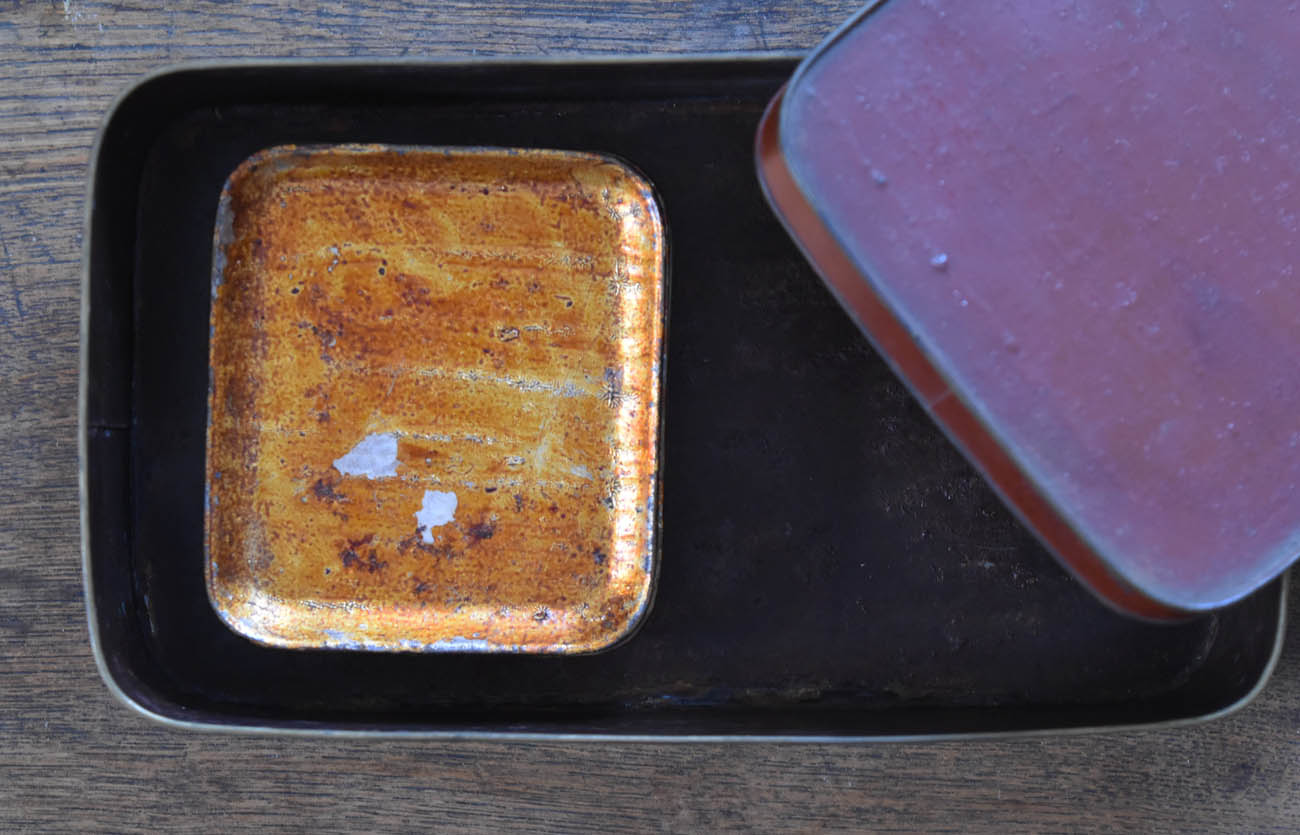 ブリキ製の野弁当一式です。三段重に水筒、箸や器を入れられる箱が全てピッタリとはまります。真鍮の枠にのみ彫りや透かし模様が施されています。縁は真鍮で表面には漆が塗られています。小皿は20枚、皿の表と箱の内側には箔が貼られていたようです。収まりも美しく、シンプルながら日本の生活文化を感じる美しい手仕事です。