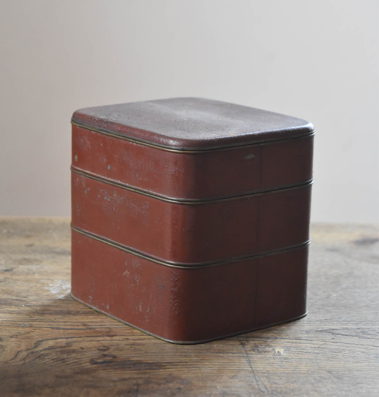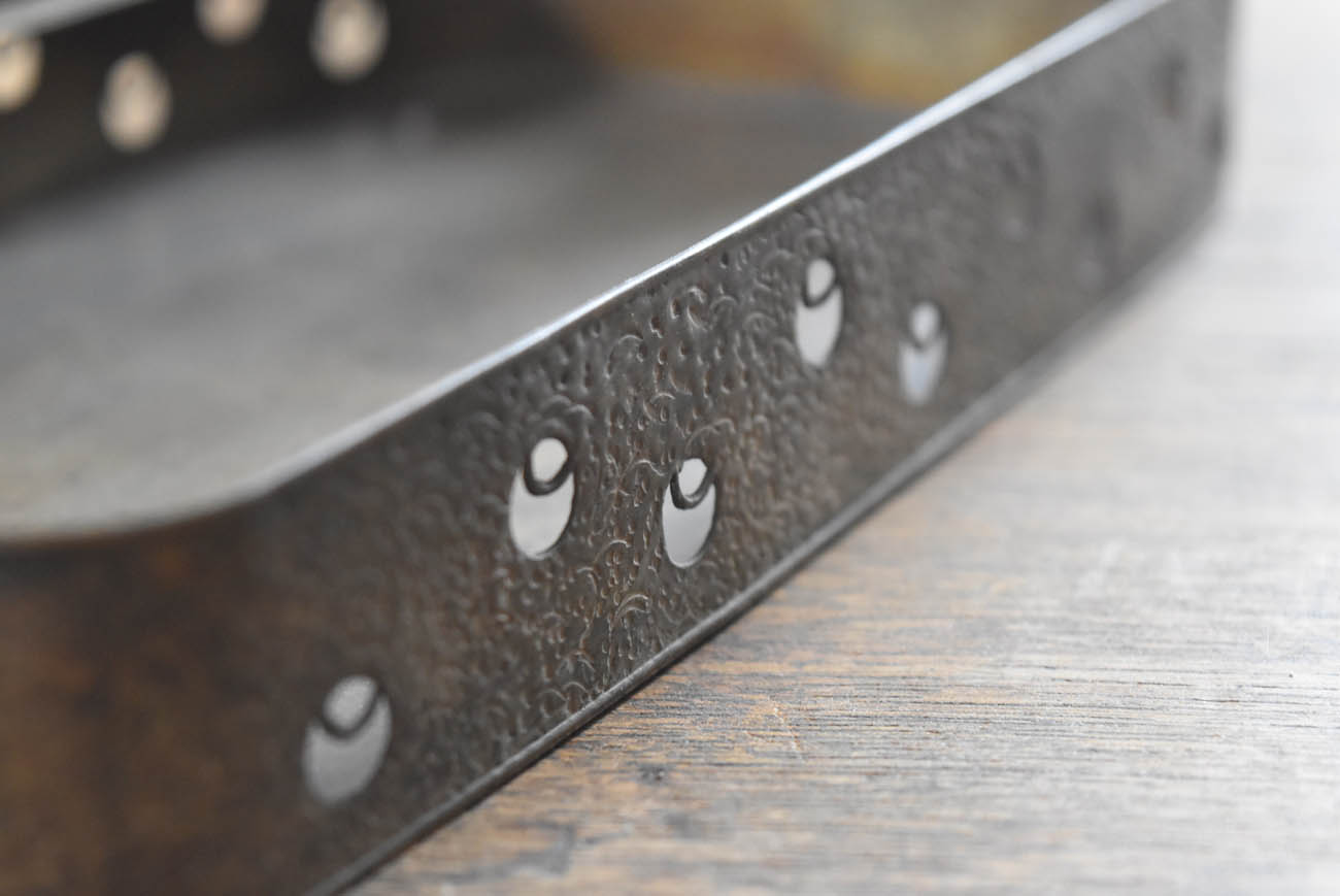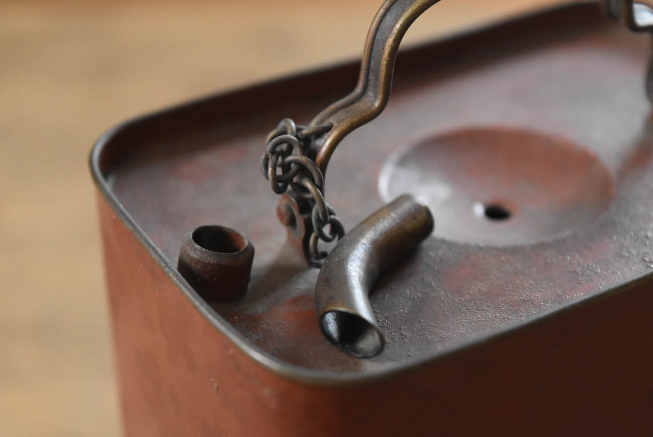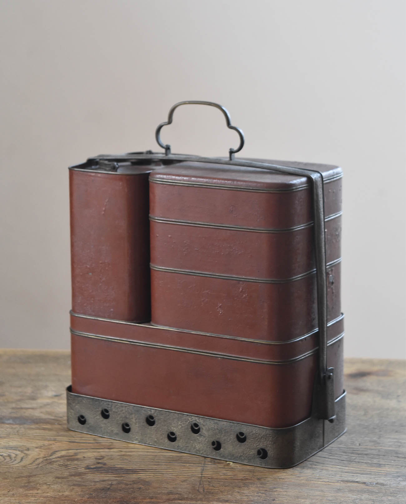 ブリキ製の野弁当一式です。三段重に水筒、箸や器を入れられる箱が全てピッタリとはまります。真鍮の枠にのみ彫りや透かし模様が施されています。縁は真鍮で表面には漆が塗られています。小皿は20枚、皿の表と箱の内側には箔が貼られていたようです。収まりも美しく、シンプルながら日本の生活文化を感じる美しい手仕事です。